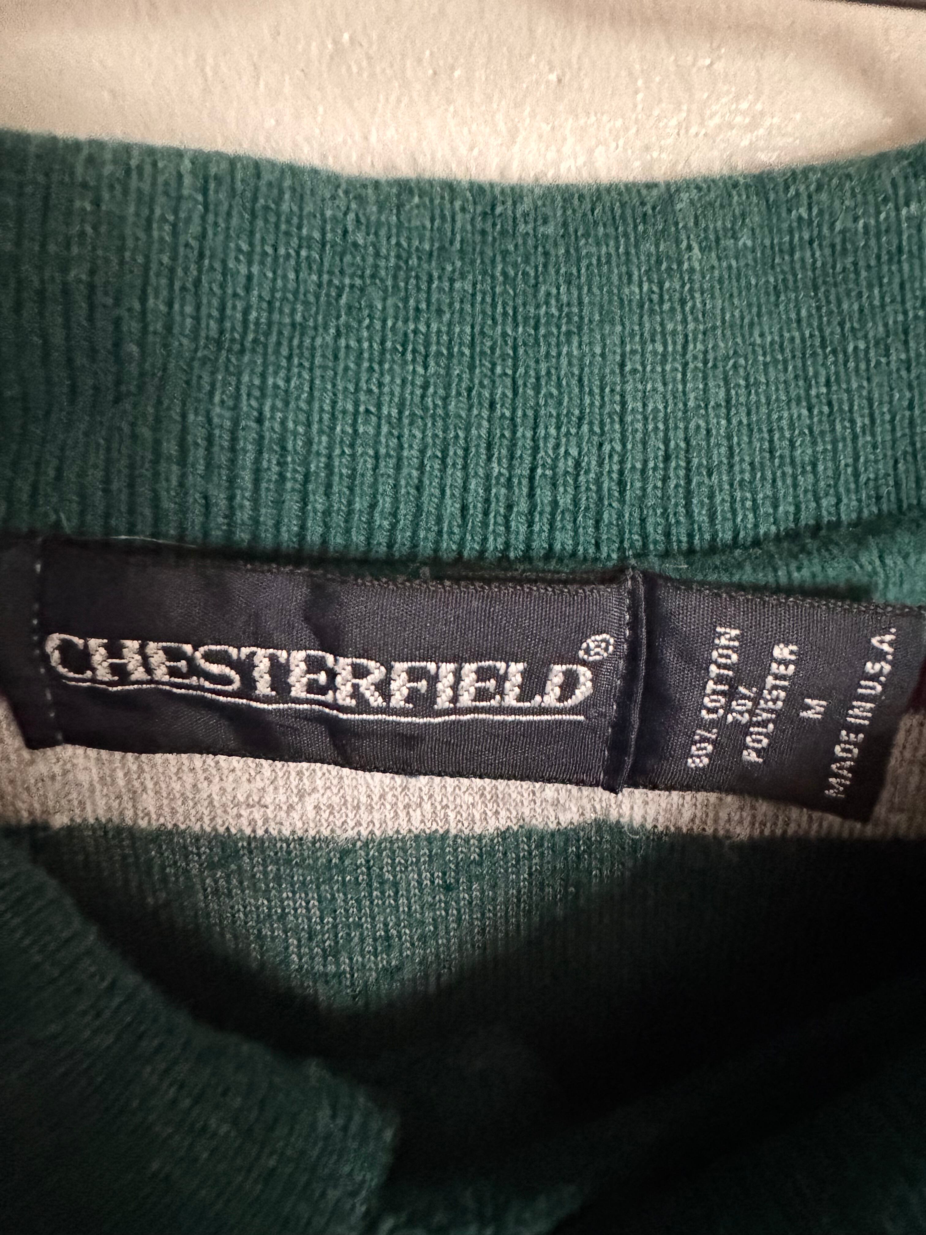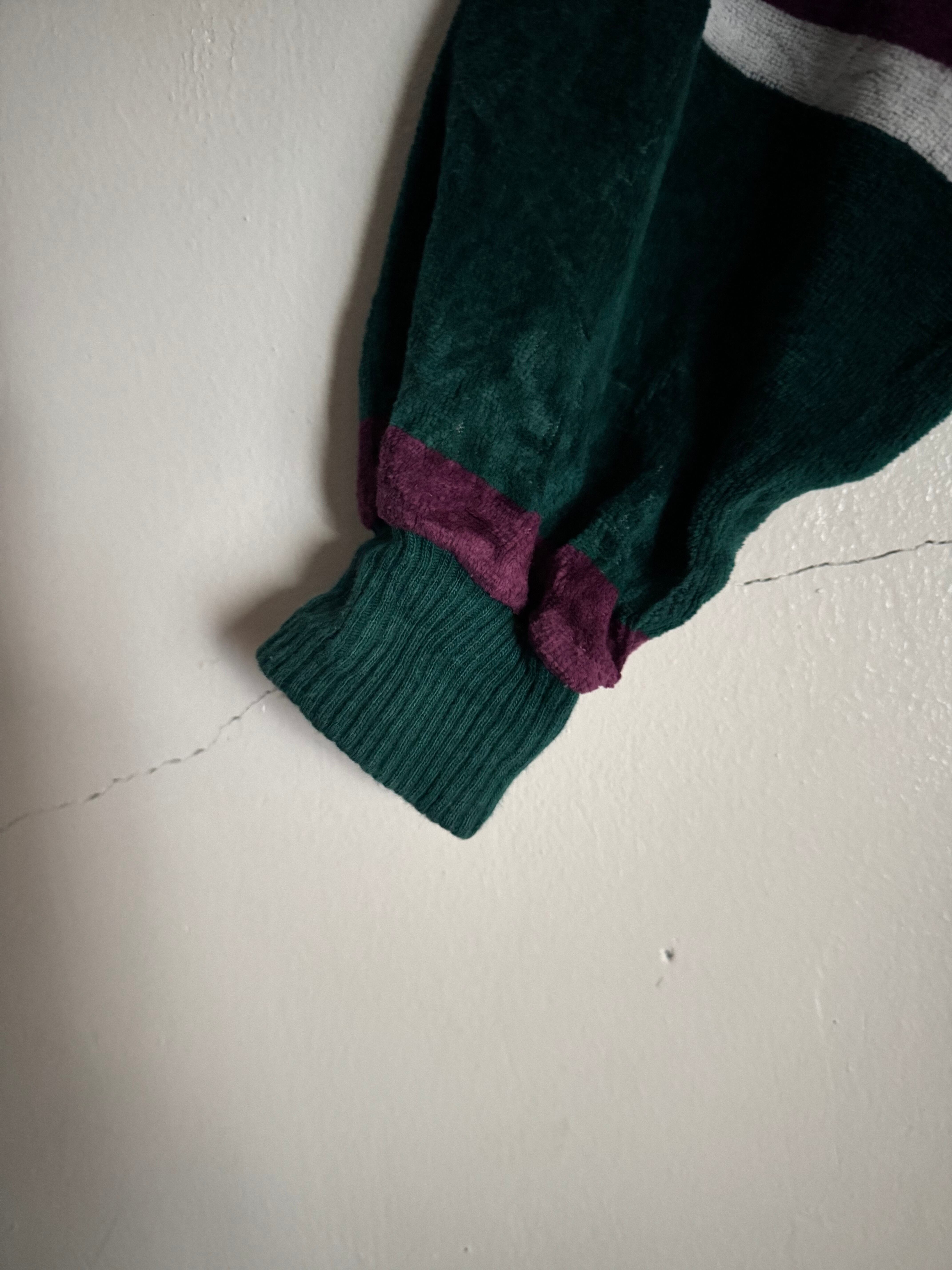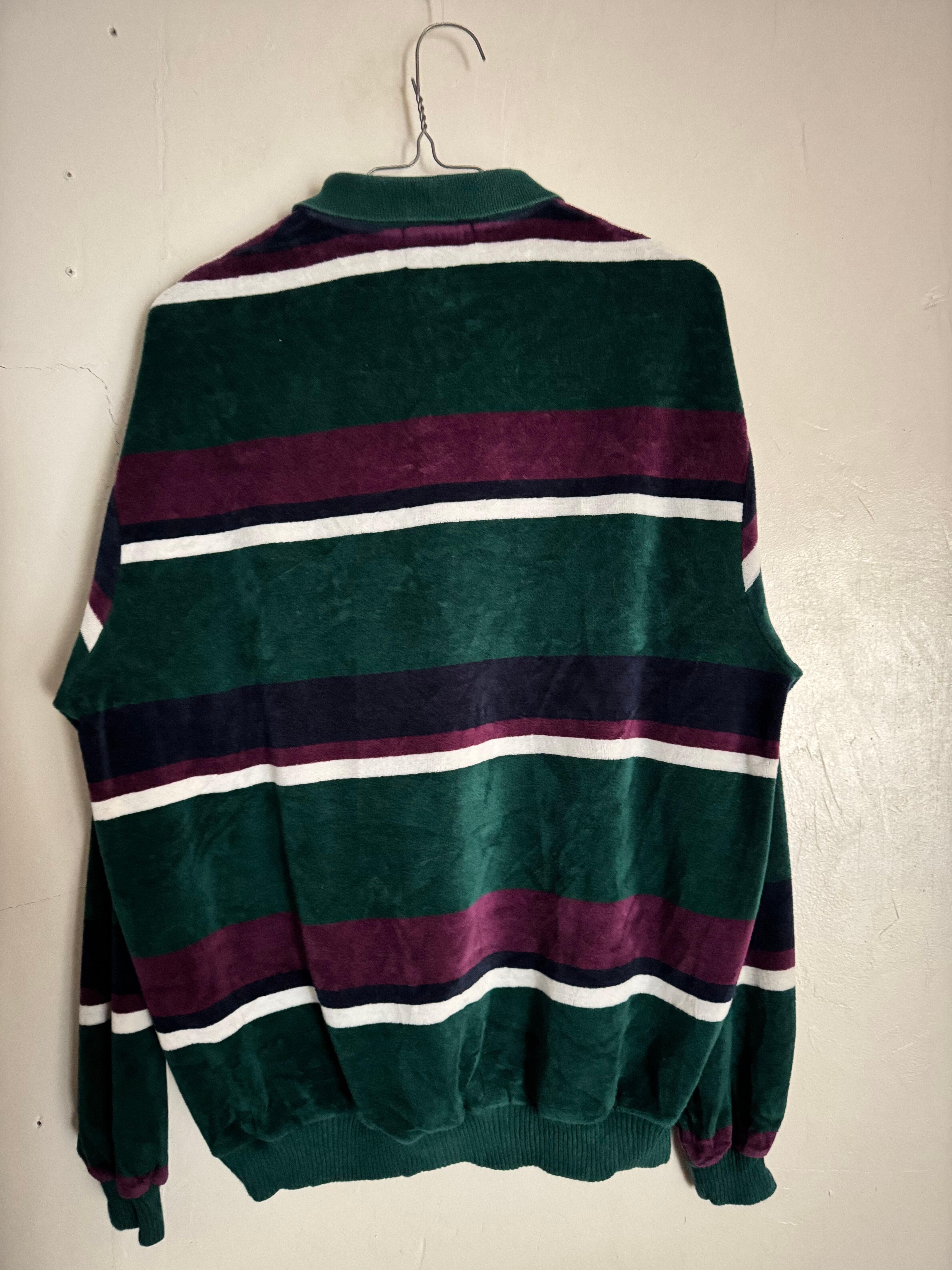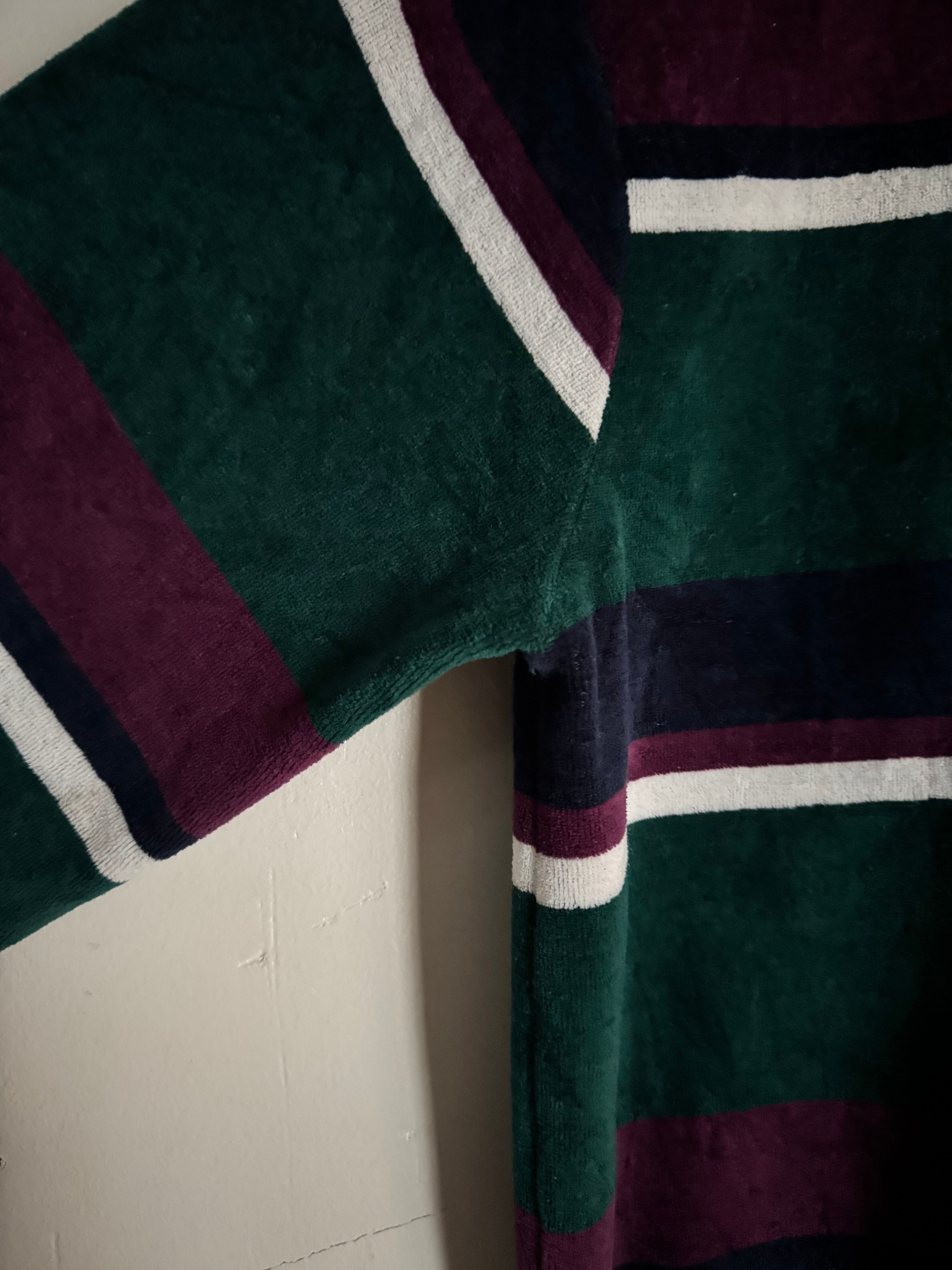 深みのあるグリーンをベースに、パープルとネイビー、ホワイトのボダーが映えるChesterfieldのベロアポロ。光沢感のある柔らかなベロア素材が特徴で、角度によって表情が変わる上品な一枚です。ゆったりとしたシルエットにリブ仕様の裾と袖口が程良い丸みを生み、クラシックながら今っぽいバランス。スラックスで品よく、デニムでカジュアルにも合わせられる万能な一着です。