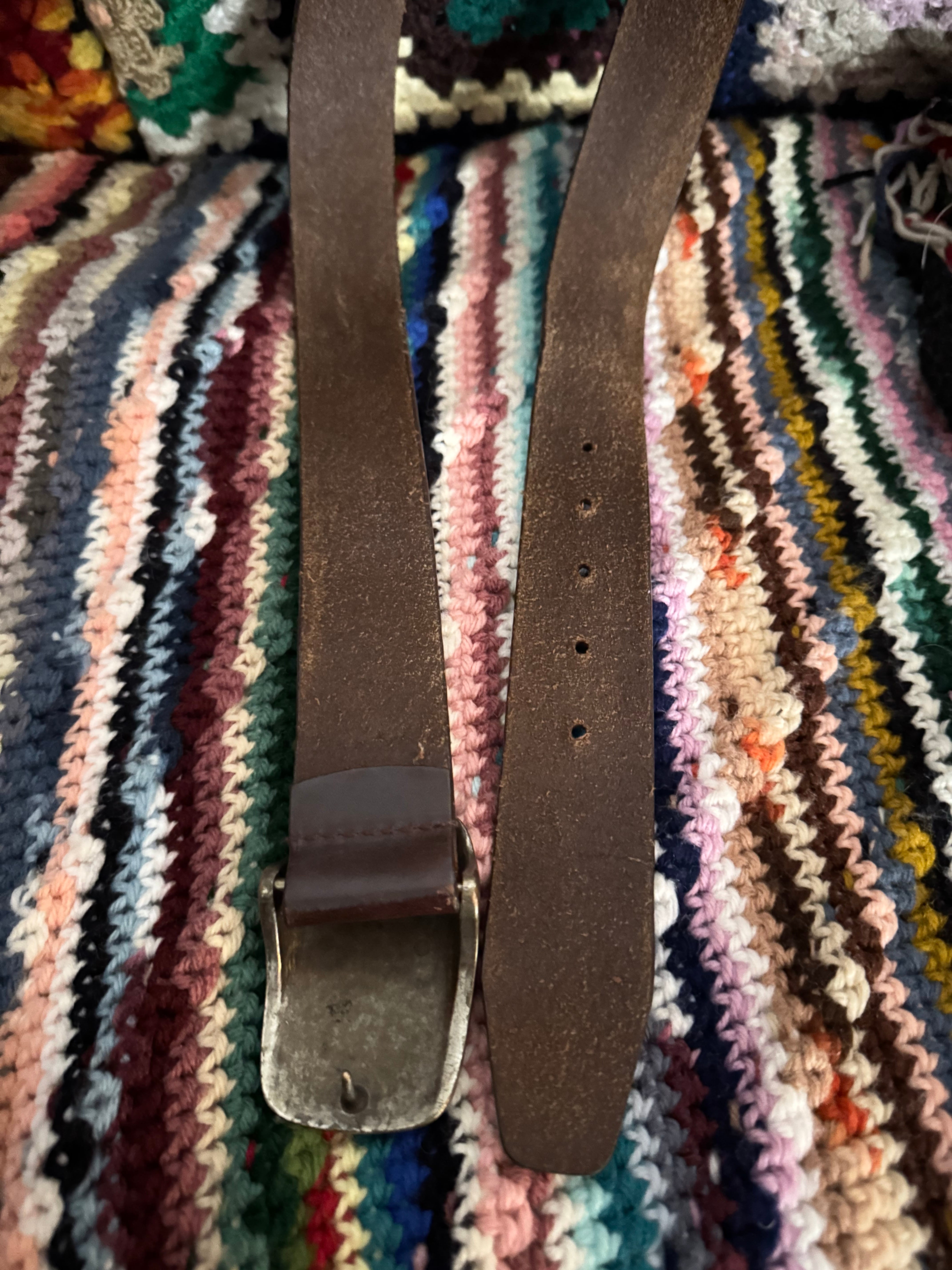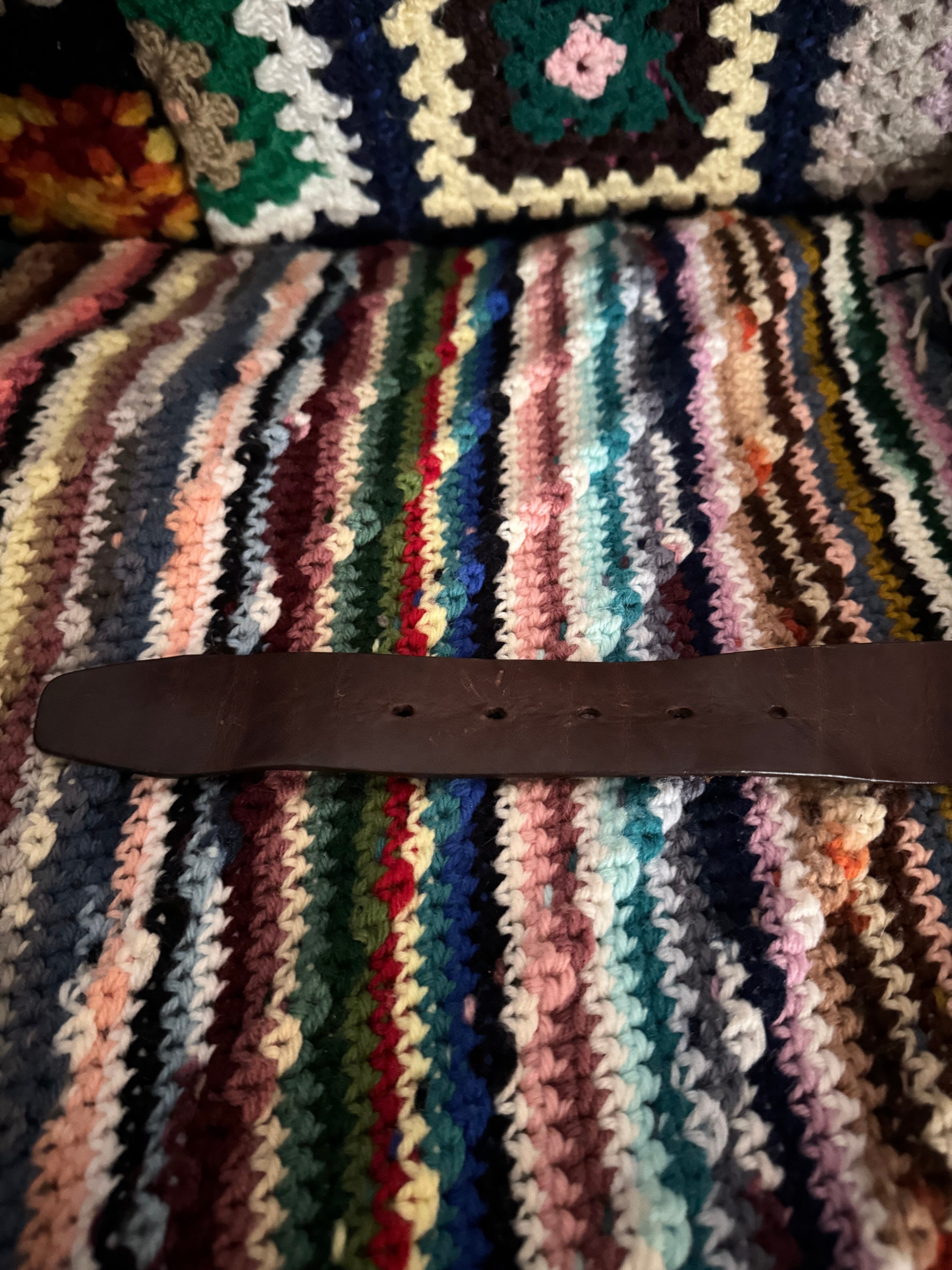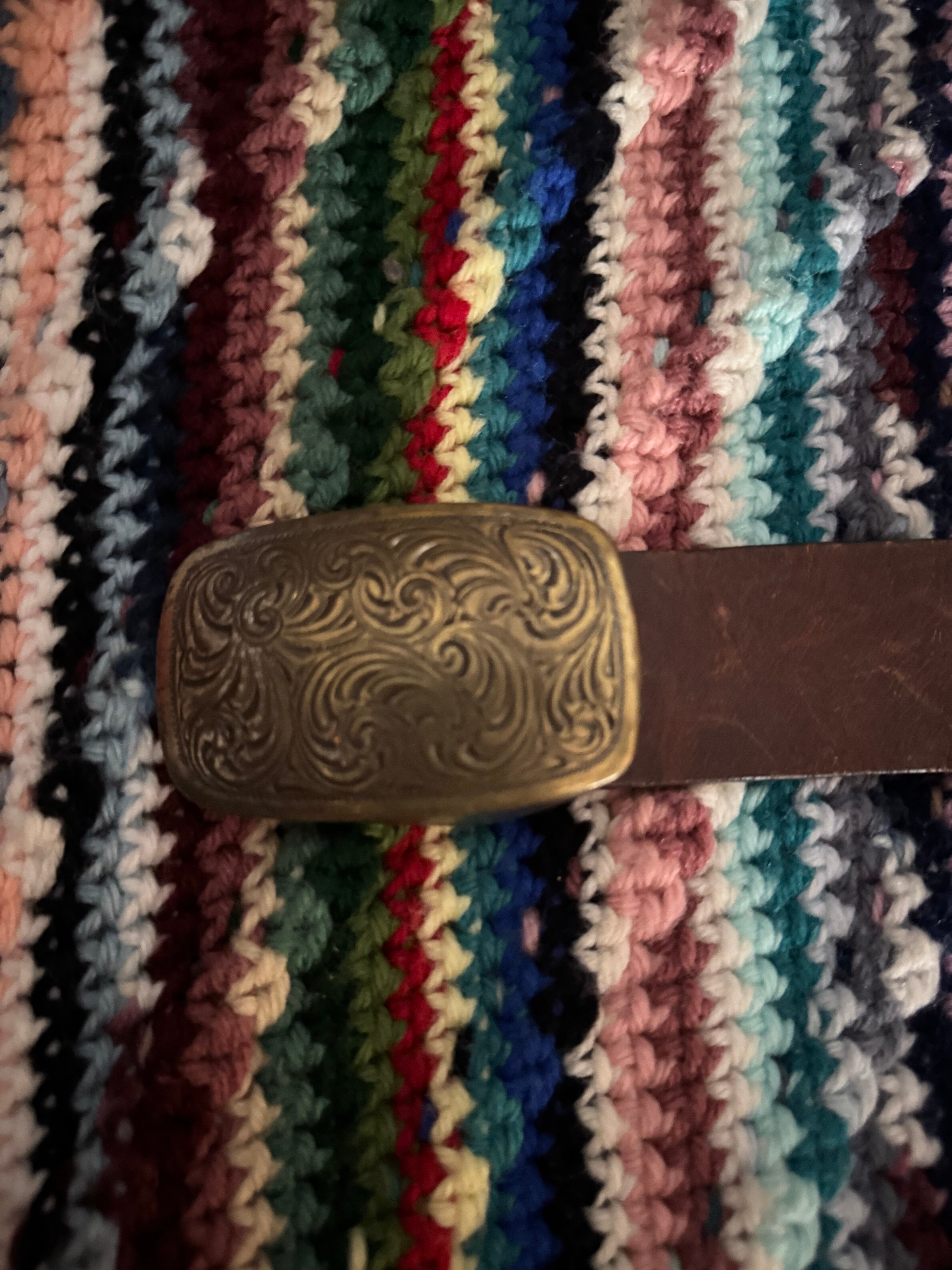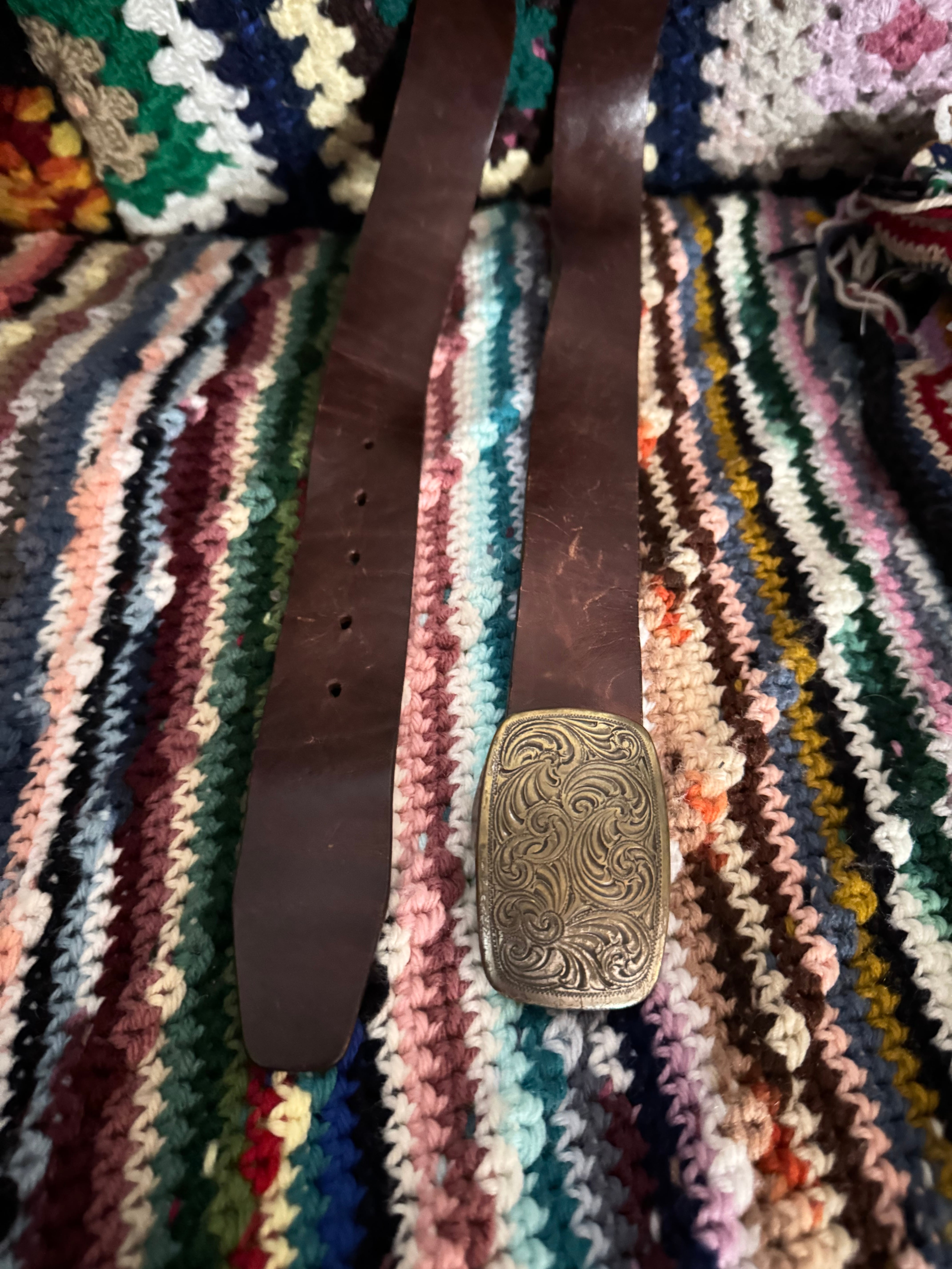 深みのあるブラウンレザーに、クラシカルな唐草模様のバックルが映えるウエスタンベルト。使い込まれたレザー特有のスレや小傷が味となり、ヴィンテージならではの雰囲気を醸し出します。重厚感のあるメタリックバックルには存在感がありながらも上品な印象。デニムやスラックスに合わせるだけでコーディネートの主役になる一本です。