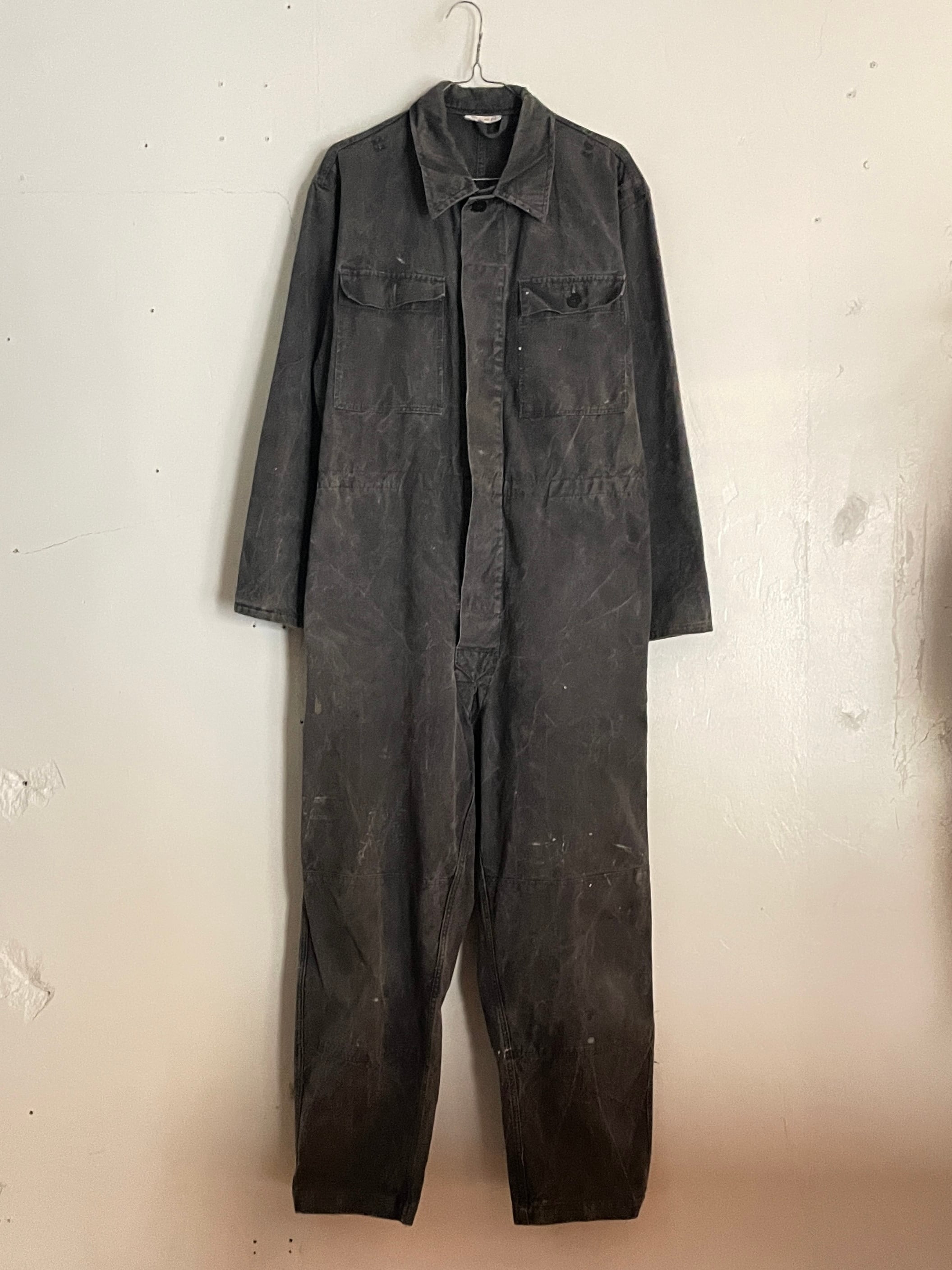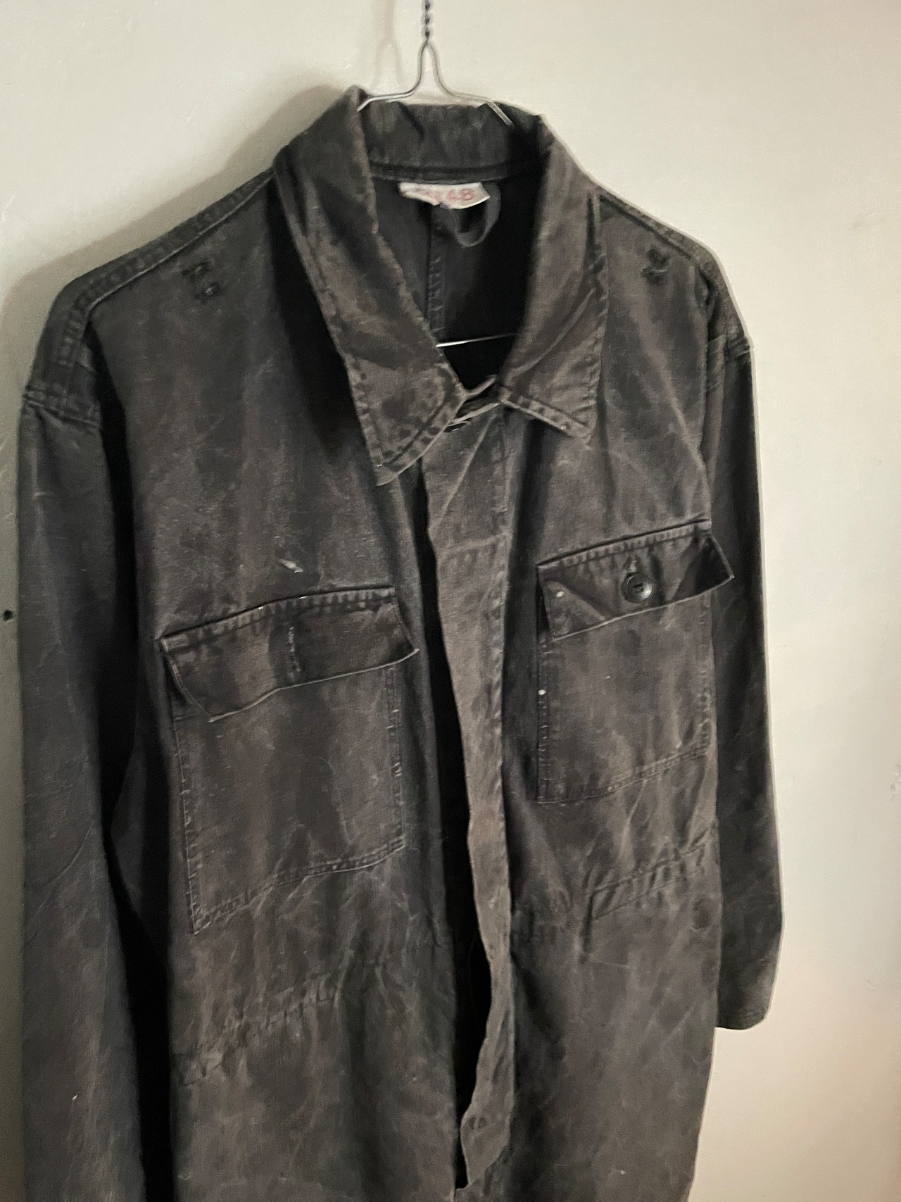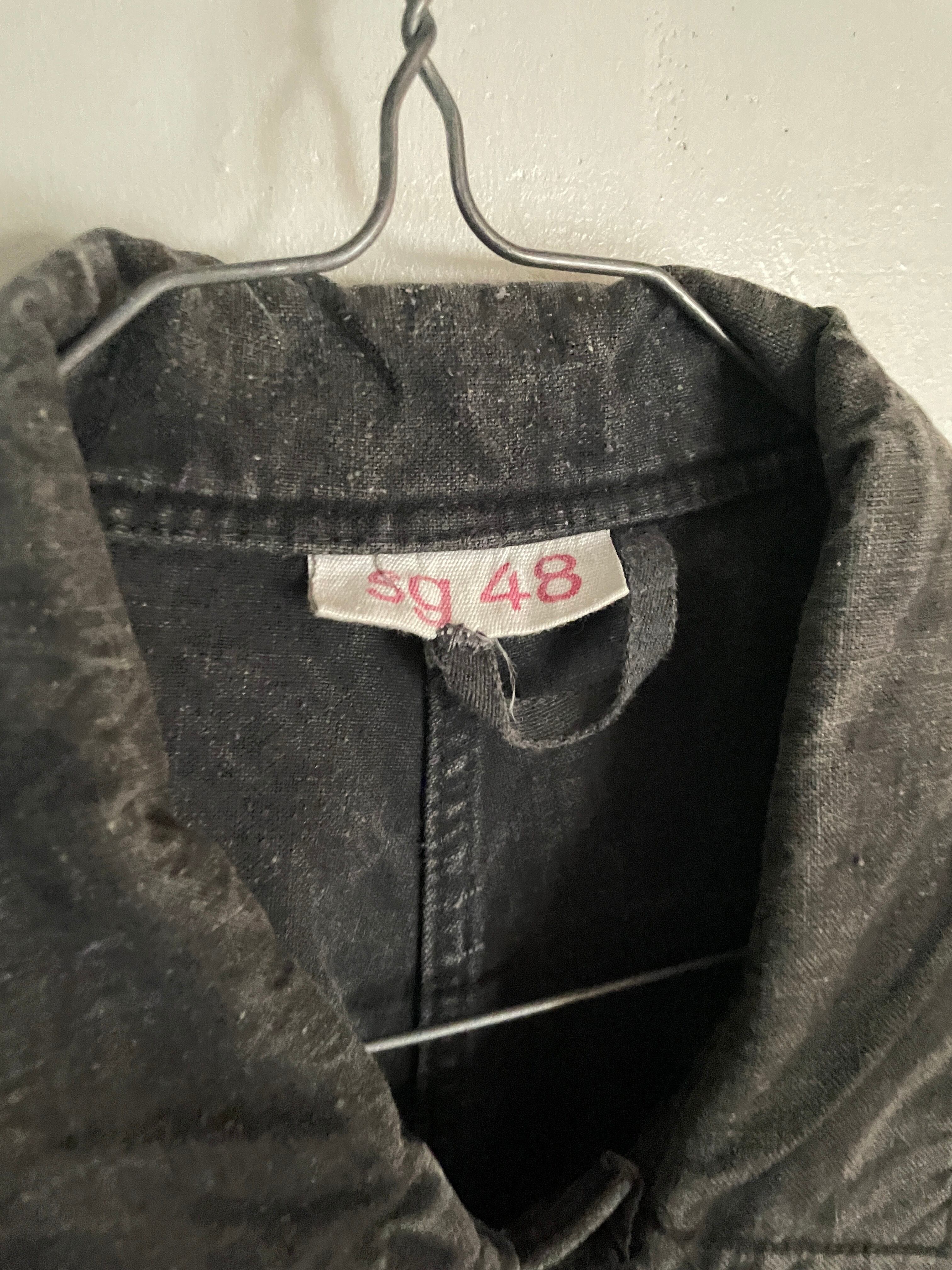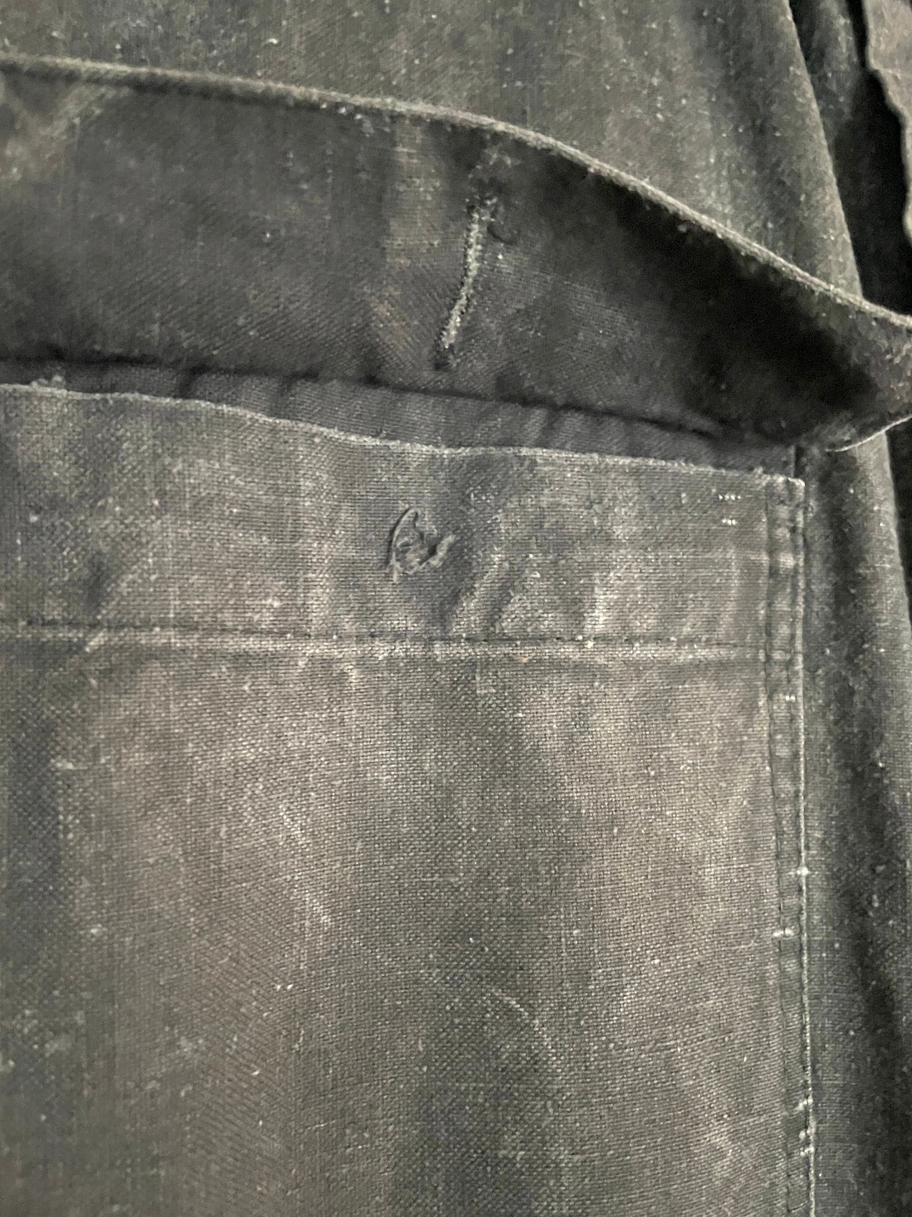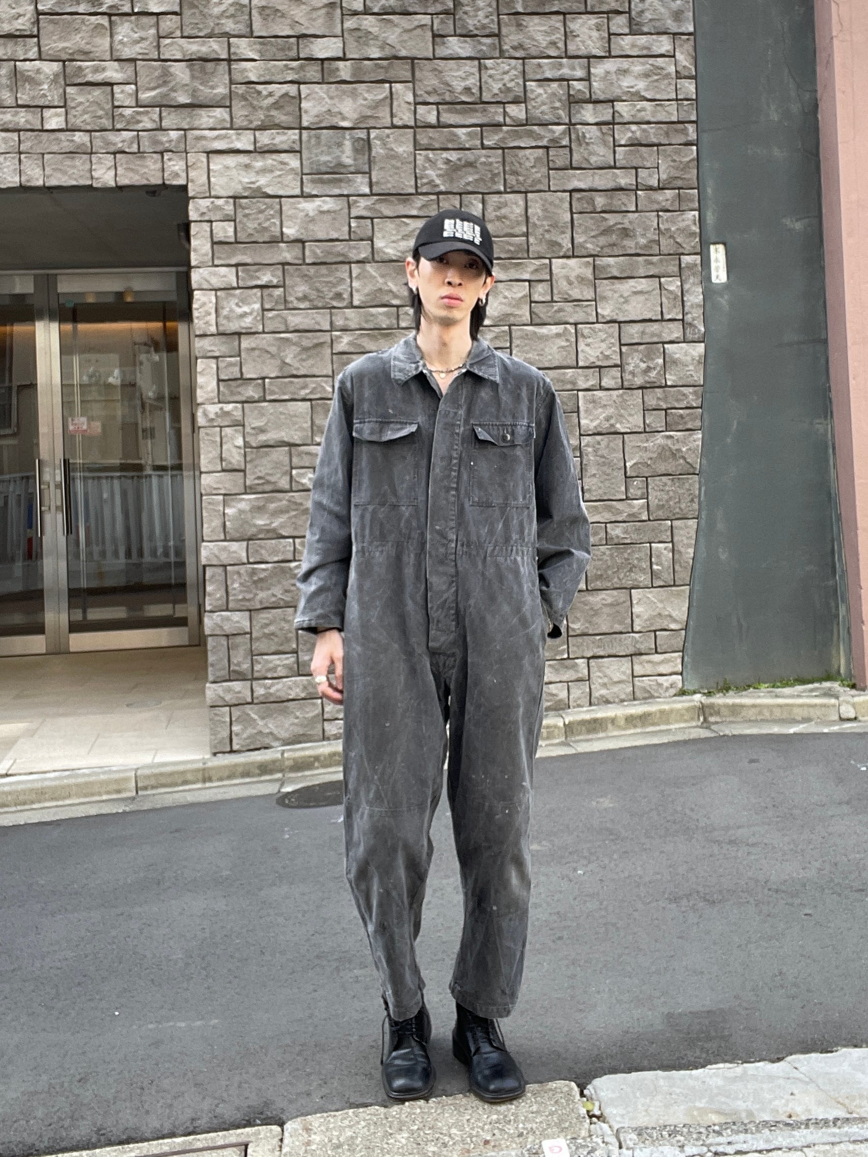 フェードがかったブラックカラーで、所々のペイントデザインが堪らなくかっこいい、東ドイツ軍のオールインワン。膝部分はオールインワンには珍しいダブルニー仕様。露骨な雰囲気が色っぽく、間違いなくファッションのメインになる一着かと思います。小さなダメージが多少見られますが、それも込みで雰囲気抜群のアイテムです。右胸ポケットのボタンが欠損しています。