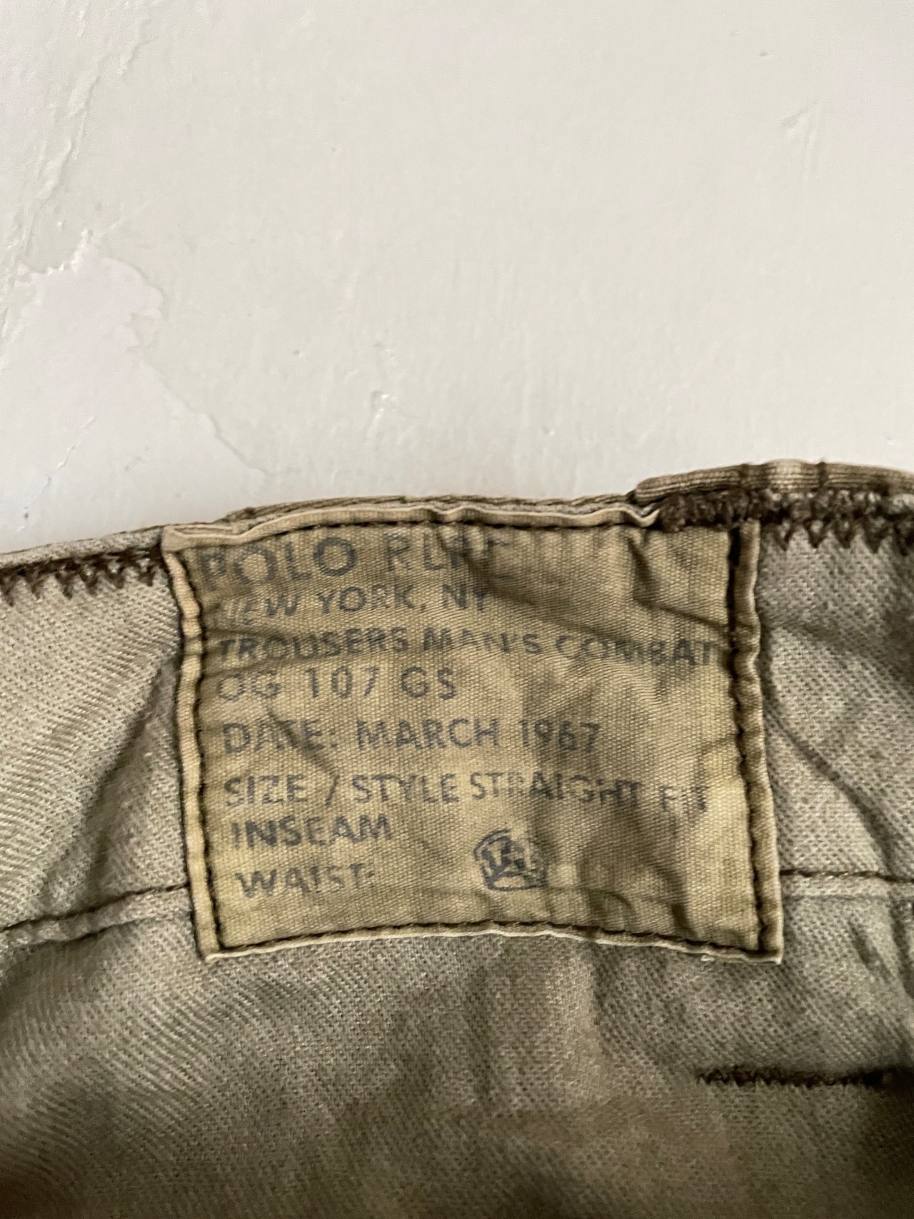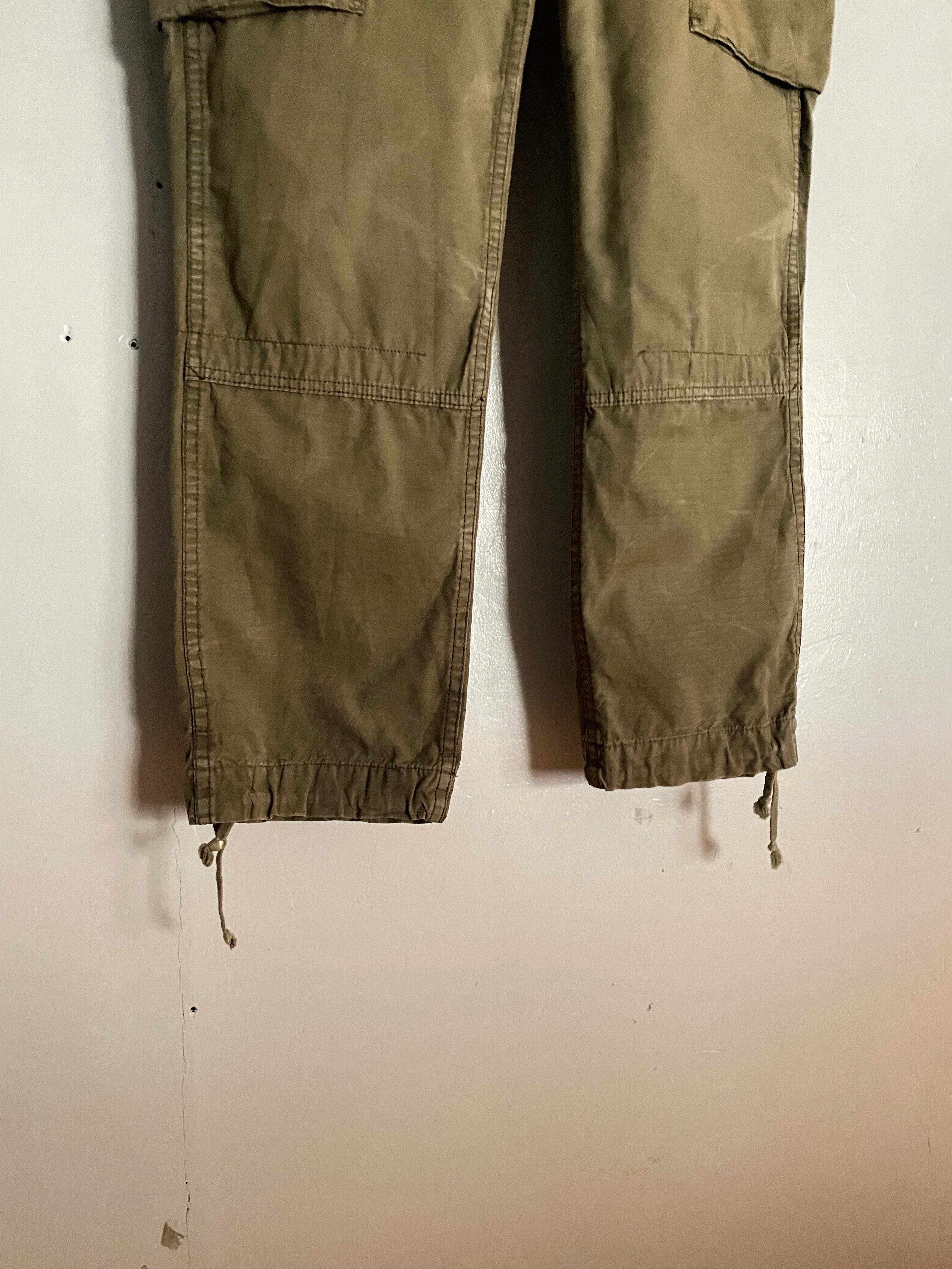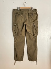 やや褪せたカーキカラーで、豊富なポケットデザインが魅力的な、ラルフローレンのカーゴパンツ。カナダ軍のミリタリーパンツをサンプリングとしたディテールが特徴的です。マルチポケットやパラシュートボタンが配置されています。裾にはドローコード付きなので、縛って履いてもまた違ったシルエットになってかっこよさそうです。軽めなコットン素材なので、楽に履きやすく、春にはぴったりなパンツかと思います。太過ぎず、細過ぎない、バランス感のいい一本です。
