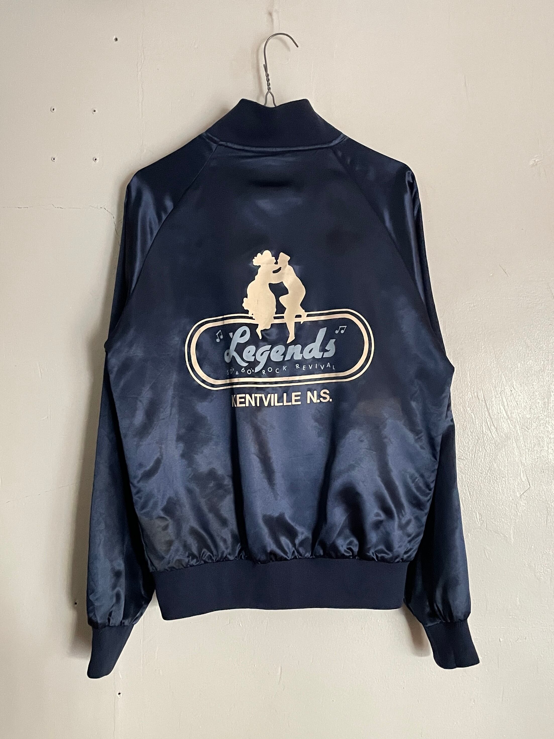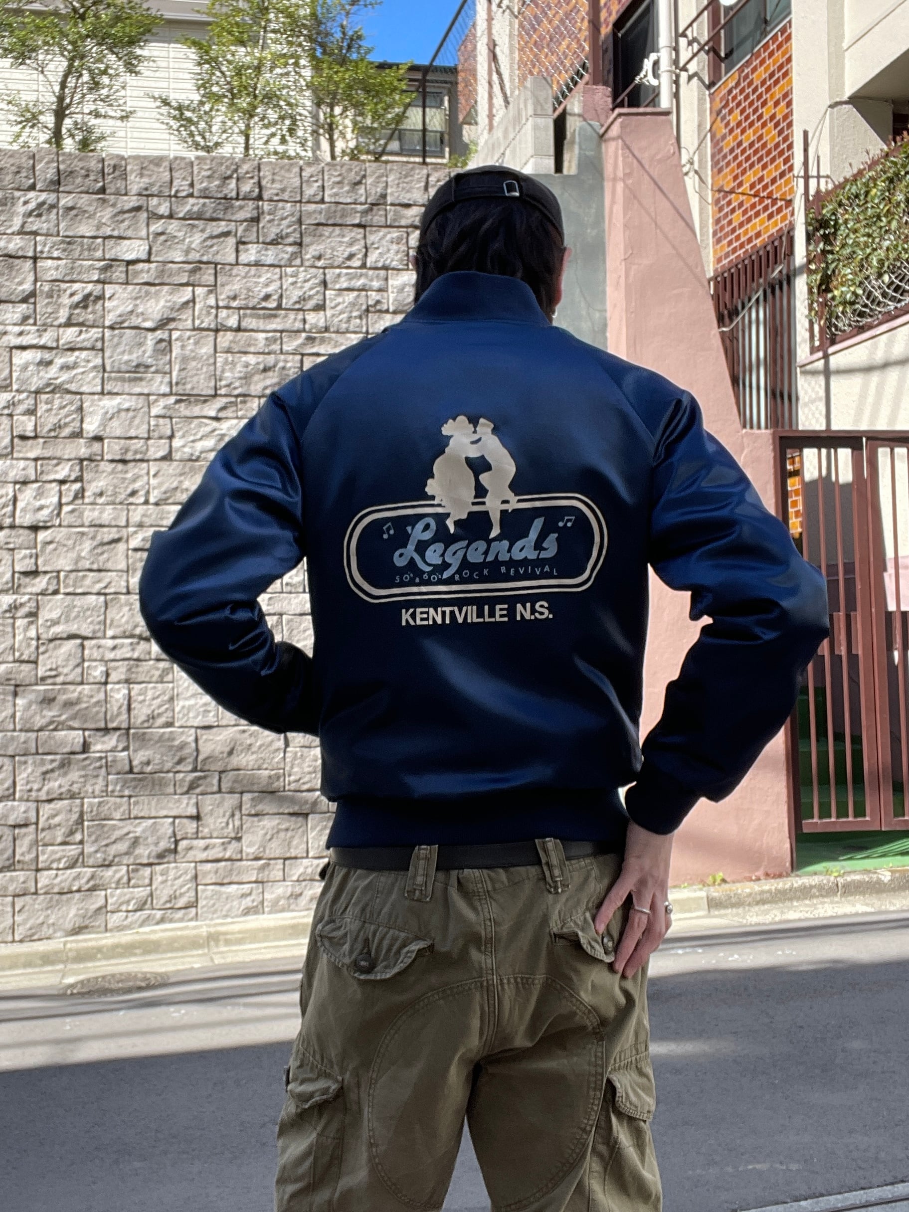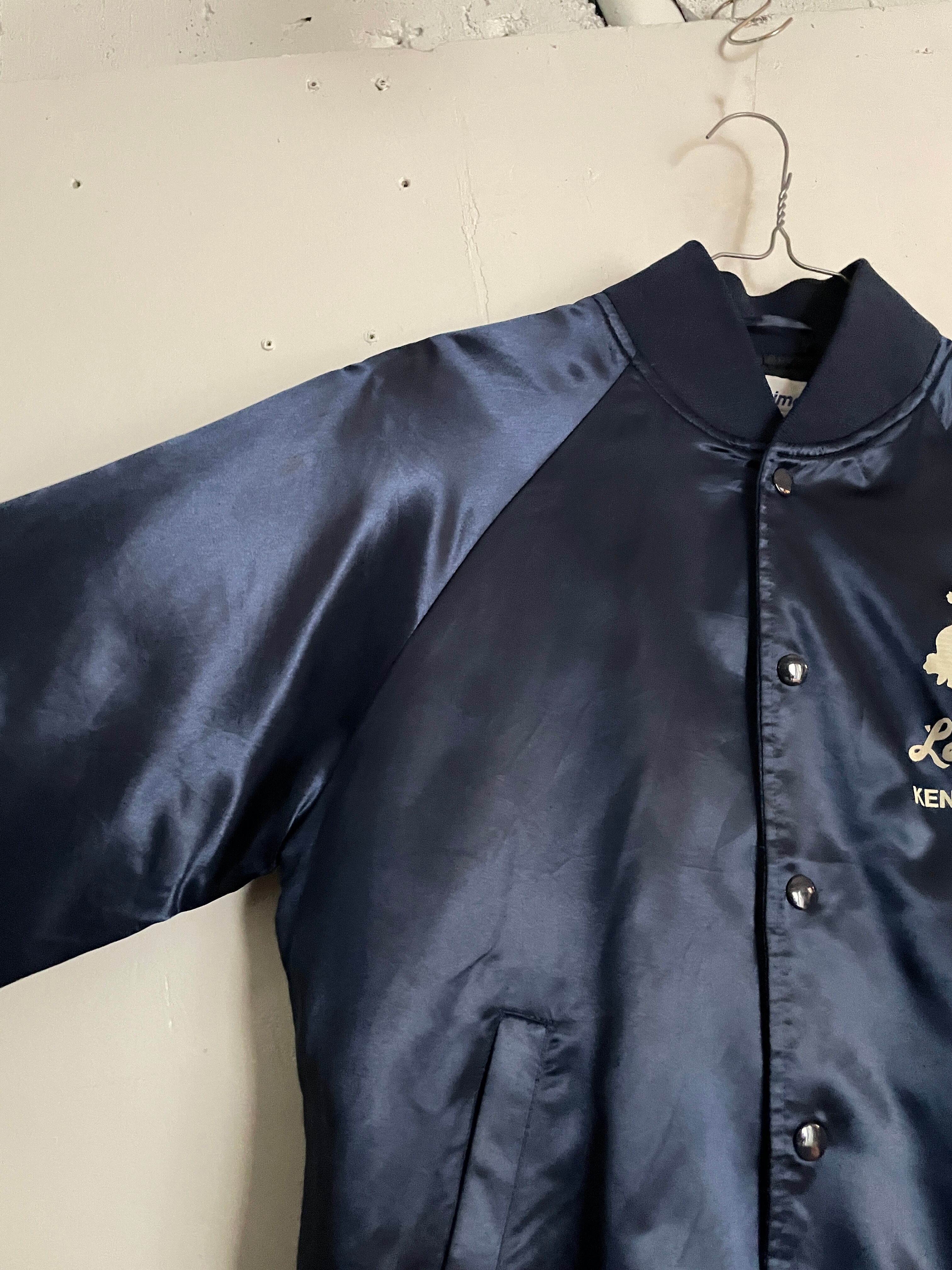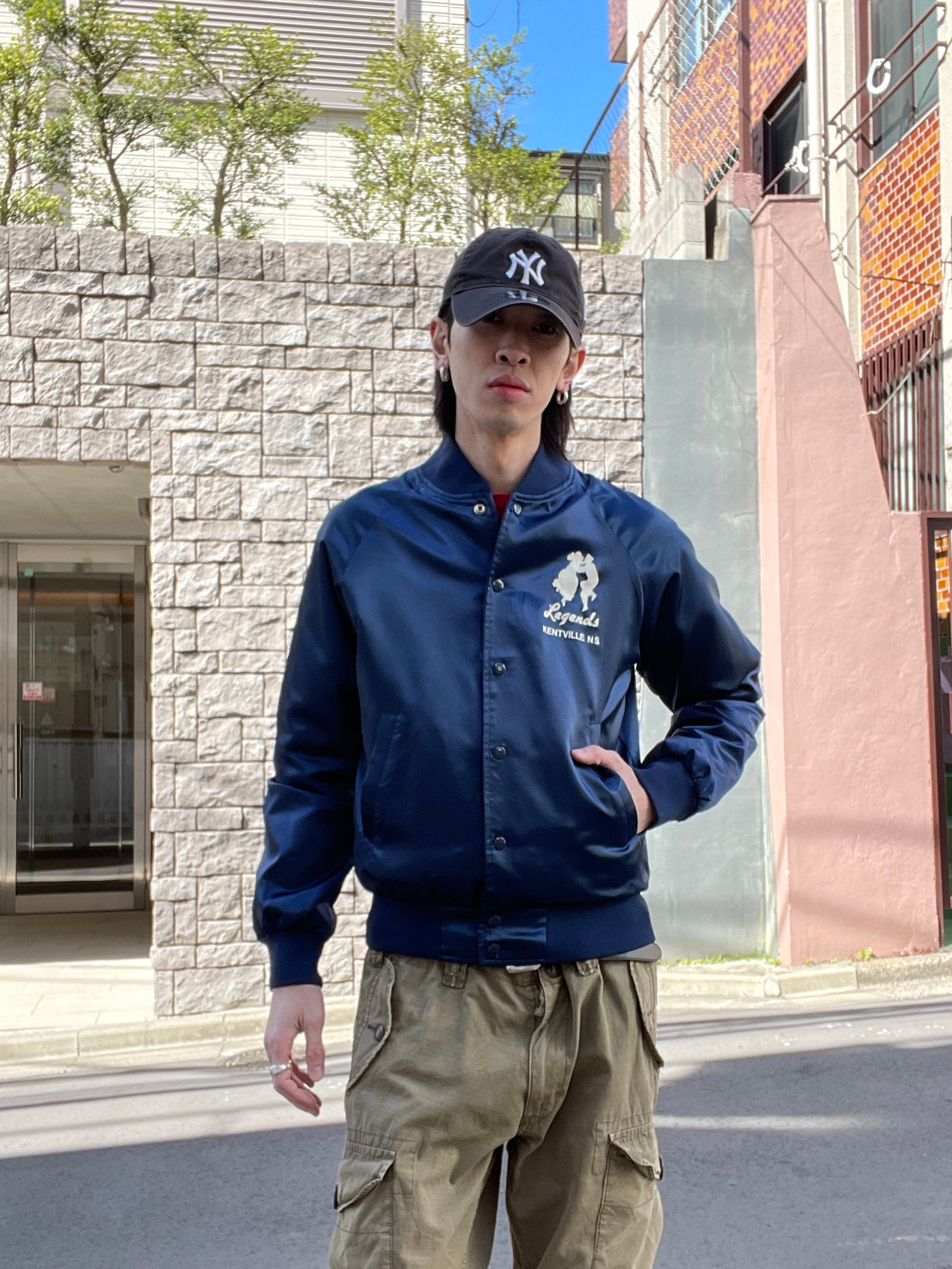 光沢のあるネイビーボディに、男女が踊っているシルエットとロックリバイバルのイベントプリントが両面に施されたナイロンスナップブルゾン。前はフロント部分に控えめなワンポイント。バックにはデカプリントが施されています。サラッとしたナイロン素材なので、春には間違いなく主役になってくれそうです。両面でしっかりとメリハリが付けられた一着。大き過ぎず、小さ過ぎないサイズ感なので男女共におすすめしたい一着です。