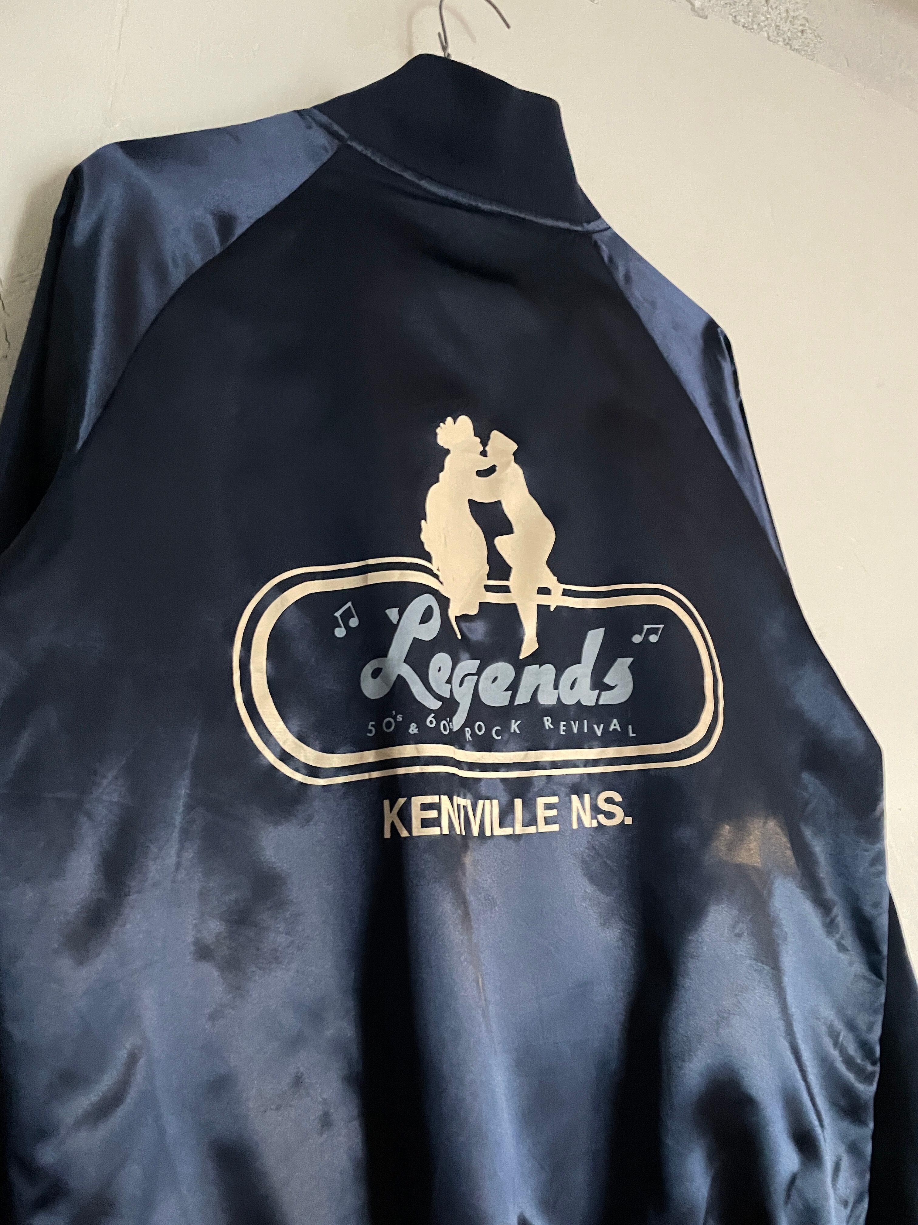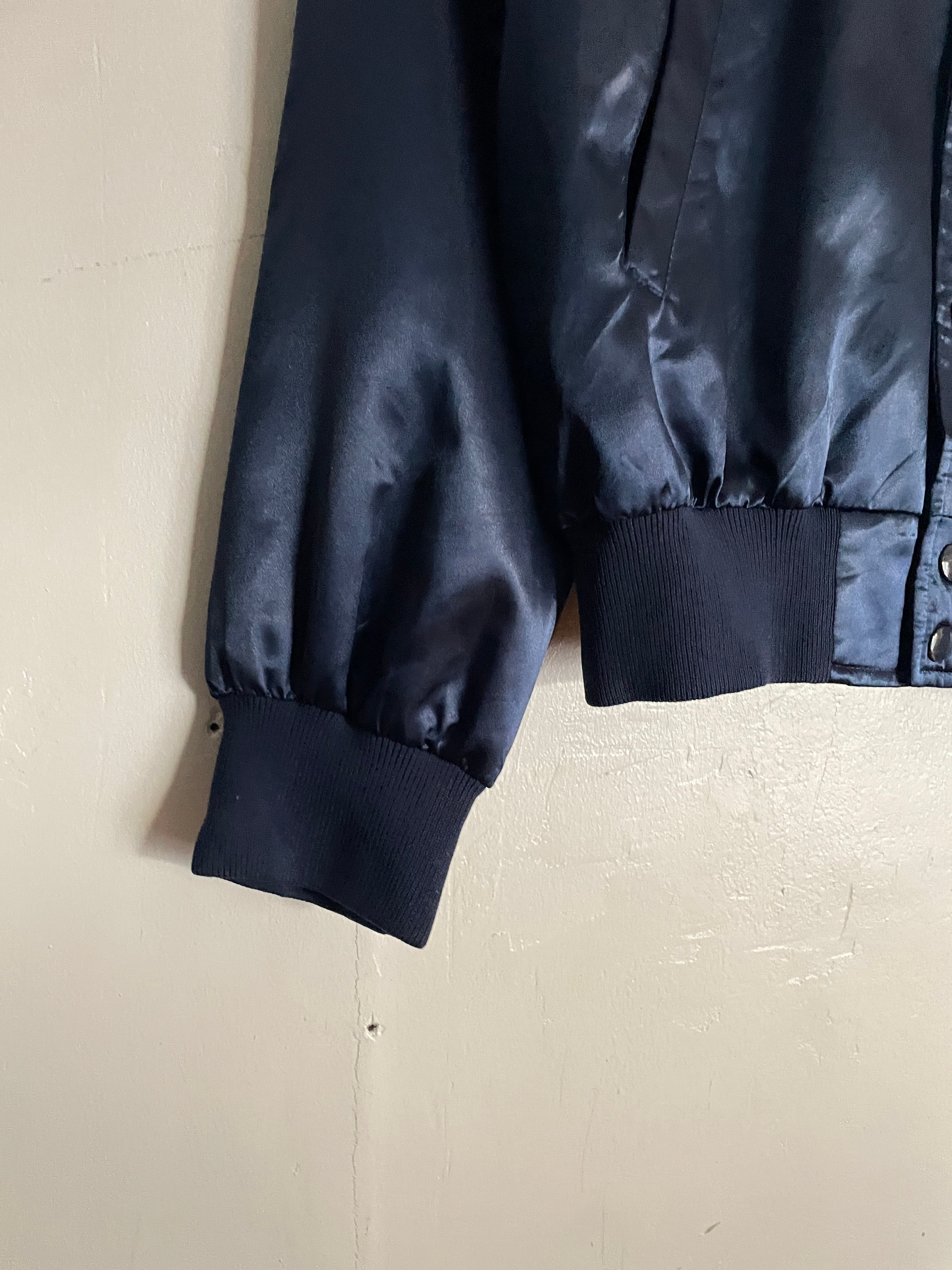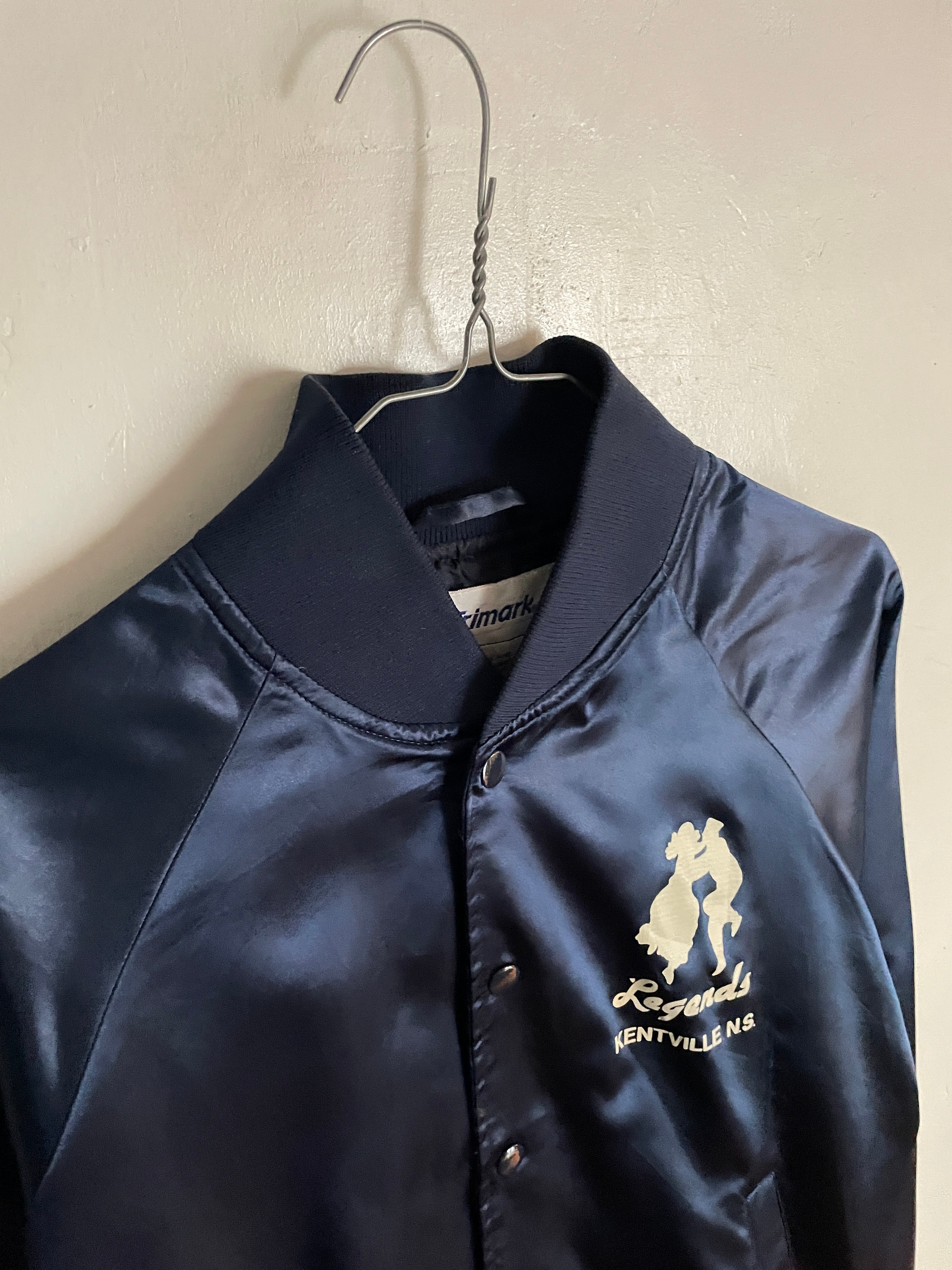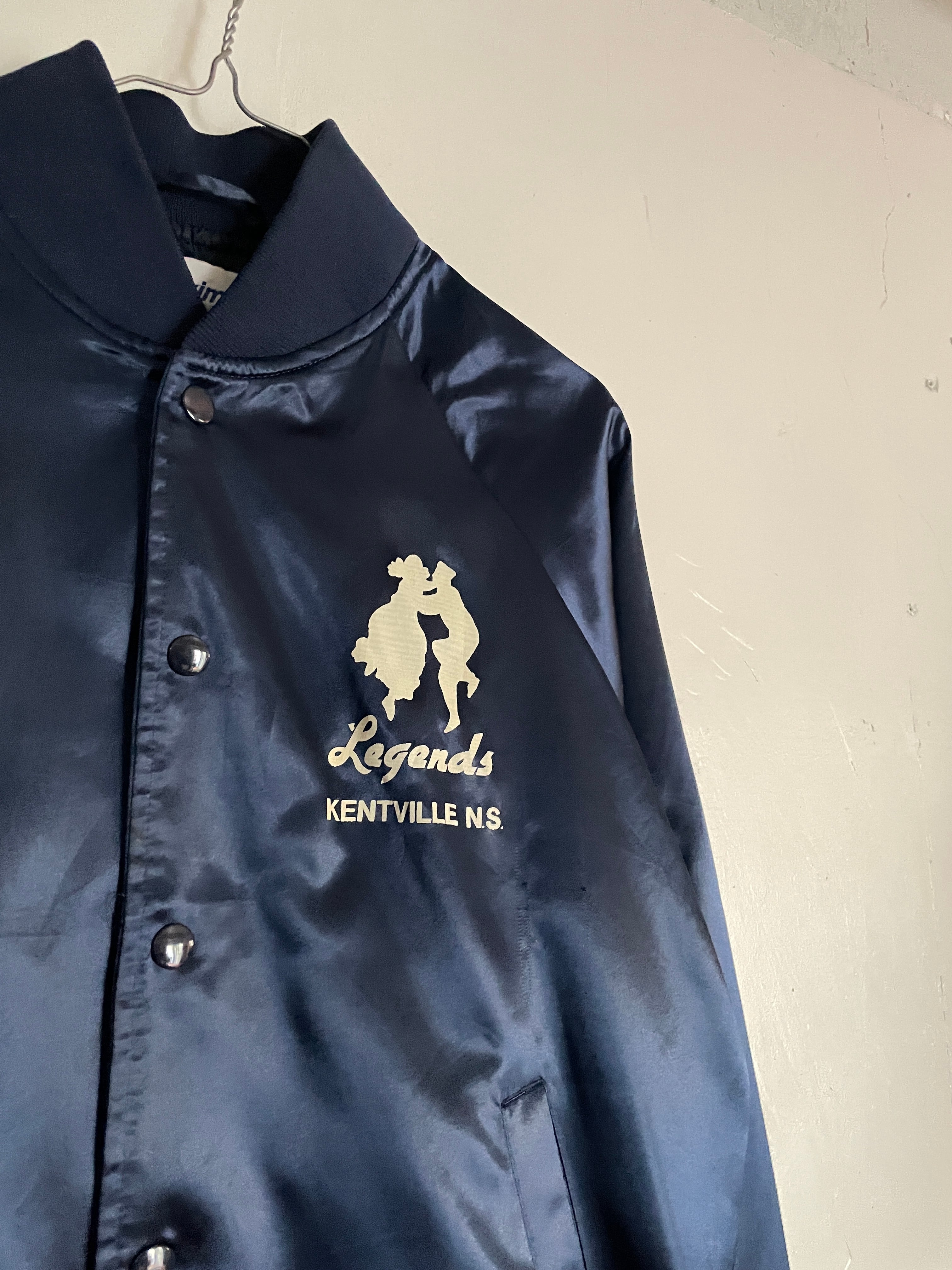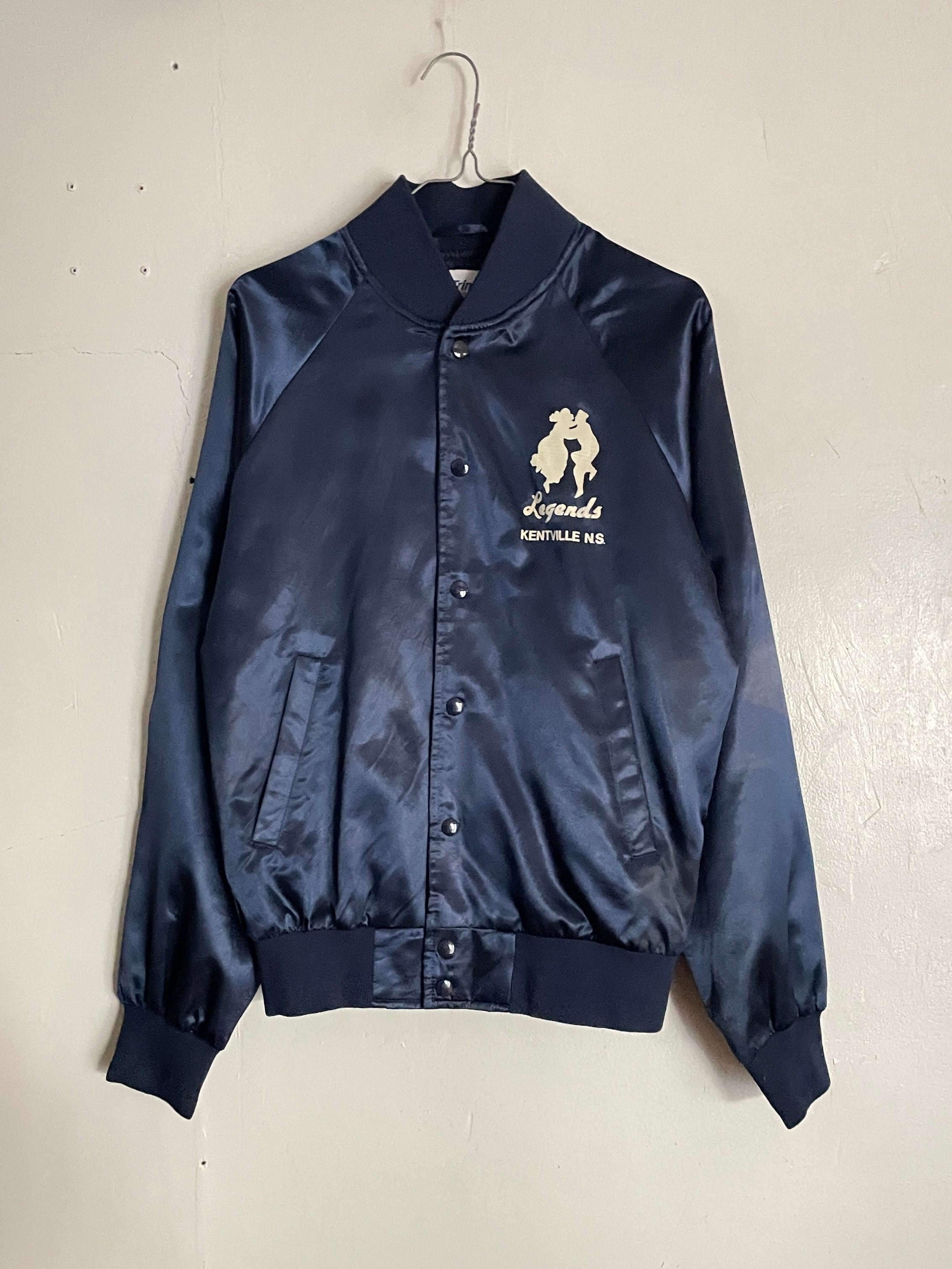 光沢のあるネイビーボディに、男女が踊っているシルエットとロックリバイバルのイベントプリントが両面に施されたナイロンスナップブルゾン。前はフロント部分に控えめなワンポイント。バックにはデカプリントが施されています。サラッとしたナイロン素材なので、春には間違いなく主役になってくれそうです。両面でしっかりとメリハリが付けられた一着。大き過ぎず、小さ過ぎないサイズ感なので男女共におすすめしたい一着です。