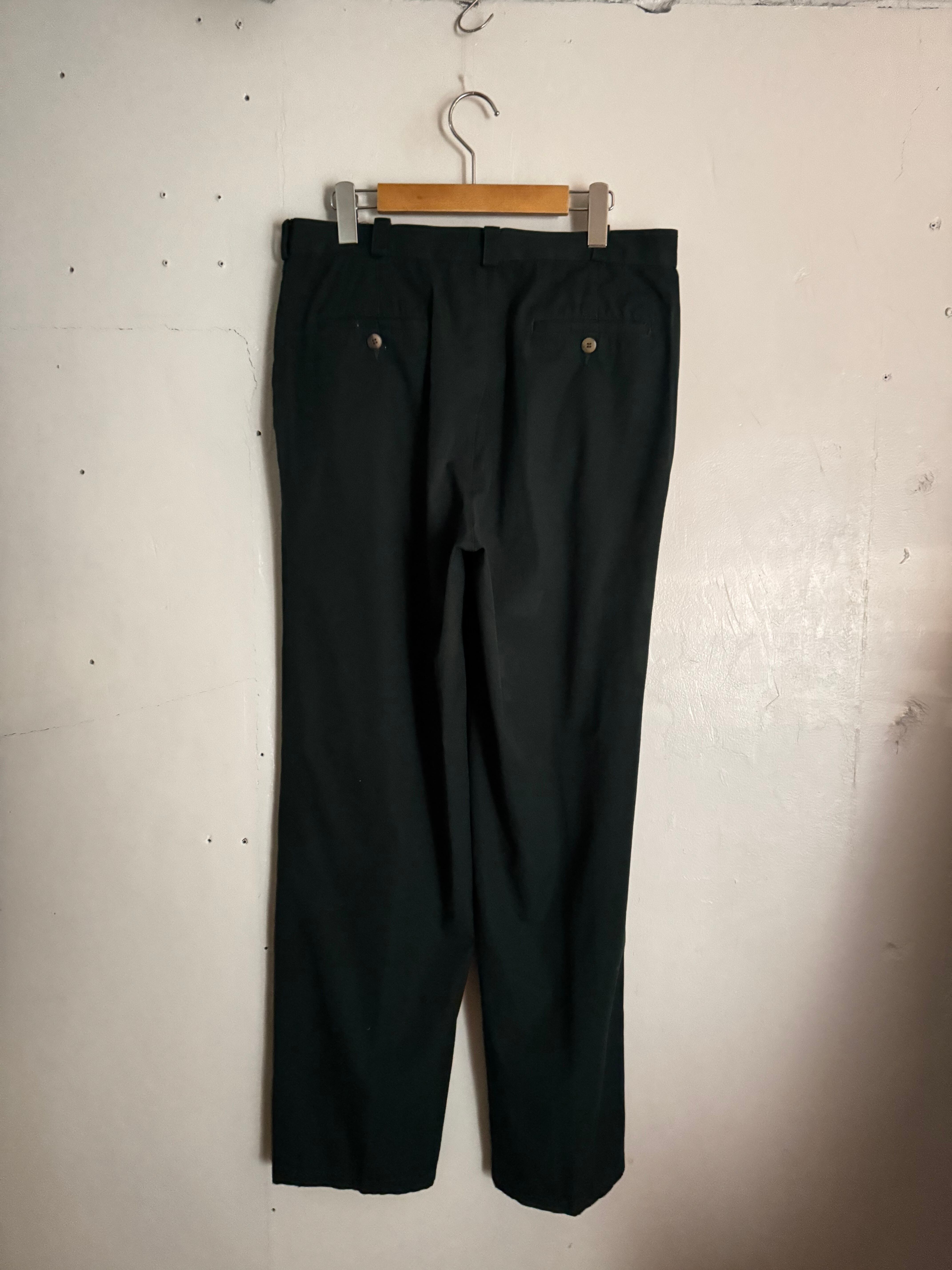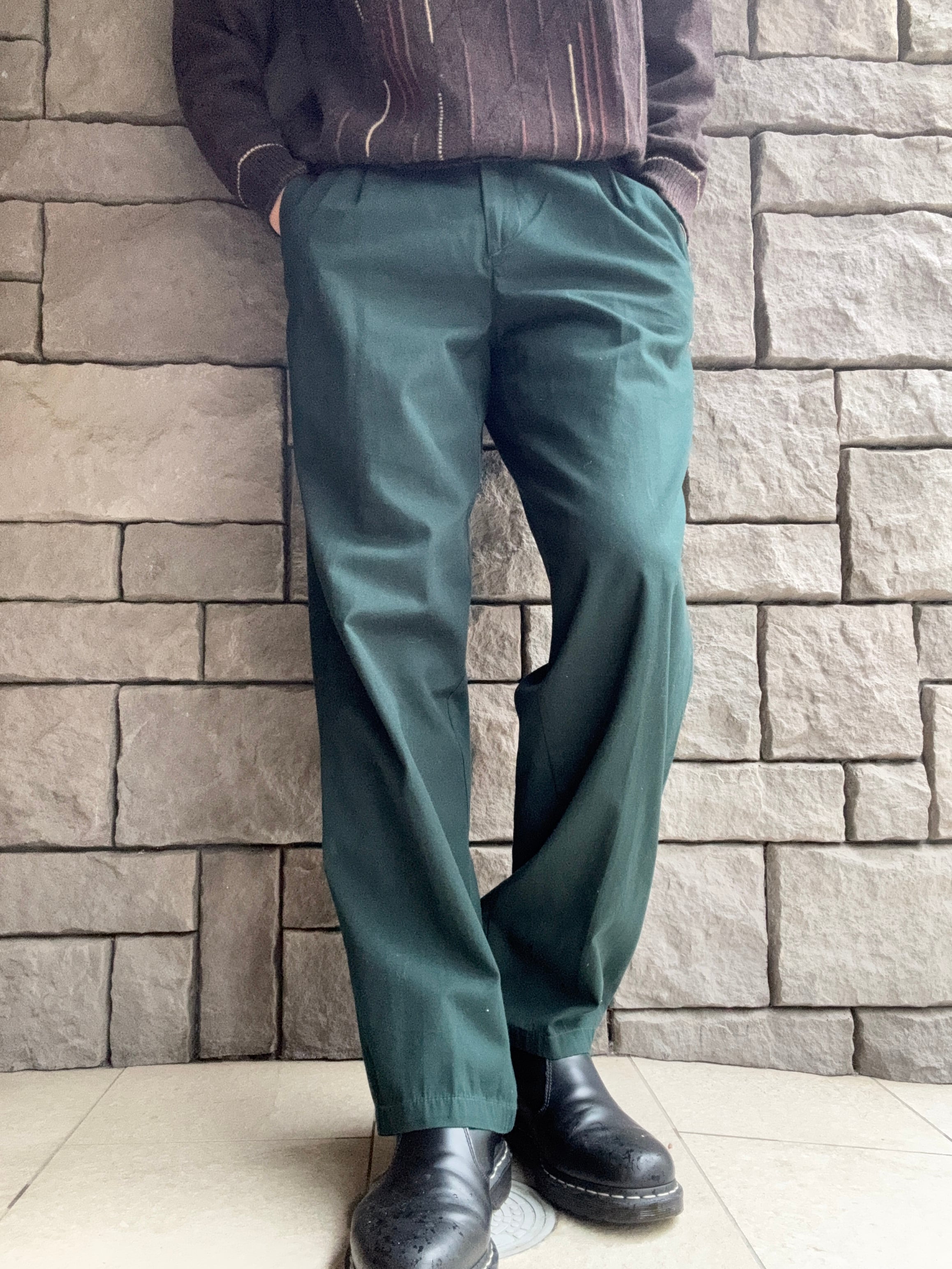 PERRY ELLISのスラックス。落ち着いたグリーンカラーが印象的な一本で、シンプルながらもコーディネートのアクセントとして活躍してくれるアイテムです。フロントはツータック仕様になっており、腰回りに程良いゆとりを持たせつつ裾に向かって綺麗に落ちるシルエットが魅力的。落ち着いた色味で使い勝手も良く、一本持っていると幅広いスタイリングに取り入れやすいアイテムです。