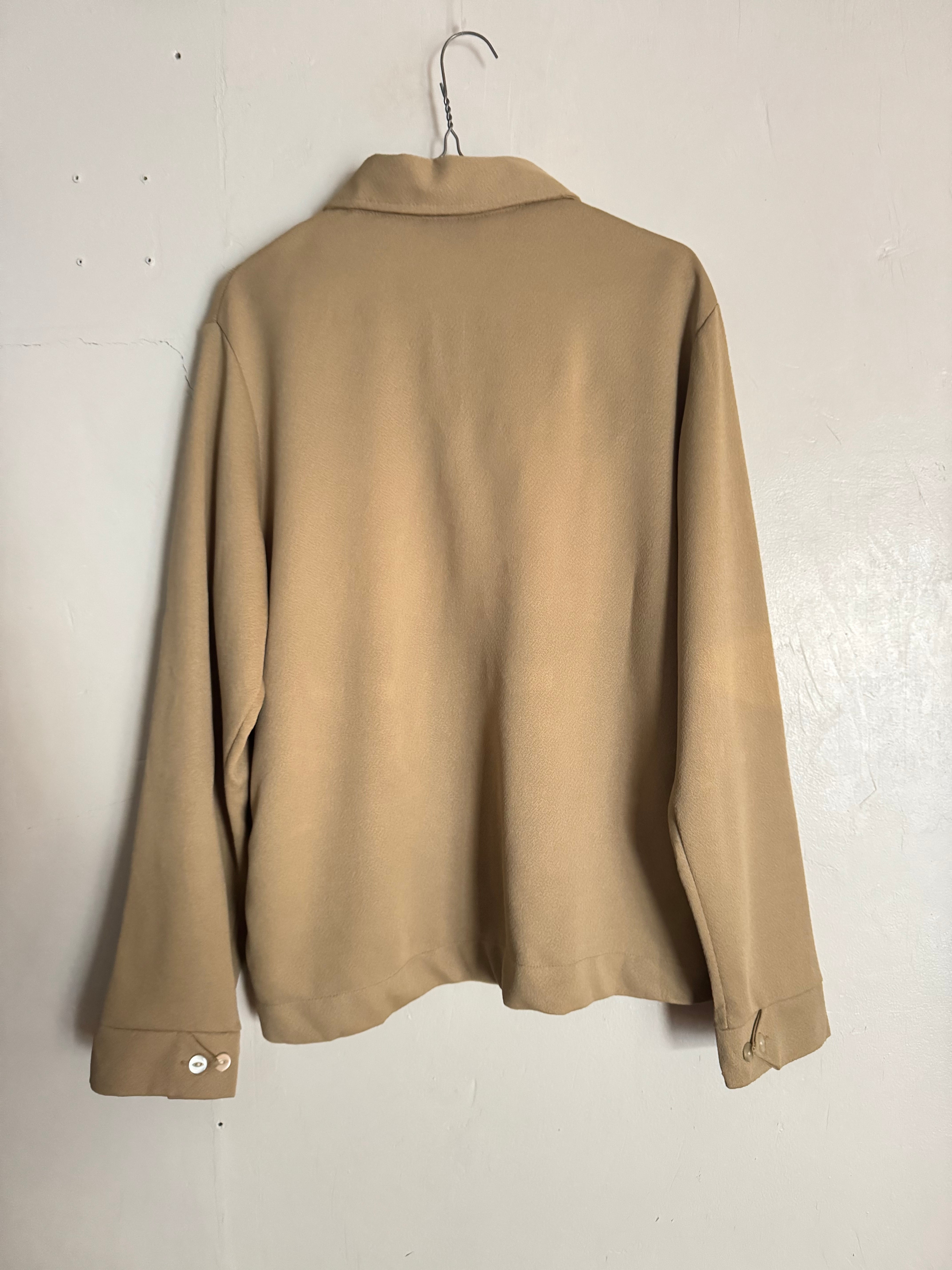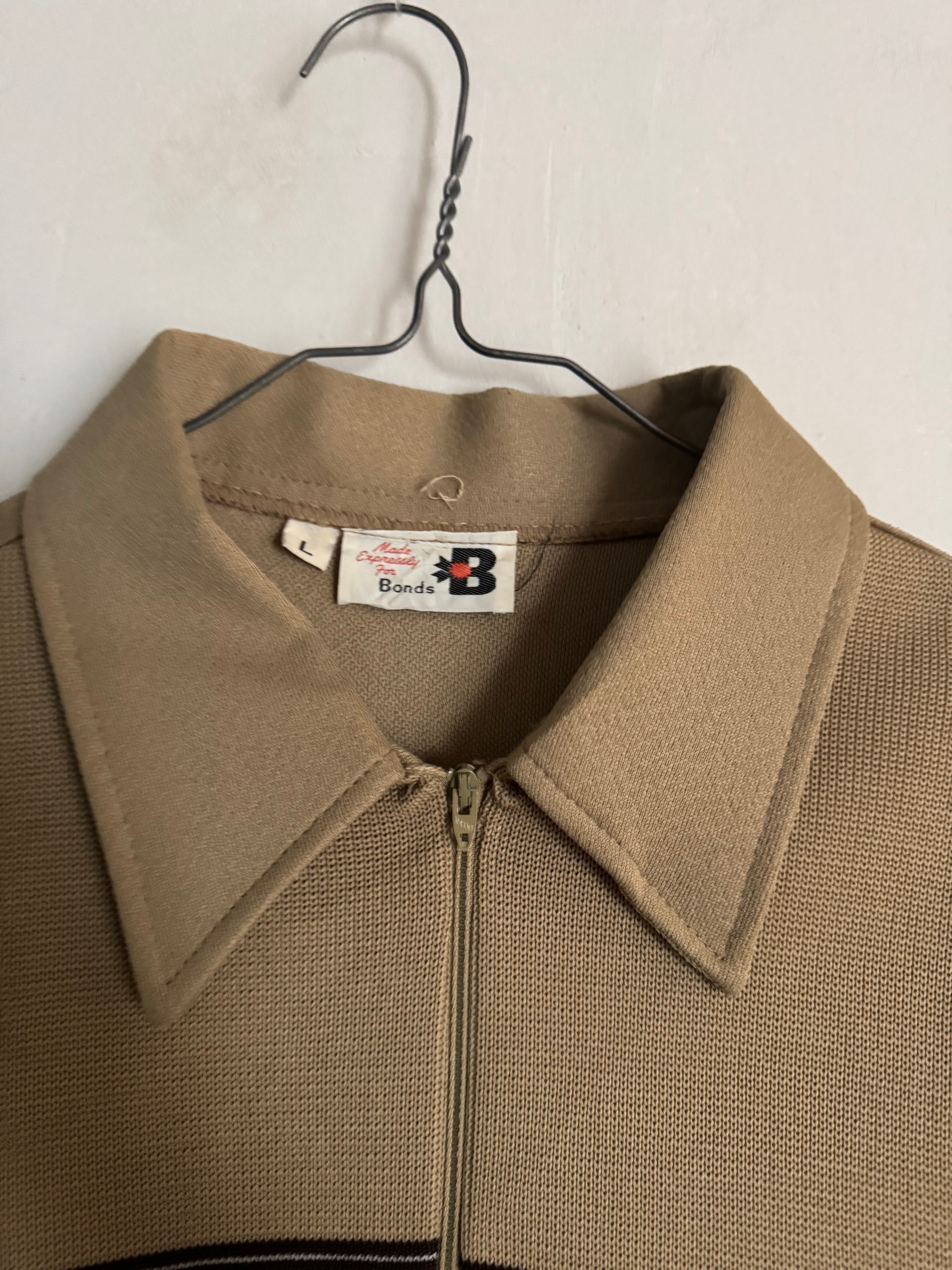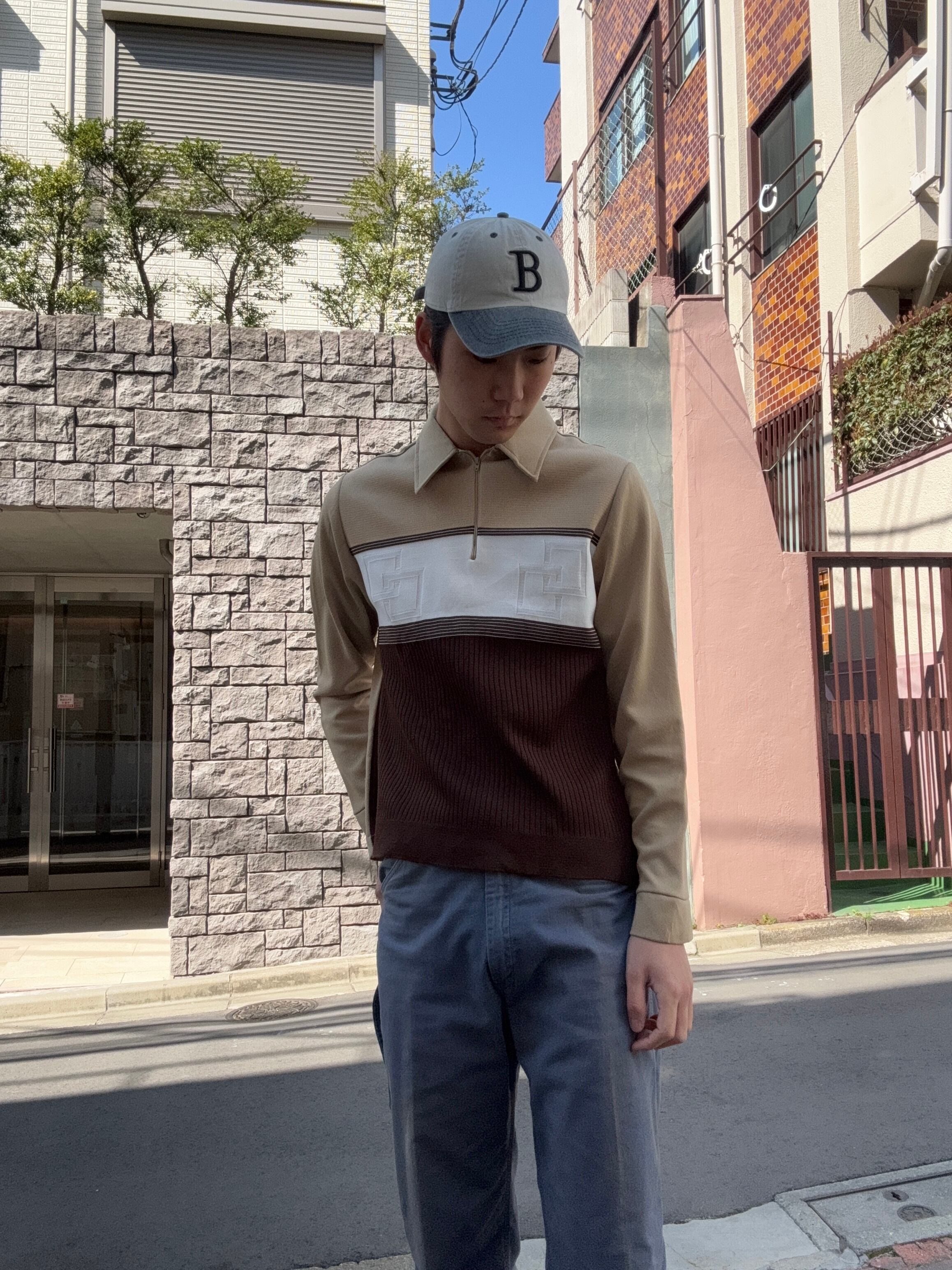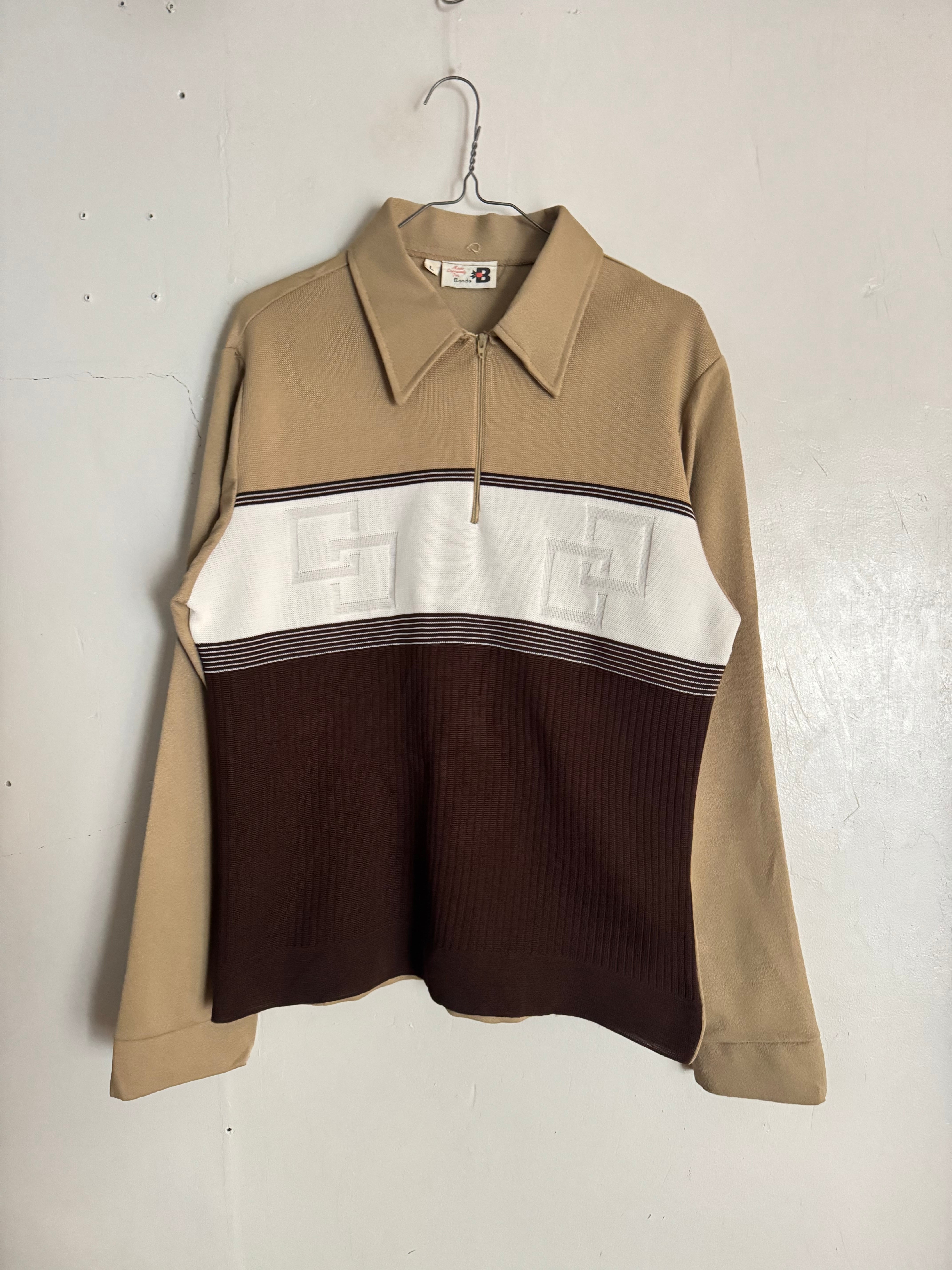 落ち着いたベージュ、アイボリー、ブラウンの3トーンで構成されたヴィンテージのハーフニットポロ。胸元の切り替え部分には立体的な織り柄が施されており、シンプルながら程良いアクセントになっています。下部はリブ編みになっており、ニットならではの柔らかな表情とクラシックな雰囲気が魅力の一着です。幅広いボトムスと合わせやすく、古着らしい落ち着いたカラーリングでコーディネートにも取り入れやすいアイテムです。