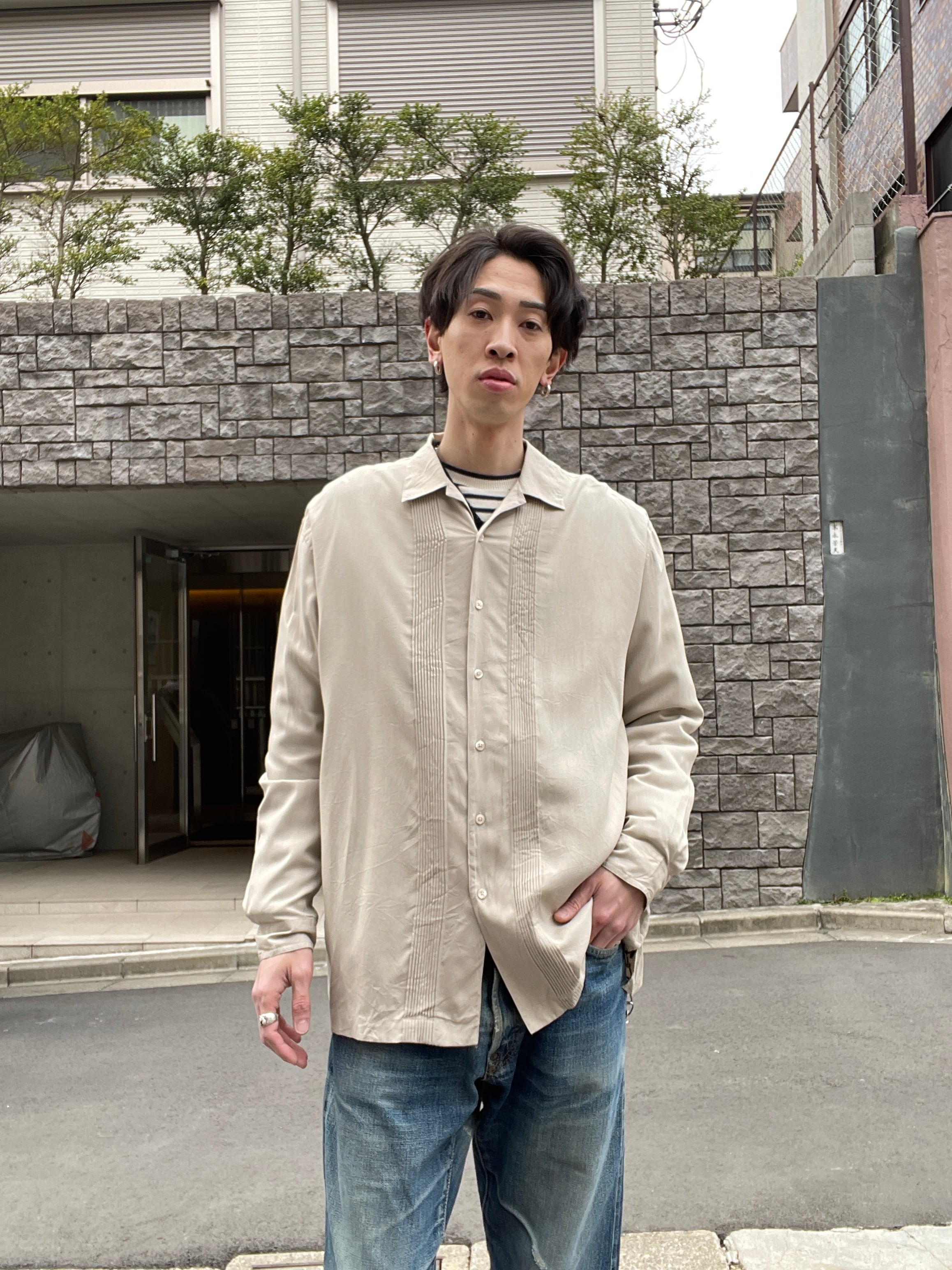 上品なベージュボディに、プリーツデザインが施された、ペリーエリスのシルクシャツ。サラッとした軽いシルク素材なので、ラフに着られるシャツです。主張の激し過ぎないデザインなので、様々なファッションに取り入れやすいアイテムかと思います。ゆったりとしたかなりのビッグサイズ。男性の方はもちろんですが、女性の方もワンピースっぽく着たらお洒落かと思います。