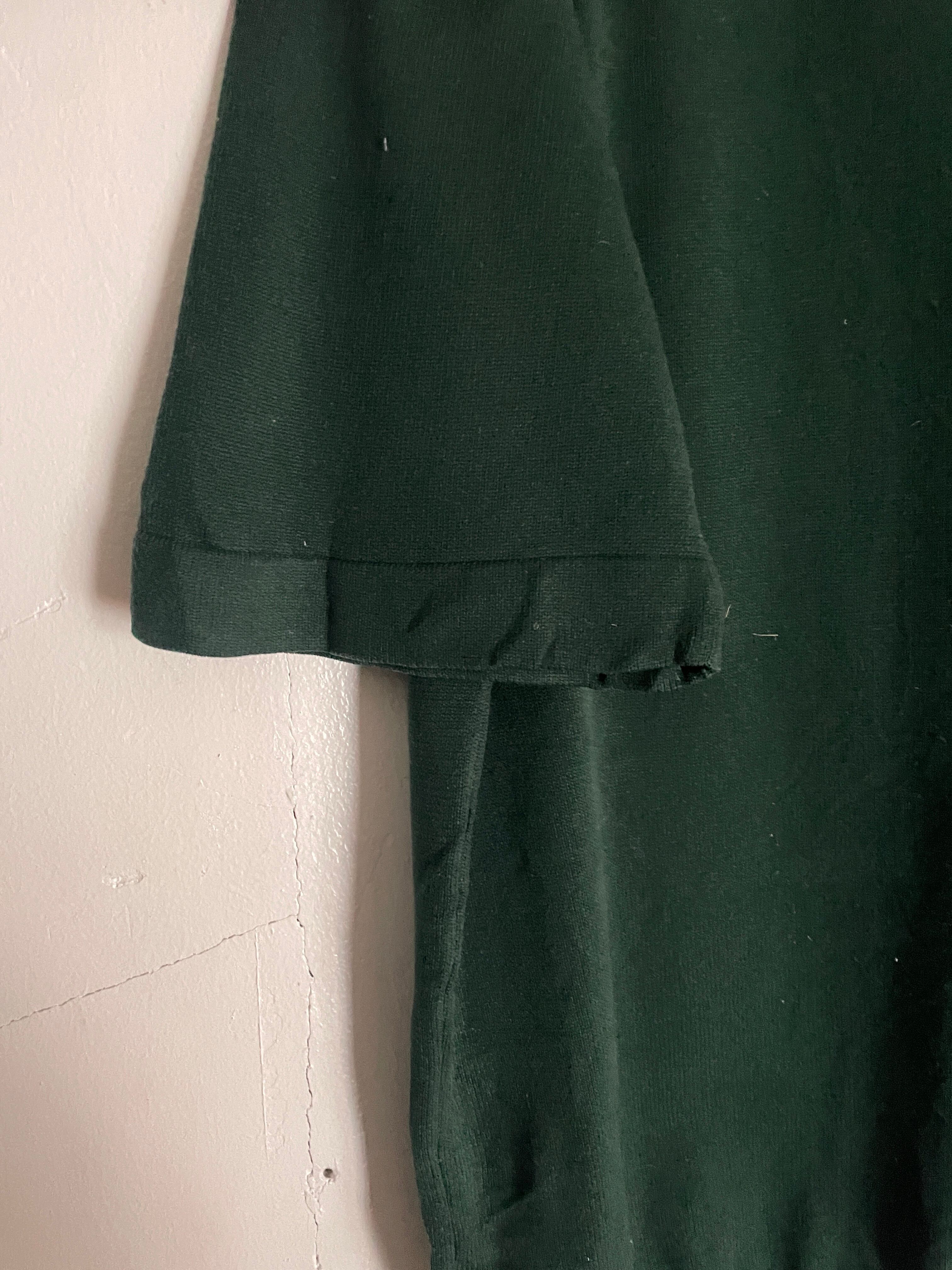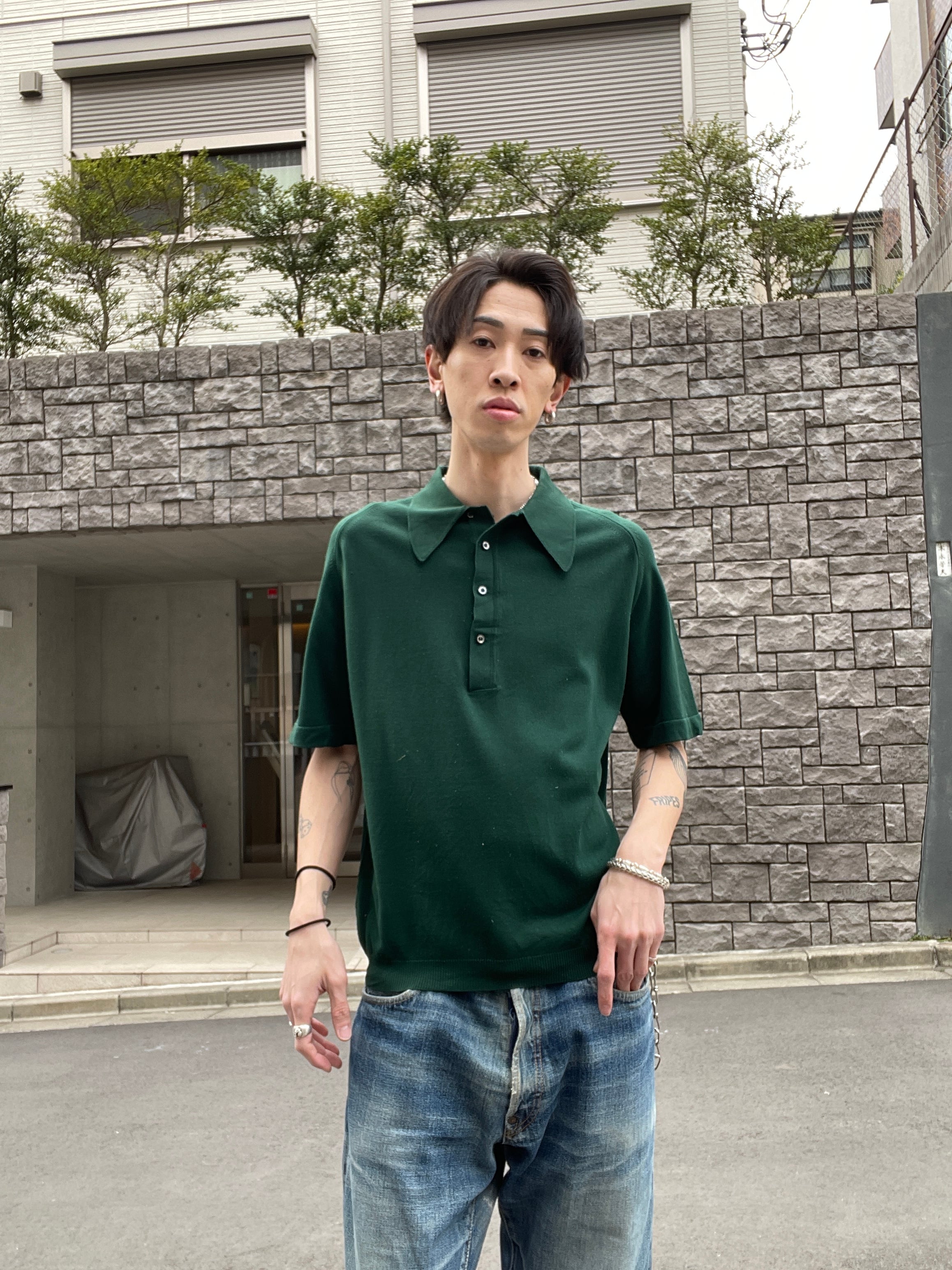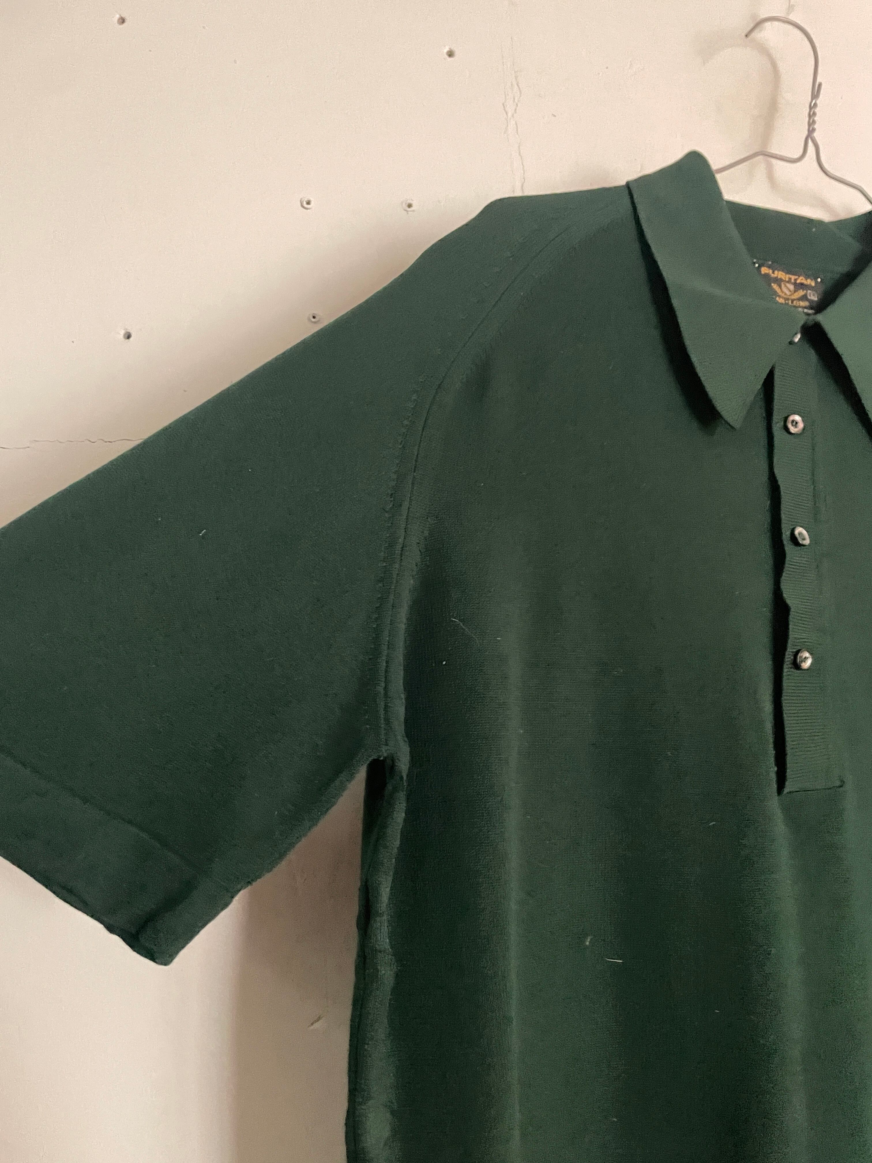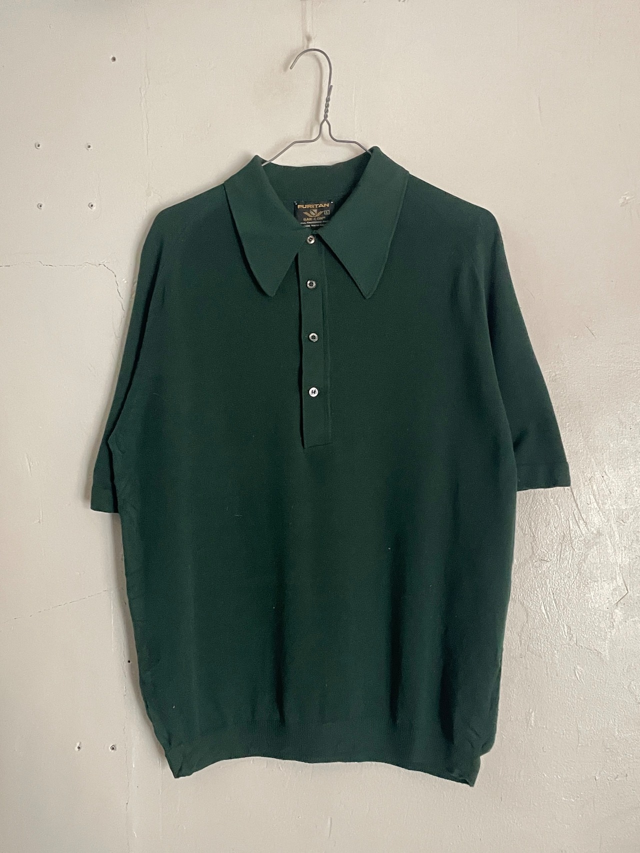 60-70年代に一世を風靡した高級ニット素材「BAN-LON」を使用した、ピューリタンの名作ポロシャツ。深みのある絶妙なダークグリーンは、この年代ならではのクラシックな表情。大きく尖った襟と肩に馴染むラグランスリーブ、そしてBAN-LON特有のとろみ感が、色気と上品さを演出します。一枚でもサラリと着ても、ジャケットのインナーに挿しても抜群に映える一着です。