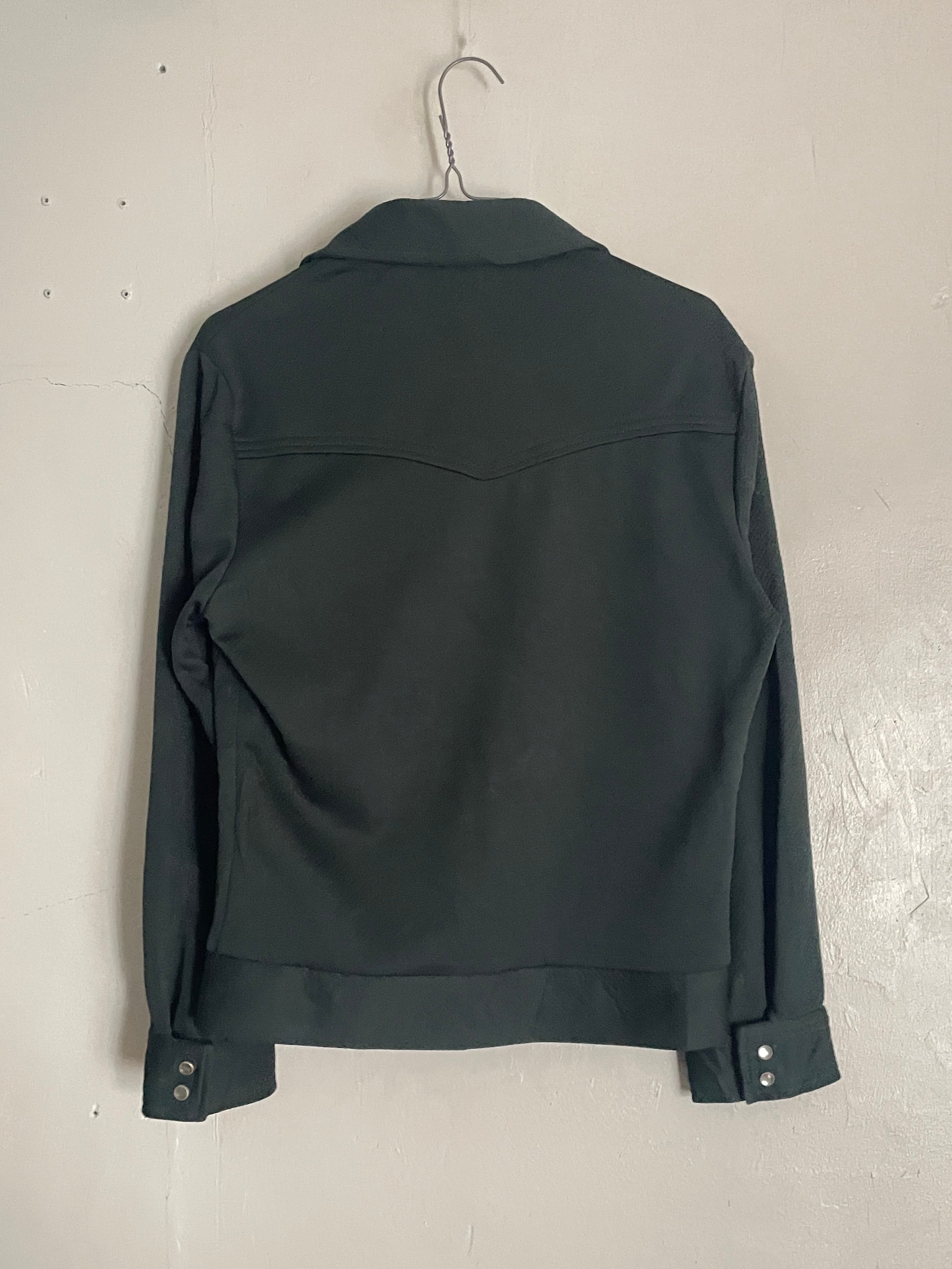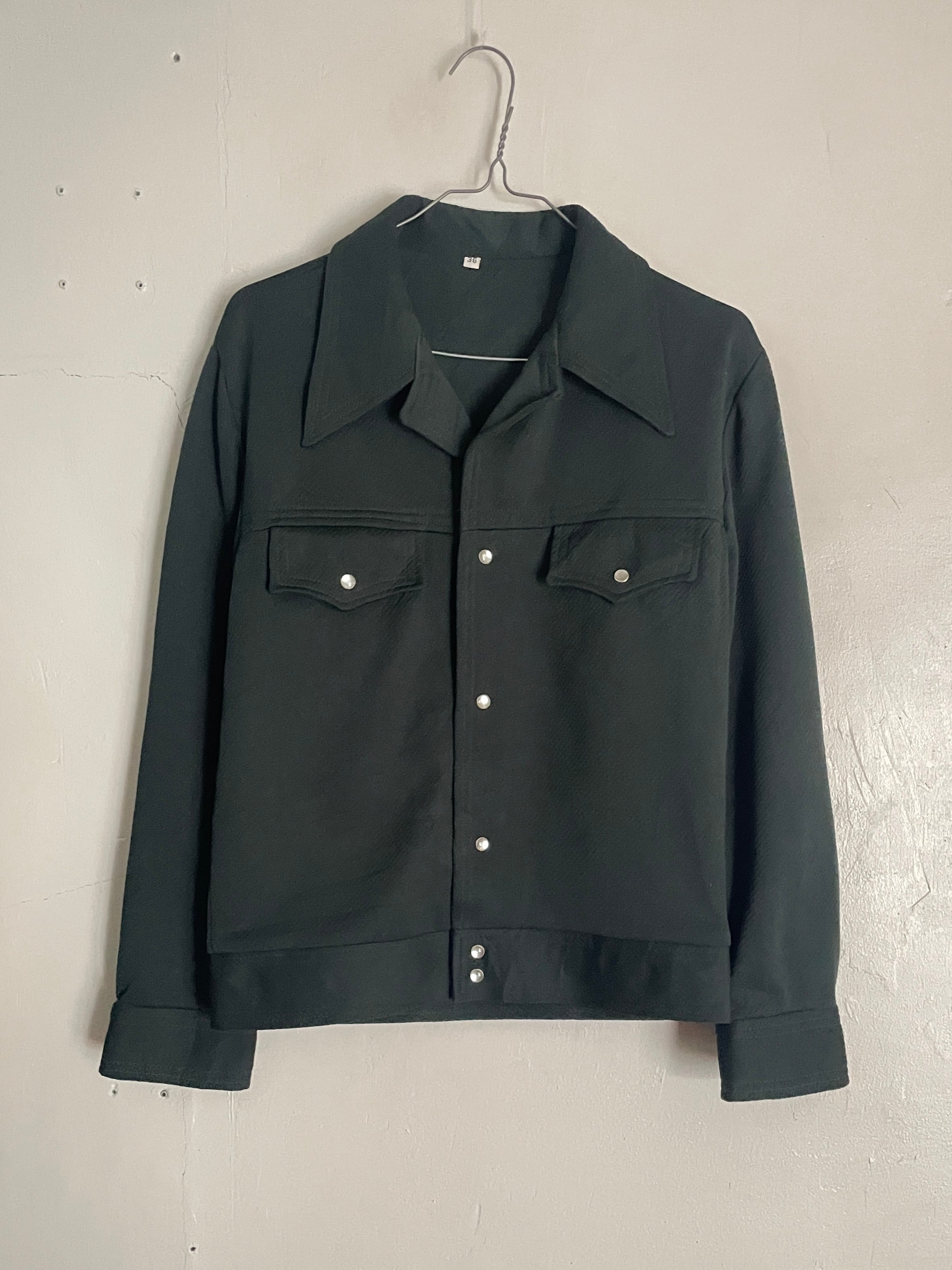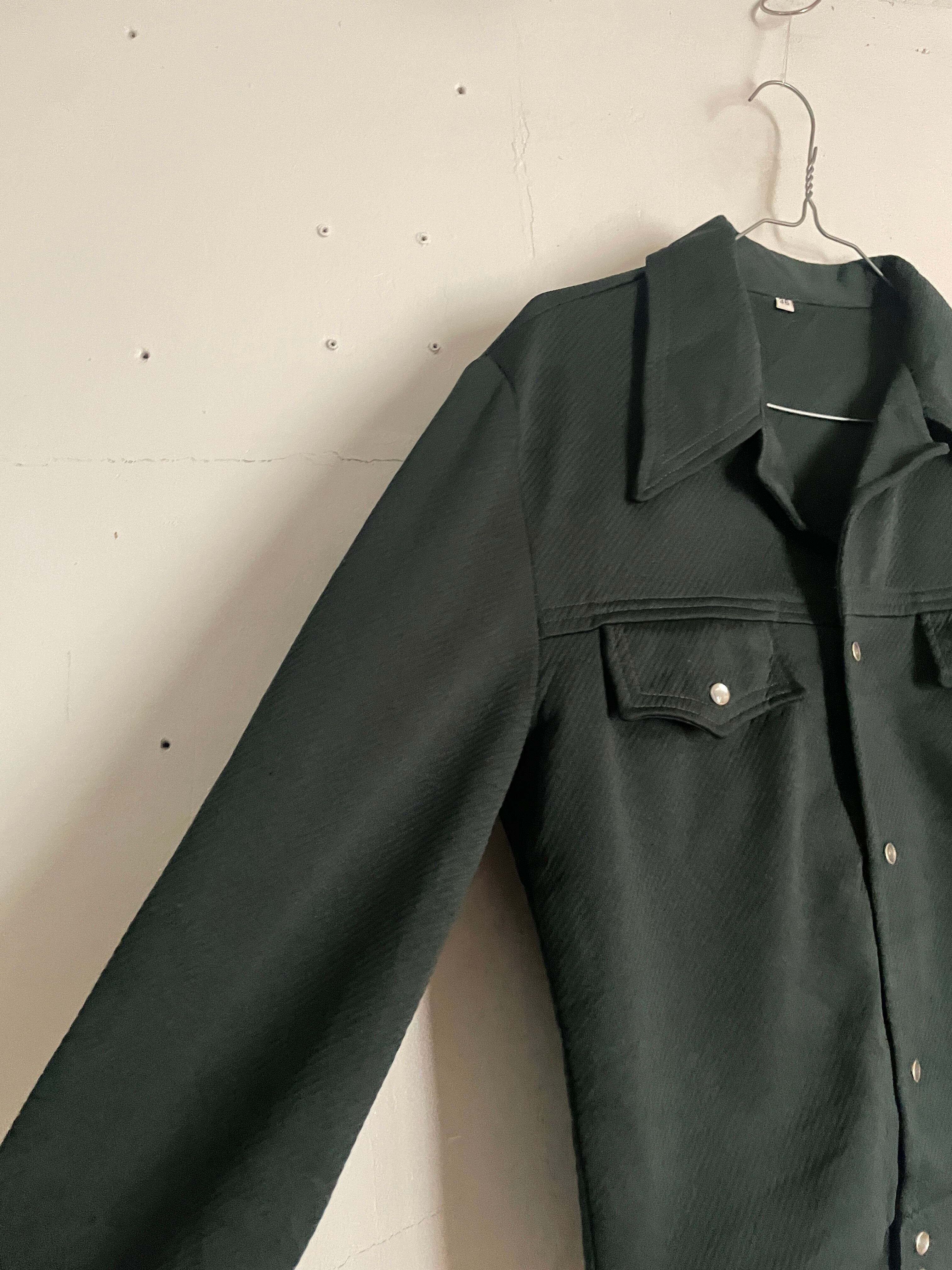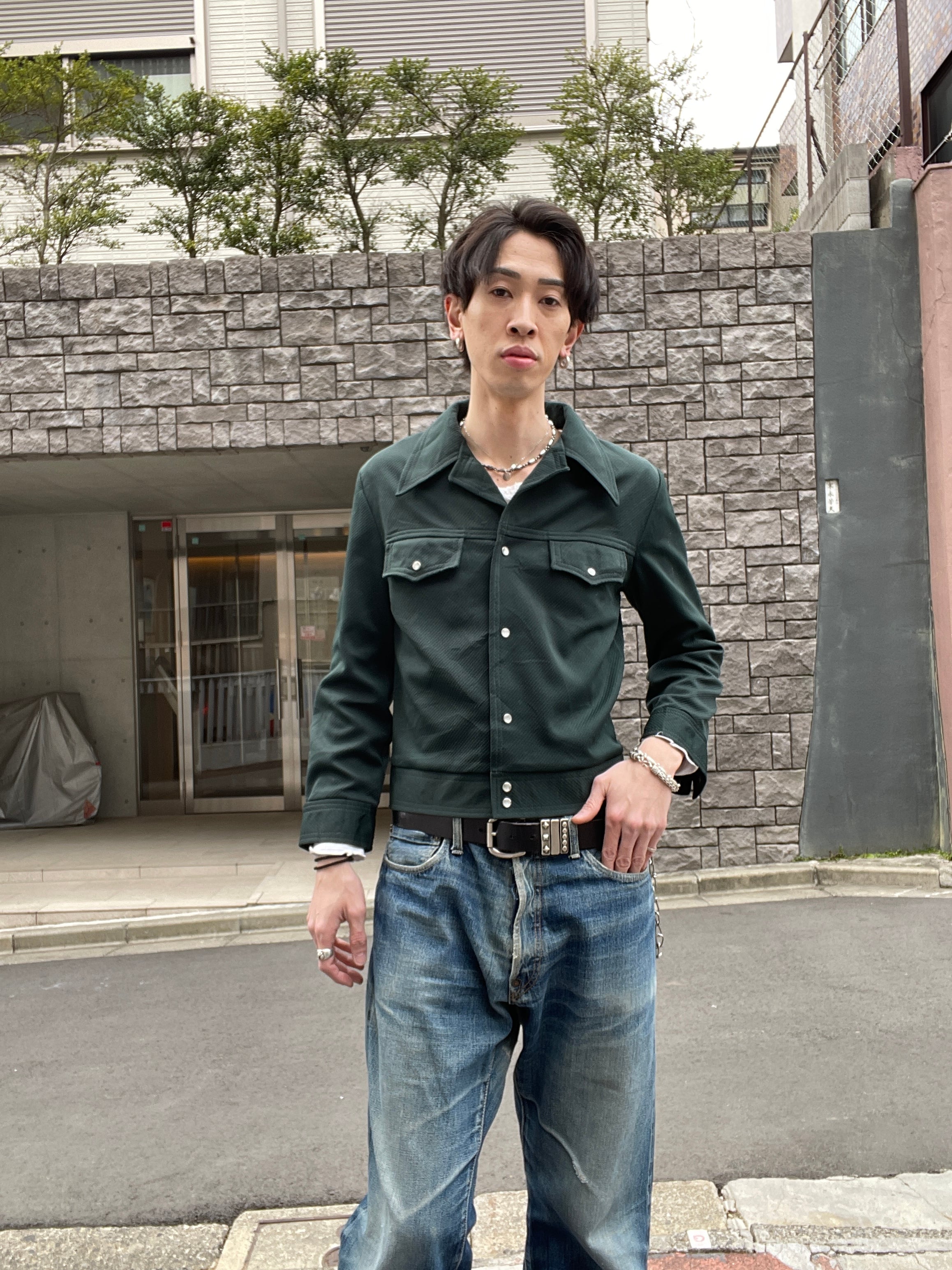 渋さのあるダークグリーンボディで、大振りな襟、真珠のようなキラッと輝くスナップボタンなどが特徴的な、ハガーのウエスタンシャツジャケット。全体から70年代の雰囲気がしっかりと感じられます。短丈めで、袖は長めな今っぽいシルエット。フレアデニムなどとはもちろん、スラックスやワイドデニムなどとも相性の良さそうなアイテムです。春には主役になってくれる一着です。