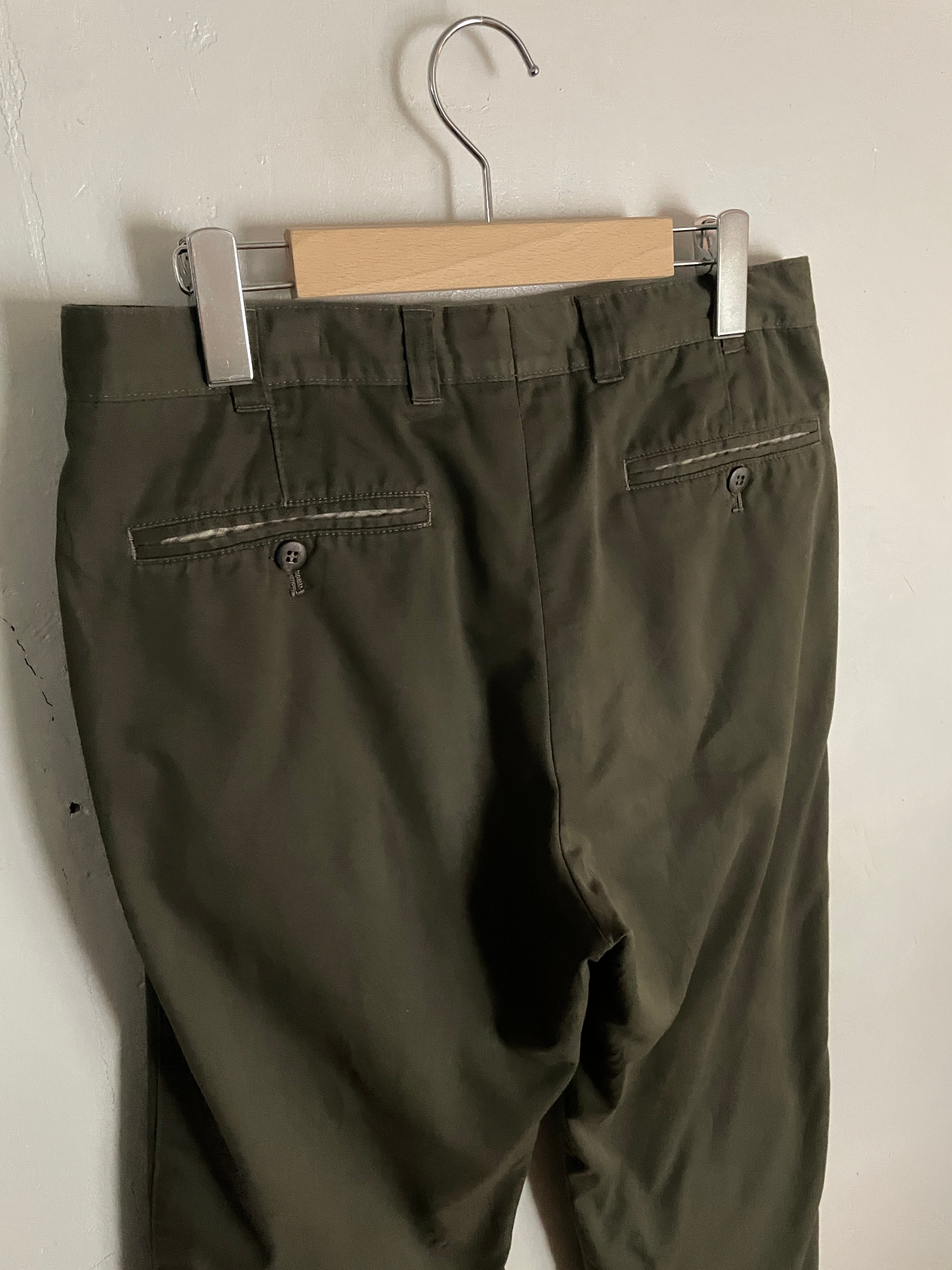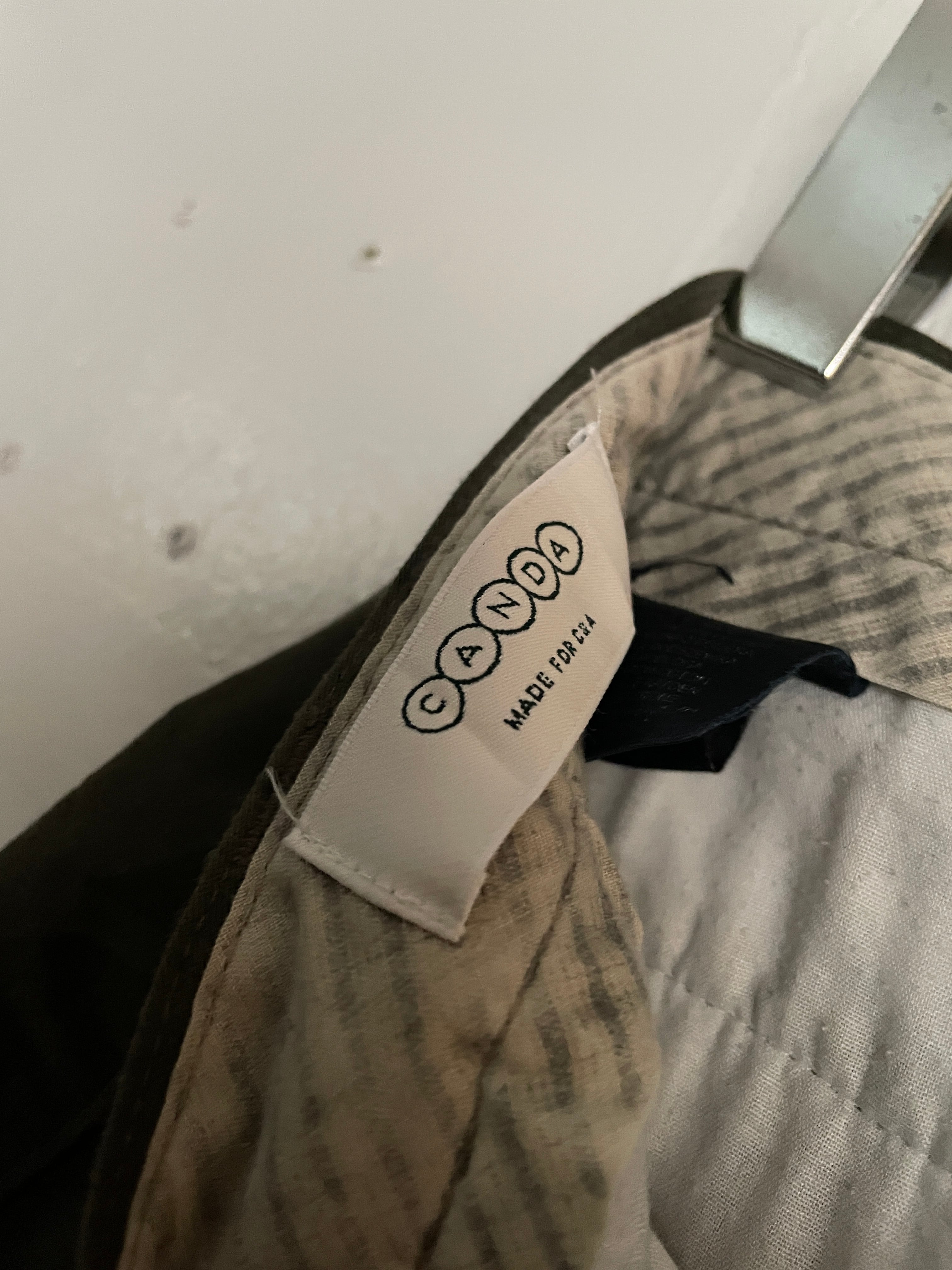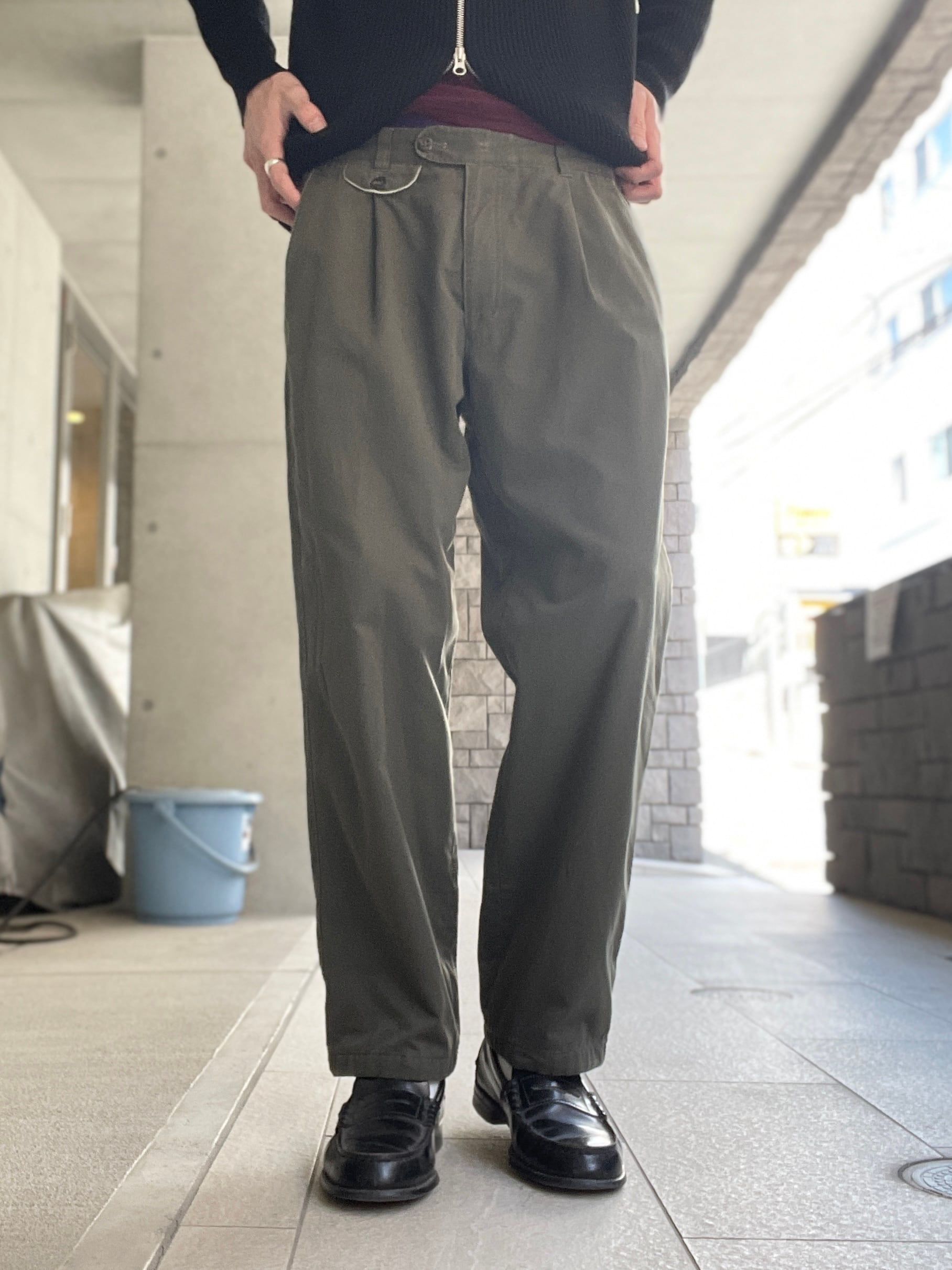 渋さのあるカーキカラーで、ポケット部分にさりげなくパイピングデザインが施されたスラックス。ポリとコットンの柔らかい質感。タックの入った綺麗なワイドシルエットになっています。落ち着いた色味なので、様々なファッションの取り入れやすいパンツかと思います。カナダ製なのも魅力的な一本。