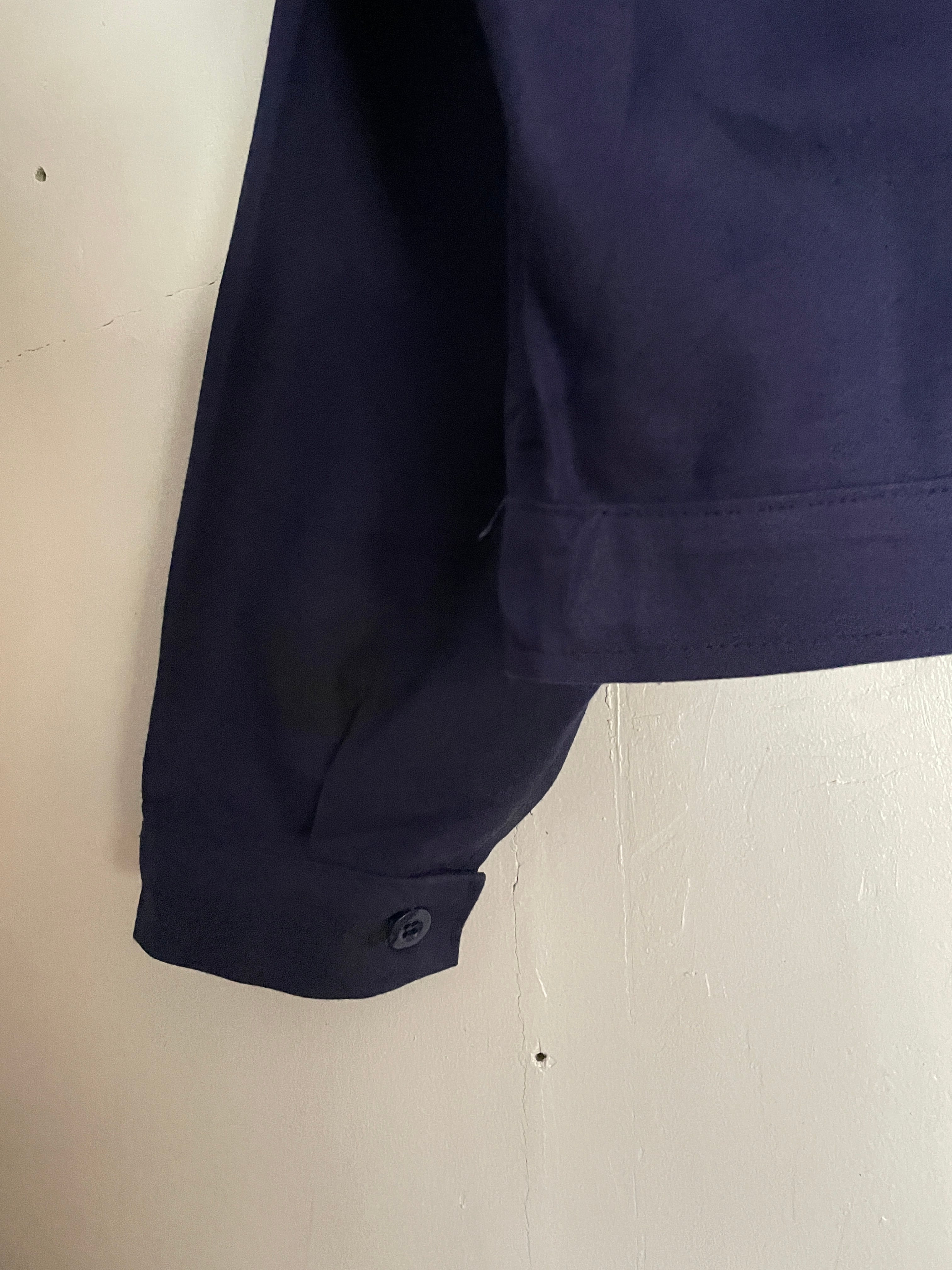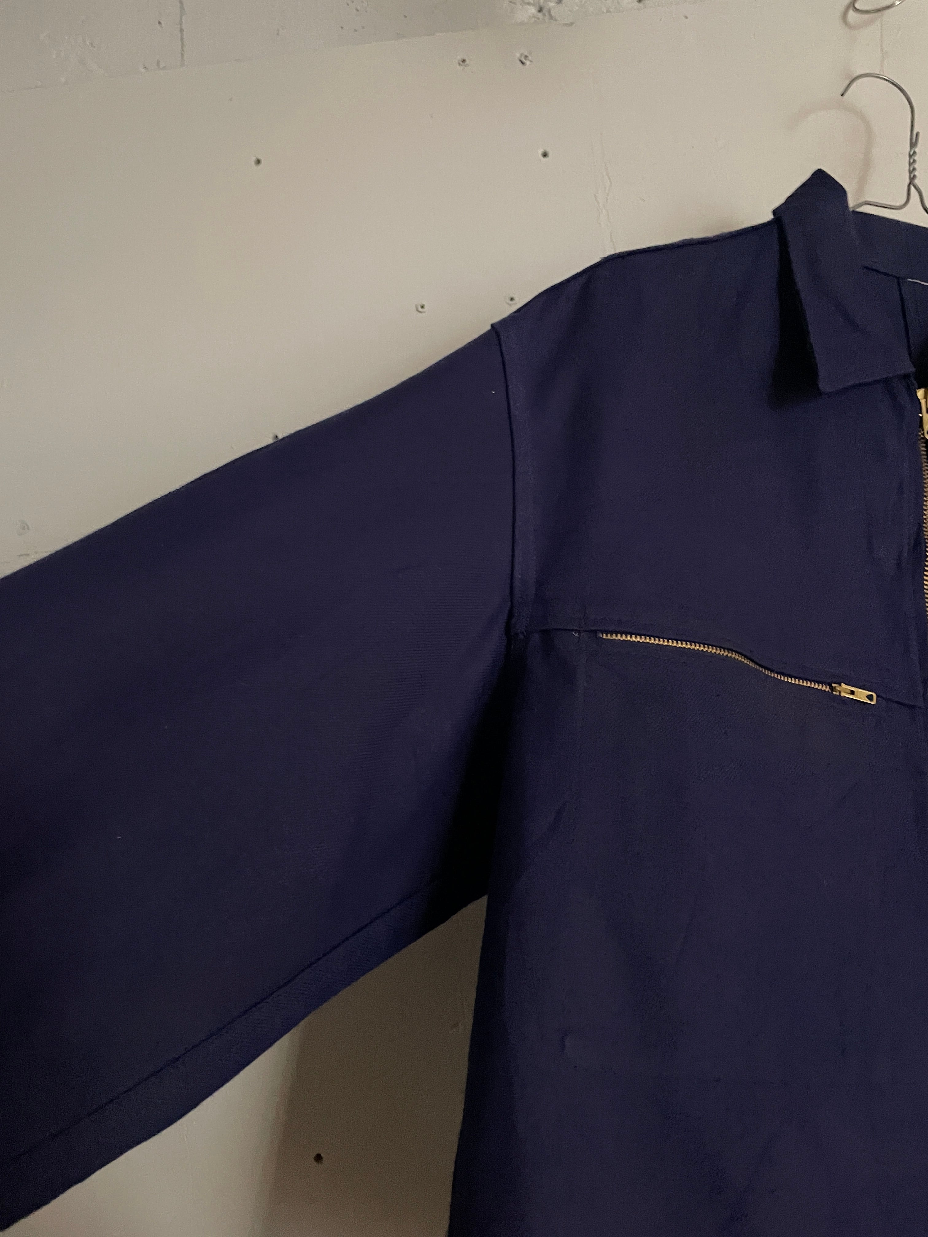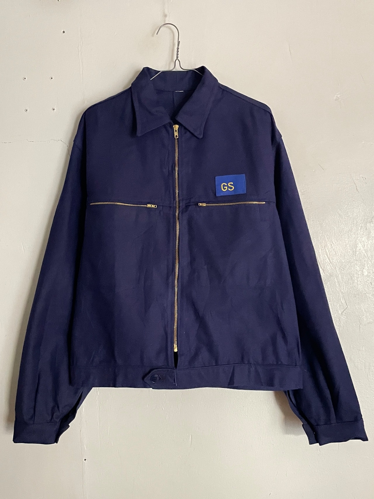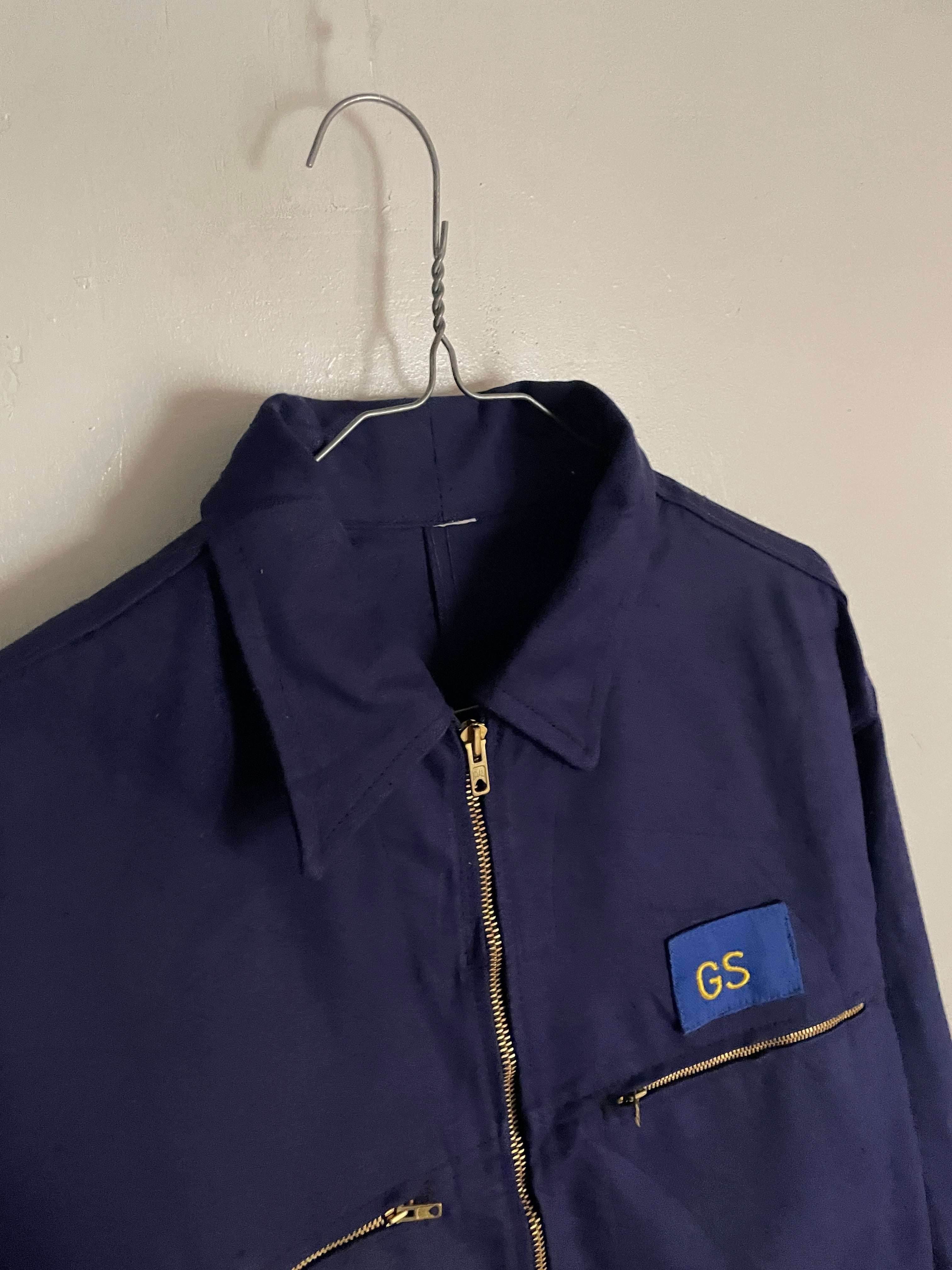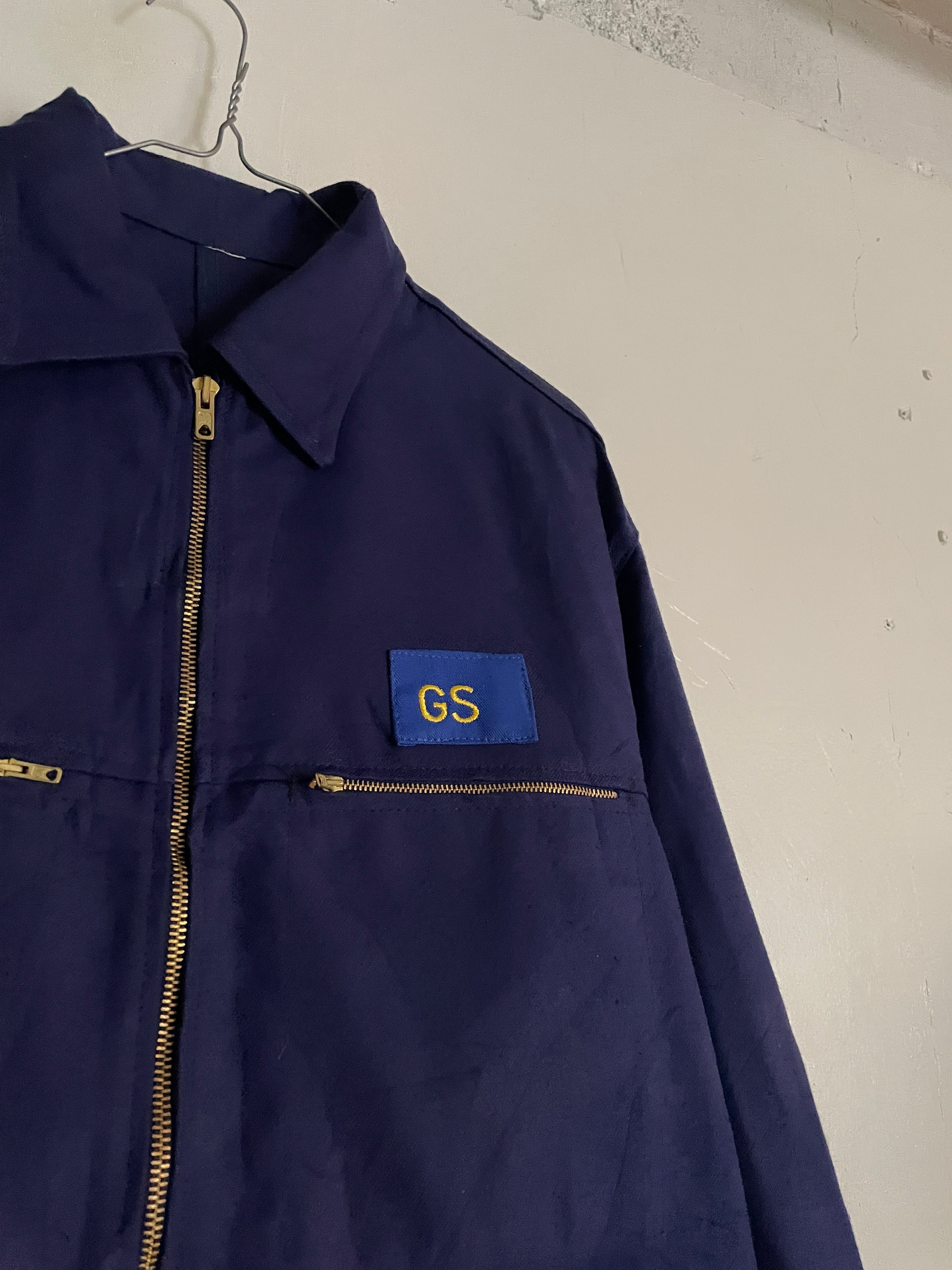 深みのあるネイビーボディで、両胸のポケットに配されたゴールドジッパーが映える、クラシックなデザインが特徴的なユーロワークジャケット。ワンポイントで”GS"企業ワッペン。あえて雑に貼り付けられているのも面白いです。しっかりとしたタフな素材で、着れば着るほど味が出そうです。程良い丈感にたっぷりな身幅が今っぽいシルエットになっています。春にはファッションのメインになってくれるアイテムです。
