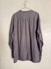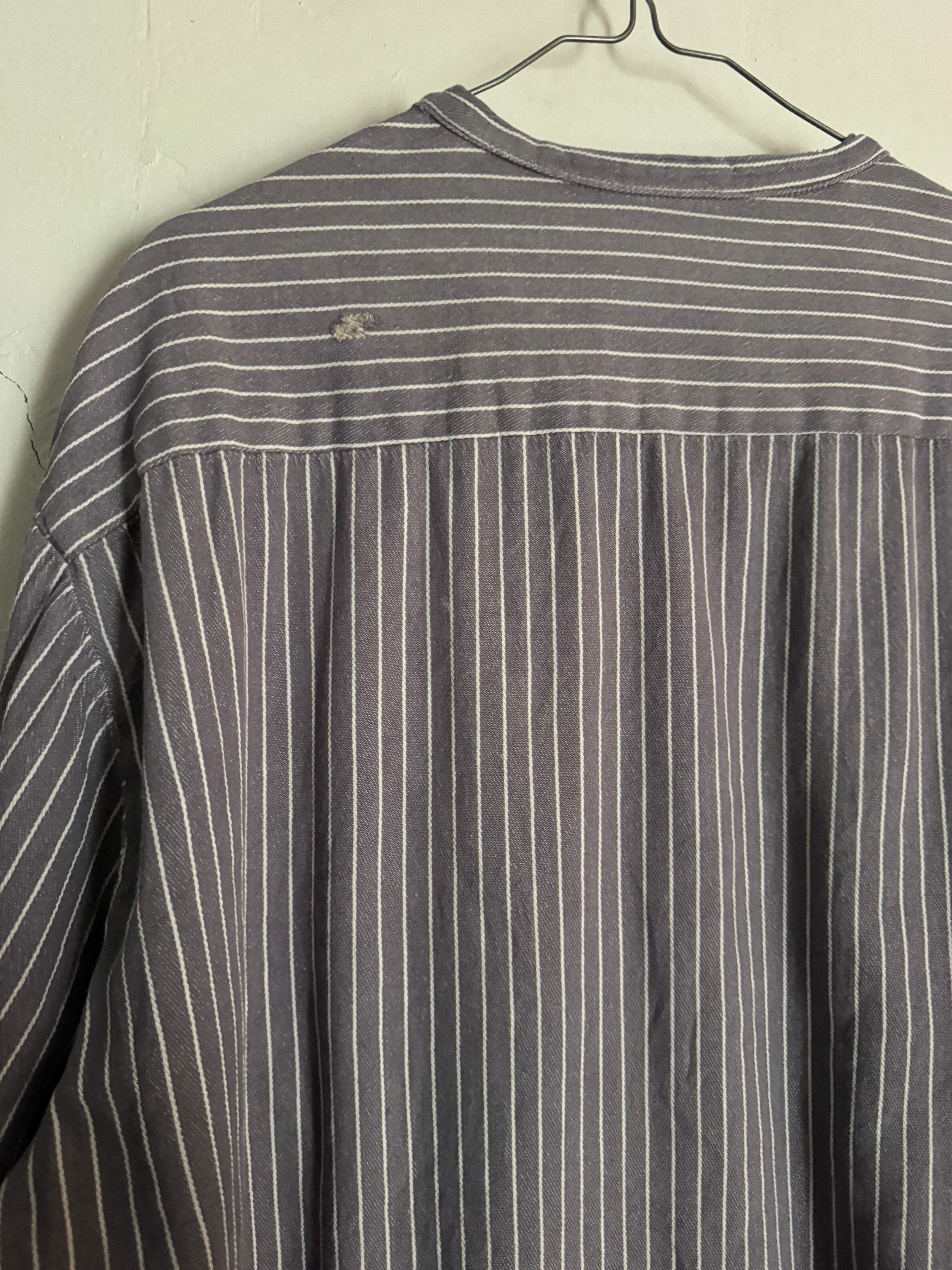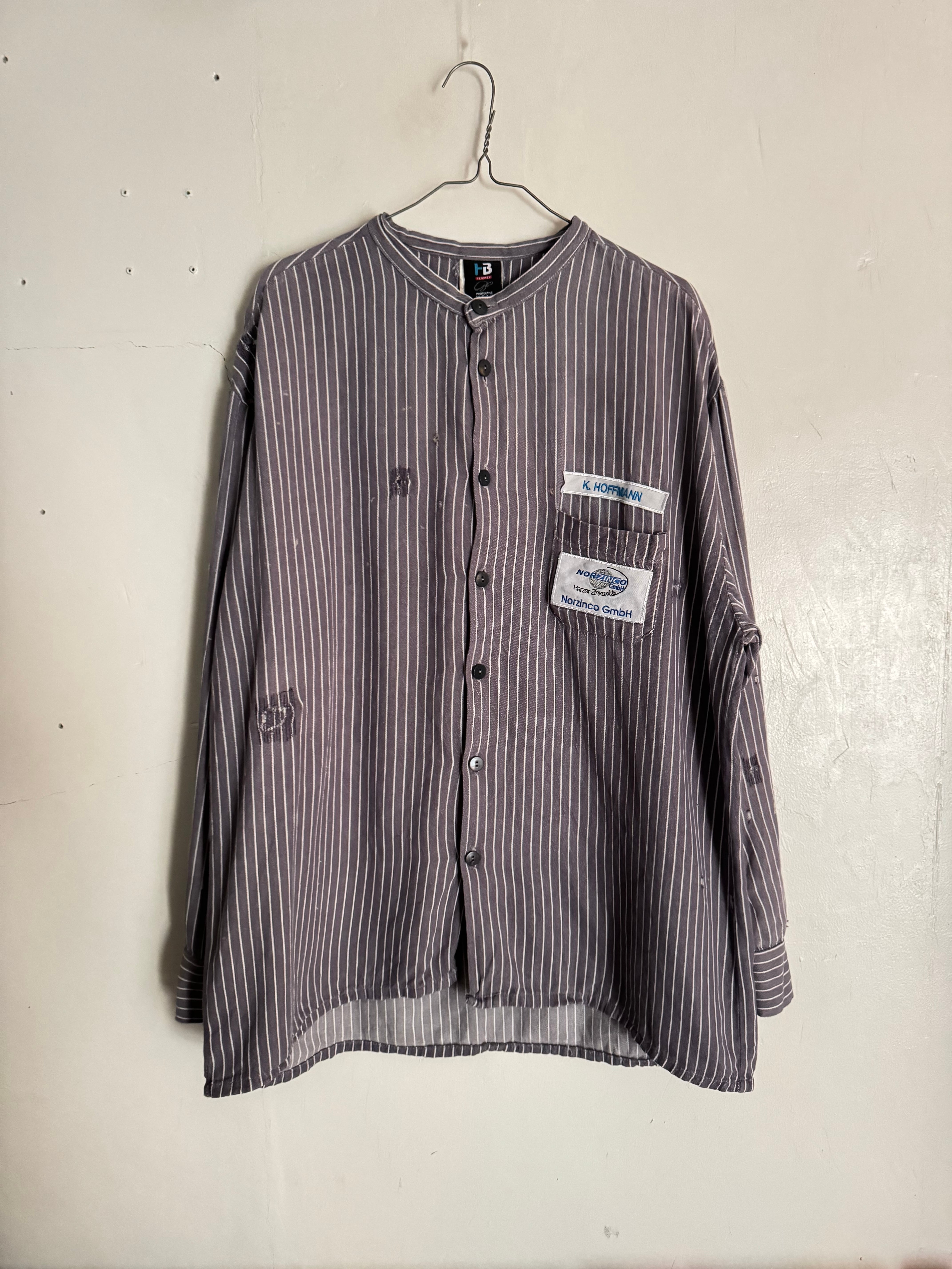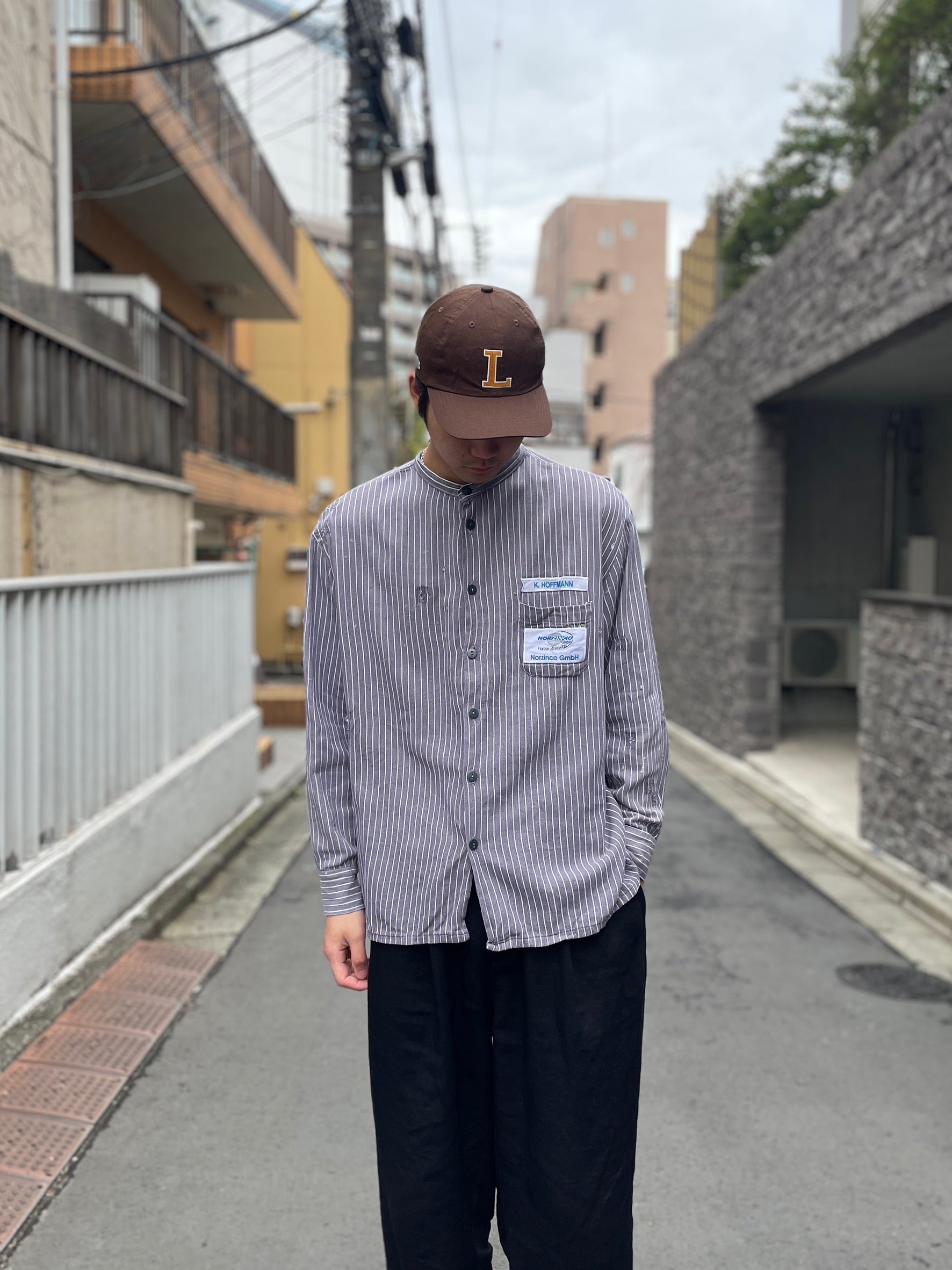 落ち着いた色味のストライプ生地が特徴的な、ノーカラー仕様のワークシャツ。胸元のネームワッペンや企業パッチがワークウェアらしい雰囲気を演出し、リアルな作業着として使われていた背景を感じさせる一着です。ノーカラーデザインは首元をすっきりと見せ、Tシャツやタートルネックとのレイヤードにも相性抜群。ストライプ柄とワークディテールが合わさることで、無骨さと程良い抜け感を兼ね備えた雰囲気のあるアイテムです。
