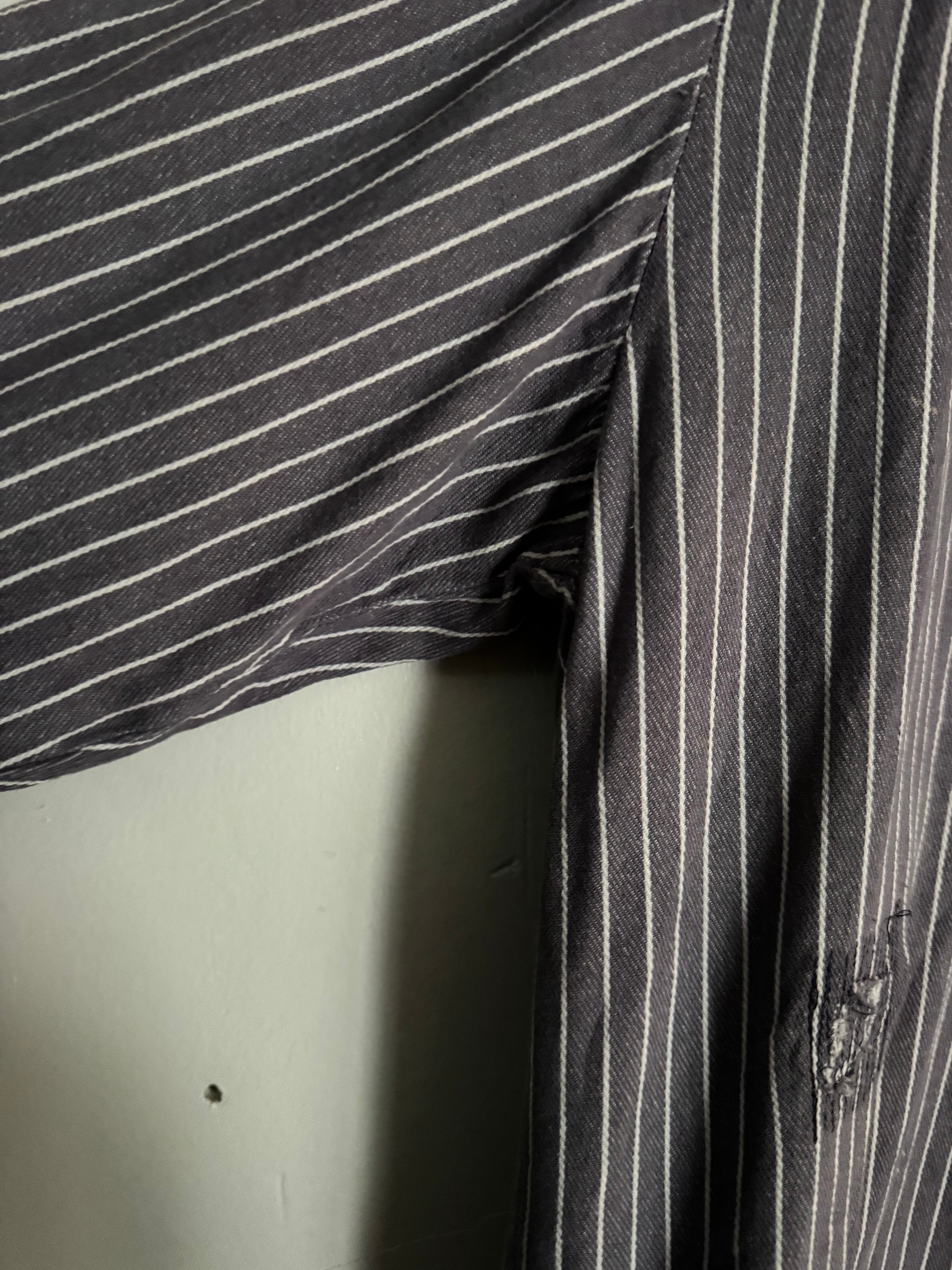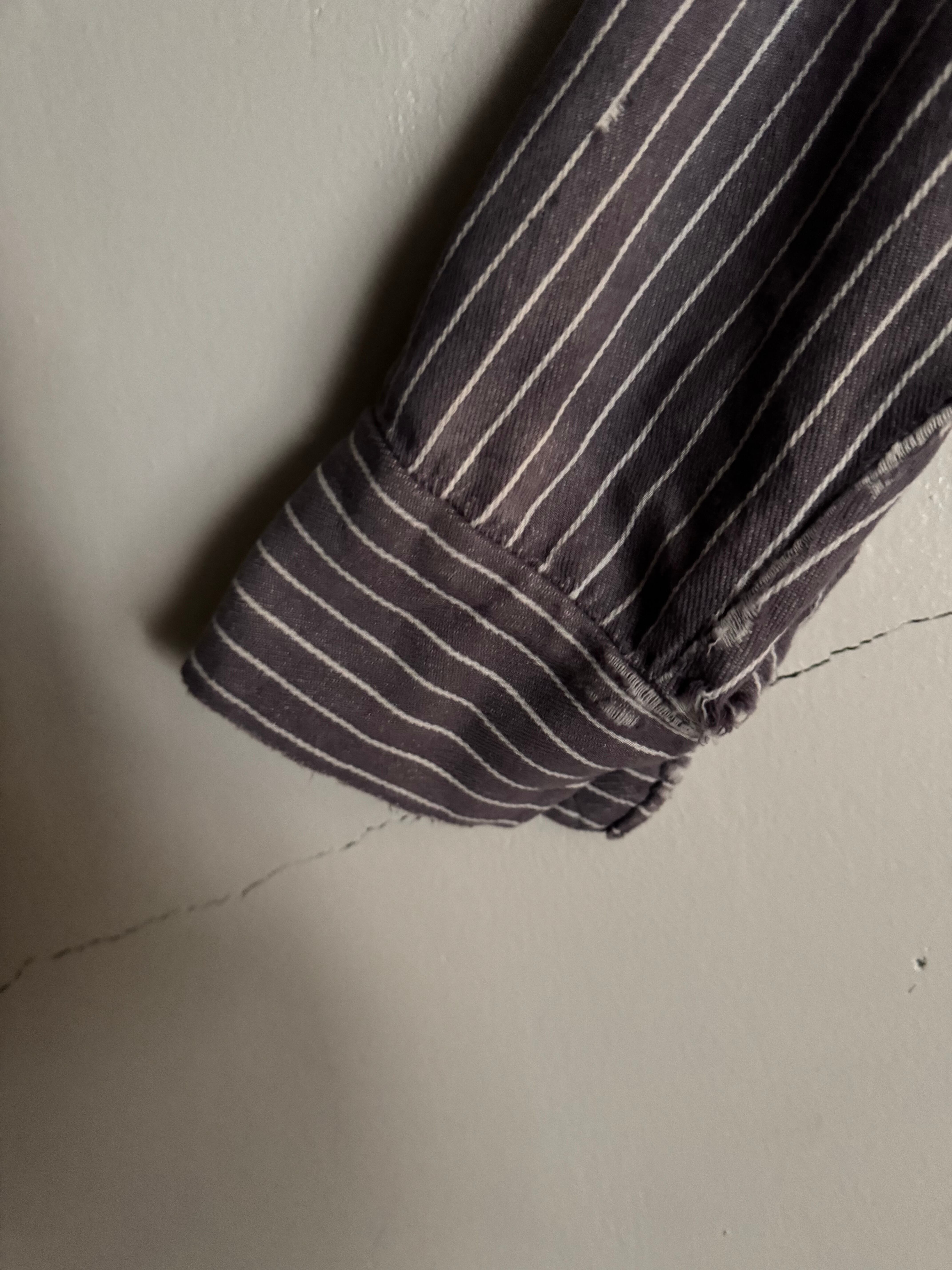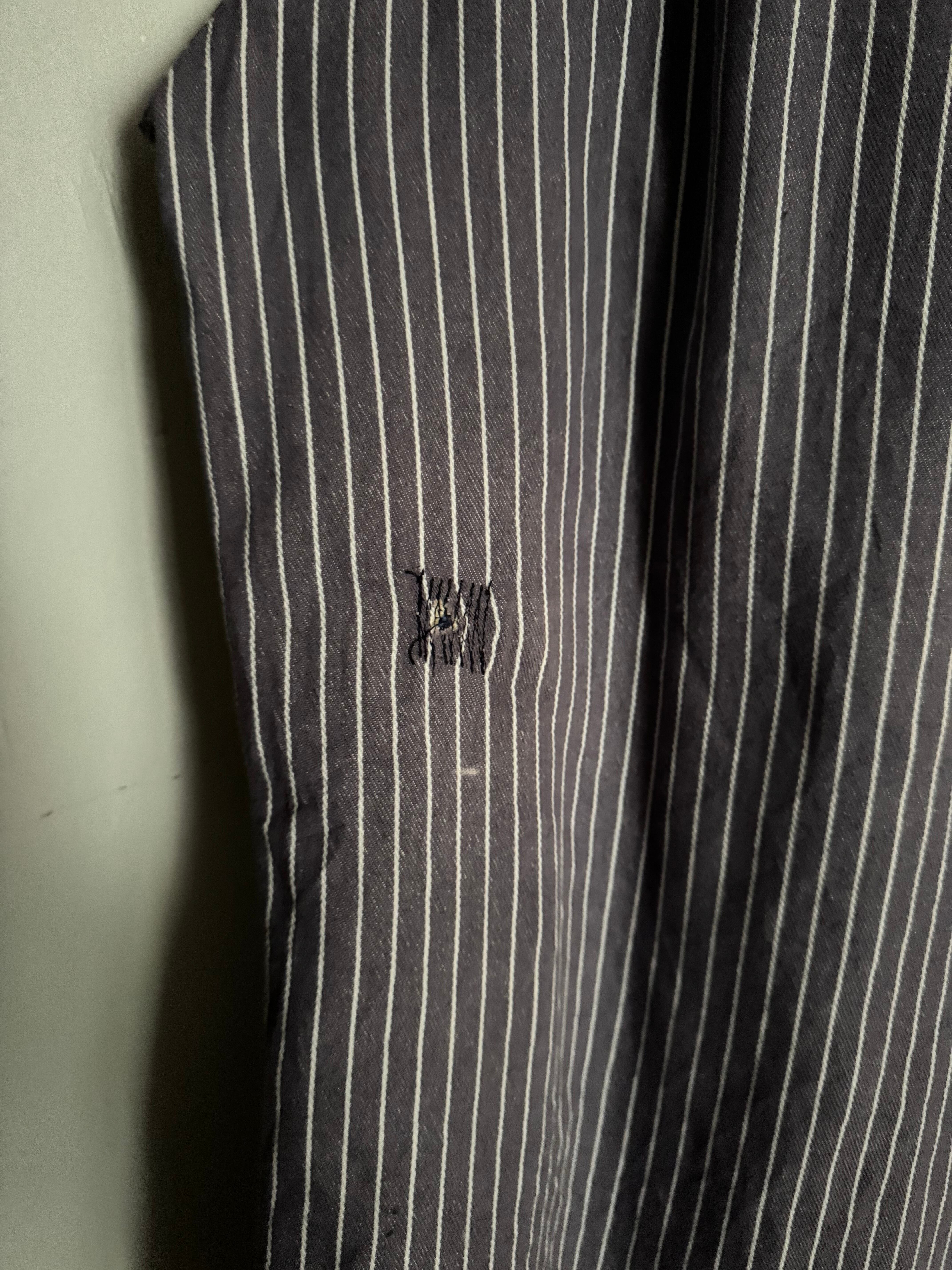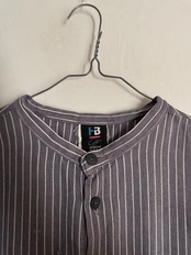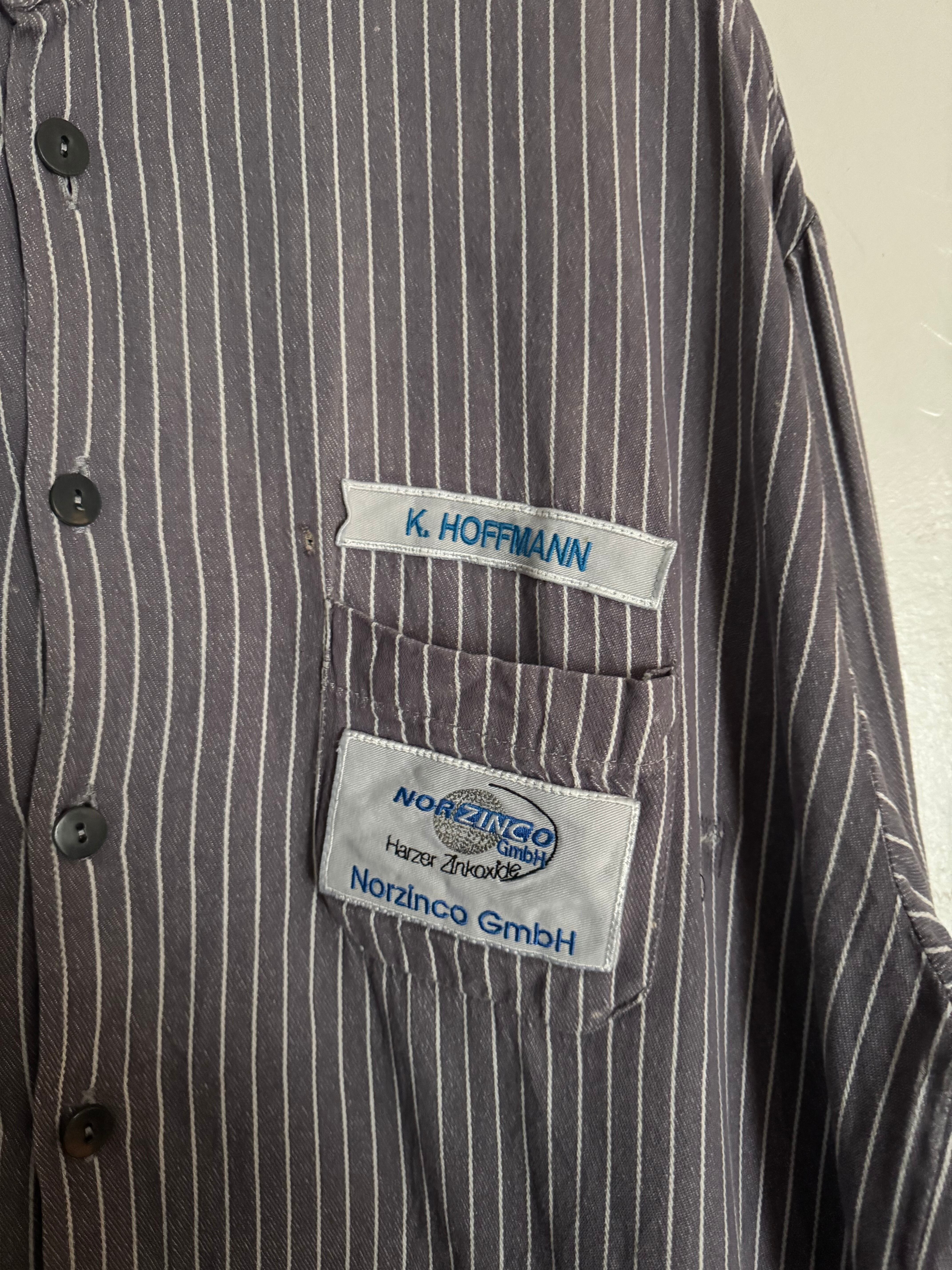 落ち着いた色味のストライプ生地が特徴的な、ノーカラー仕様のワークシャツ。胸元のネームワッペンや企業パッチがワークウェアらしい雰囲気を演出し、リアルな作業着として使われていた背景を感じさせる一着です。ノーカラーデザインは首元をすっきりと見せ、Tシャツやタートルネックとのレイヤードにも相性抜群。ストライプ柄とワークディテールが合わさることで、無骨さと程良い抜け感を兼ね備えた雰囲気のあるアイテムです。