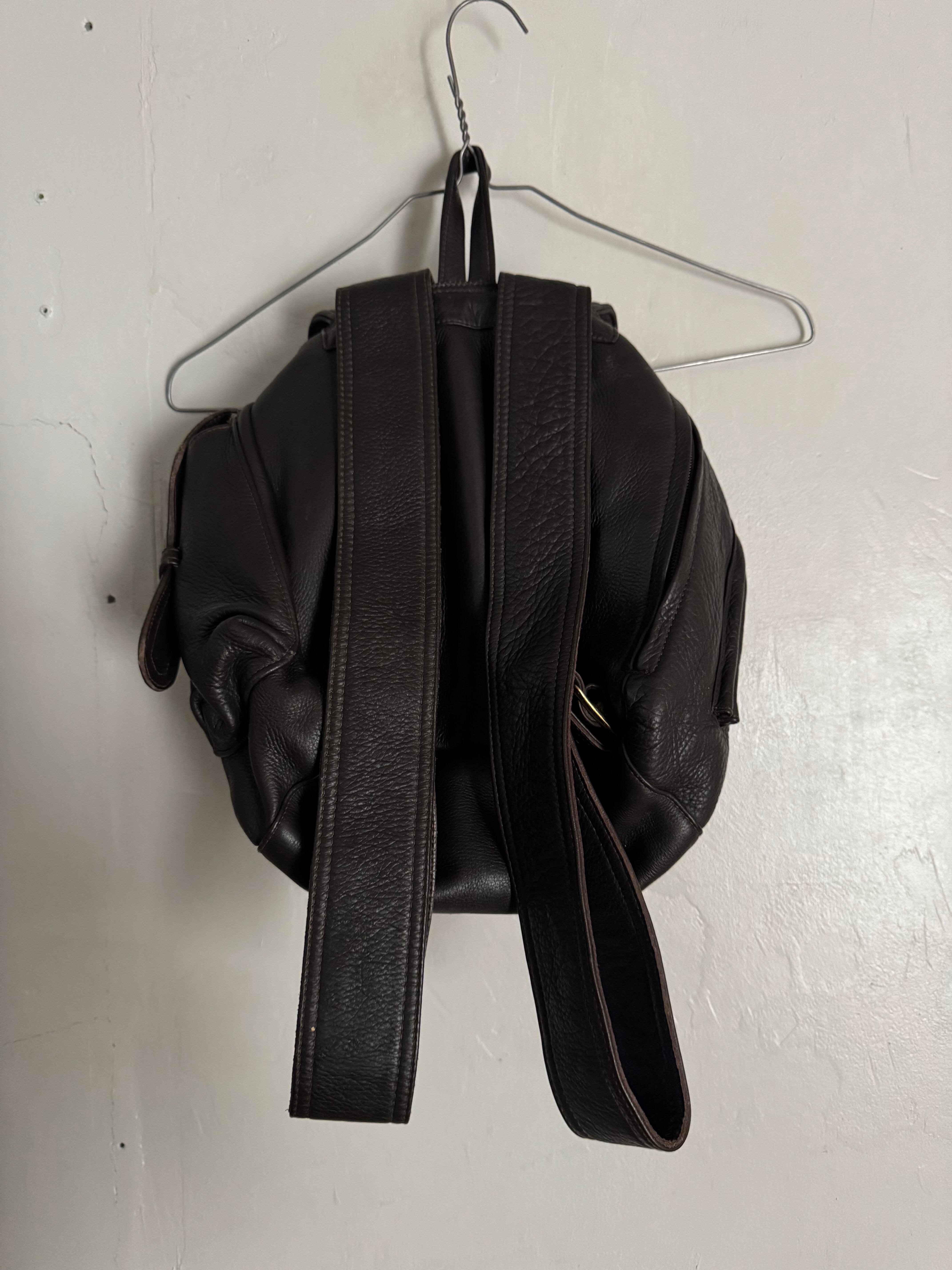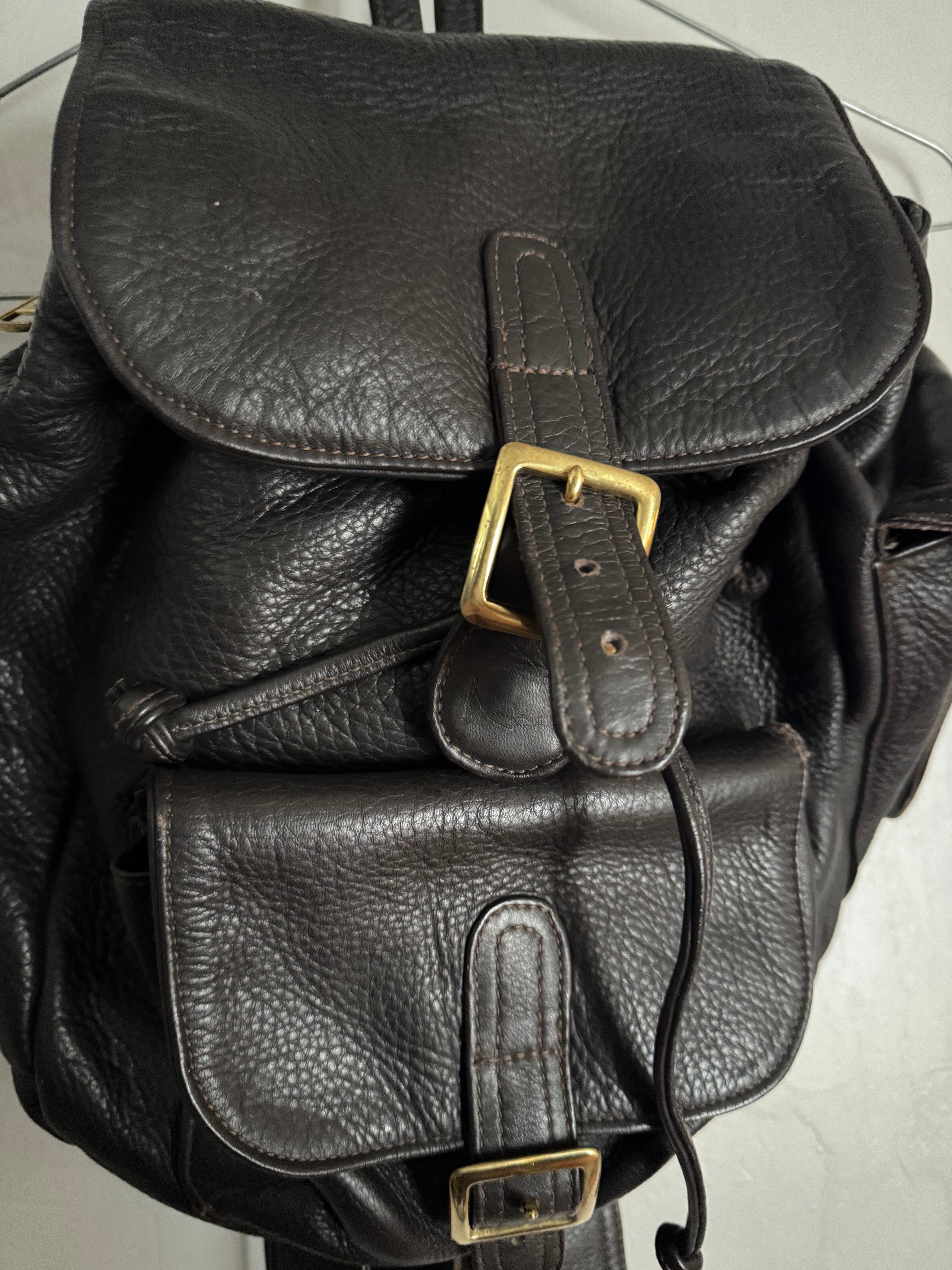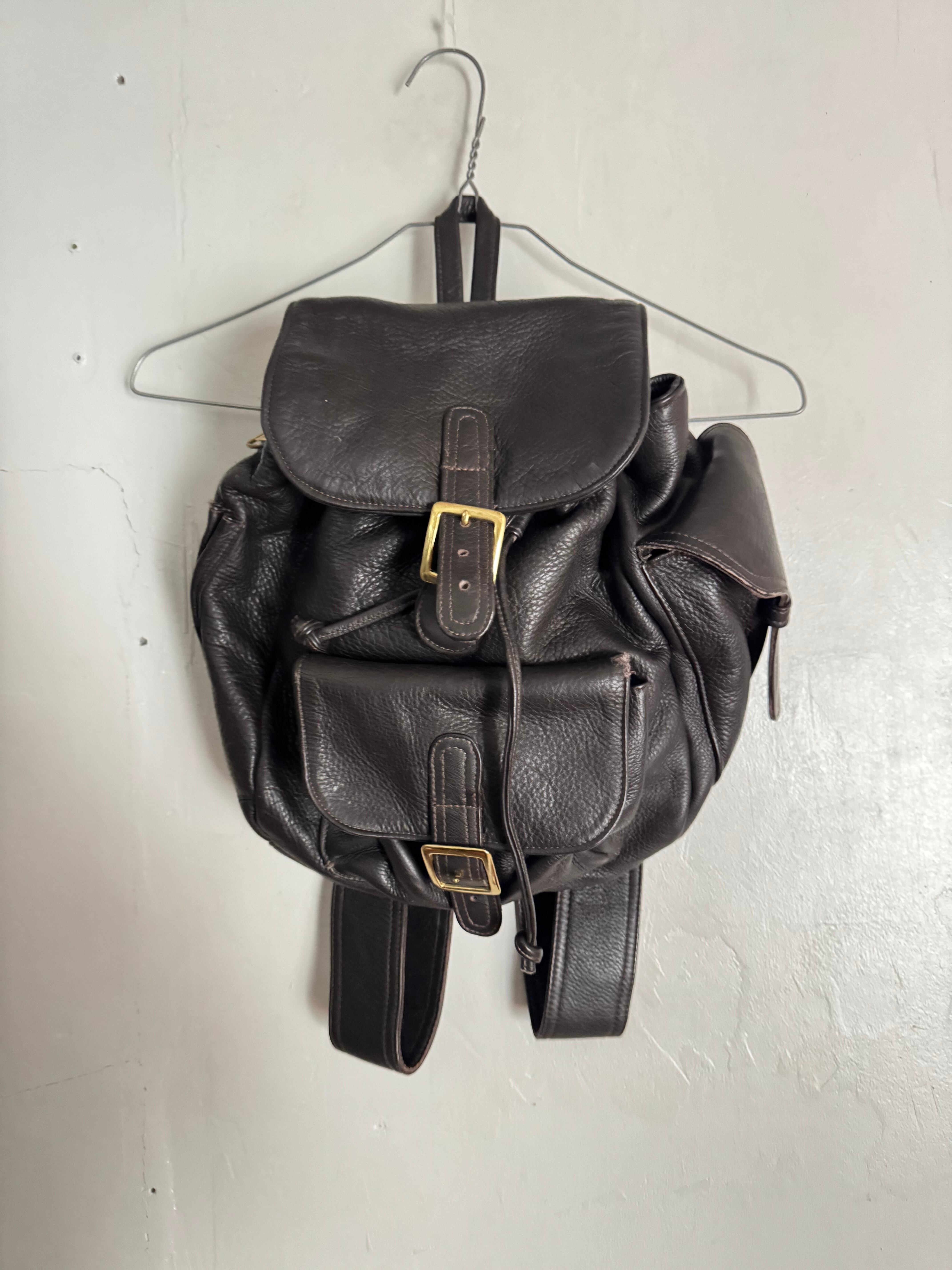 上質なレザーを使用したCoronado Leatherのミニバックパック。シボ感のある柔らかなダークブラウンレザーに、ゴールドカラーのバックルが映えるクラシックなデザインが魅力です。フラップ+ドローコード仕様で開閉もしやすく、フロントポケットやサイドポケットも備えた実用性の高い作りです。コーディネートのアクセントにも最適で、古着スタイルはもちろん、カジュアルからシンプルな装いまで幅広く活躍するアイテムです。