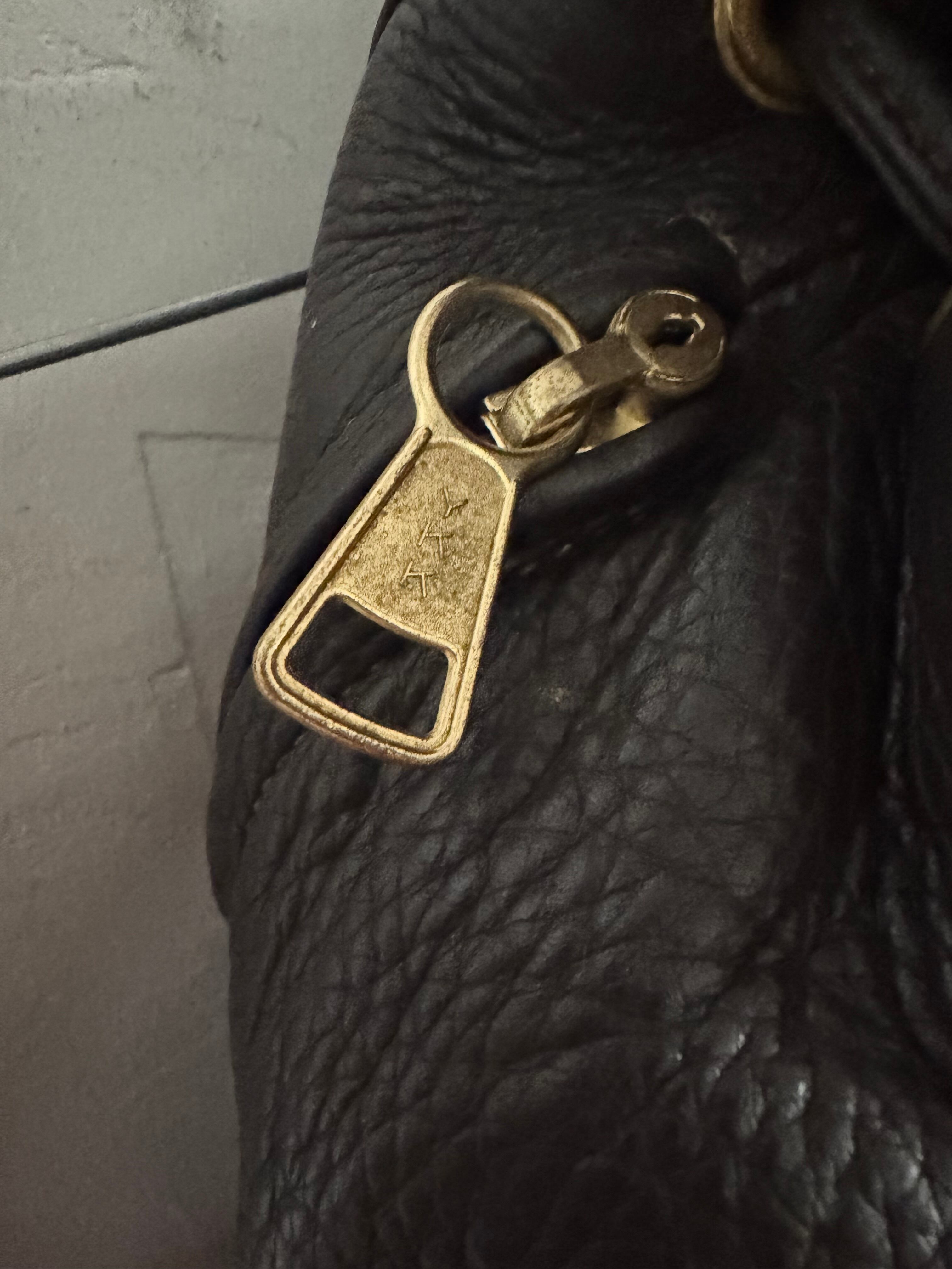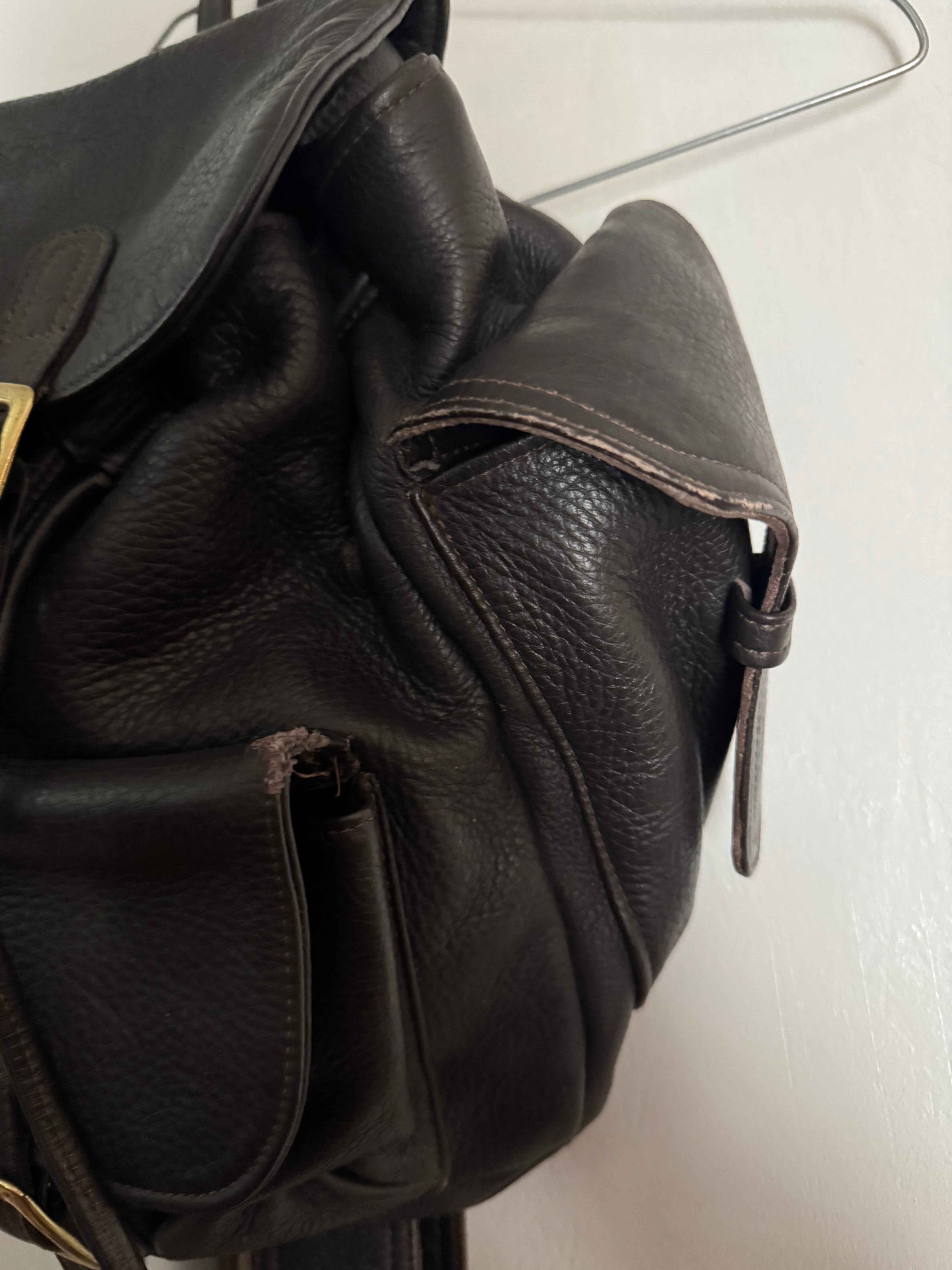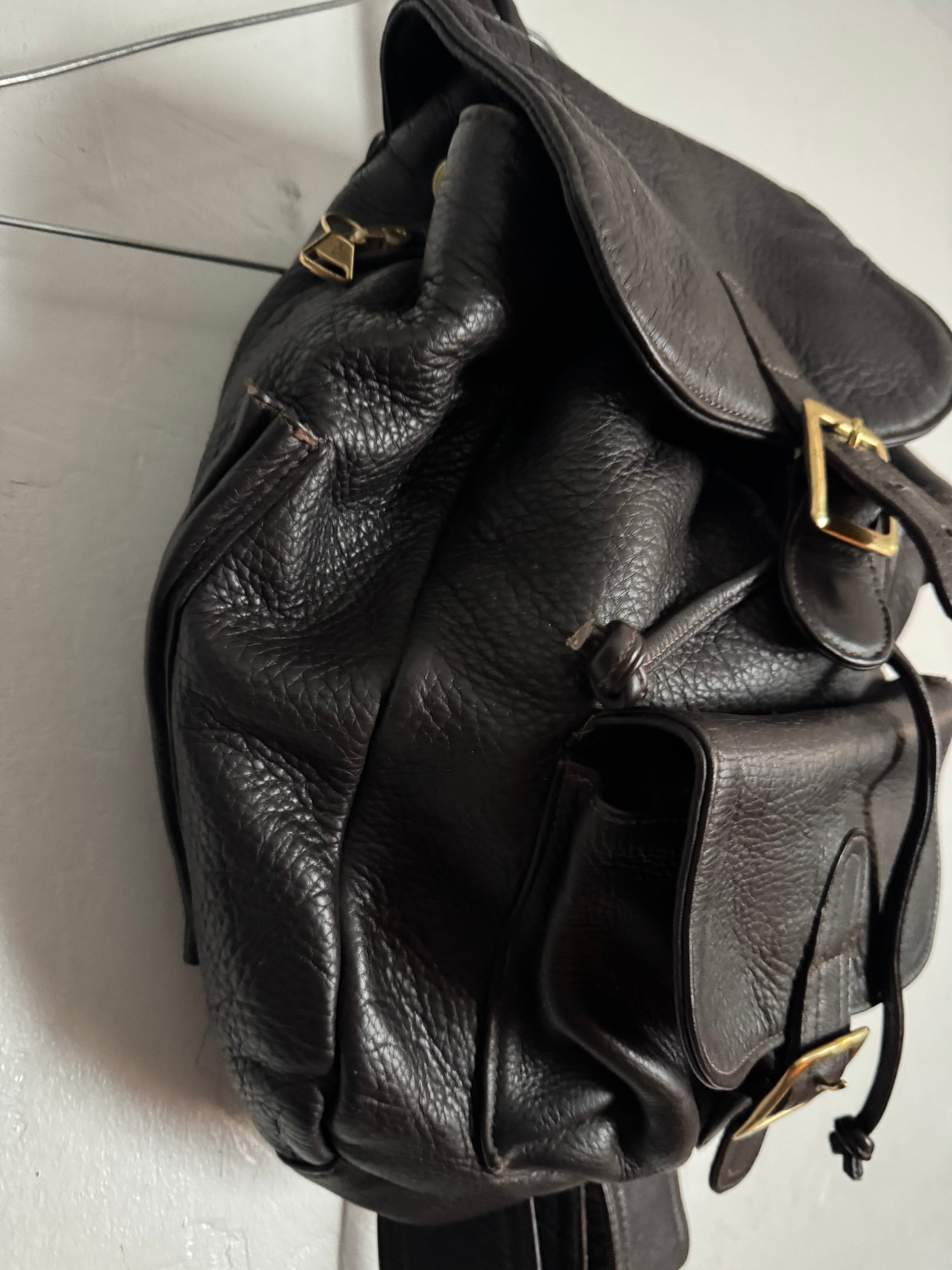 上質なレザーを使用したCoronado Leatherのミニバックパック。シボ感のある柔らかなダークブラウンレザーに、ゴールドカラーのバックルが映えるクラシックなデザインが魅力です。フラップ+ドローコード仕様で開閉もしやすく、フロントポケットやサイドポケットも備えた実用性の高い作りです。コーディネートのアクセントにも最適で、古着スタイルはもちろん、カジュアルからシンプルな装いまで幅広く活躍するアイテムです。