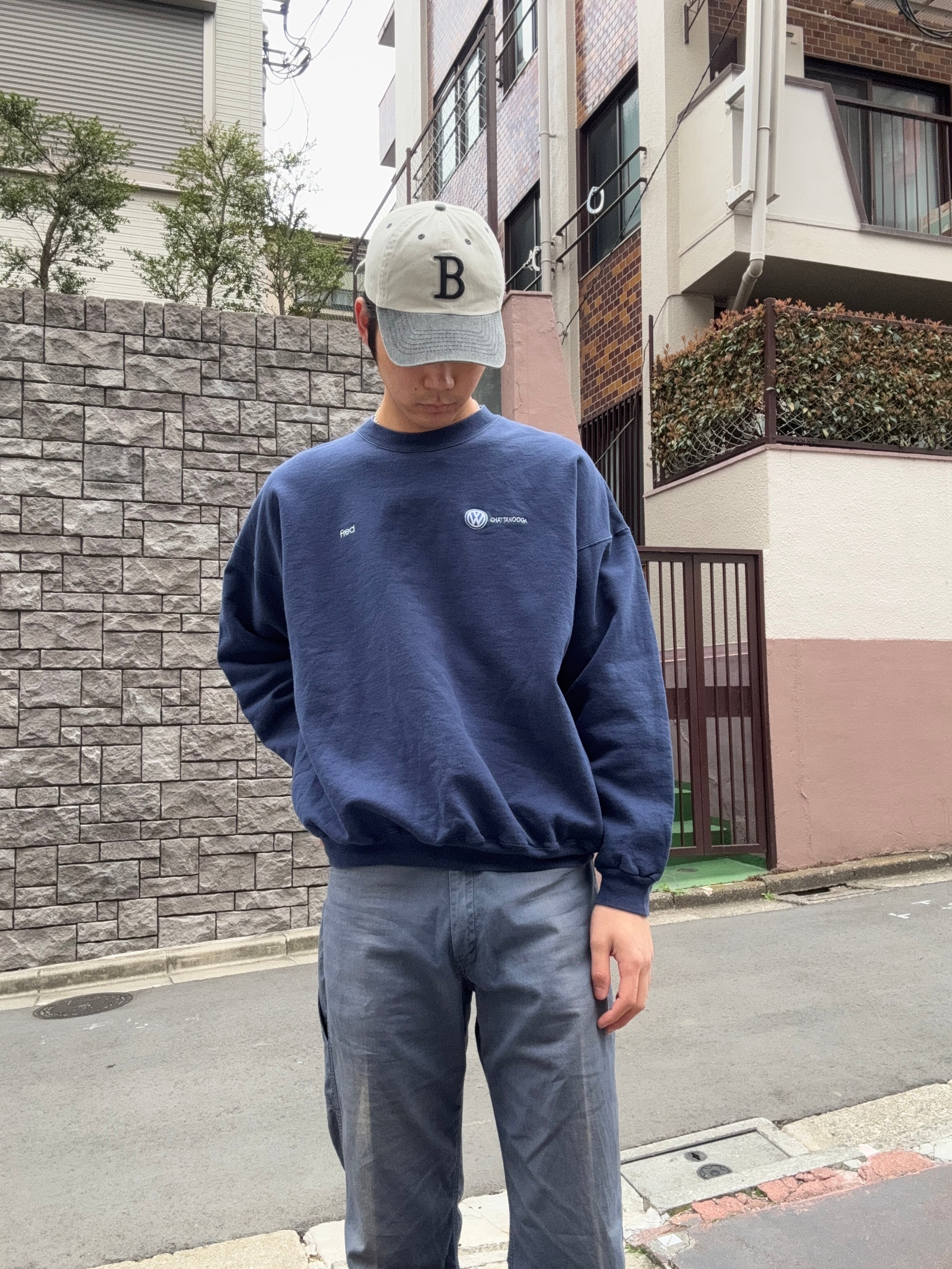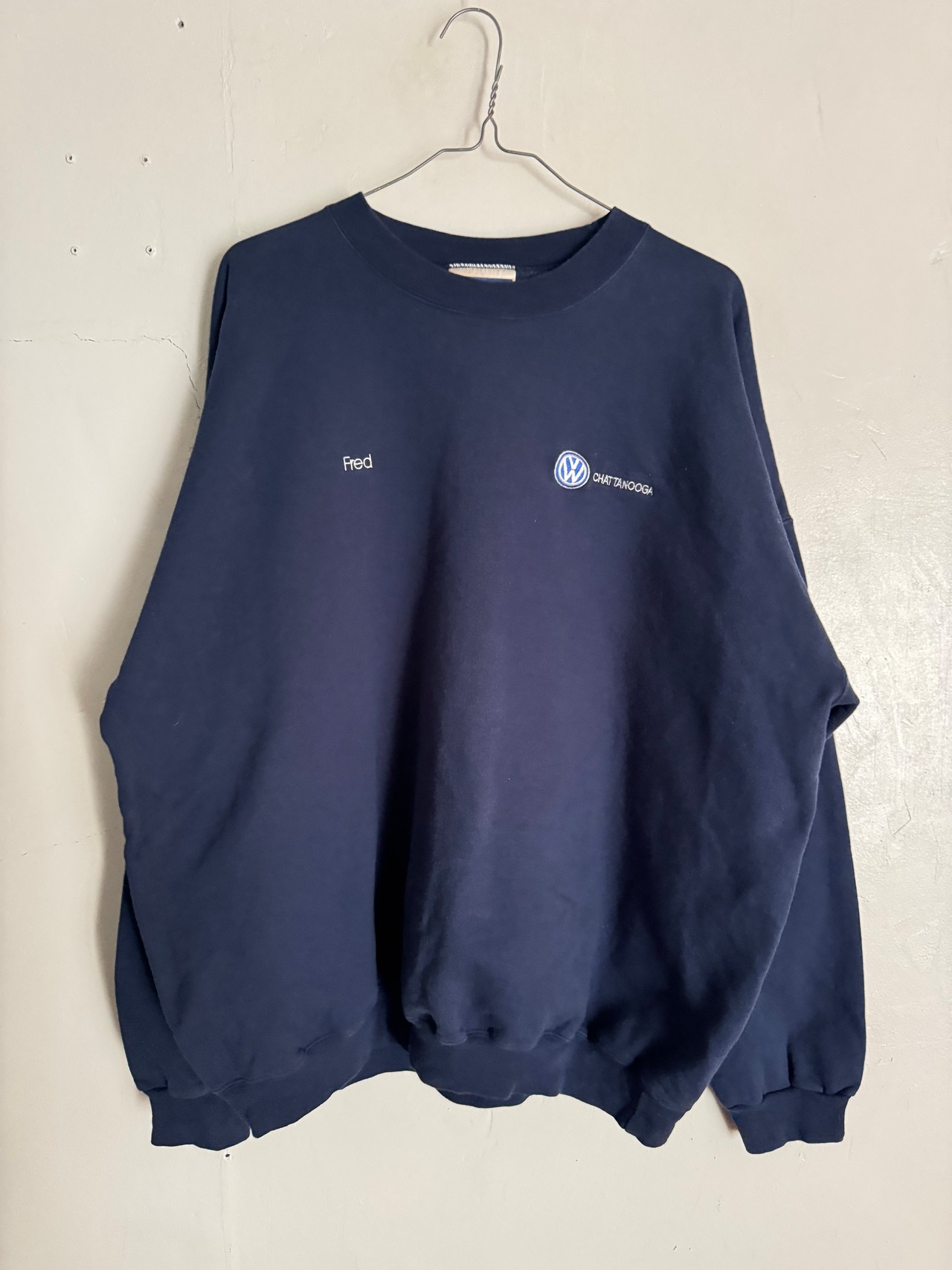 ネイビーカラーのボディに刺繍ロゴが入ったフォルクスワーゲンのクルーネックスウェット。胸元にはロゴ刺繍とネーム刺繍が施された企業系らしい一着です。シンプルながらワンポイントの刺繍が程良いアクセントとなり、落ち着いたカラーリングで幅広いスタイリングに合わせやすいデザインです。デニムやワークパンツ、スラックスなどとも相性が良く、カジュアルからストリートまで活躍するアイテムです。