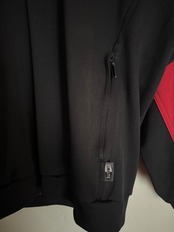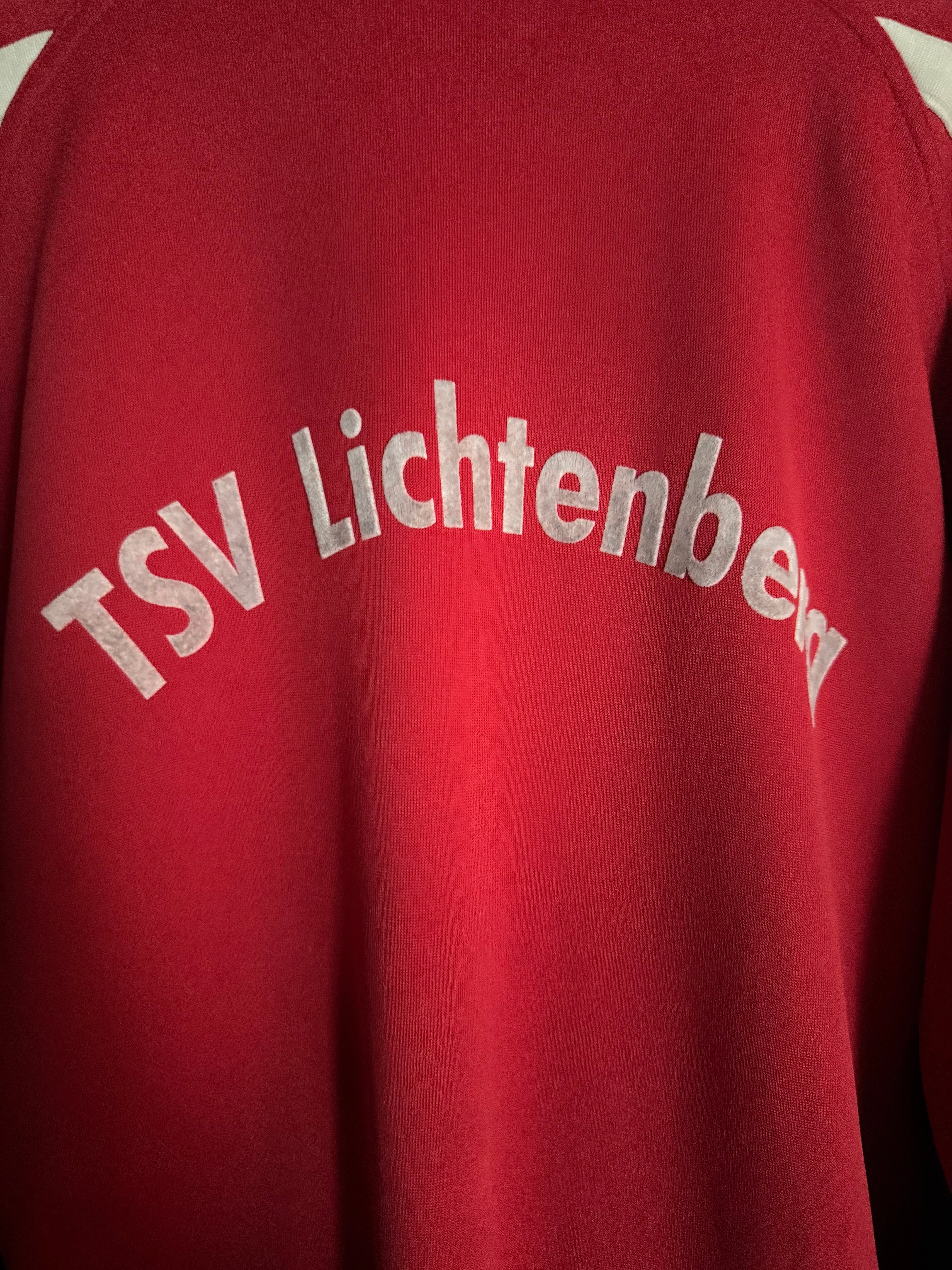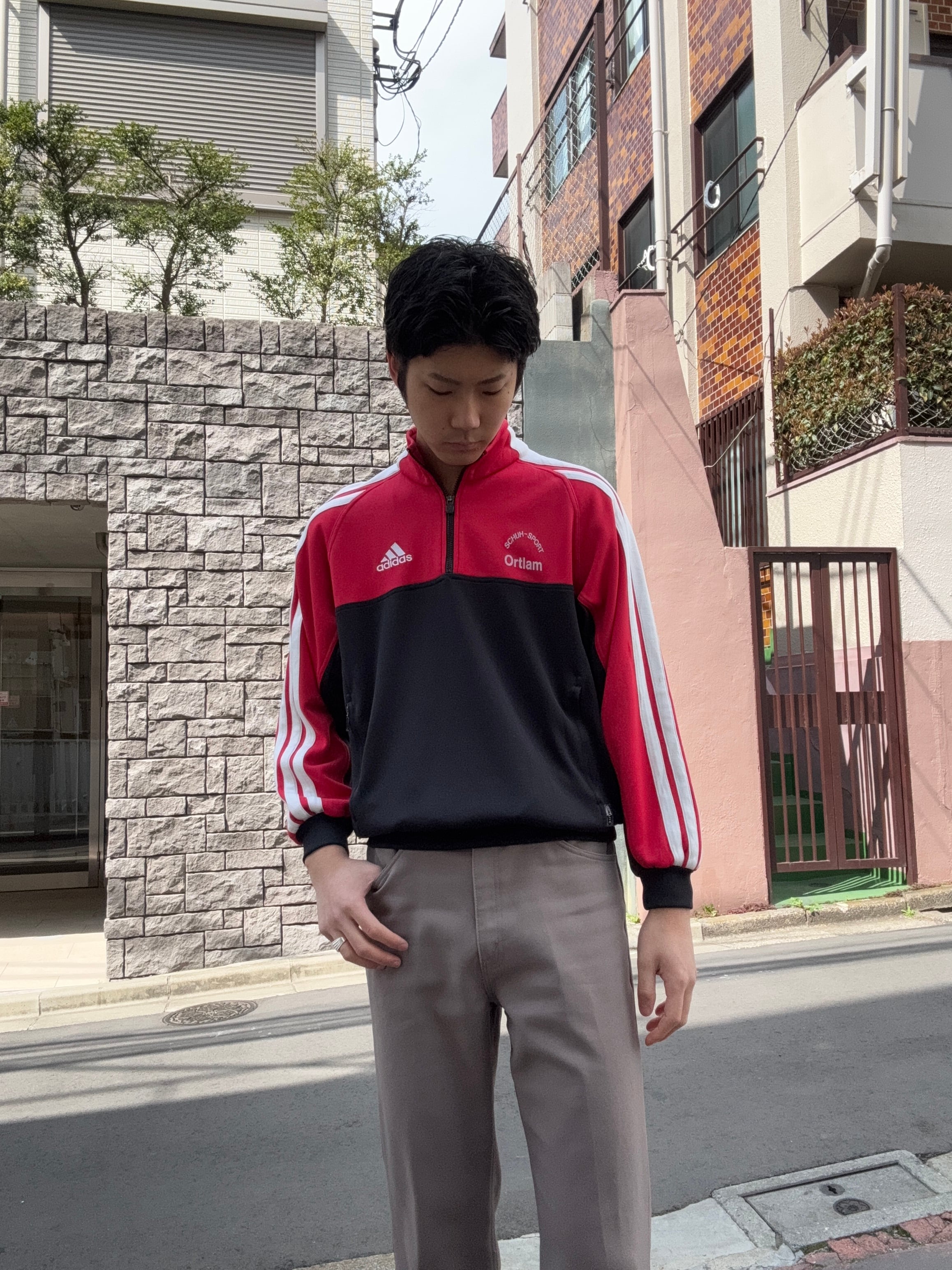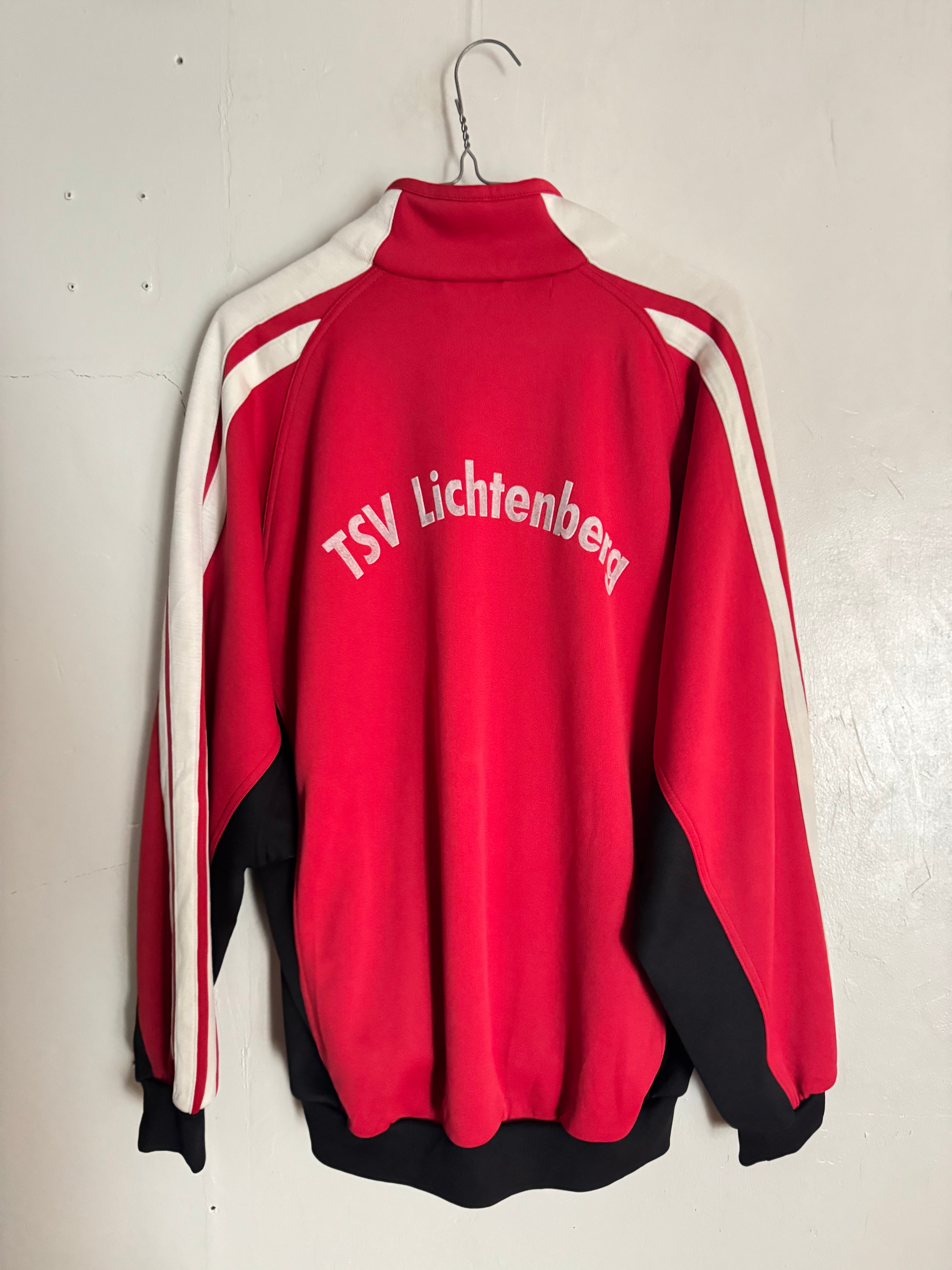 adidasのハーフジップタイプのトラックジャケット。鮮やかなレッドとブラックの大胆な切り替えデザインが目を引く、スポーツテイストあふれる一着です。胸元にはadidasロゴとチームプリント、背面には「TSV Lichtenberg」の大きなロゴが入り、実際のチームウェアのような雰囲気が魅力。袖にはadidasらしい3本ラインが入り、クラシックなスポーツスタイルを演出します。デニムやトラックパンツと合わせるだけで雰囲気の出るアイテムです。