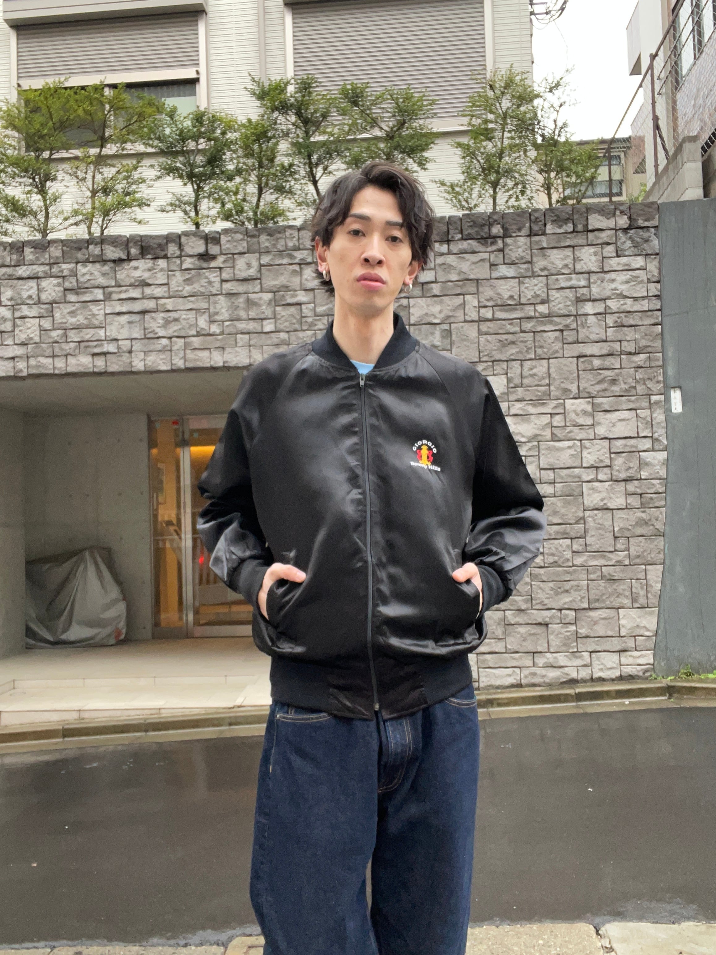 光沢のあるブラックボディで、前後にブランドロゴ刺繍が施された、ジップブルゾン。フロント部分にはイエロー、レッドのロゴ刺繍と、ネーム刺繍、バックにはホワイトでデカネーム刺繍が施されています。前後でメリハリのあるデザインがグッドです。ツルッとしたアセテート素材で、裏地はナイロン、ラフに着やすい素材感です。春にはファッションの主役になってくれるアイテムです。