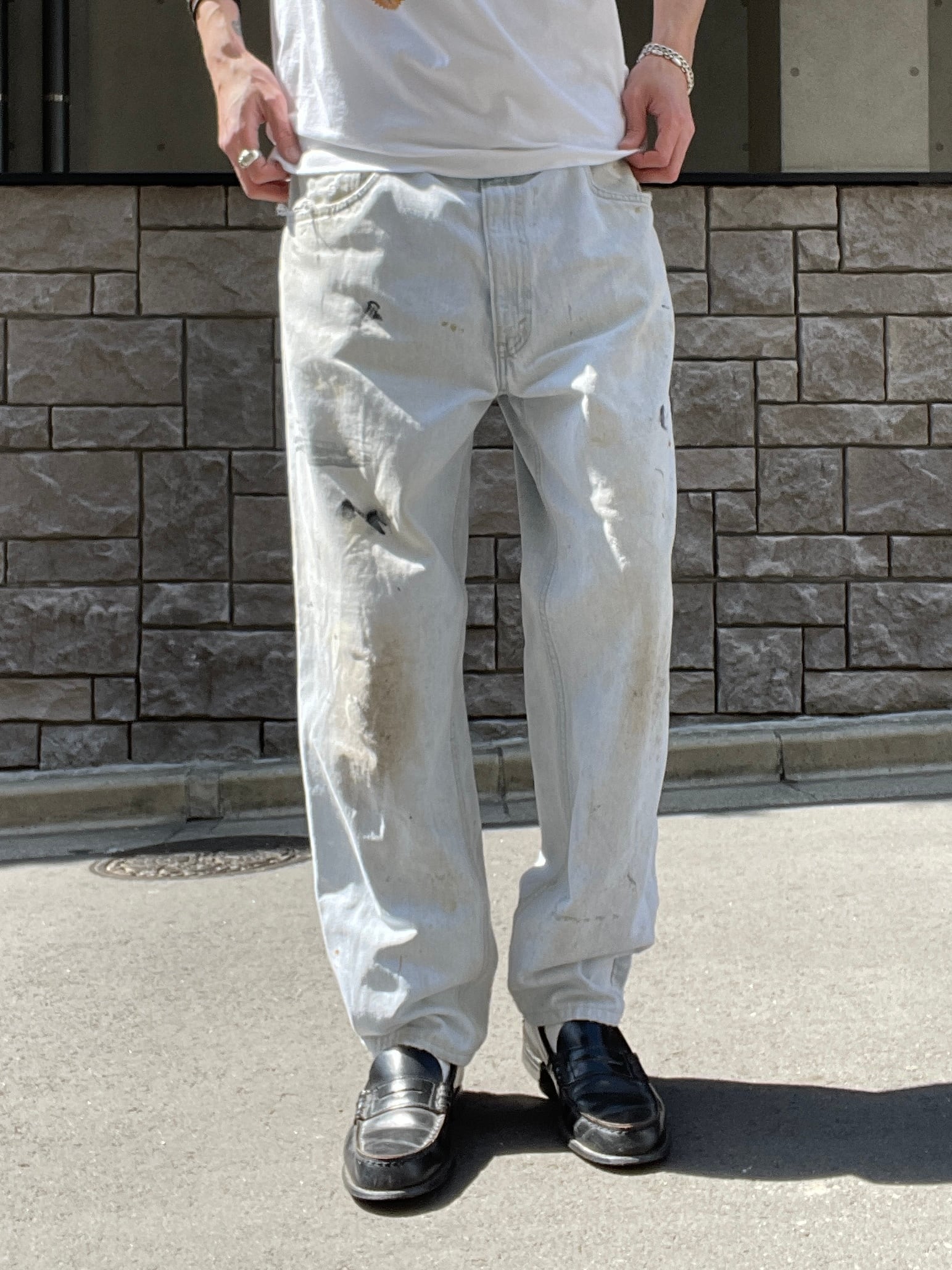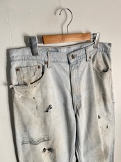 良い具合に褪せたブルーカラーで、ダメージやペイントが施された、リーバイス550デニムパンツ。裾に向かって綺麗にテーパードがかったワイドシルエット。全体の露骨なダメージ&ペイントデザインが文句無しでクールです。アメカジやストリートなど、様々なファッションに取り入れやすいパンツかと思います。USA製の一本です。