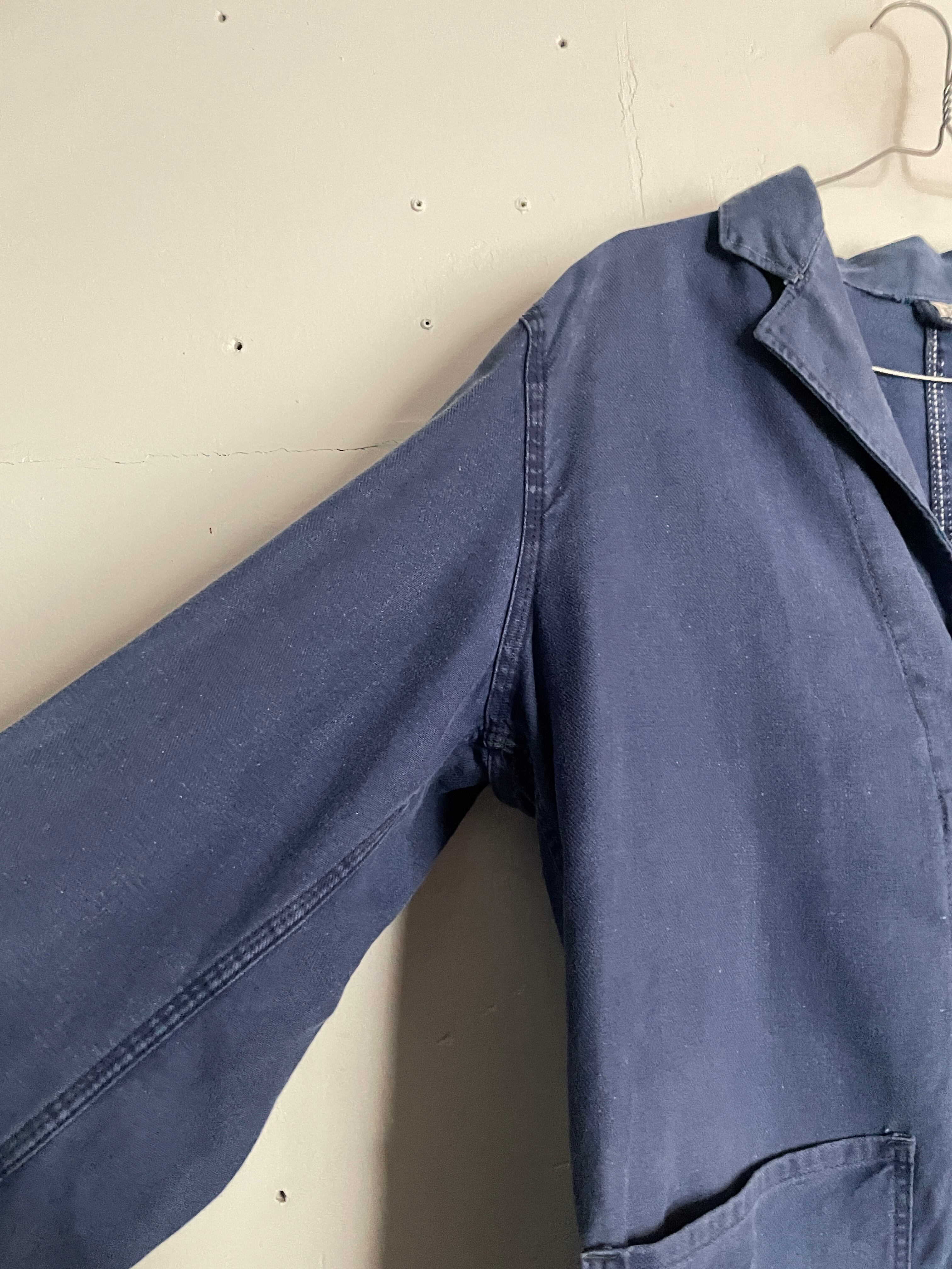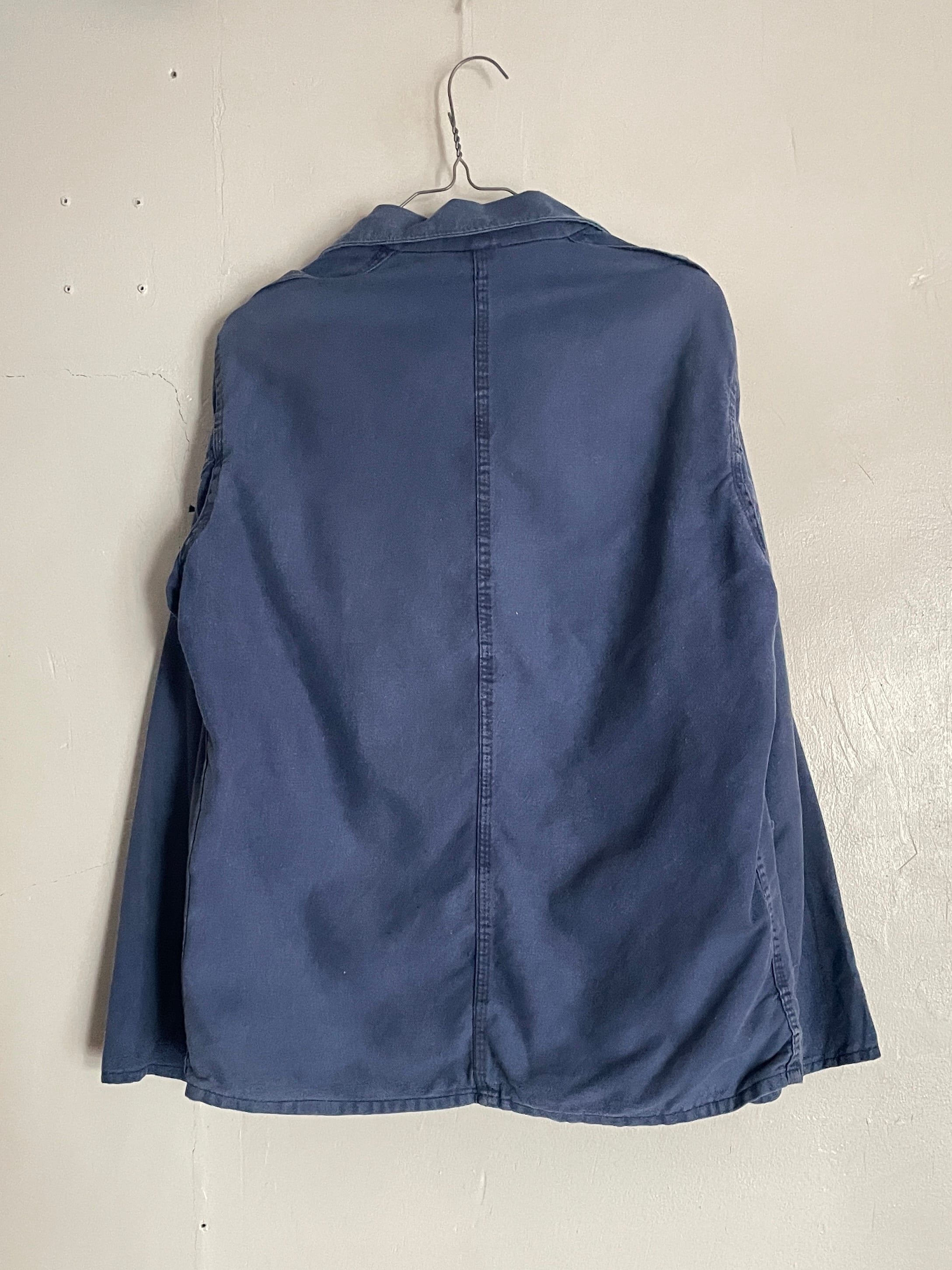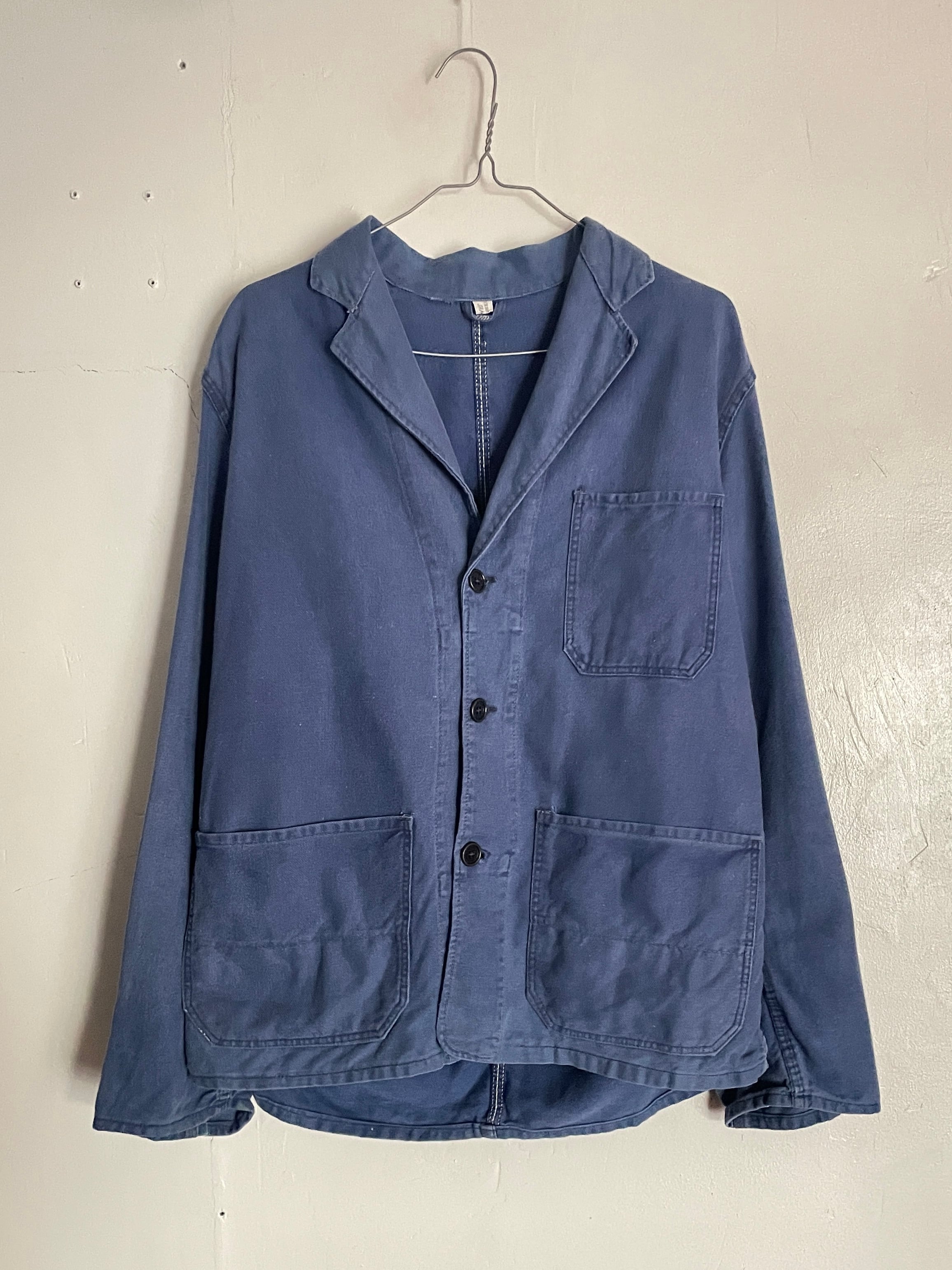 しっかりと色が残ったフレンチブルーボディで、デカ3ポケットが魅力的な、ユーロワークジャケット。通常の丸襟のカバーオール型とは異なり、テーラードジャケットのような襟が付いているのが特徴です。経年変化によって、フェードした独特な風合いが楽しめる一着です。しっかりとしたタフな生地感。ゆったりとしたサイズ感で、春には間違い無くファッションのメインになるアイテムです。
