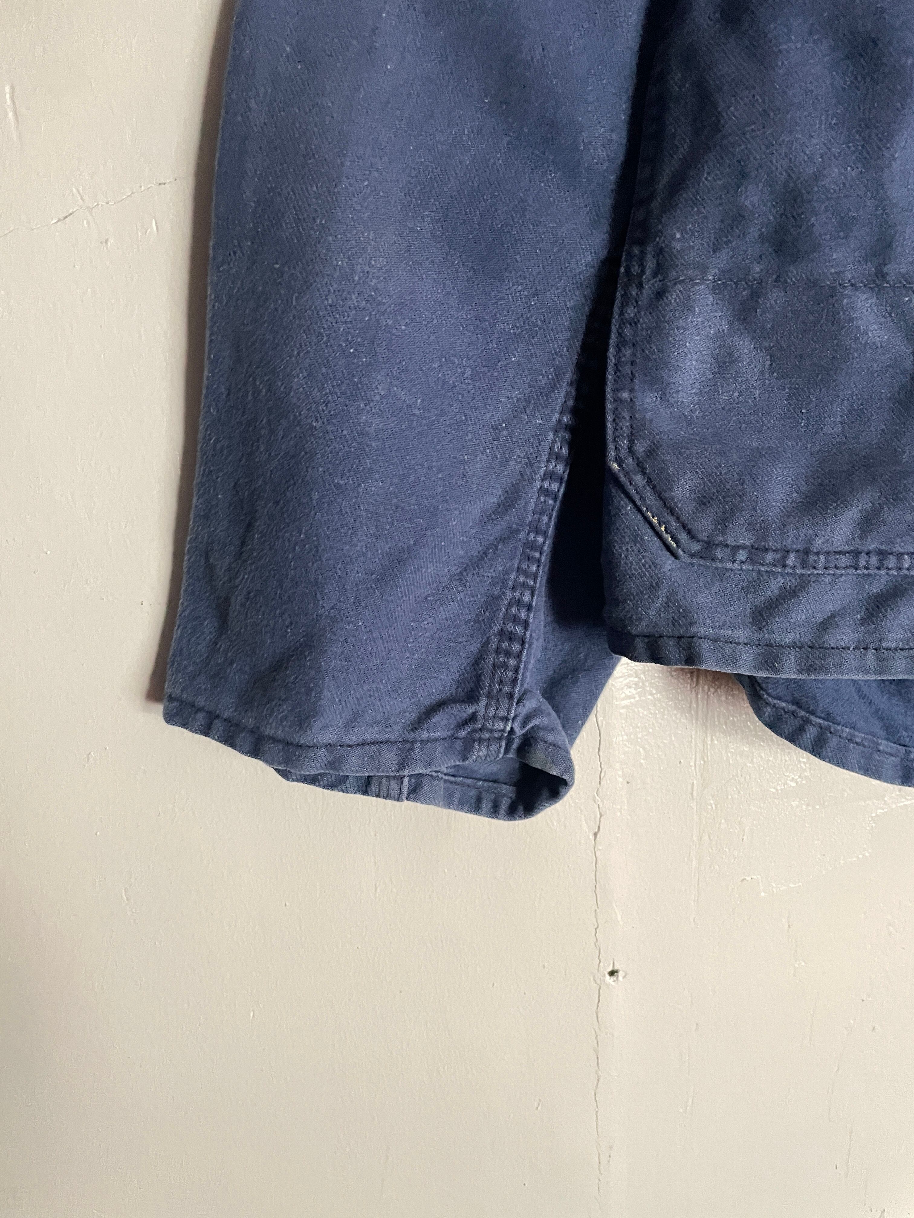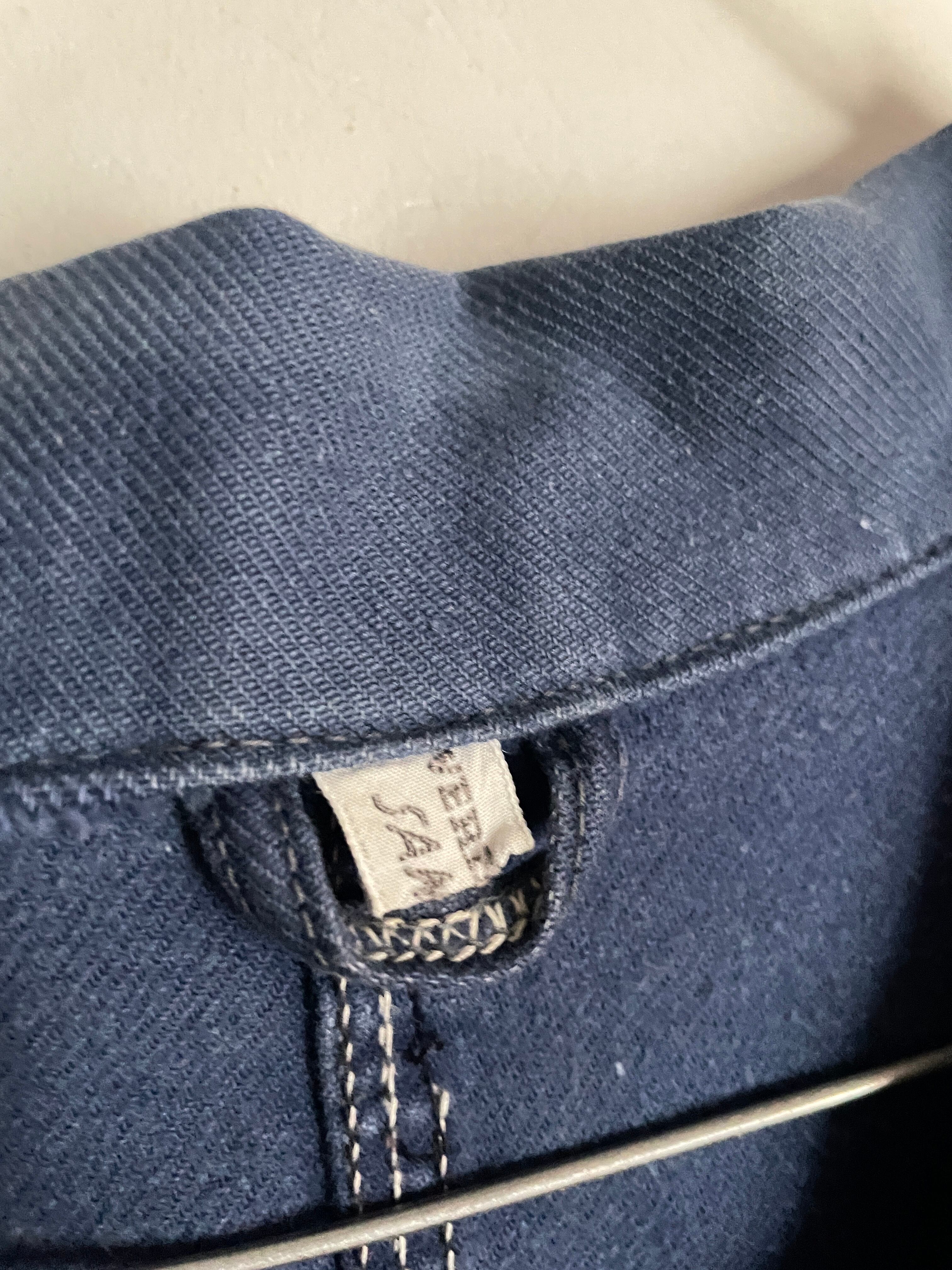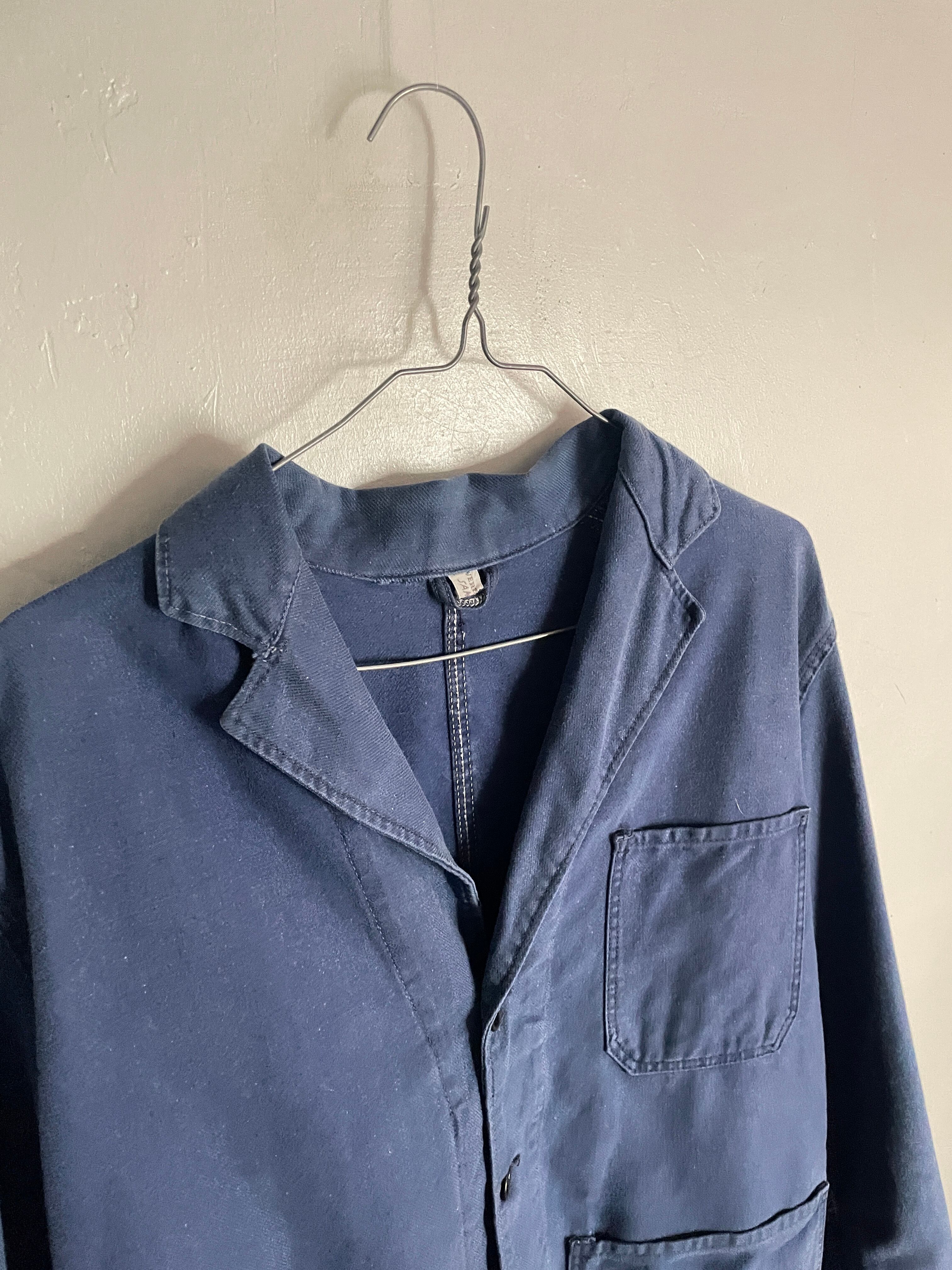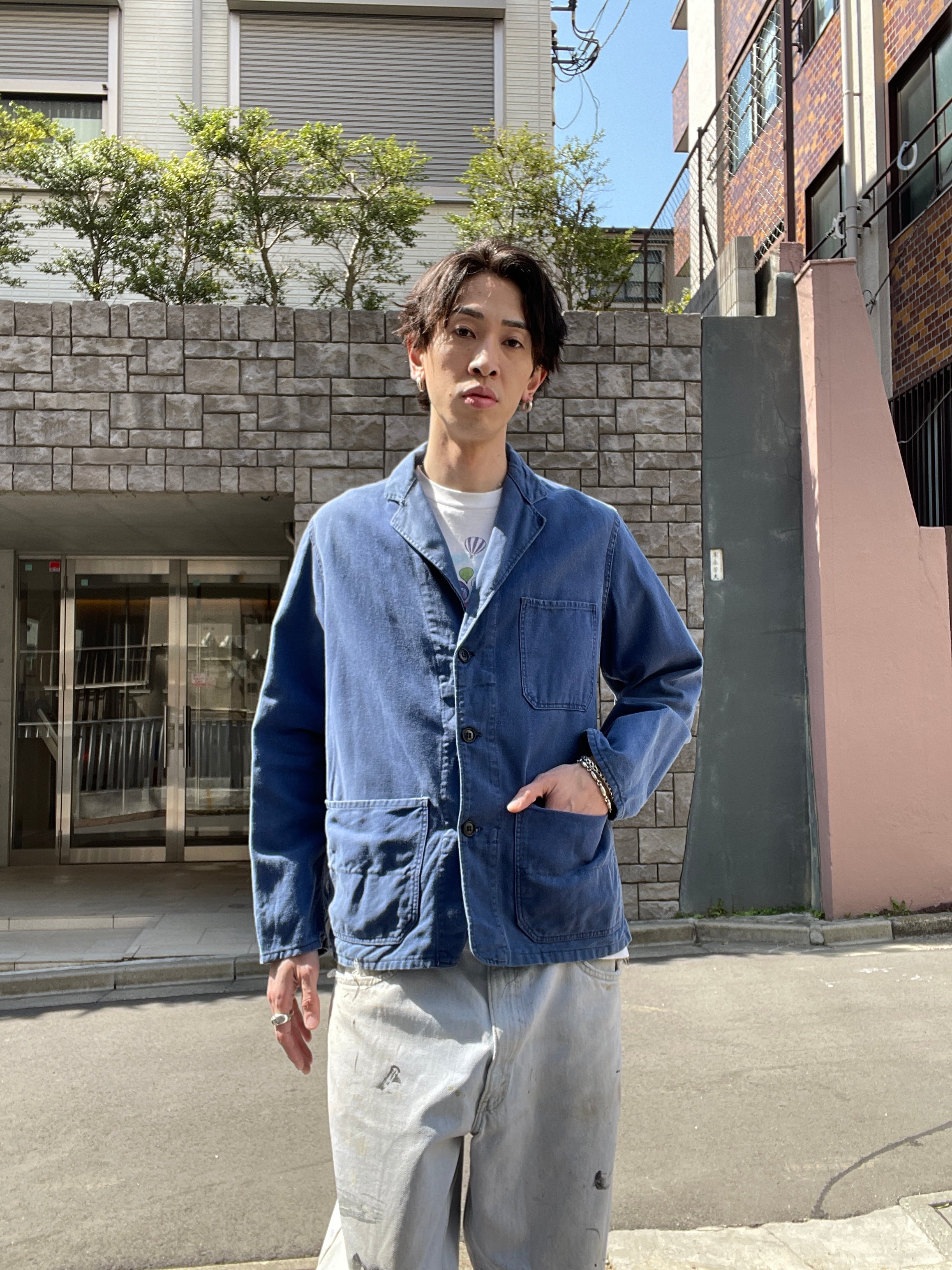 しっかりと色が残ったフレンチブルーボディで、デカ3ポケットが魅力的な、ユーロワークジャケット。通常の丸襟のカバーオール型とは異なり、テーラードジャケットのような襟が付いているのが特徴です。経年変化によって、フェードした独特な風合いが楽しめる一着です。しっかりとしたタフな生地感。ゆったりとしたサイズ感で、春には間違い無くファッションのメインになるアイテムです。