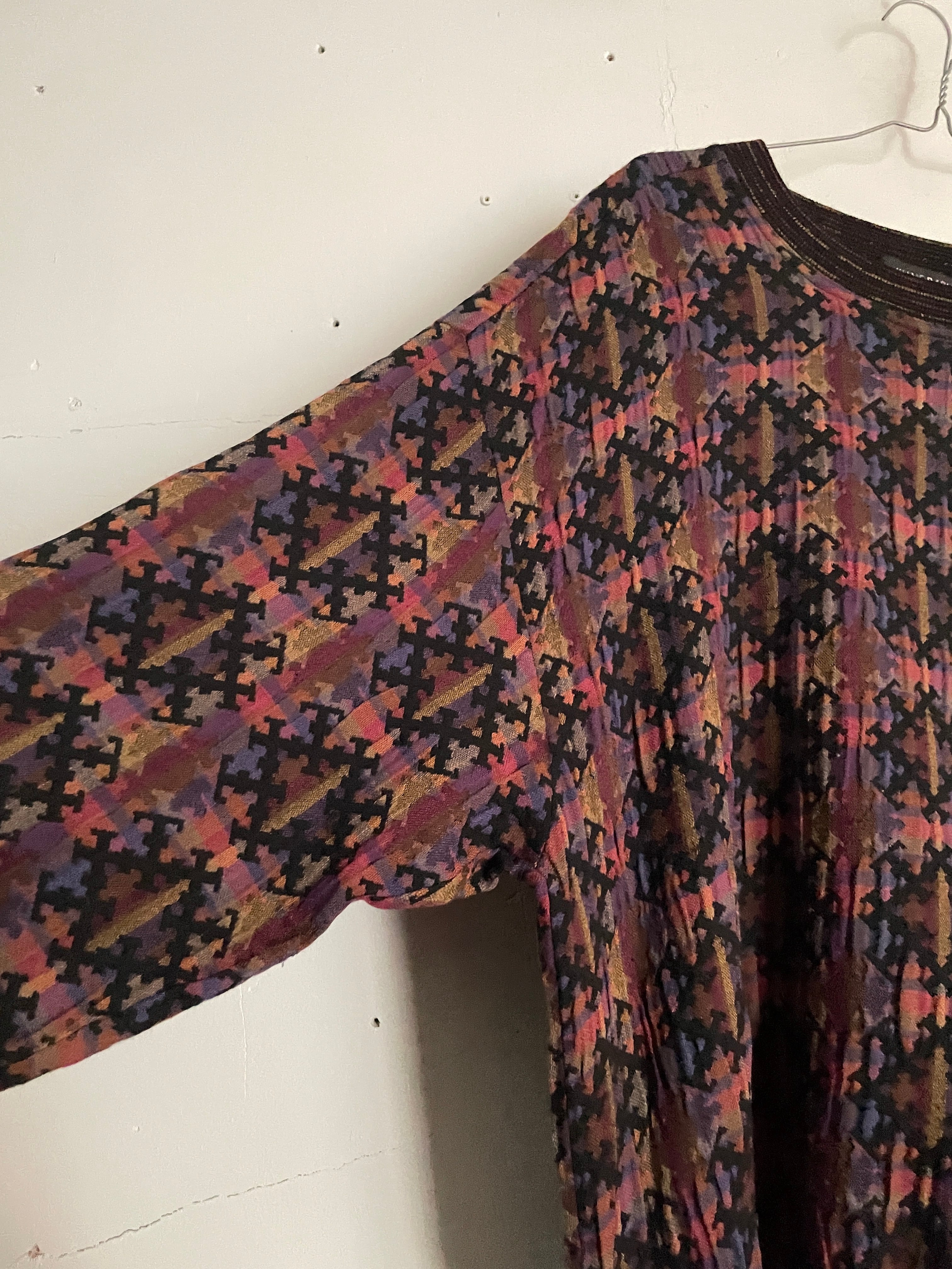 独創的な鮮やかな総柄デザインが魅力的な、ジェーン・バーンズのニットセーター。マルチカラーのボディをベースに、ブラックの模様が全体に施されています。繊細な細かなデザインからこだわりが感じられます。ウール、アクリル、ポリの軽くて柔らかい面白い質感。肩の落ちるような緩いシルエットがお洒落です。春にはファッションの主役になってくれるアイテムです。