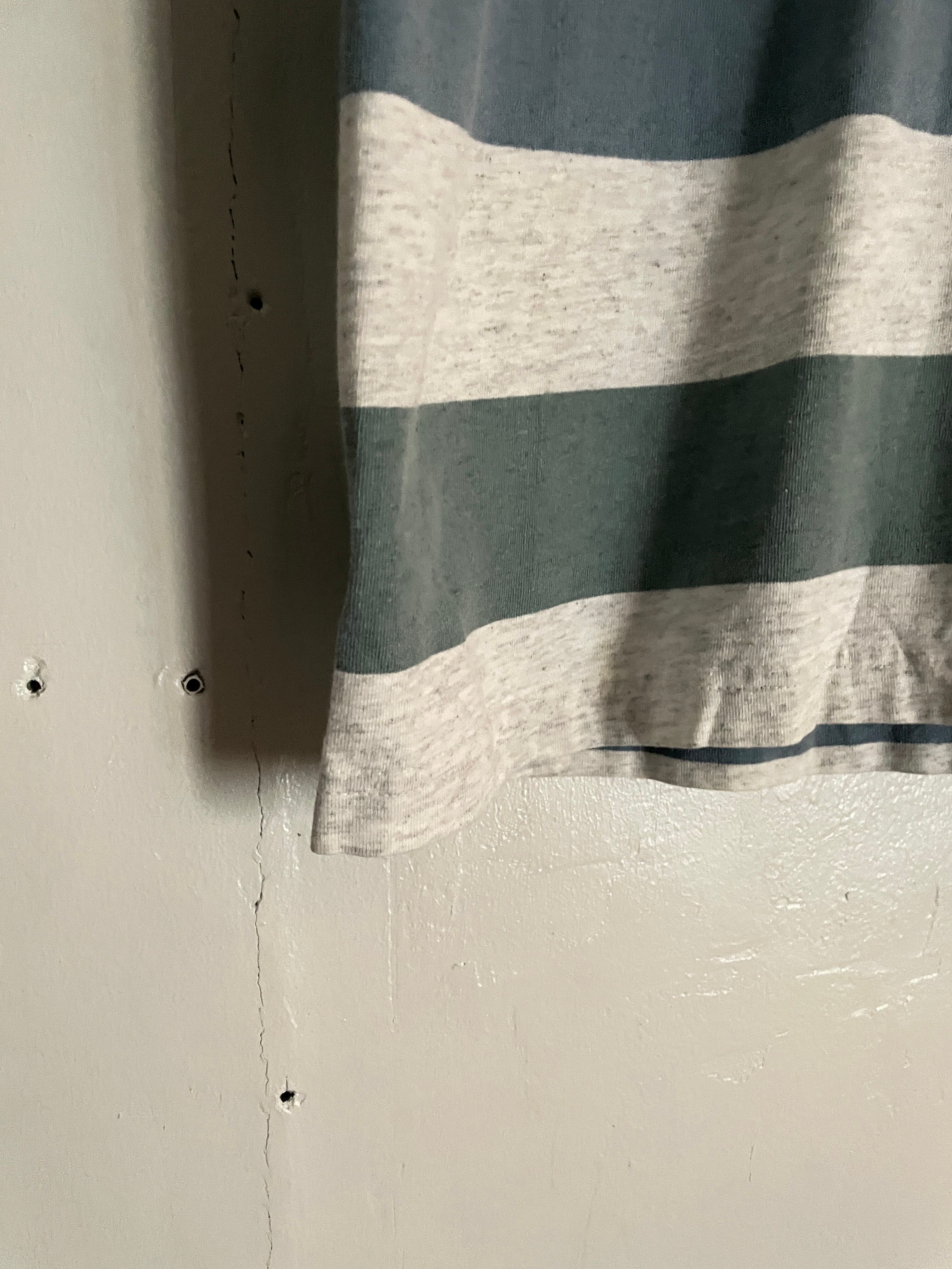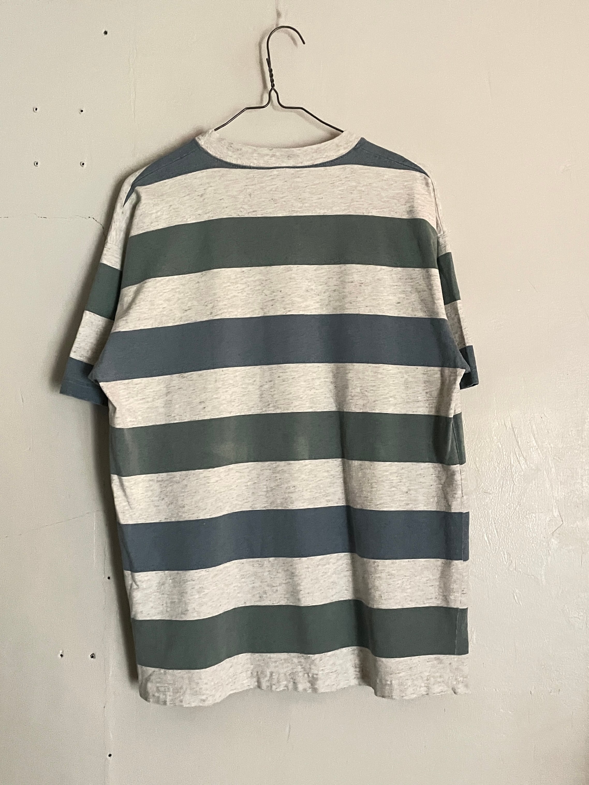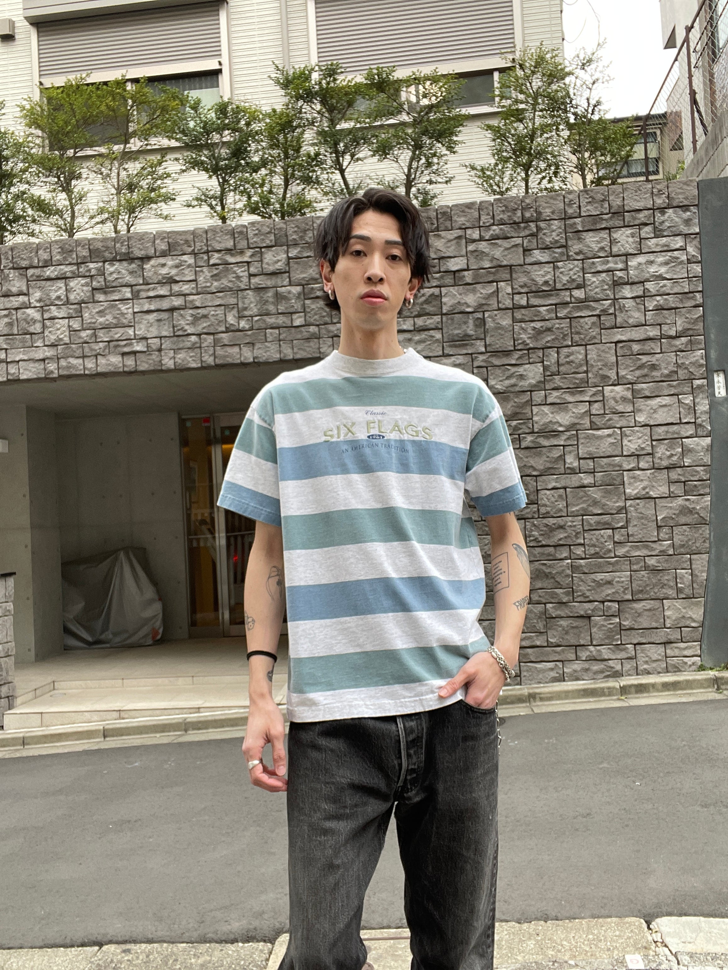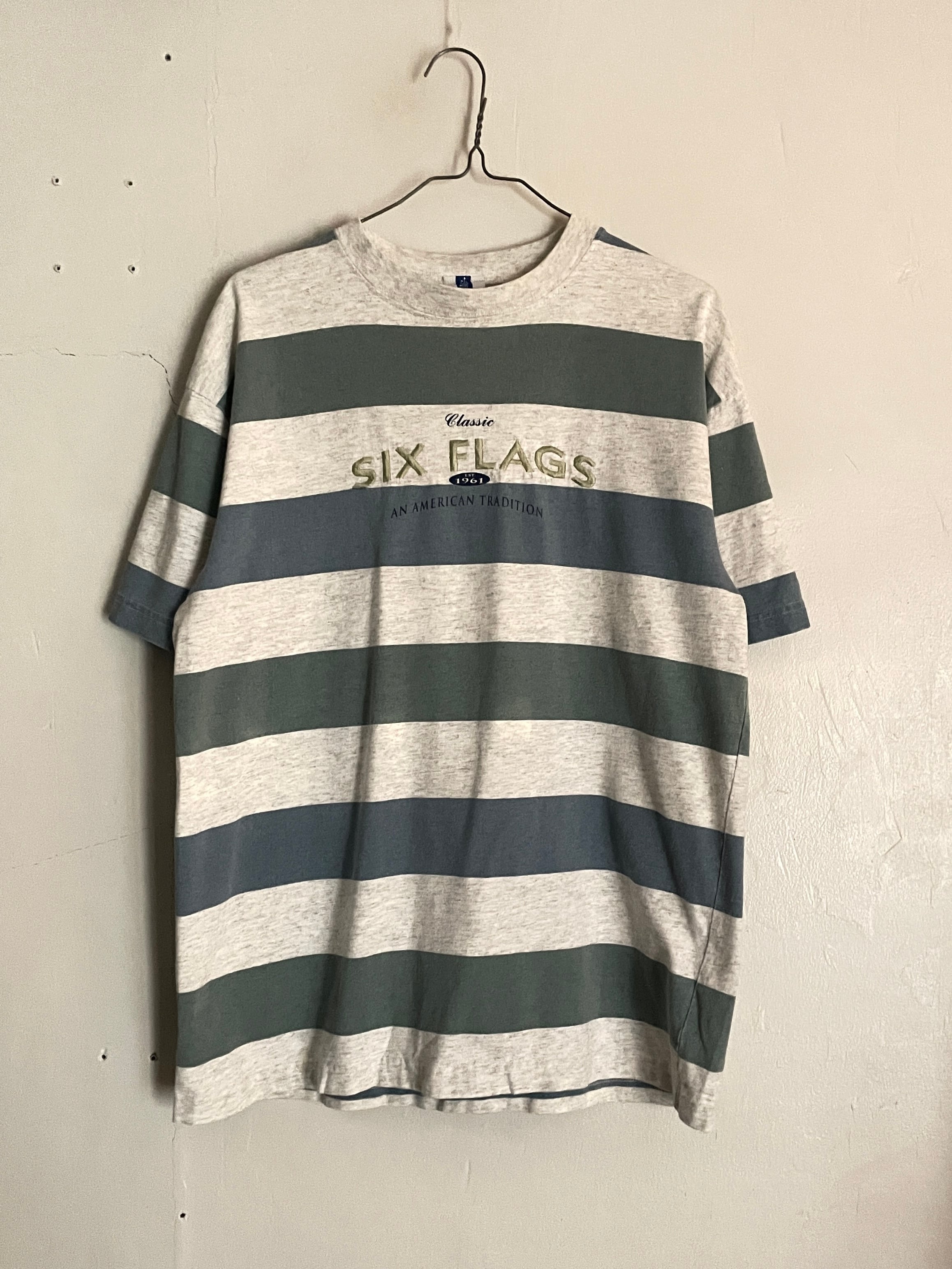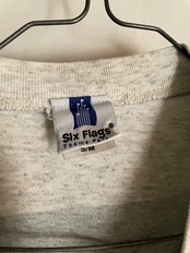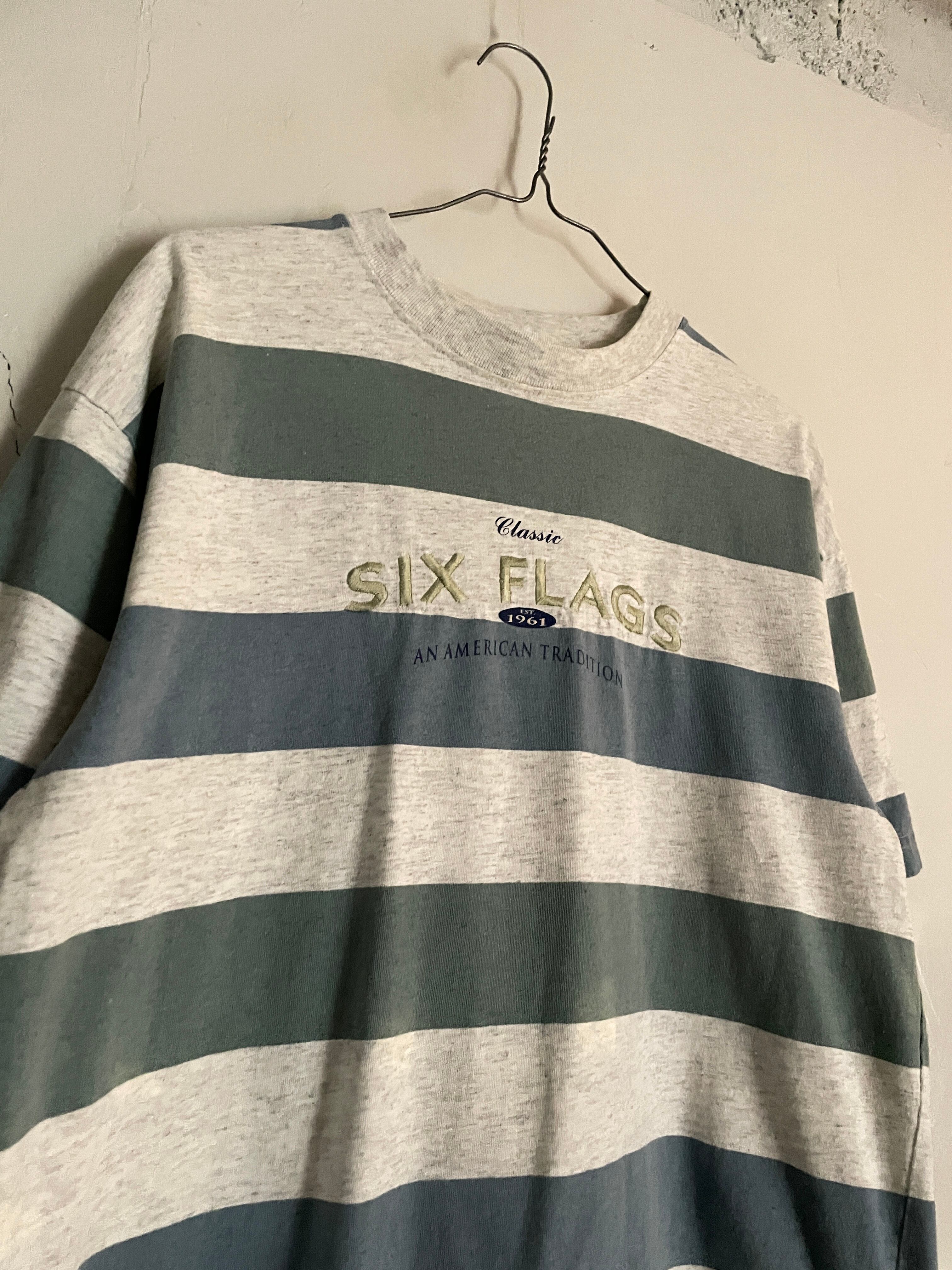 太めのボーダーデザインで、アメリカの遊園地チェーンである、”シックス・フラッグス”の刺繍デザインが施されたTシャツ。コンパクトめな刺繍デザインがグッドです。やや淡い色味のボーダーデザインも洒落てます。夏には一枚で、今の時期にはインナーの差し色などでも活躍してくれそうです。