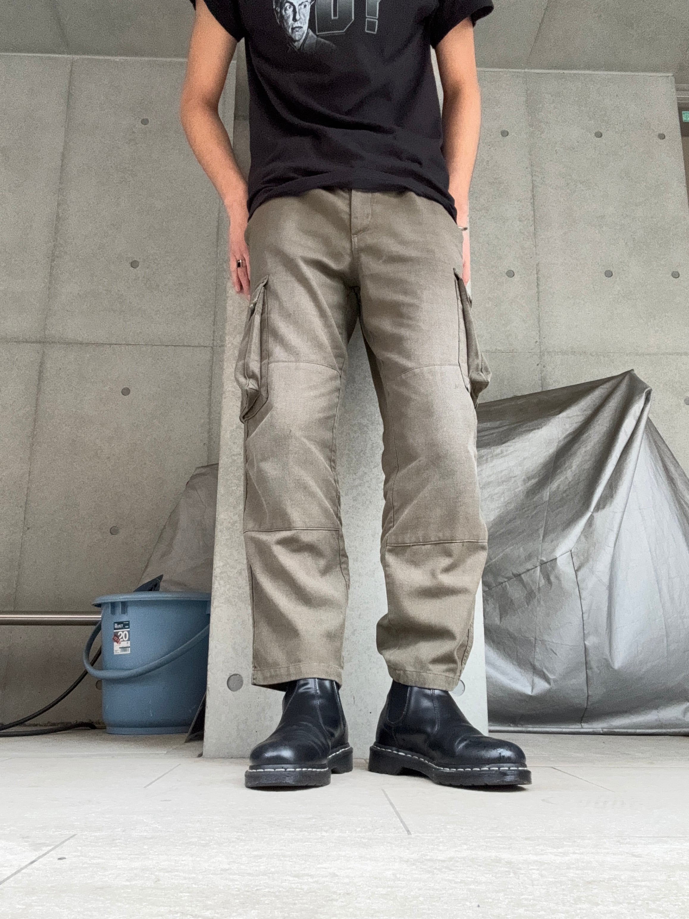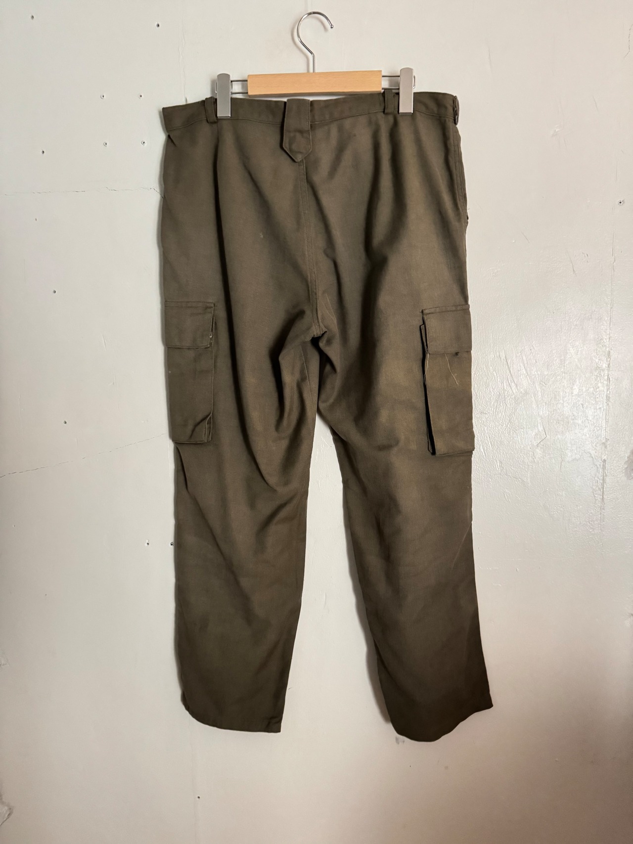 フランス軍のワークウェアを思わせる無骨な雰囲気が魅力のカーゴパンツ。オリーブカラーの落ち着いた色味に加え、両サイドの大きめフラップポケットが特徴的で、実用性とデザイン性を兼ね備えた一本です。ややテーパードしたシルエットで、野暮ったくなりすぎず現代のスタイリングにも自然に馴染みます。程良い使用感やフェード感がヴィンテージらしい味わいを演出し、シンプルなトップスと合わせるだけで雰囲気のあるコーディネートが完成します。