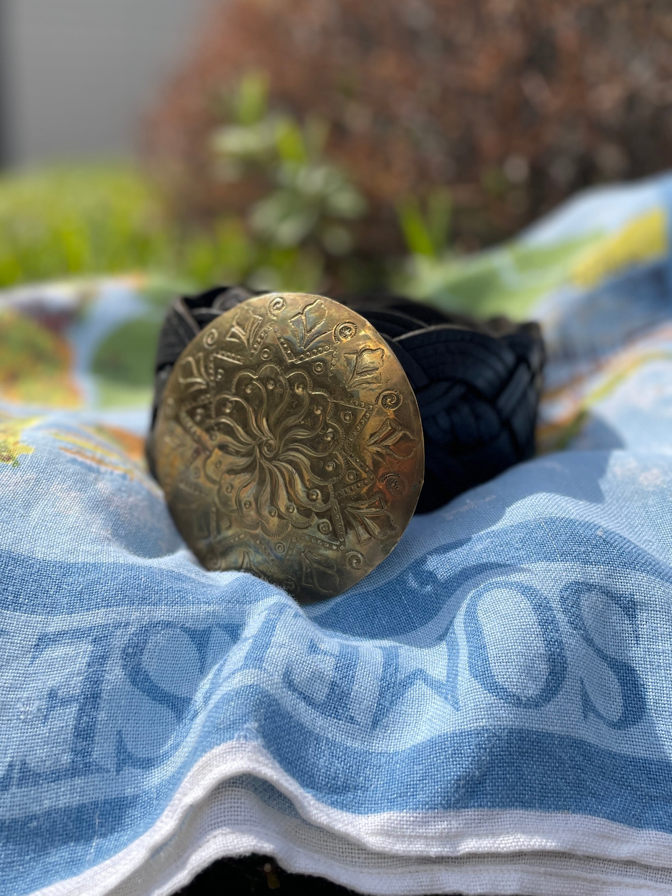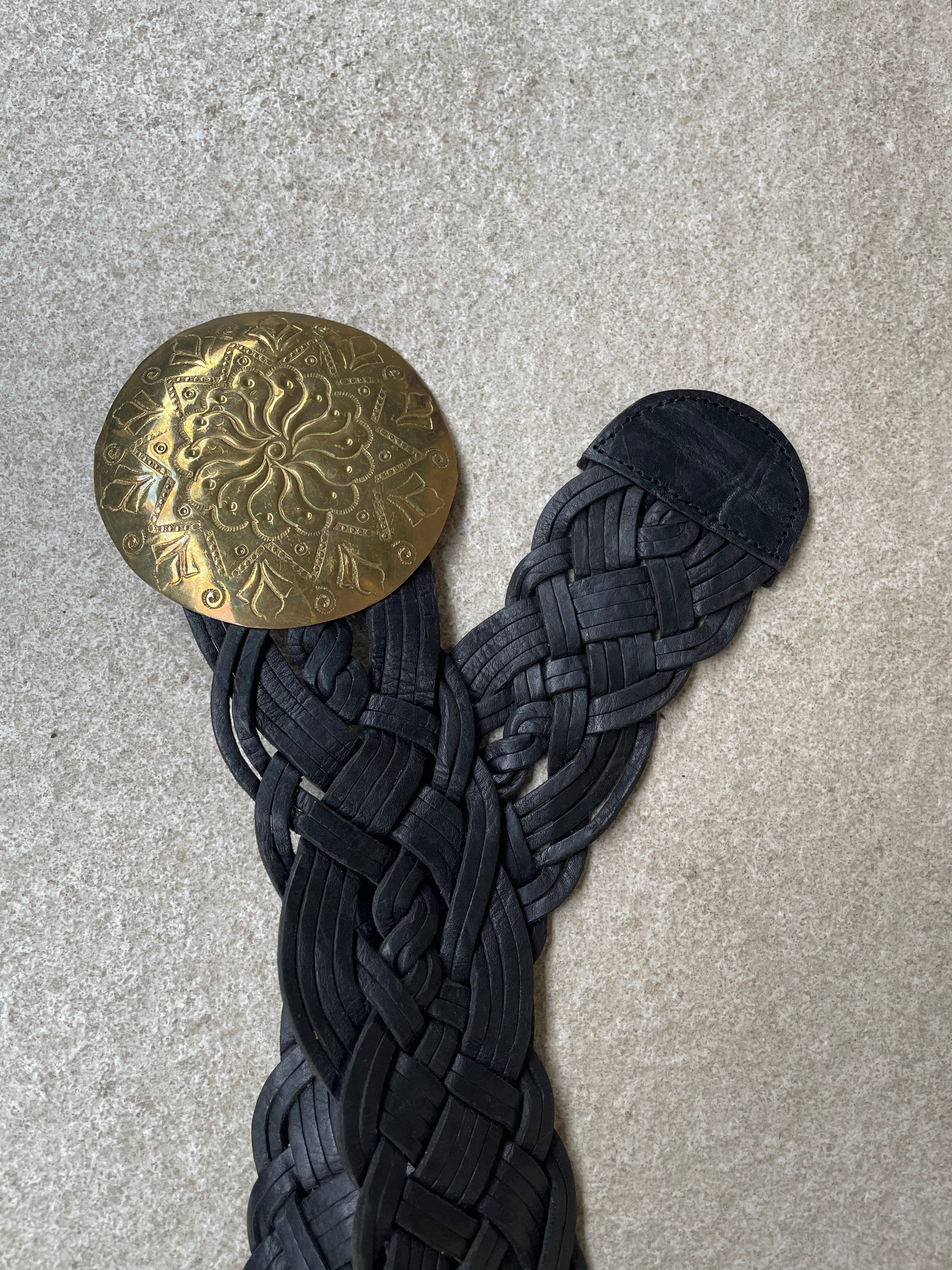 円型の大型プレートバックルに太陽や花のような細かな彫り込みデザインが施された、レザーメッシュベルト。ベルト部分もかなり太さのあるタイプです。ウエスタンな雰囲気が全体から漂うディテールです。これだけ主張の激しいベルトなので、夏などにはベルトを主役にして、見せるスタイルでコーディネートしてもよさそうです。