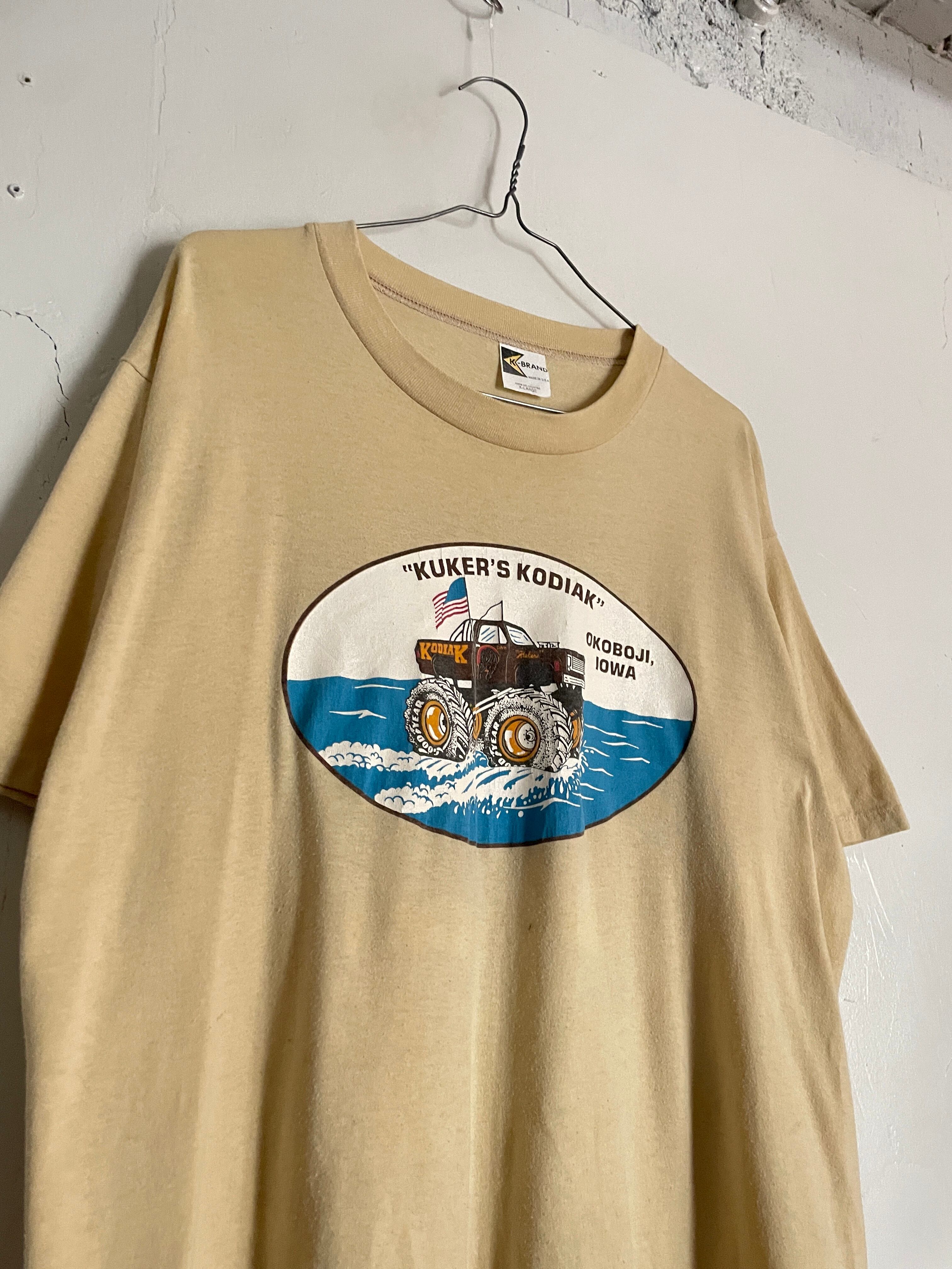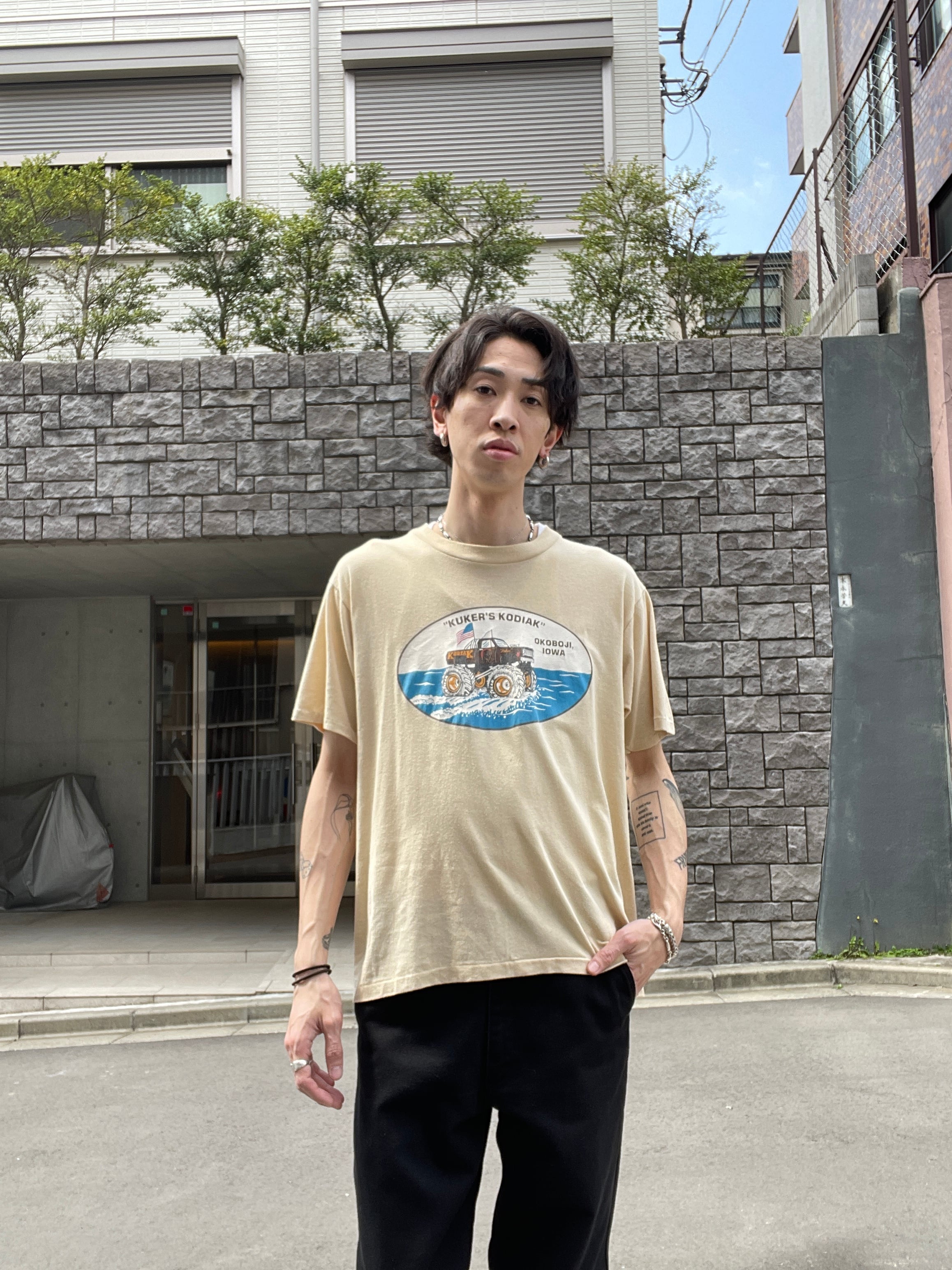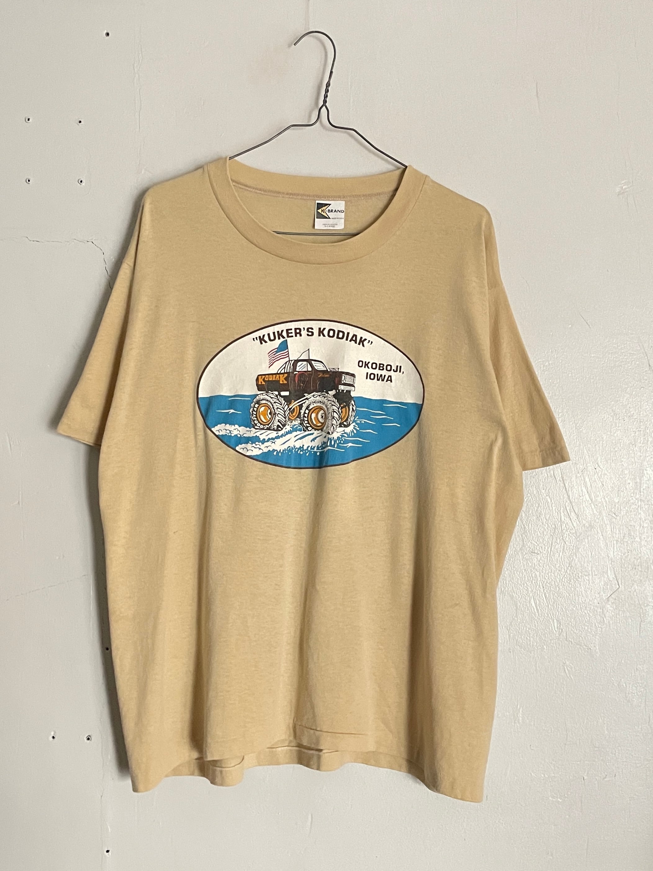 ベージュボディに、モンスタートラックのプリントが施されたTシャツ。アメリカの国旗を掲げたモンスタートラックと、アイオワ州オコボジの地名がコンパクトめにデザインされています。配色が抜群です。夏には一枚で着たいTシャツです。コットンポリの柔らかく軽い素材感。インナーとしても活躍してくれそうです。しっかりとUSA製なのもポイントが高いです。