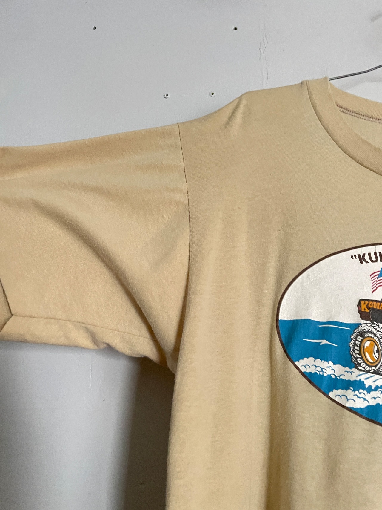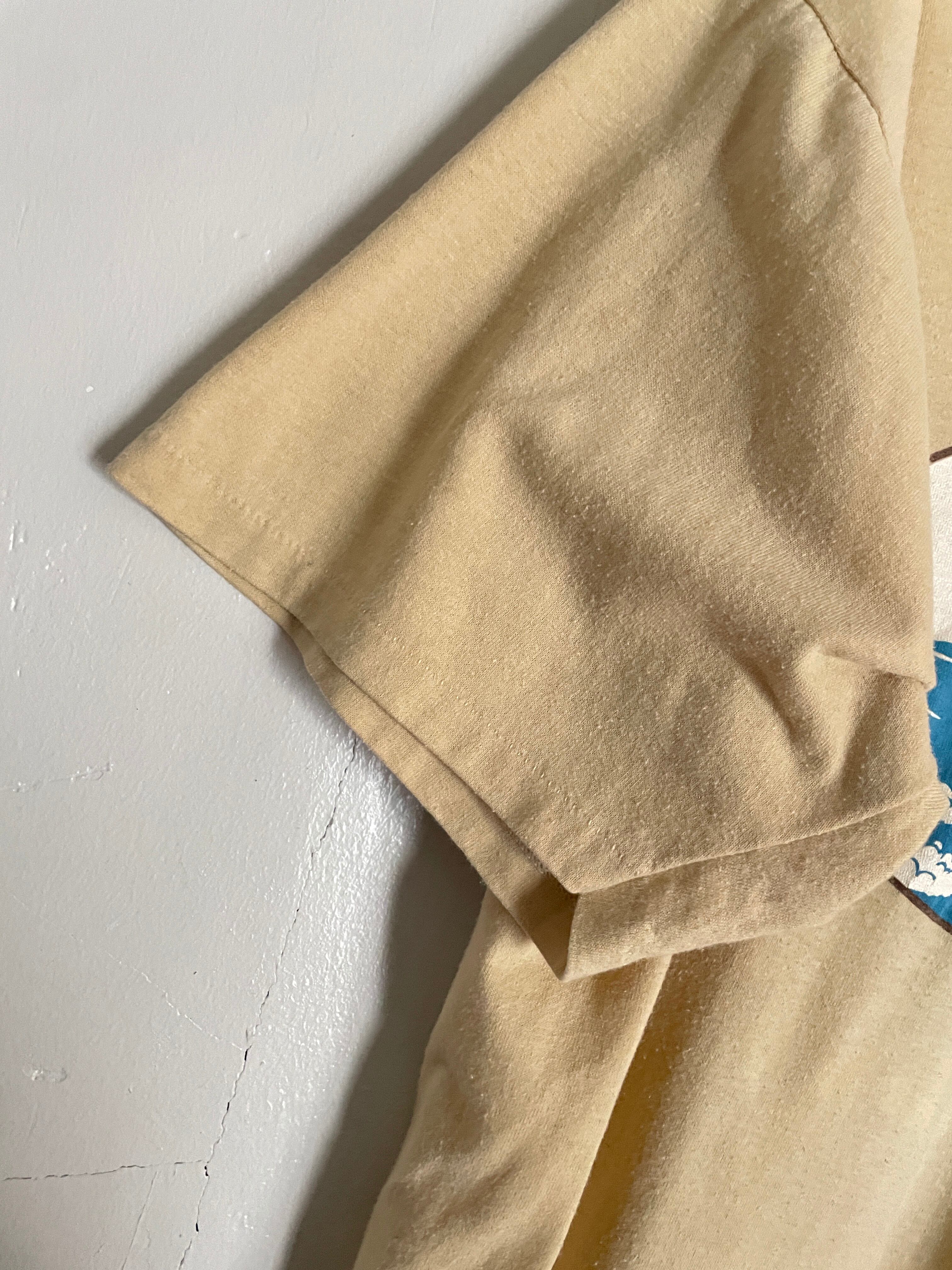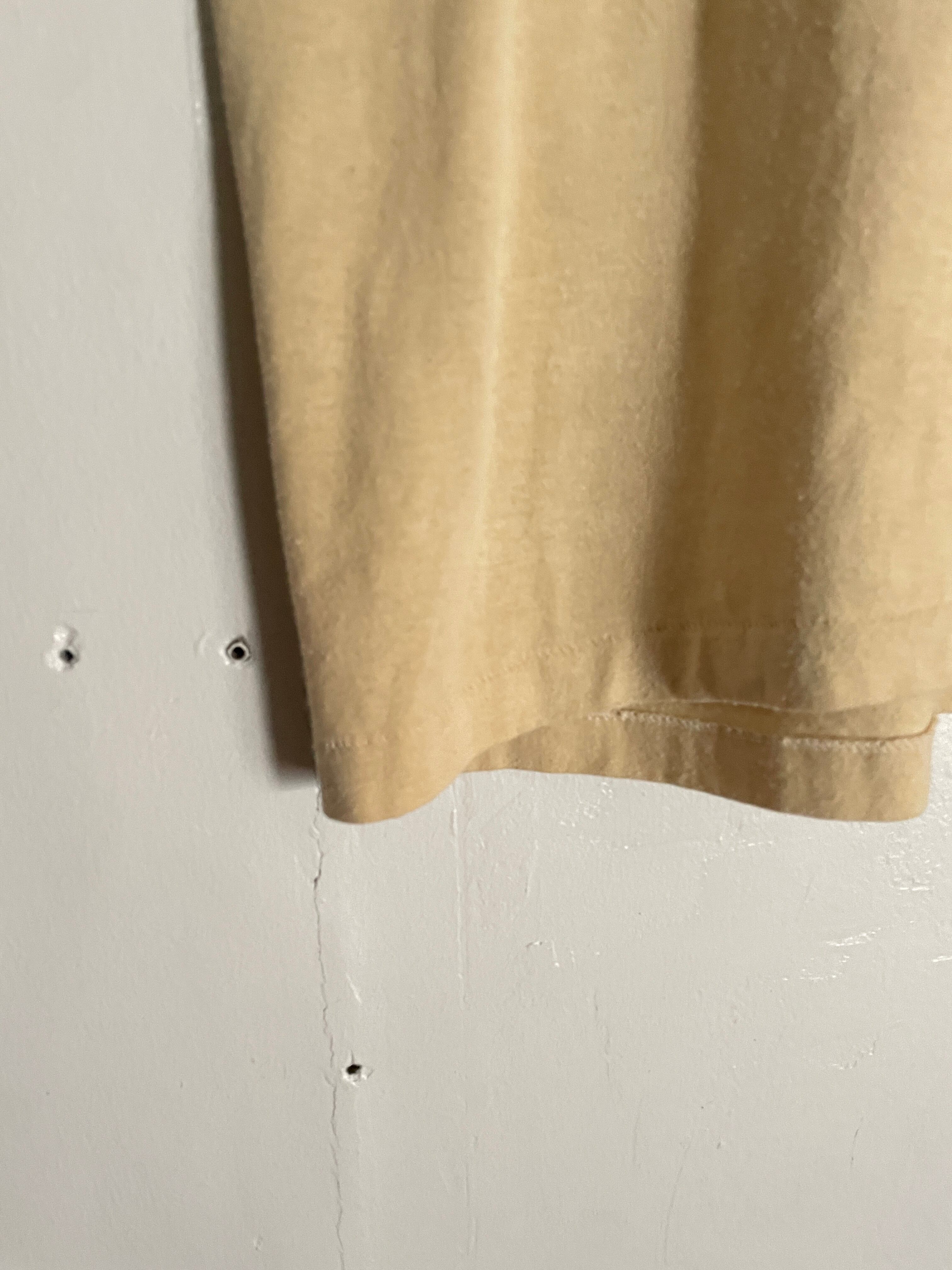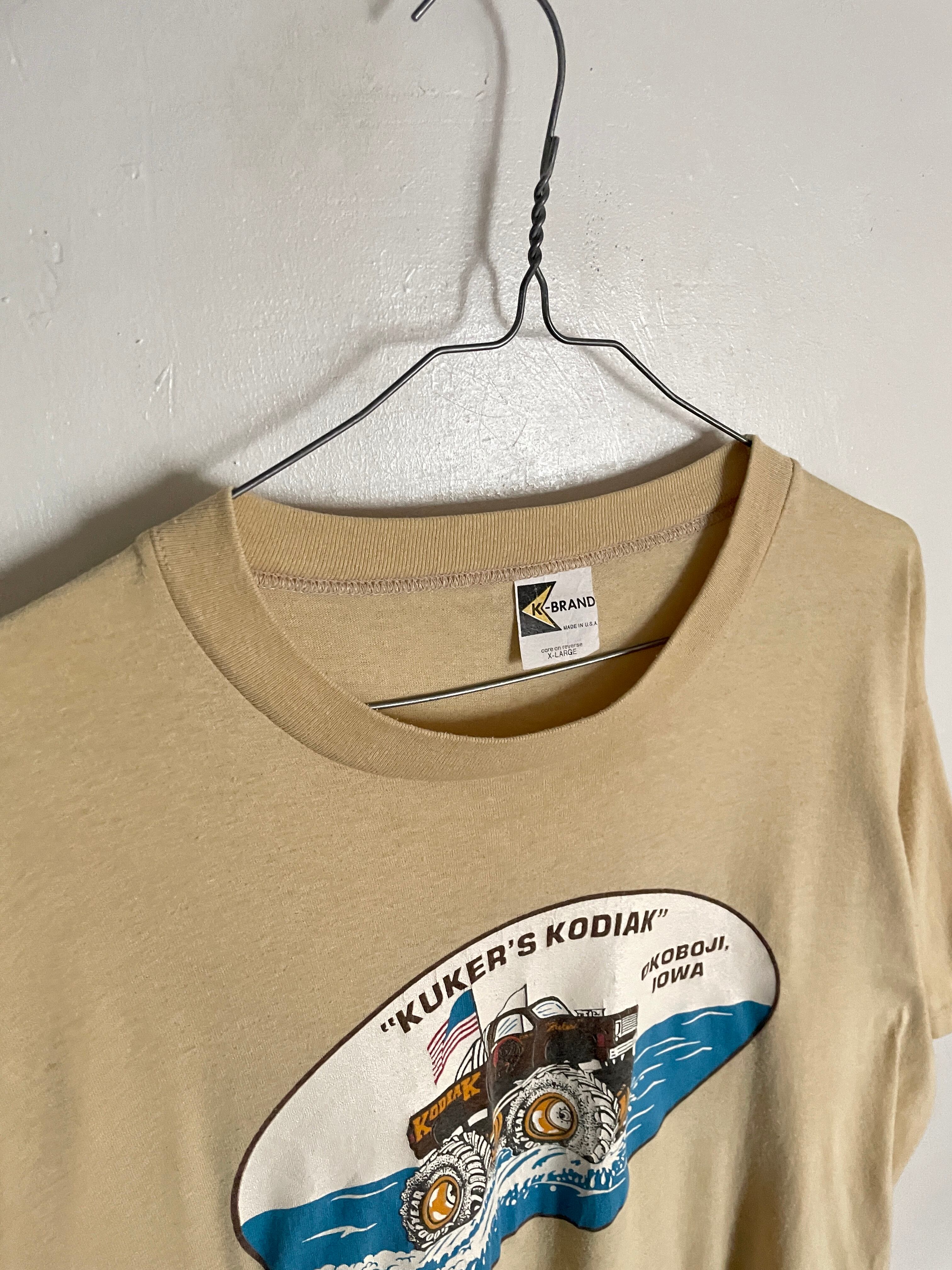 ベージュボディに、モンスタートラックのプリントが施されたTシャツ。アメリカの国旗を掲げたモンスタートラックと、アイオワ州オコボジの地名がコンパクトめにデザインされています。配色が抜群です。夏には一枚で着たいTシャツです。コットンポリの柔らかく軽い素材感。インナーとしても活躍してくれそうです。しっかりとUSA製なのもポイントが高いです。