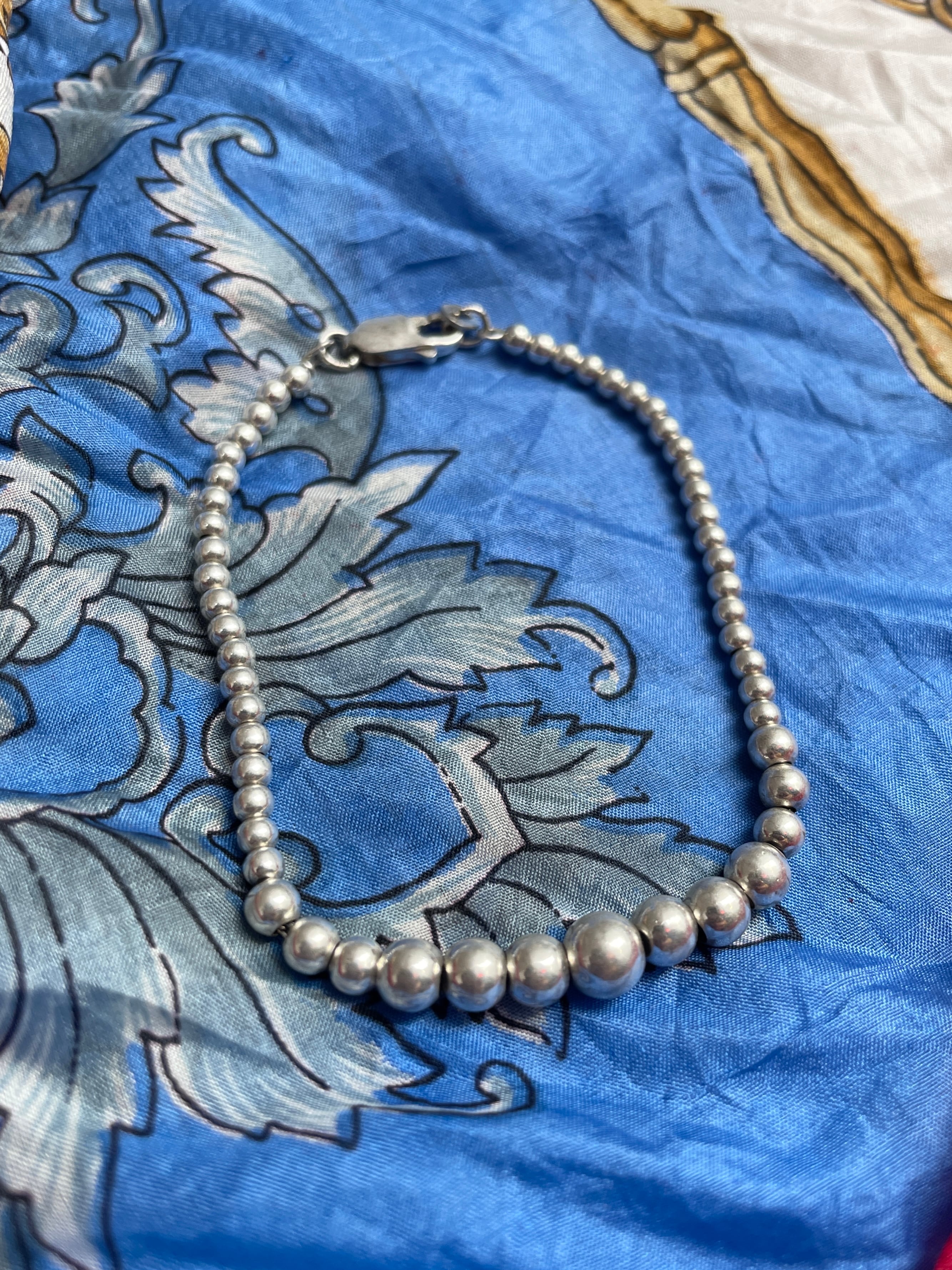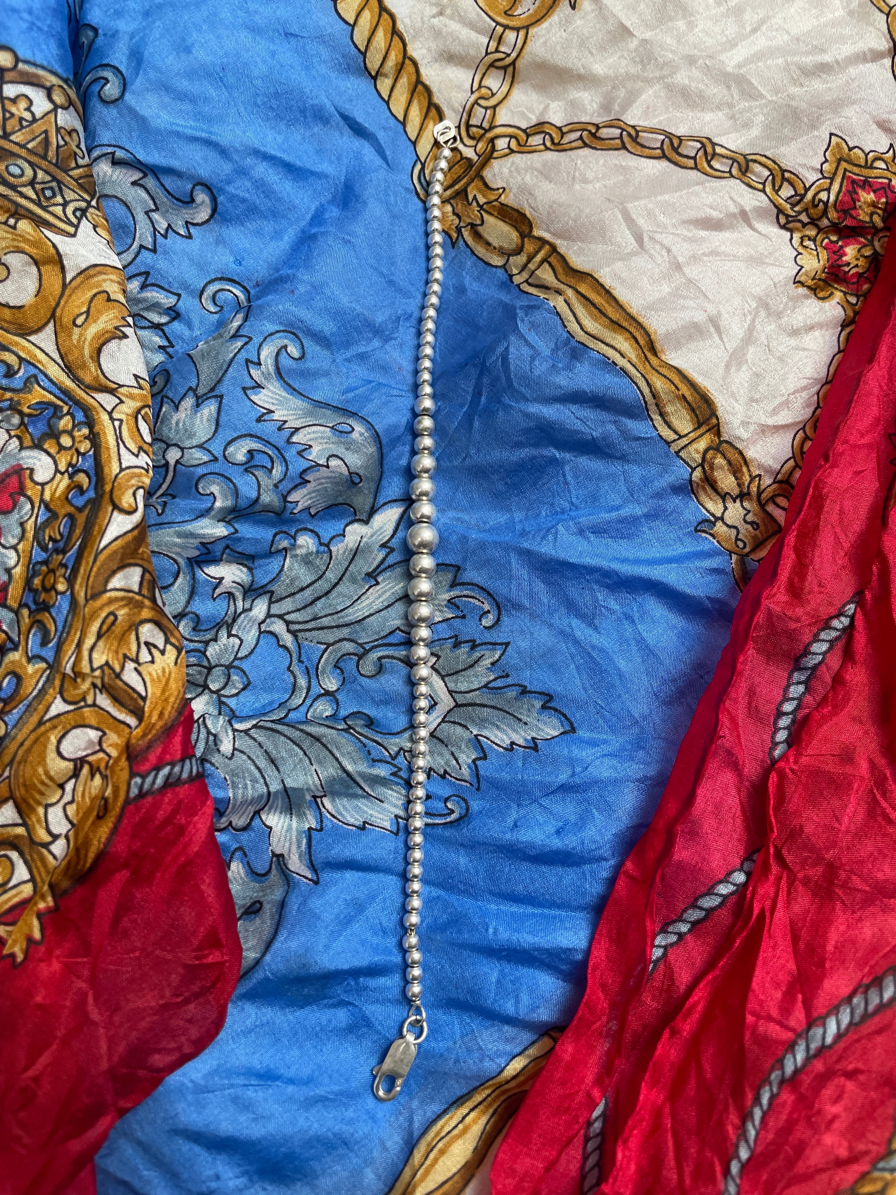 中心に向かってビーズが大きくなるデザインが特徴的な、シルバーブレスレット。光沢のある上品なシルバー925。ナバホパールと呼ばれるスタイルのインディアンジュエリーです。太過ぎず、細過ぎないのが良い。シンプルになりがちな、これからの季節はこういったさりげなく付けられるブレスレットは必需品です。