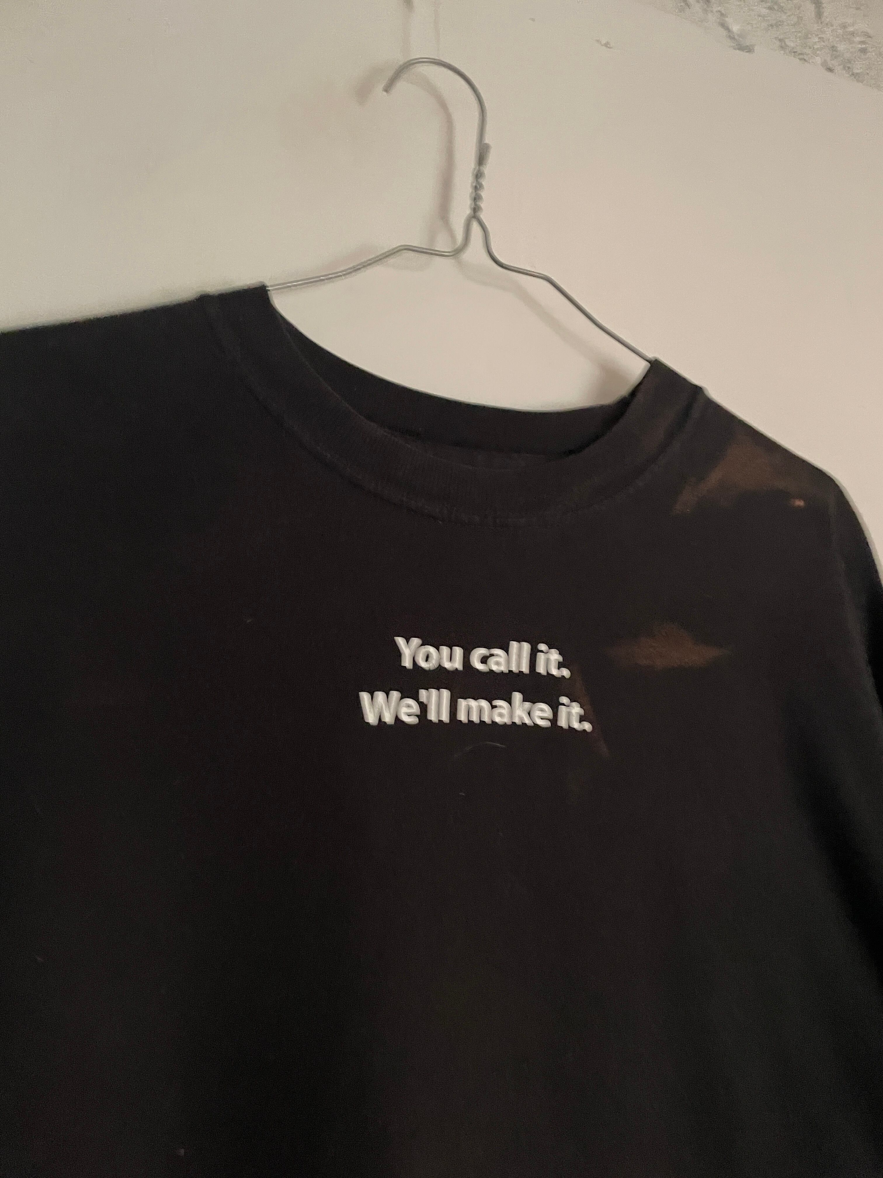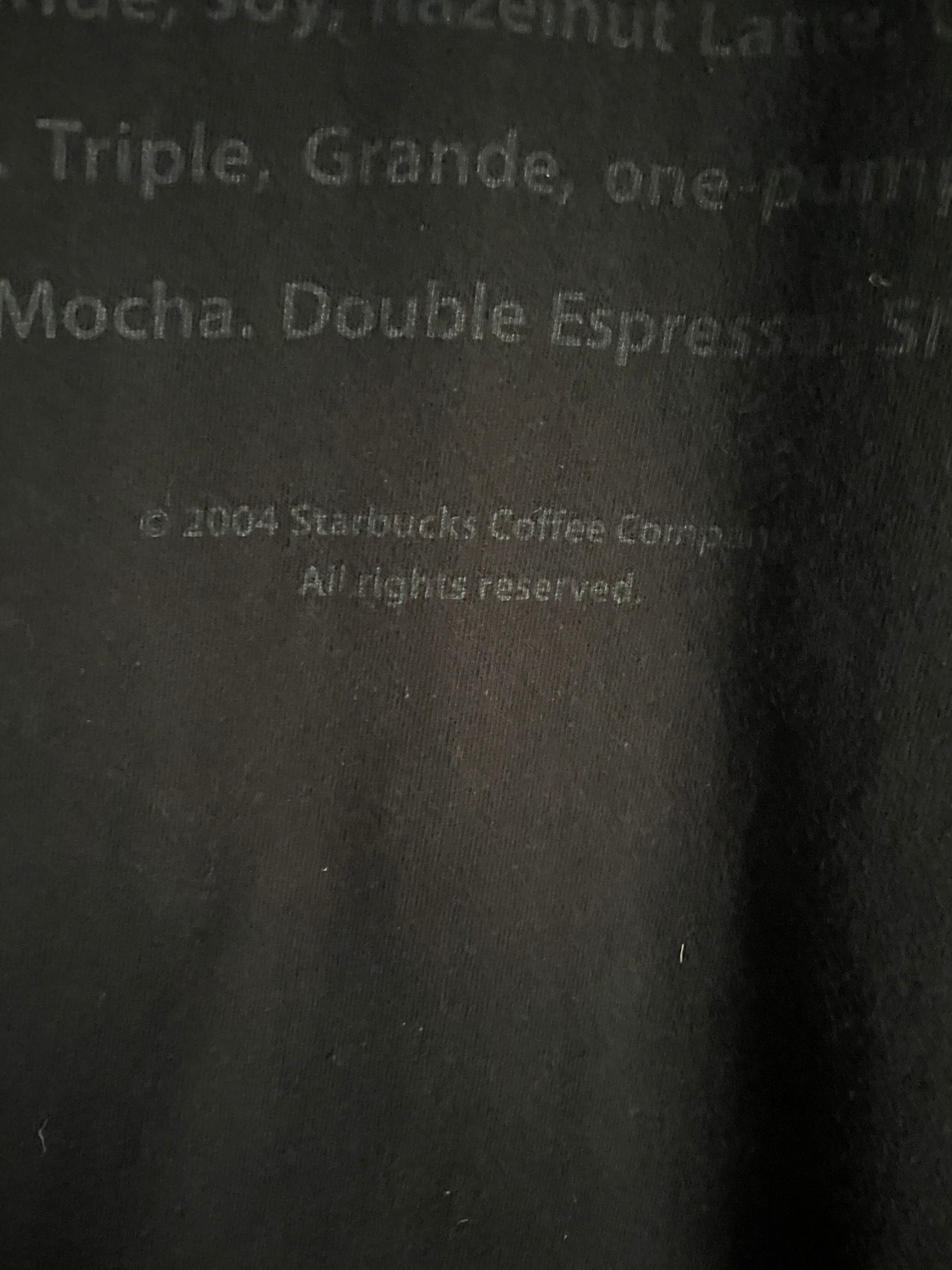 褪せたブラックボディに、スターバックスコーヒーのプリントが両面に施されたTシャツ。前面には”You call it. We'll make it."とコンパクトめな英文プリント。バックにはスターバックスのブランドロゴとコーヒーのメニューがズラッとプリントされています。04年のコピーライト入り。サイズもXLと大きめで、希少アイテム。夏などには一枚で着たいTシャツです。所々に色褪せが見られますが、それも込みで雰囲気ありの一着です。