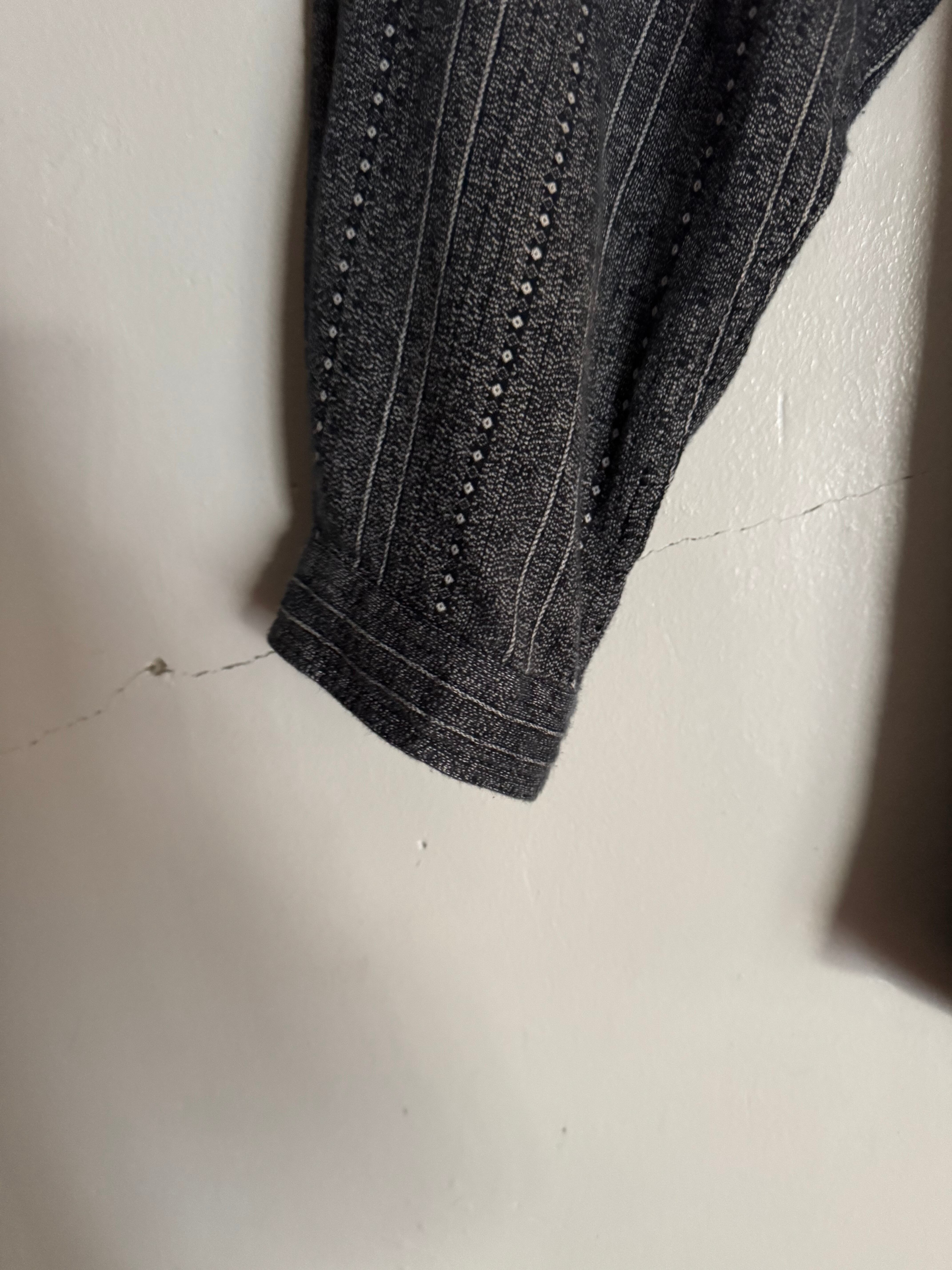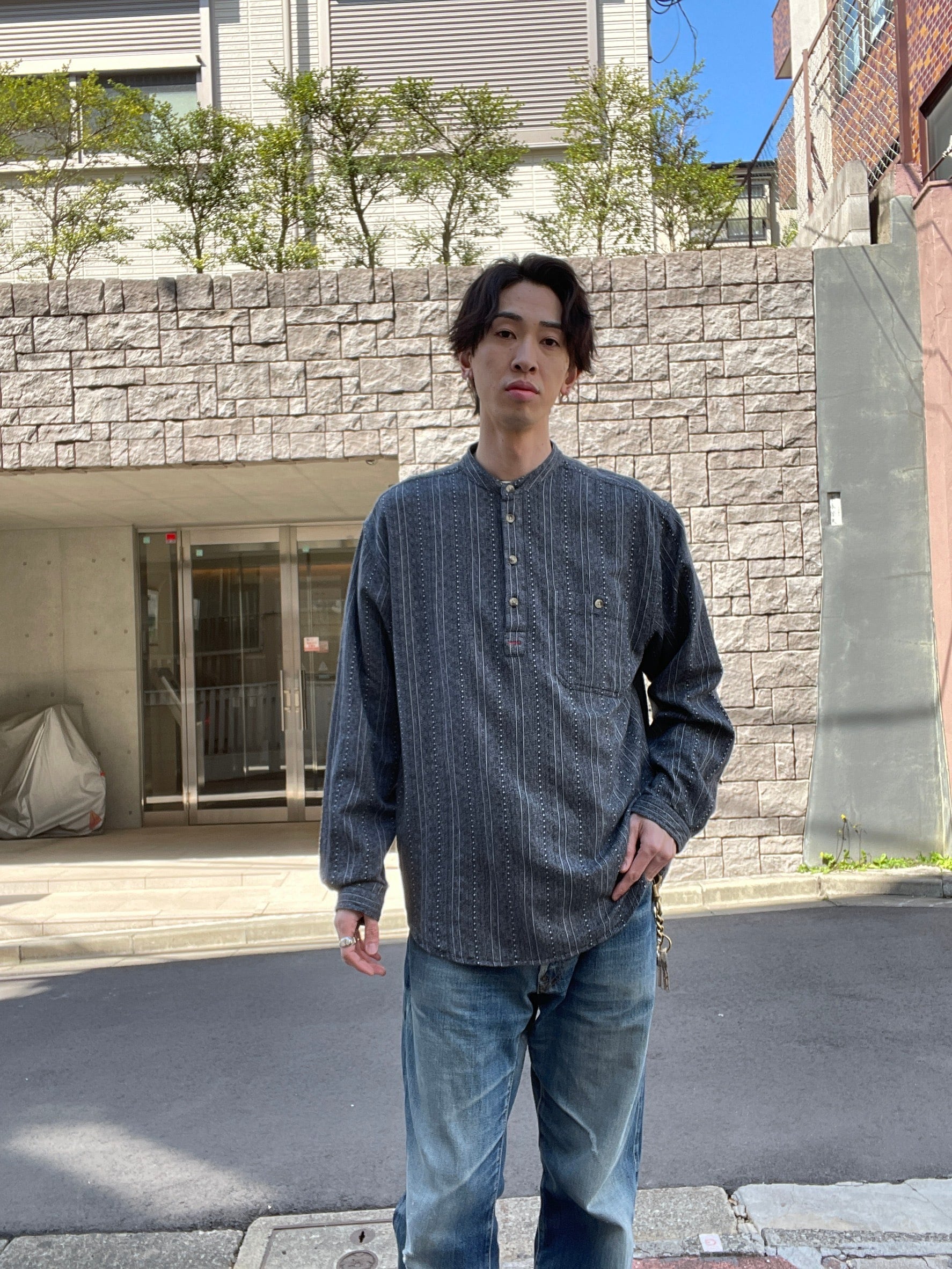落ち着いたチャコールカラーをベースに、細やかなストライプとドット状の織り柄が組み合わさった表情豊かなプルオーバーシャツ。ヘンリーネック仕様のフロントとウッド調ボタンがさりげないアクセントになり、シンプルながらも雰囲気のある一着です。ゆったりとしたシルエットでリラックス感があり、一枚での着用はもちろん、インナー使いとしても活躍。季節を問わず幅広いスタイリングに馴染む万能アイテムです。