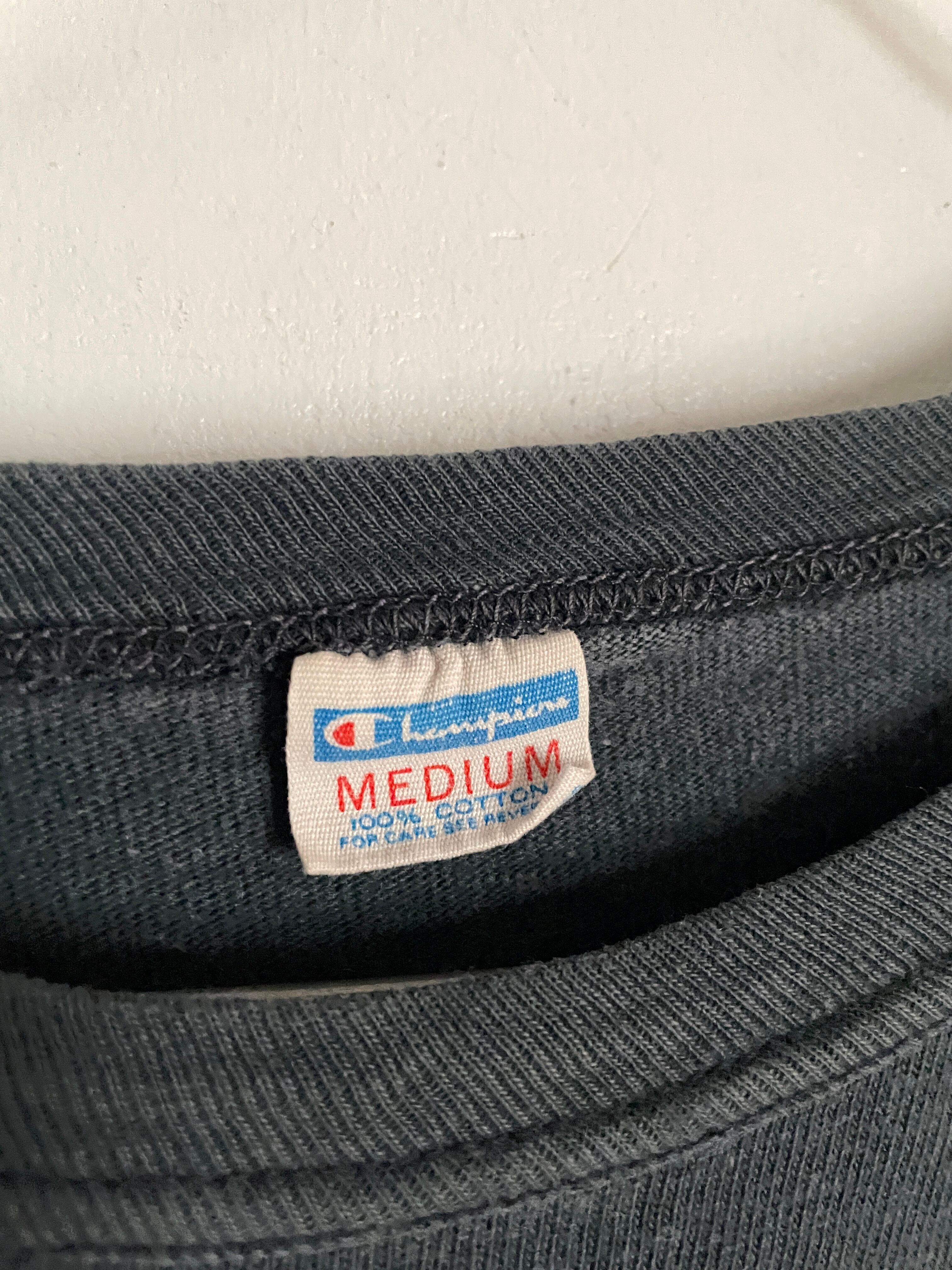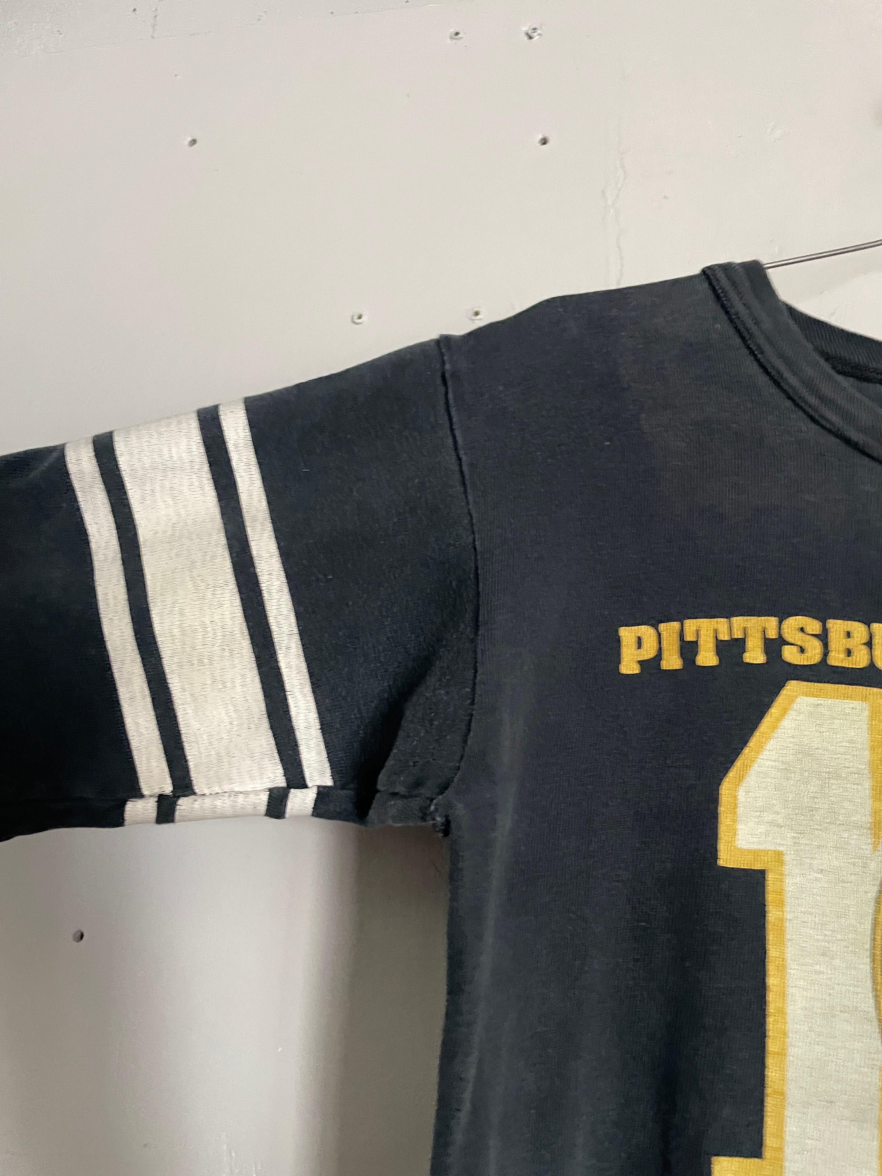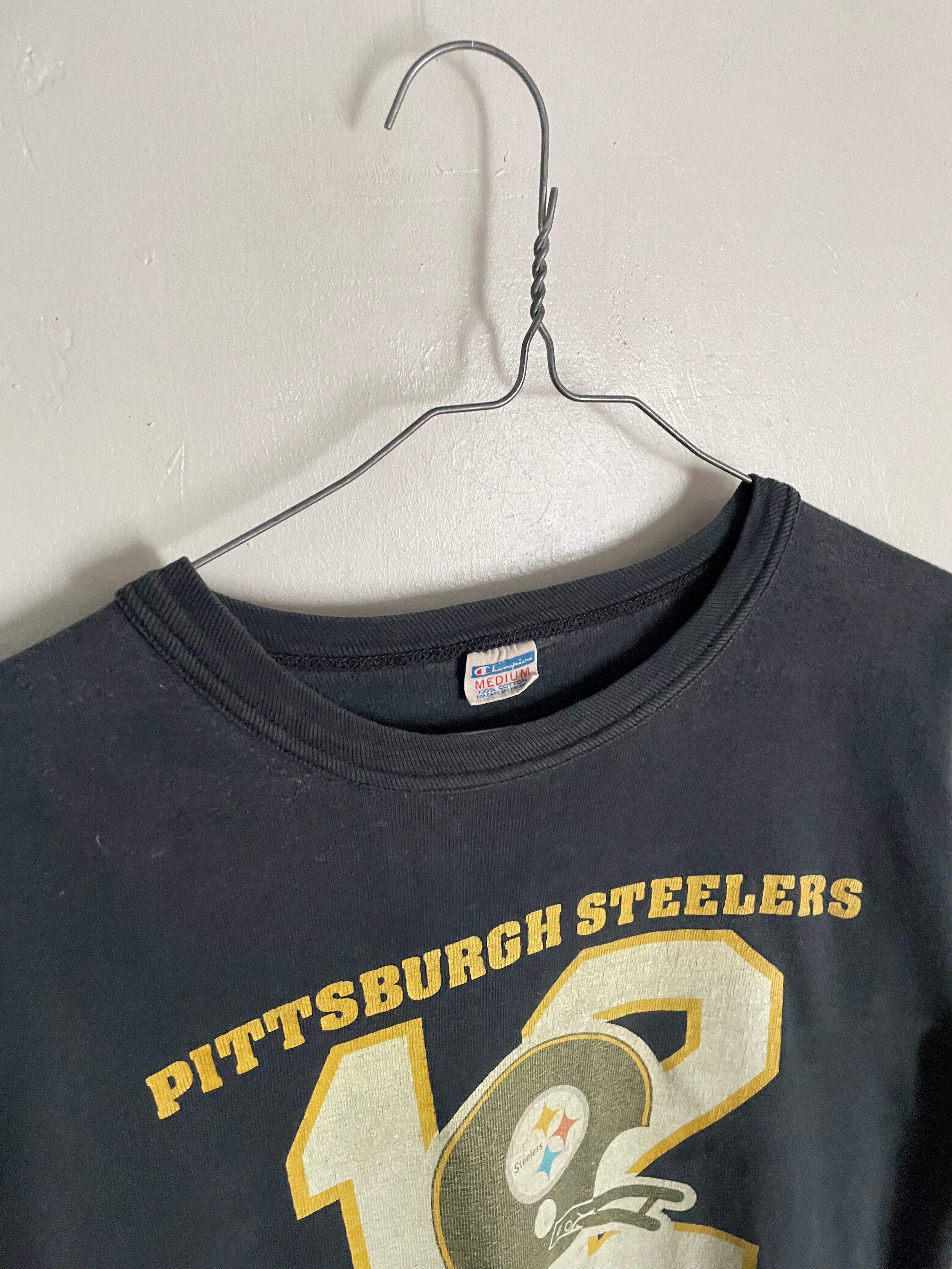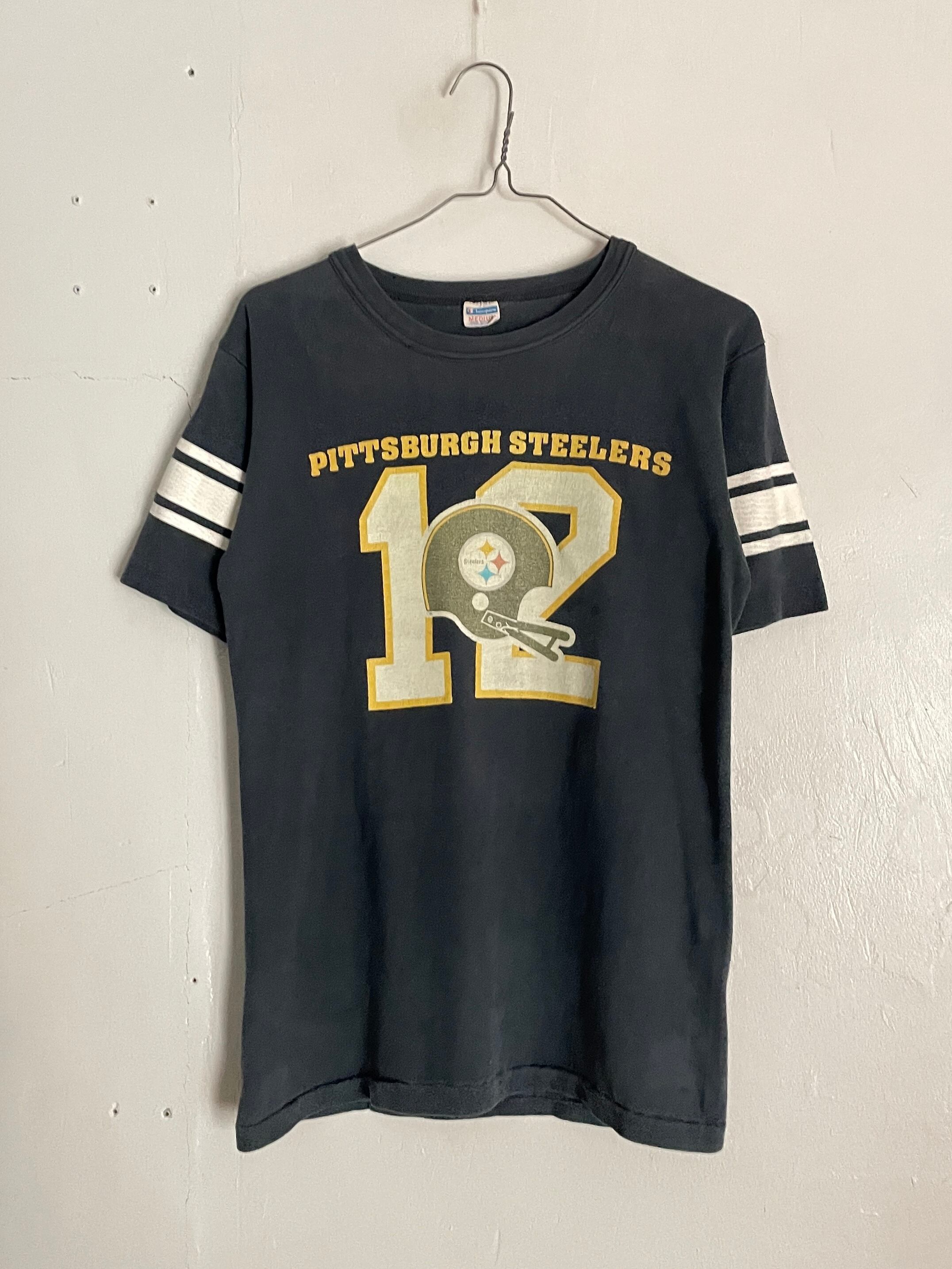 やや褪せたブラックボディに、NFLのピッツバーグ・スティーラーズのプリントが施された、チャンピオンのフットボールTシャツ。ヘルメットのブランドロゴと、背番号12"テリー・ブラッドショー”のプリントが特徴的です。袖には白ラインデザイン。タグを見ると70〜80年代の物だという事がわかります。もちろんUSA製。ややタイトめなシルエットで、夏には一枚で着たい、希少なヴィンテージアイテムです。