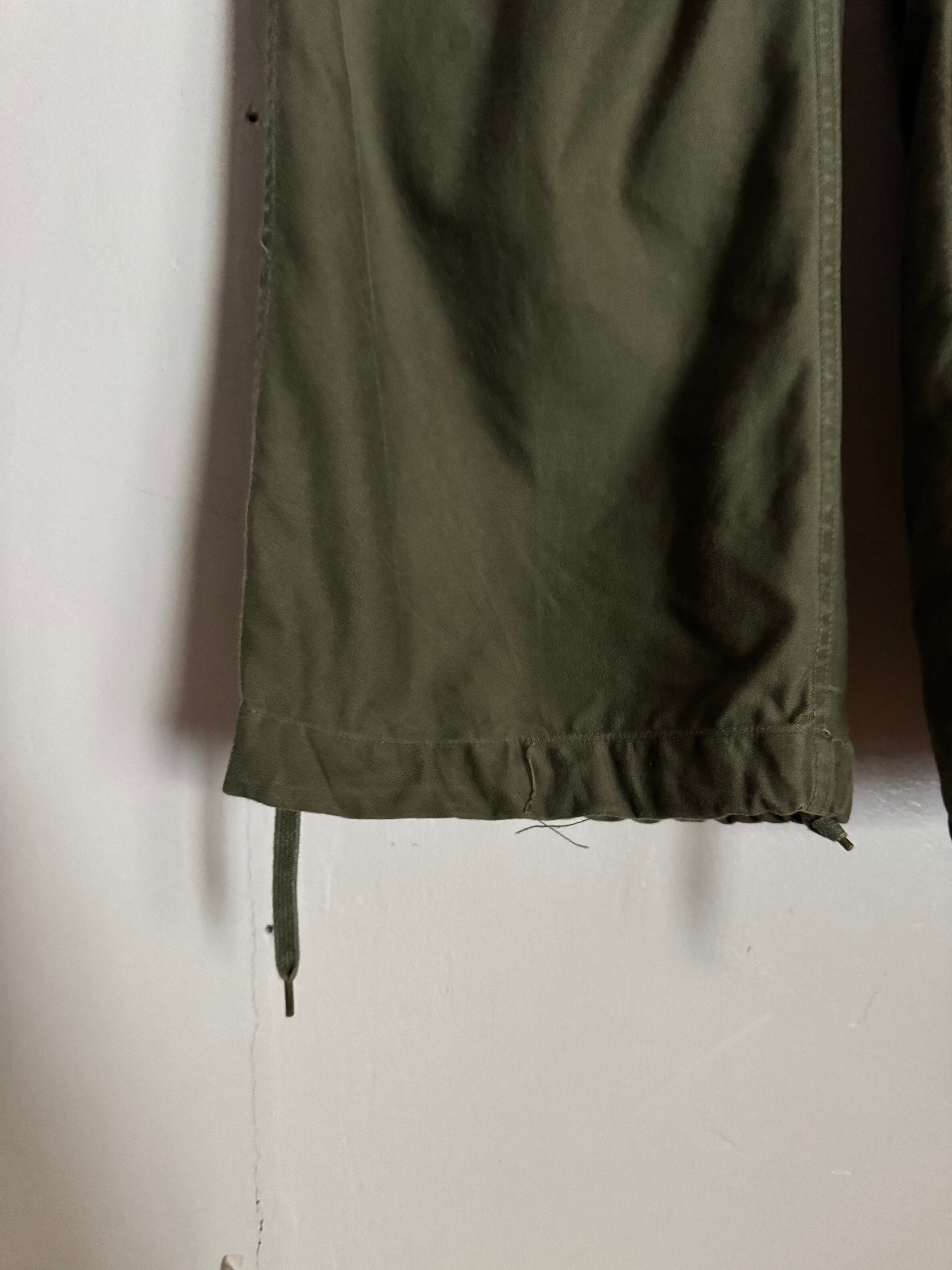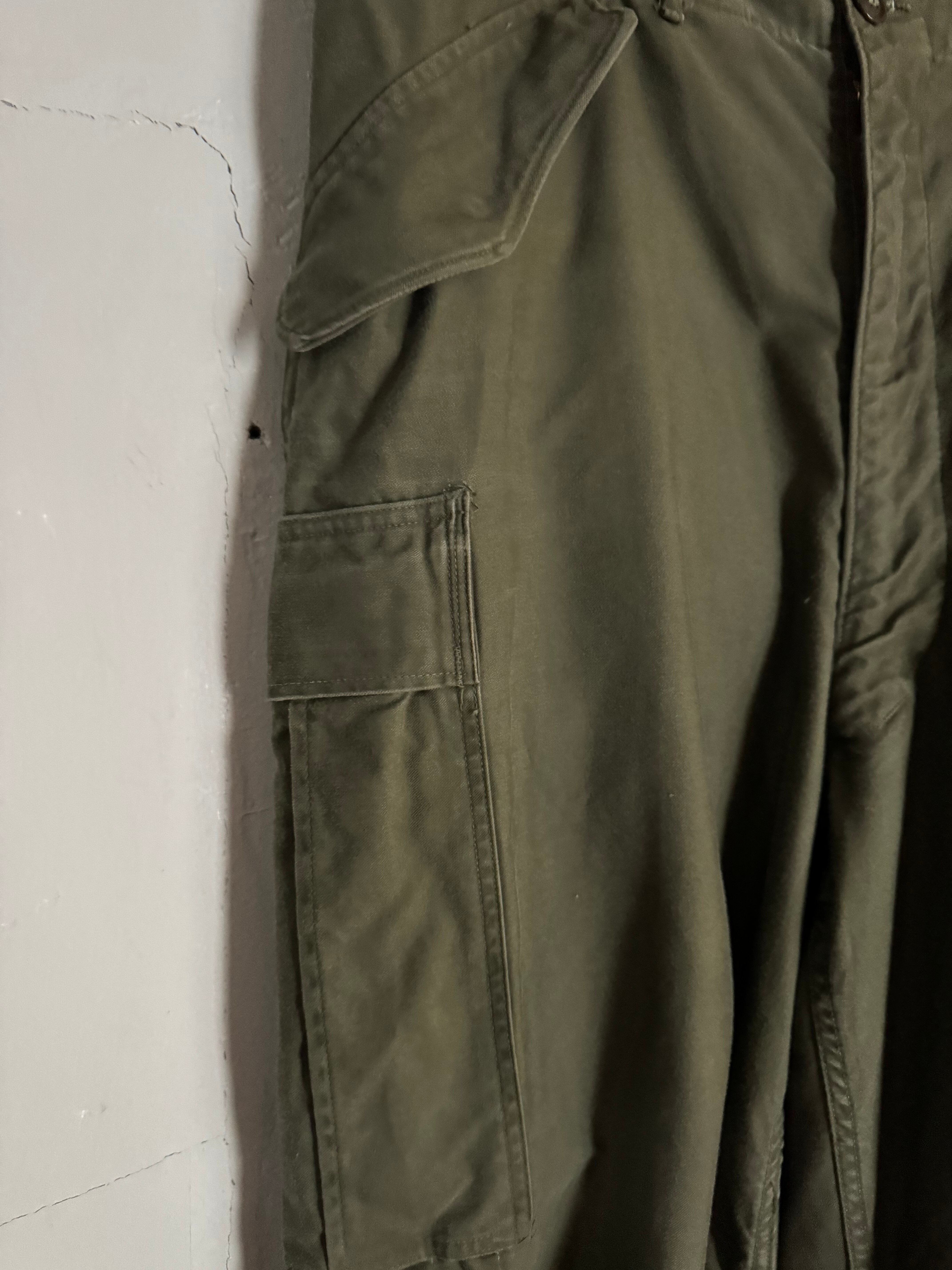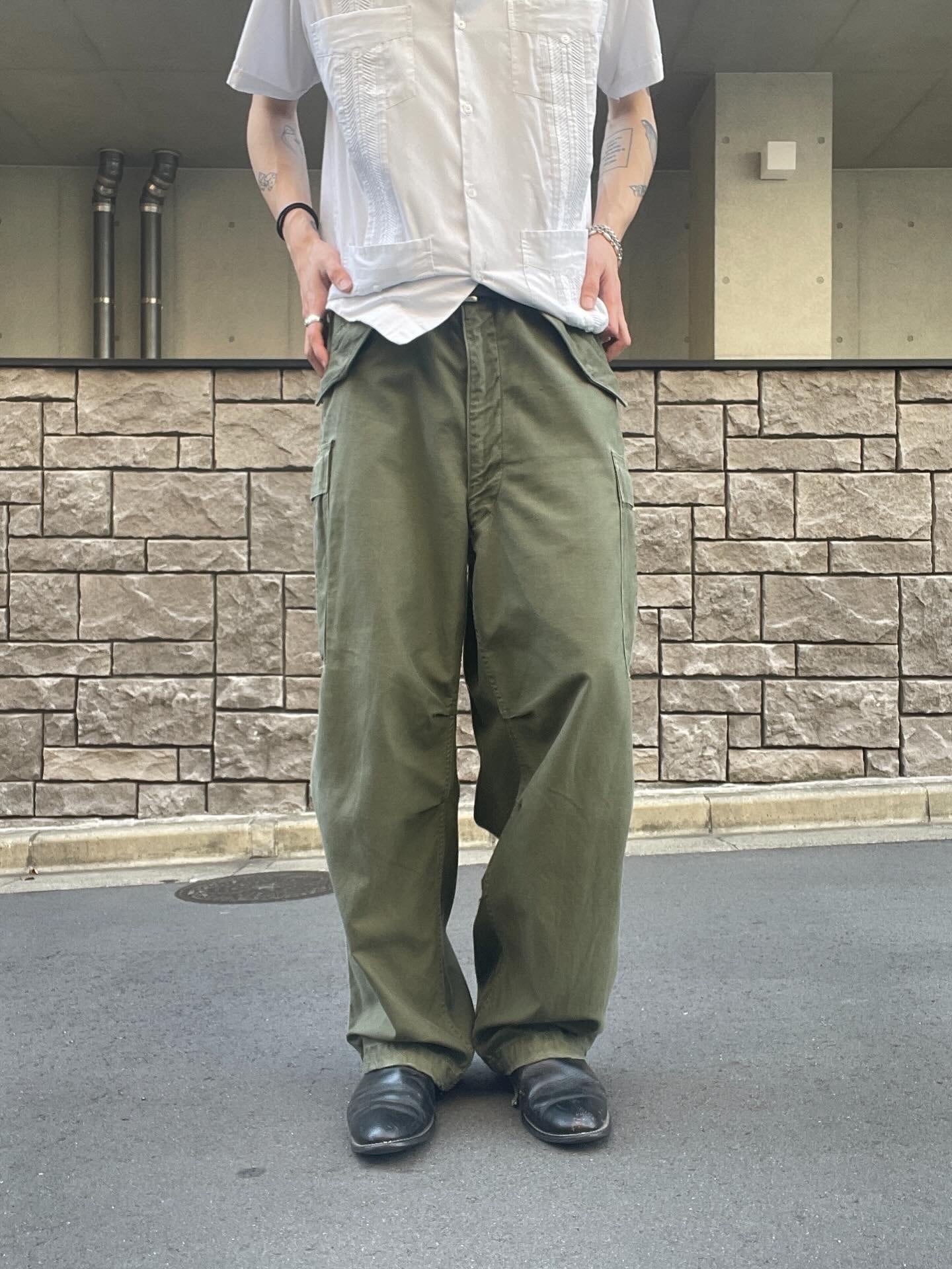 無骨なオリーブカラーと機能的なディテールが魅力の、U.S. Army採用のM-51フィールドカーゴパンツ。内側のスタンプ表記から1950年代初期に支給されていた個体と見られ、朝鮮戦争初期に登場した名作モデルです。カーゴポケットやウエストアジャスター、裾のドローコードなど実戦を想定したディテールが随所に盛り込まれています。ゆったりとしたストレートシルエットは現代のスタイリングにも落とし込みやすく、無骨ながら洗練された雰囲気を演出できる一着です。