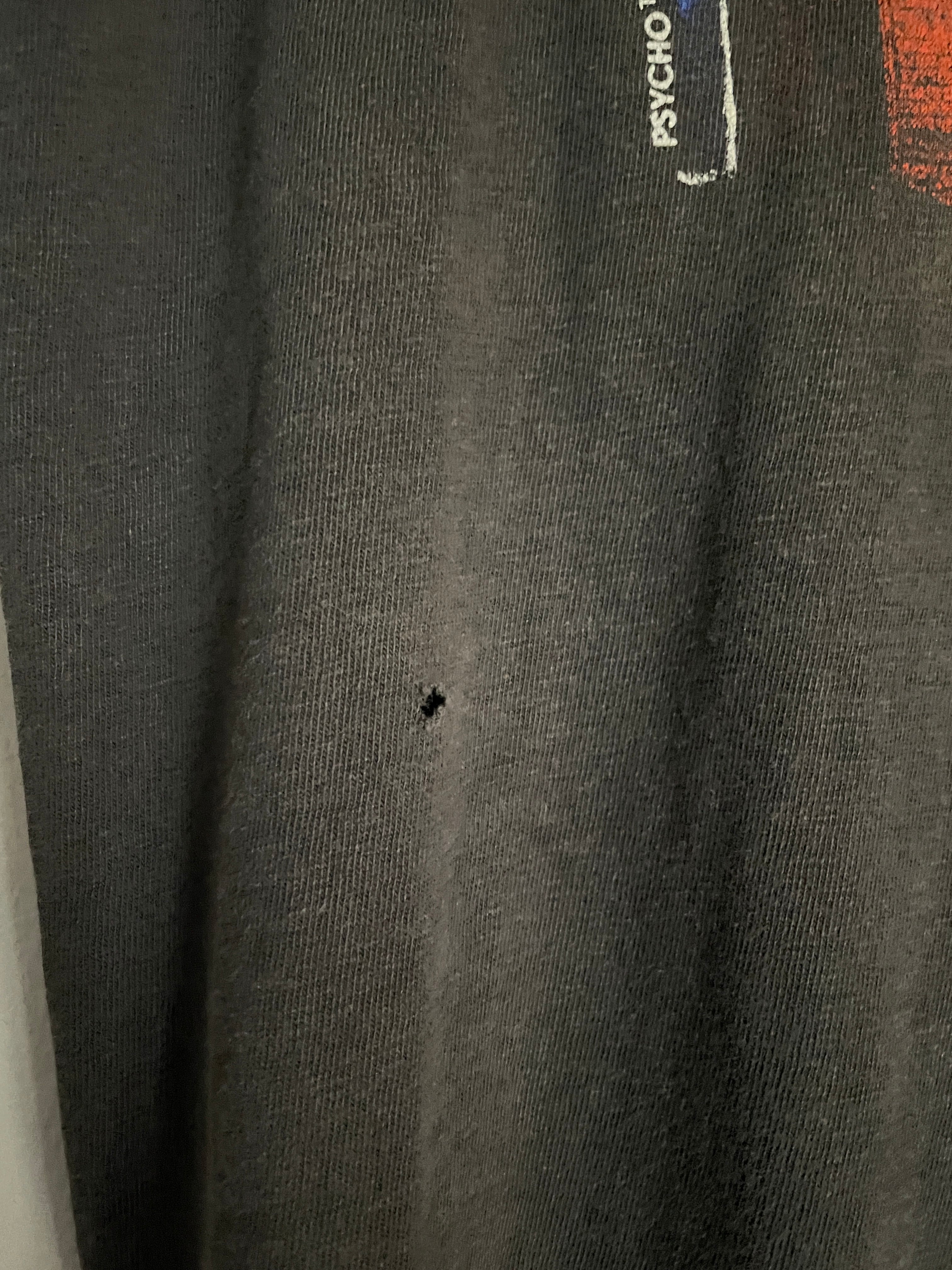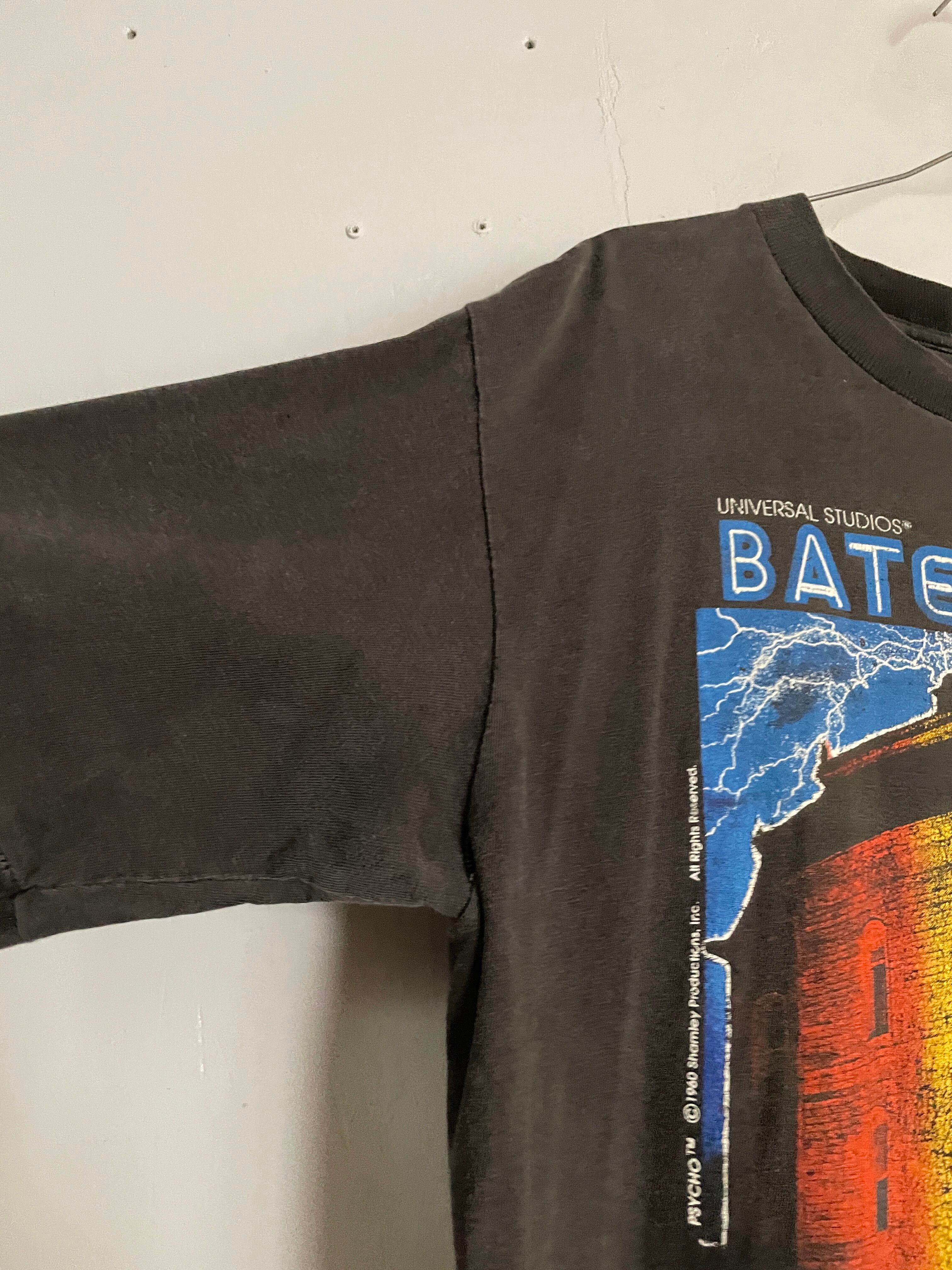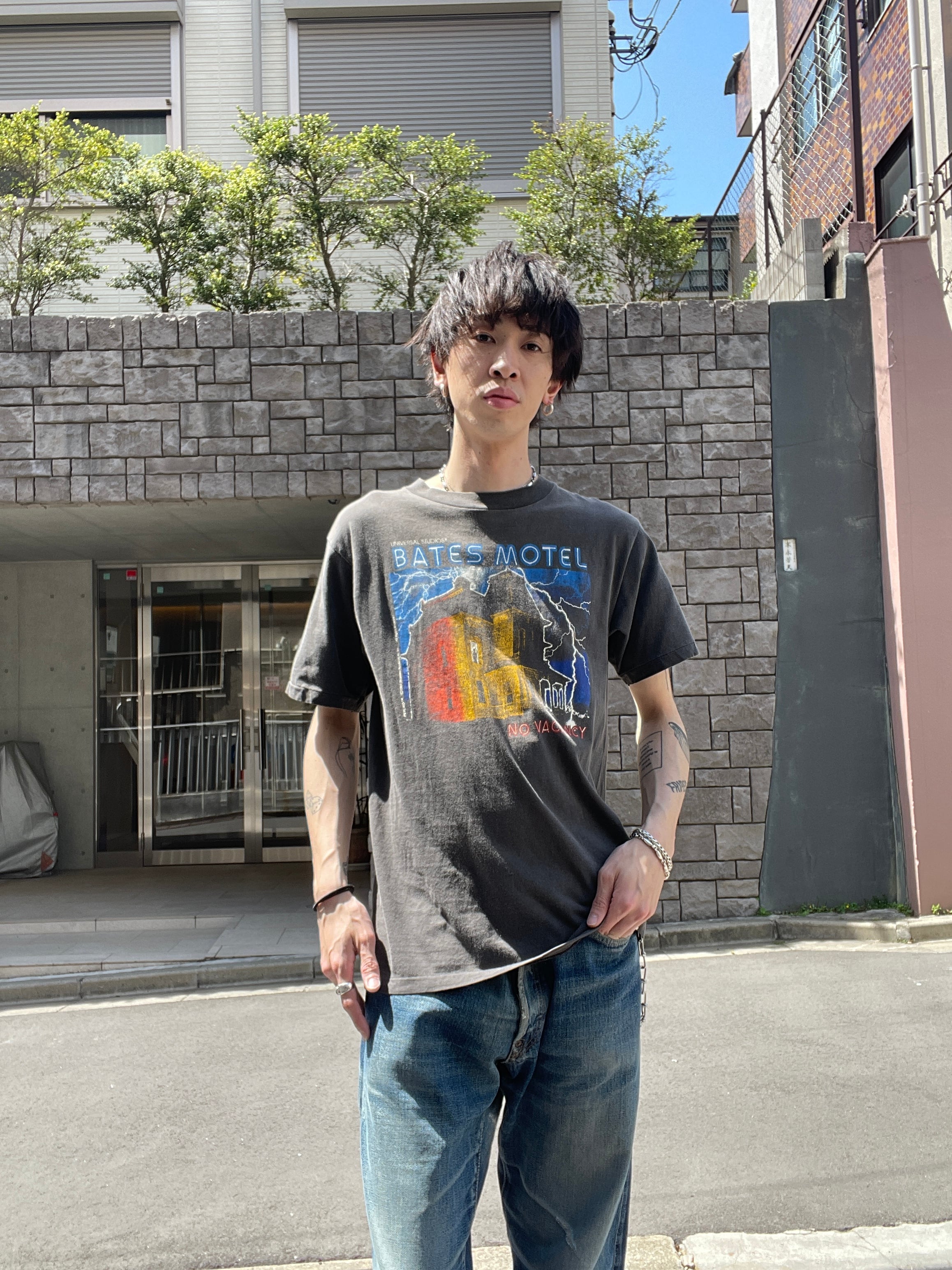 フェードしたブラックボディで、映画”Psycho"の登場するモーテルをモチーフにした、”ユニバーサル・スタジオオフィシャルデザインのプリントTシャツ。フロントには”BATES MOTEL"の建物と稲妻が走るインパクトあるグラフィックが配され、ホラー映画らしい雰囲気抜群の一着です。ヴィンテージライクな雰囲気が感じられて、1枚ではもちろん、ジャケットやシャツのインナーとしてもスタイリングのアクセントになってくれます。USA製なのも魅力的です。