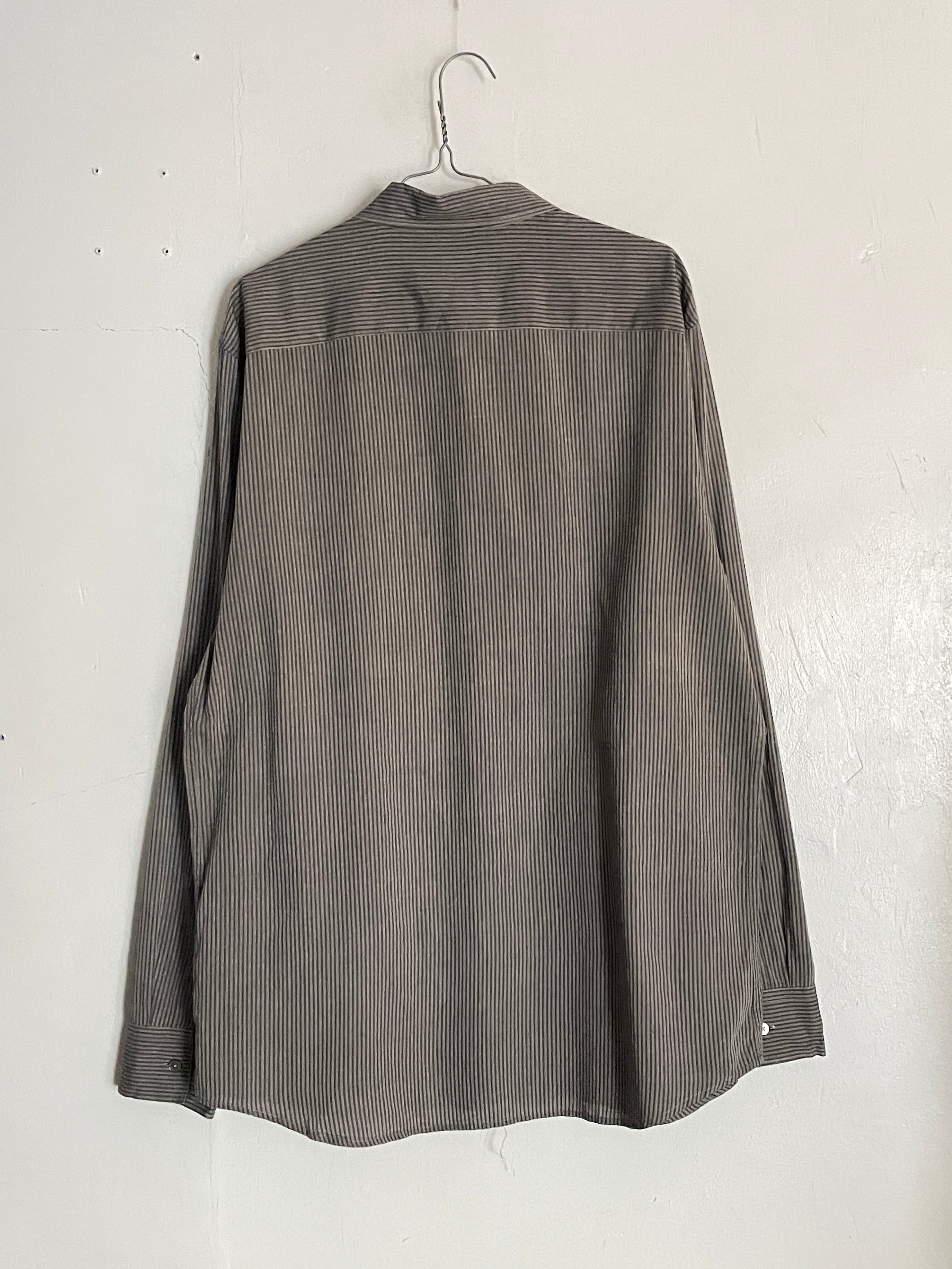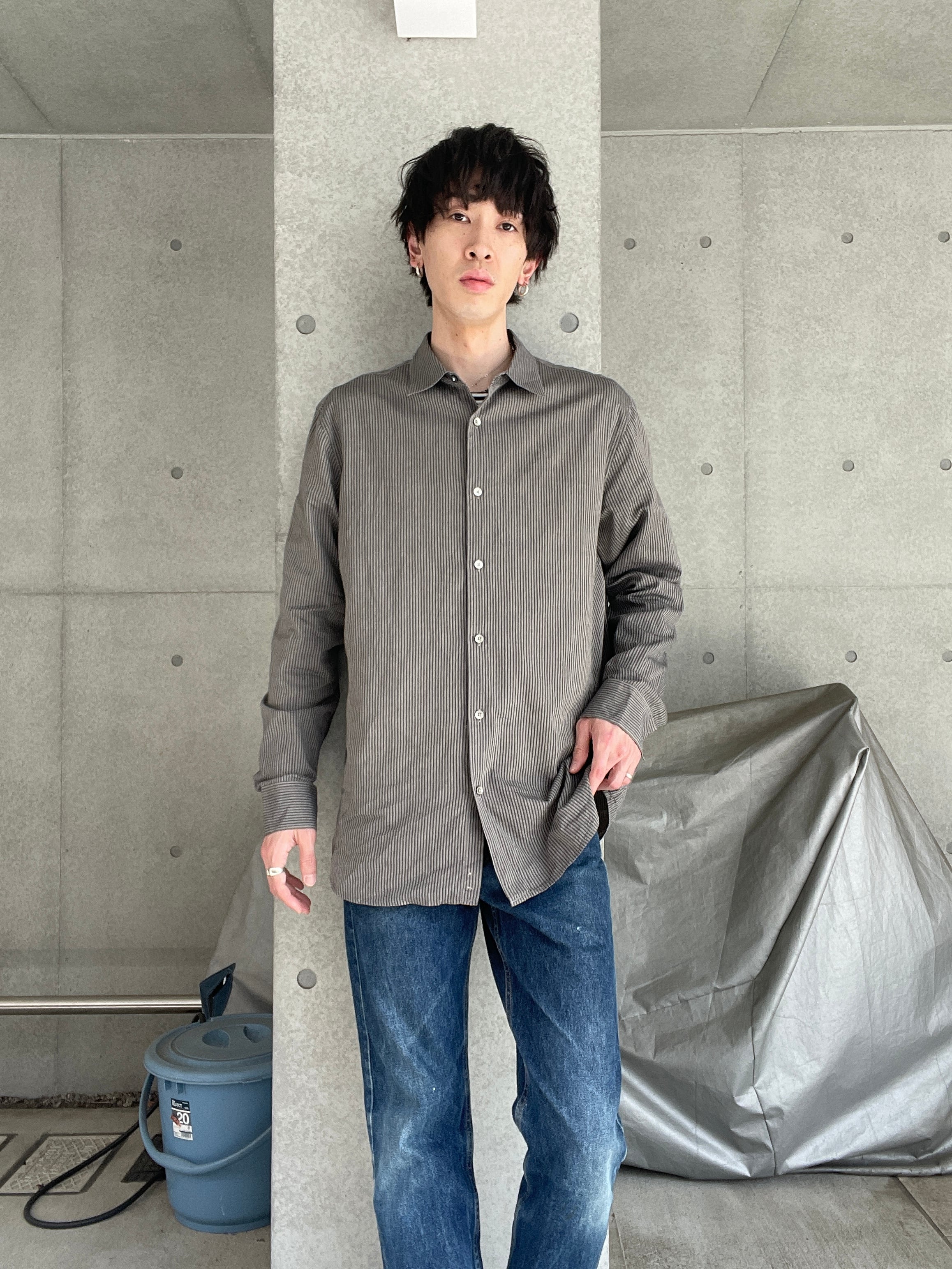 グレーボディに、ブラウン調のストライプが施された、カルバンクラインのシャツ。サラッとしたやや透け感のある質感。コットンとキュプラ素材で肌触り抜群です。ゆったりとしたサイズ感で、今の時期にはラフに着られそうです。綺麗めにもカジュアルにも落とし込めるシャツです。