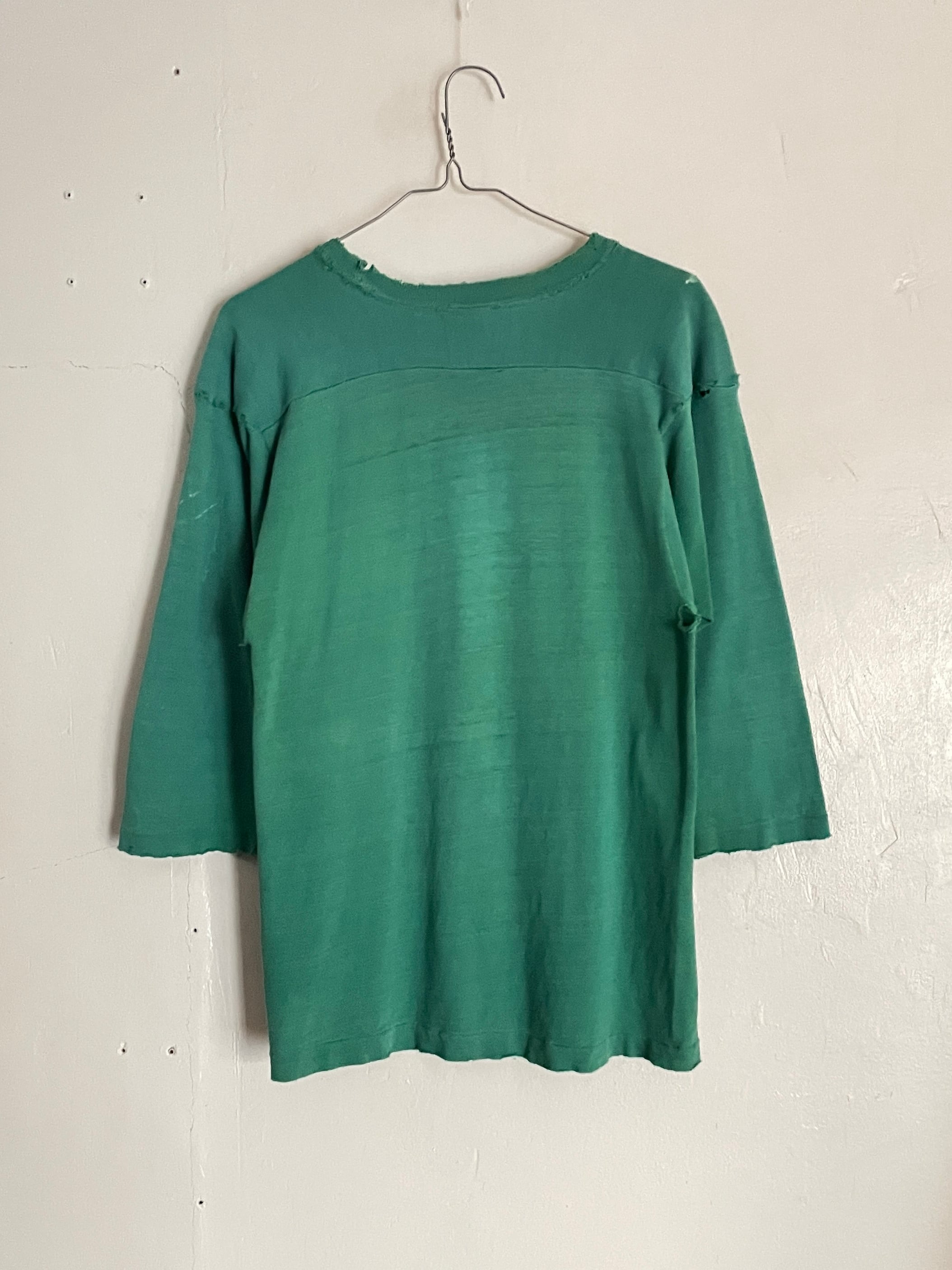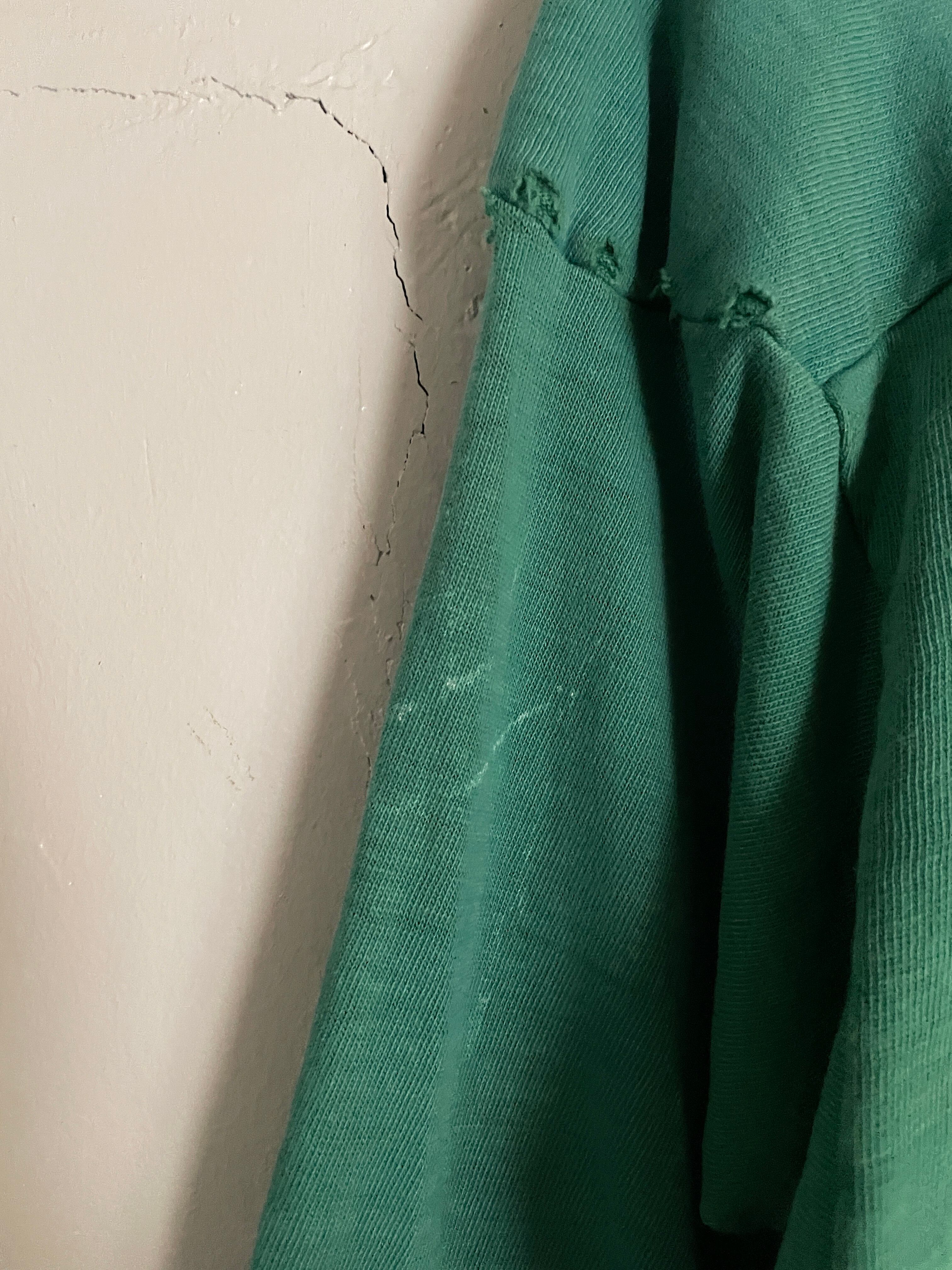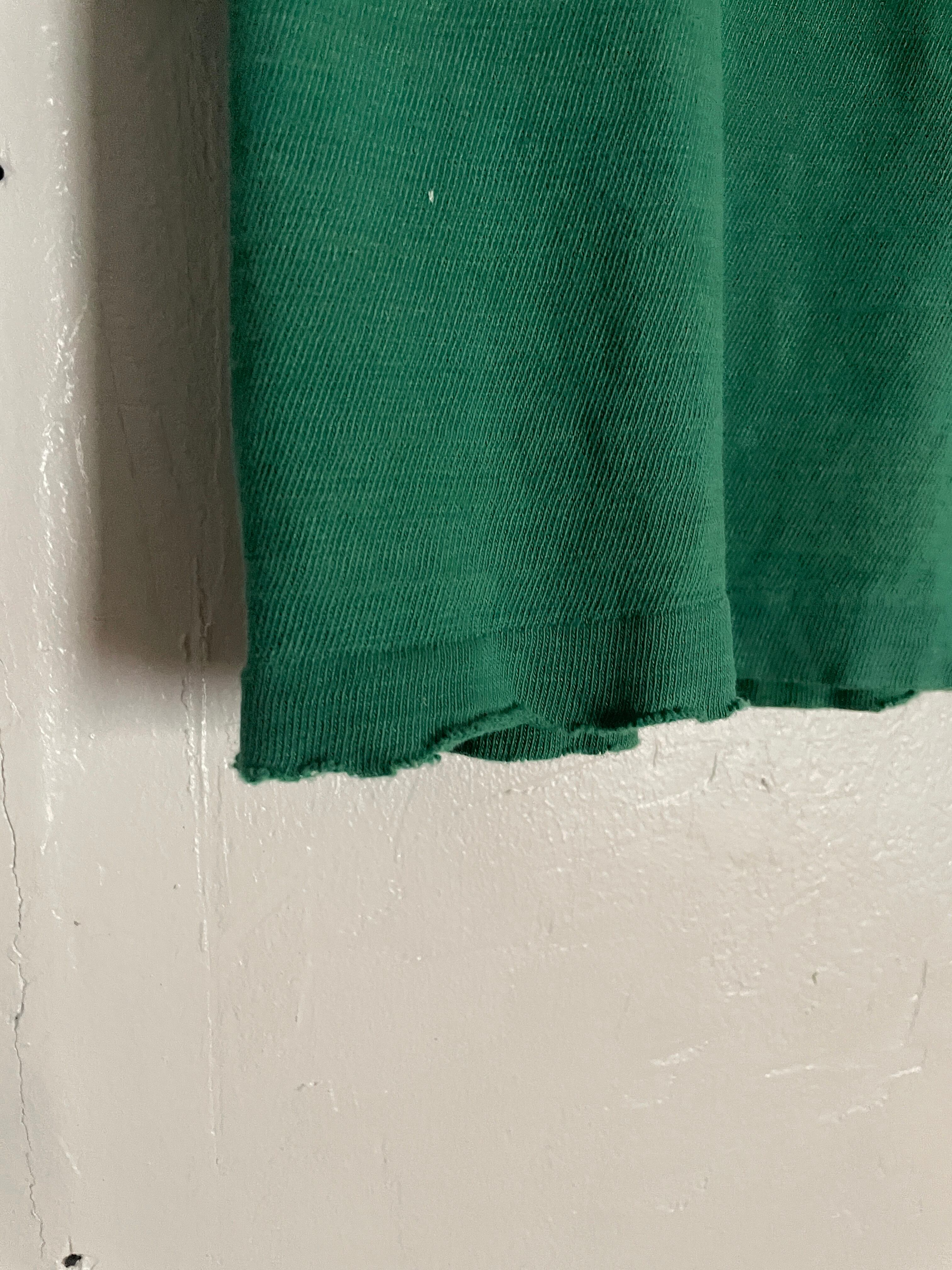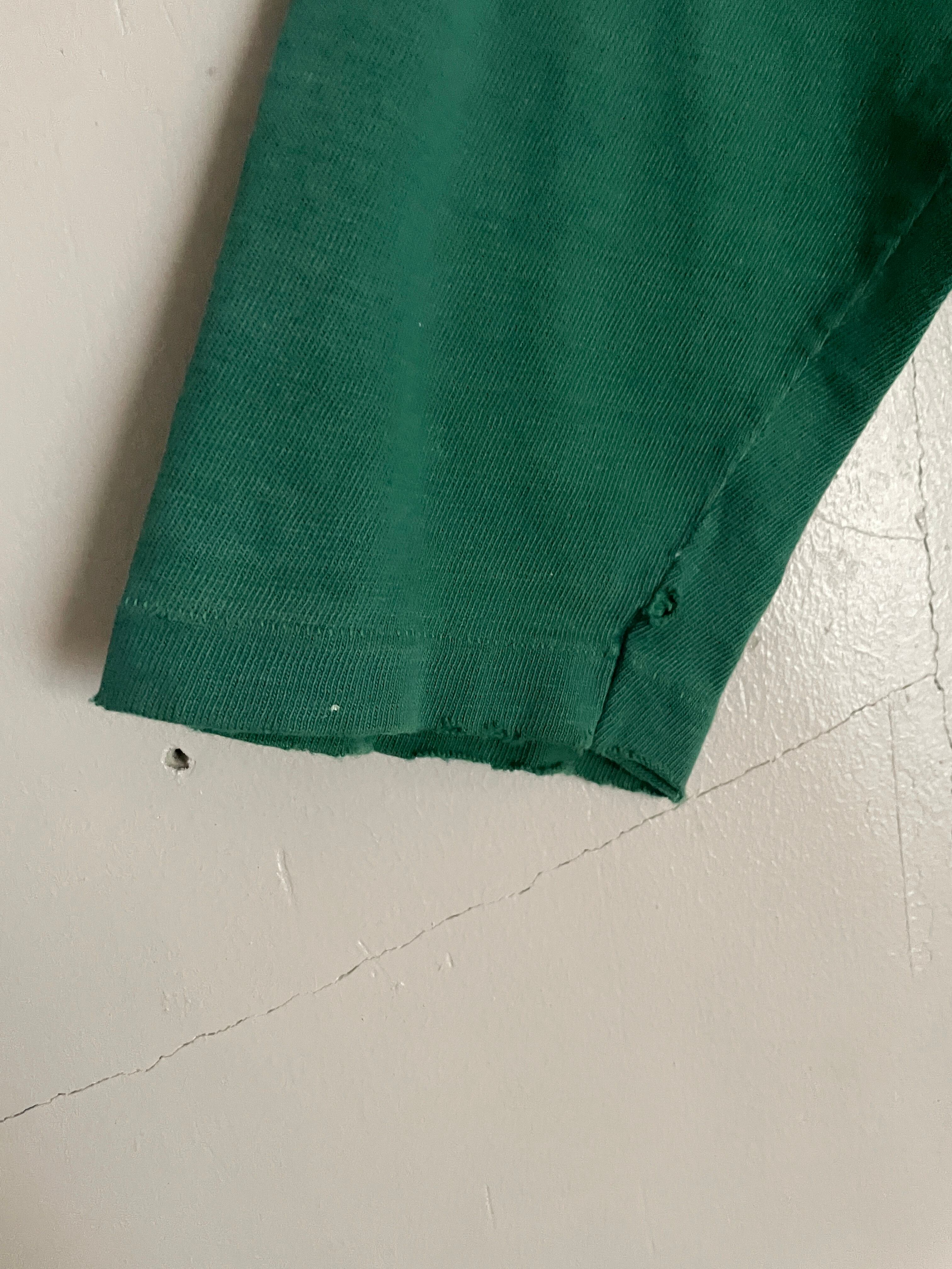 フェードした鮮やかなグリーンボディで、胸元に”POPE VALLEY CALIFORNIA"のワンポイントプリントが施された、チャンピオンのフットボールTシャツ。通称バータグの70年代頃のアイテムです。7部袖のフットボールT特有の切り替えデザインに、全体的なフェード感がヴィンテージらしい表情を演出。グリーンボディの色褪せやボロ感が相まって、当時ならではの味わいが感じられます。ピタッとしたタイトめなシルエットですが、伸縮性の良いコットン素材なので、男女問わずおすすめできるアイテムです。