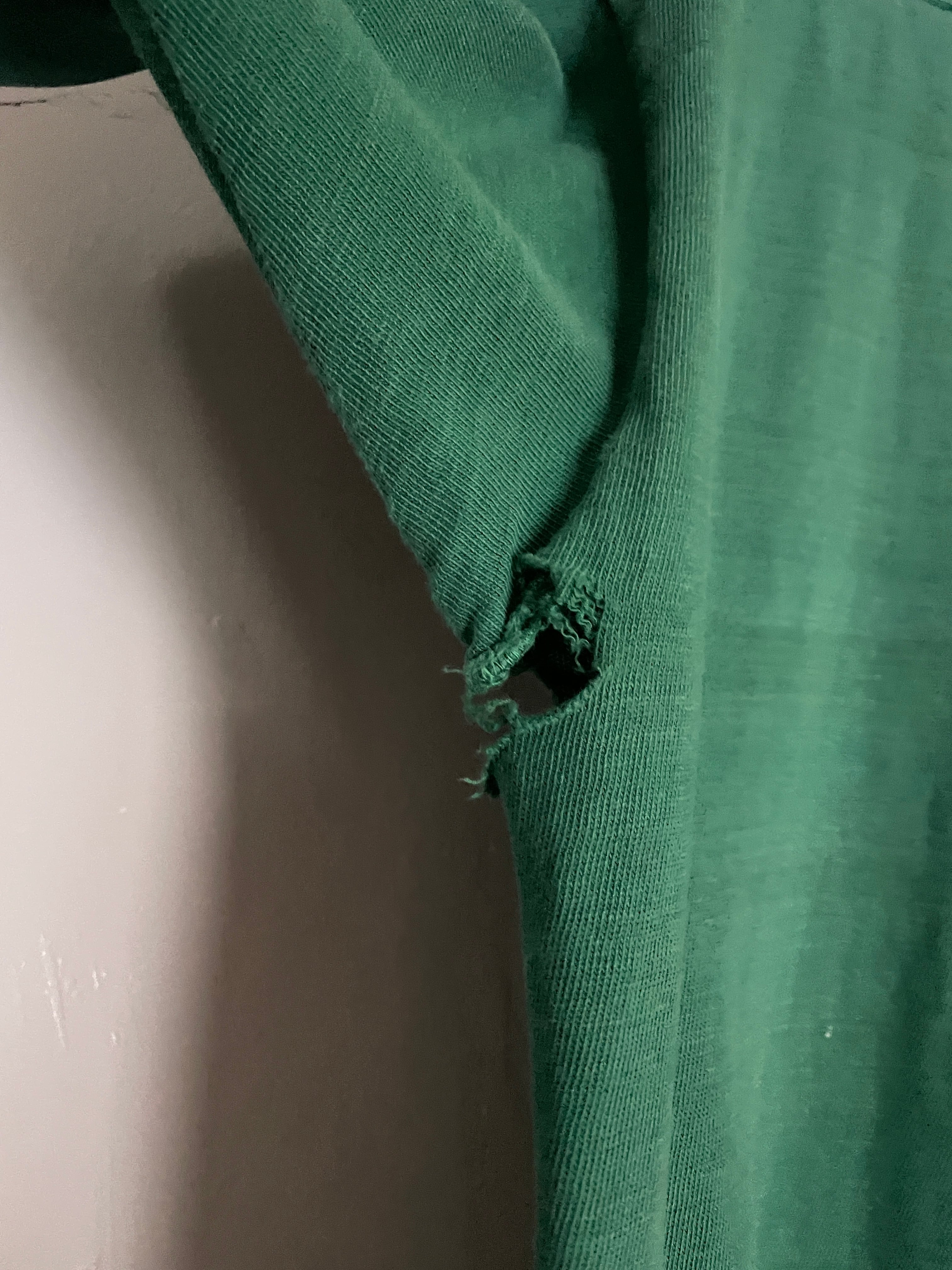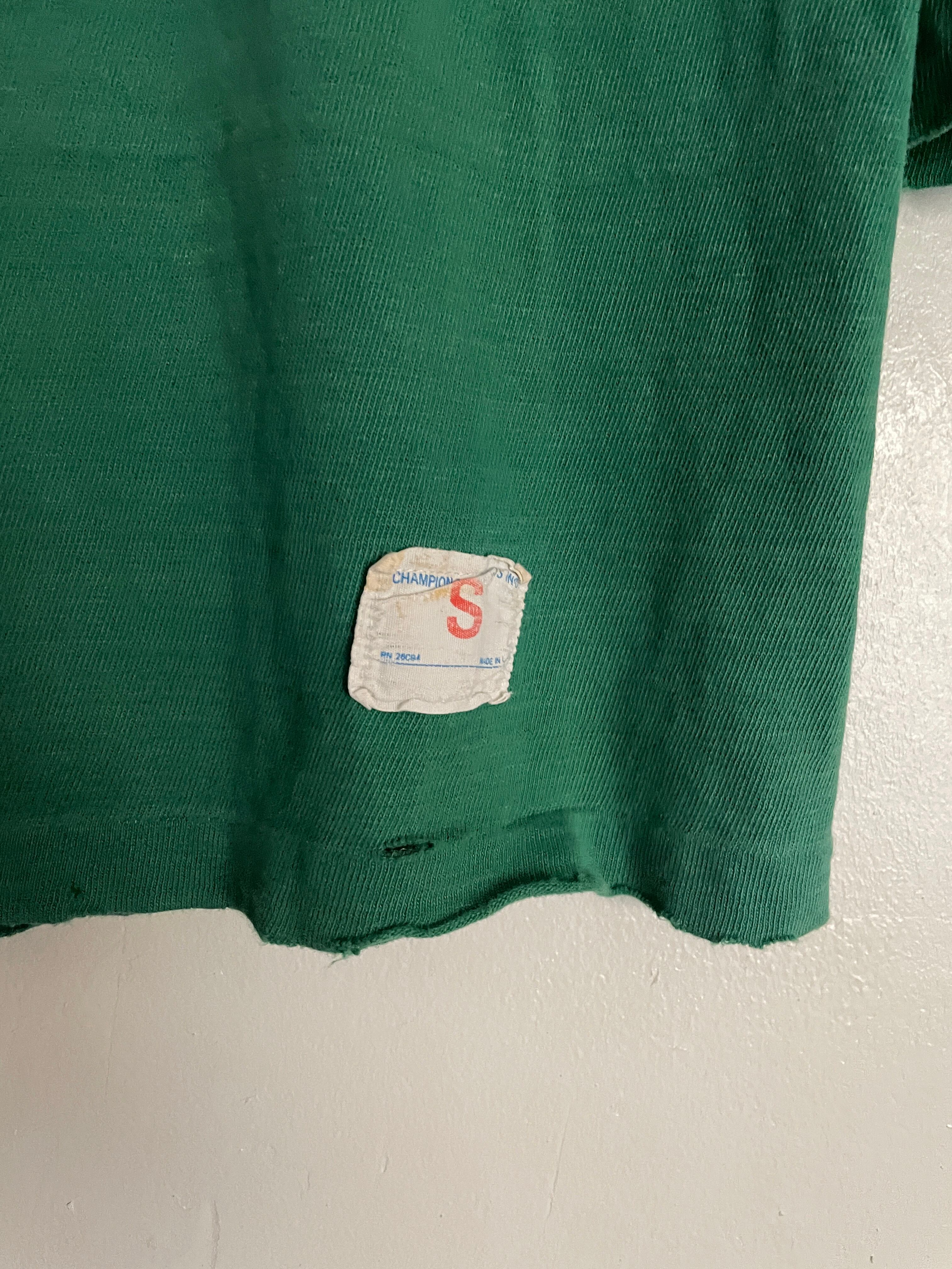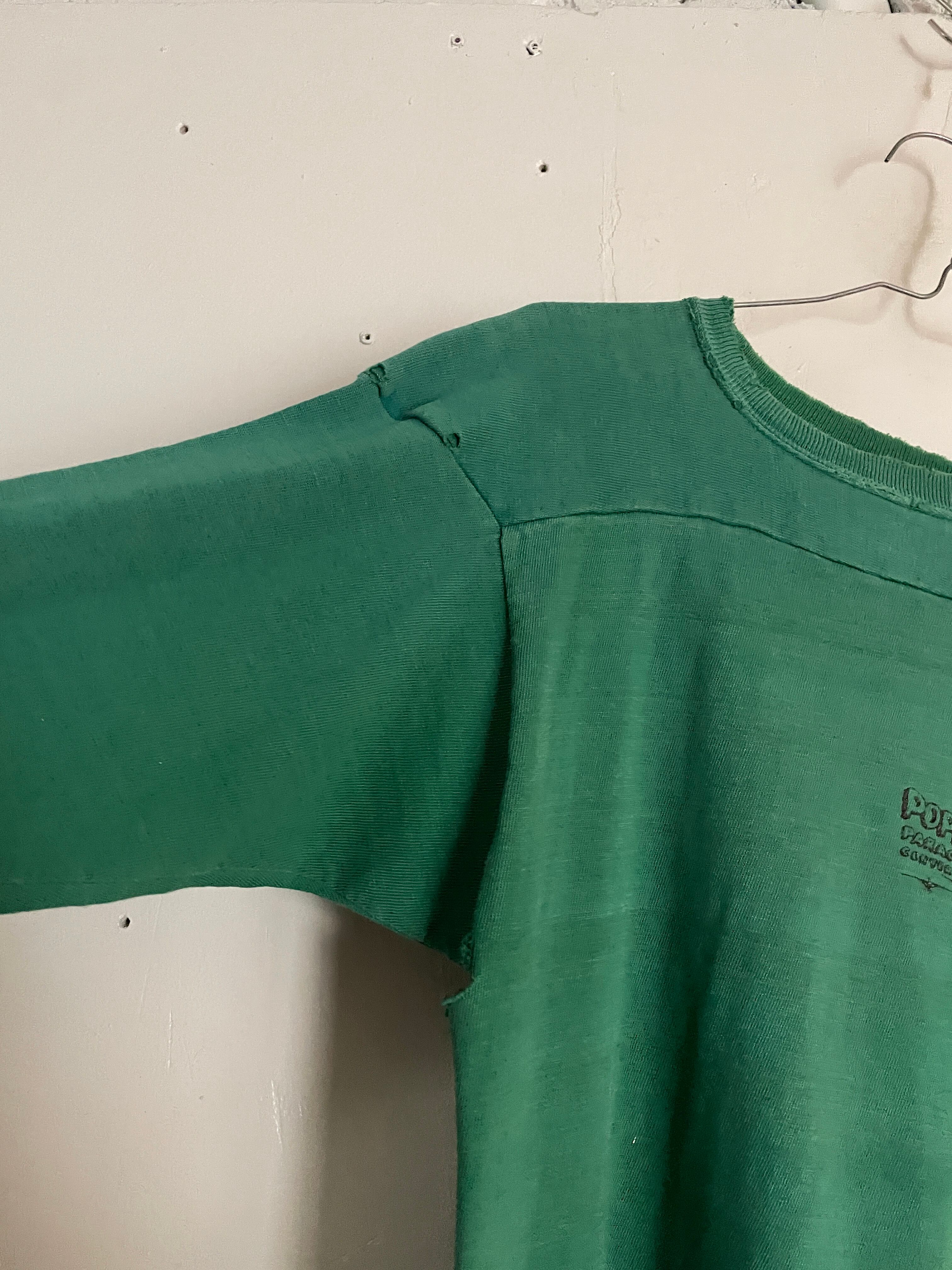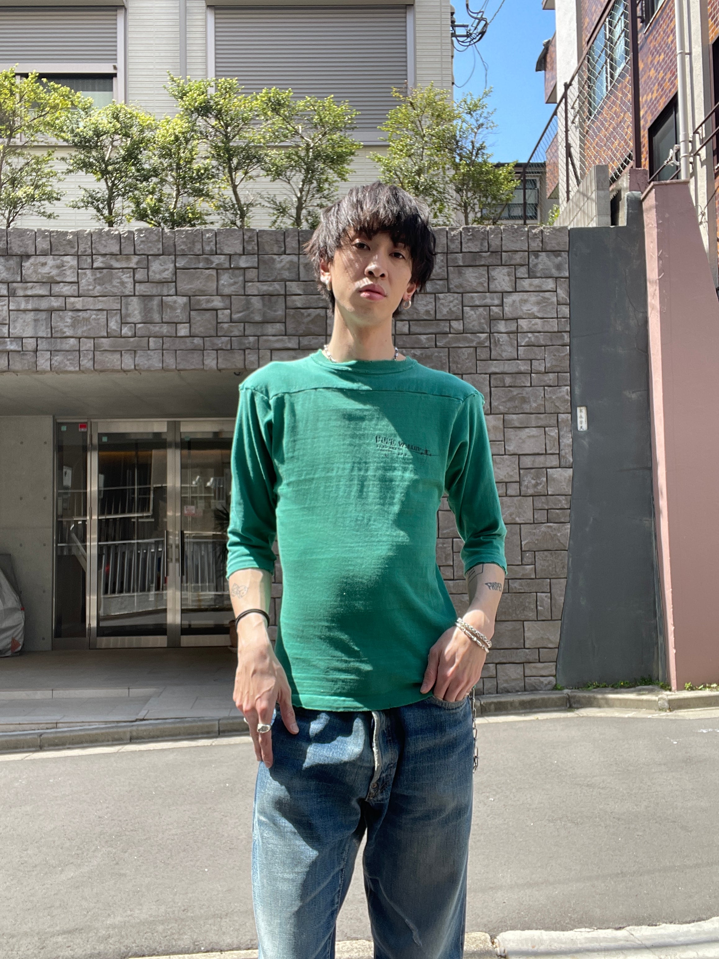 フェードした鮮やかなグリーンボディで、胸元に”POPE VALLEY CALIFORNIA"のワンポイントプリントが施された、チャンピオンのフットボールTシャツ。通称バータグの70年代頃のアイテムです。7部袖のフットボールT特有の切り替えデザインに、全体的なフェード感がヴィンテージらしい表情を演出。グリーンボディの色褪せやボロ感が相まって、当時ならではの味わいが感じられます。ピタッとしたタイトめなシルエットですが、伸縮性の良いコットン素材なので、男女問わずおすすめできるアイテムです。