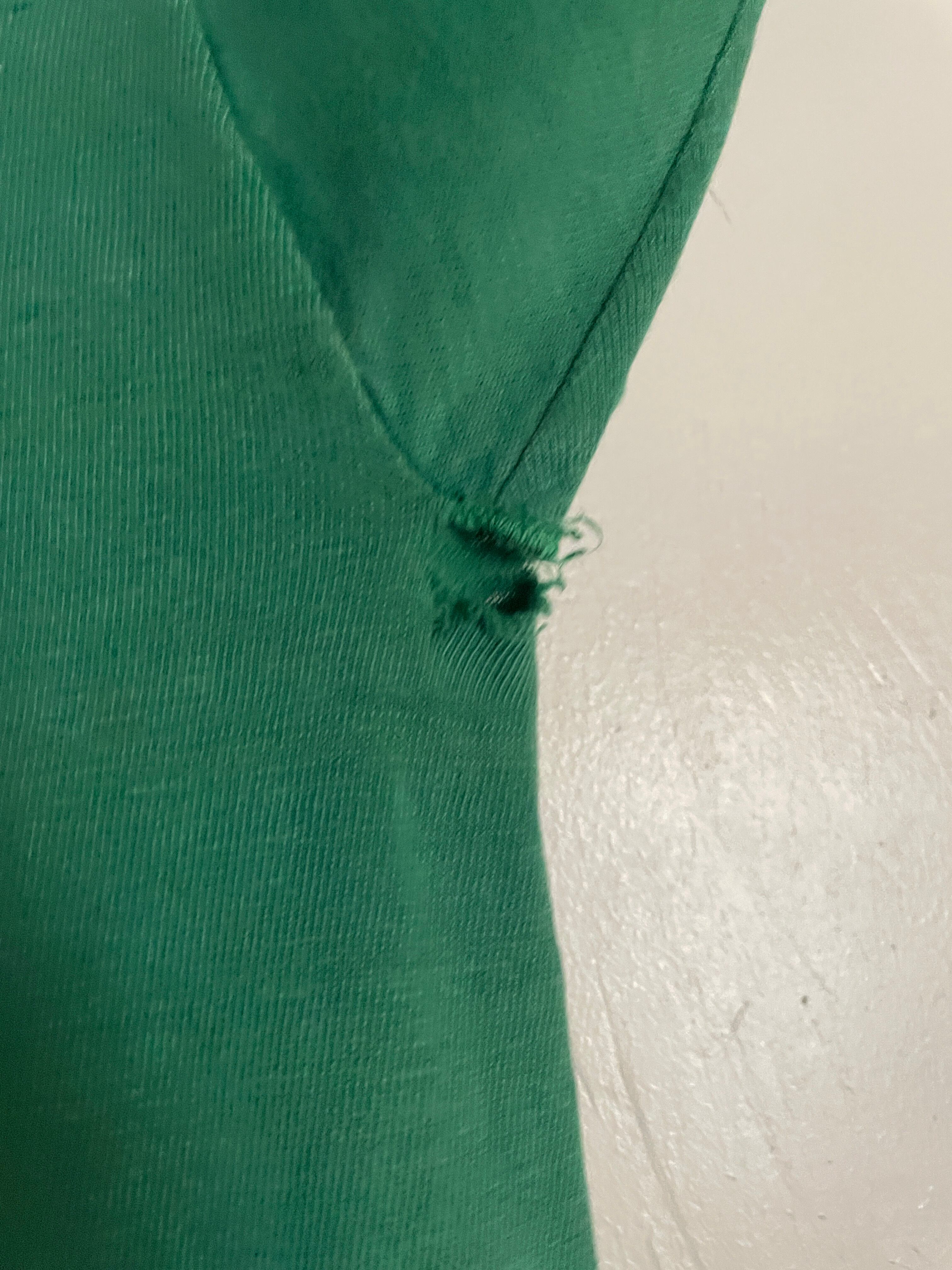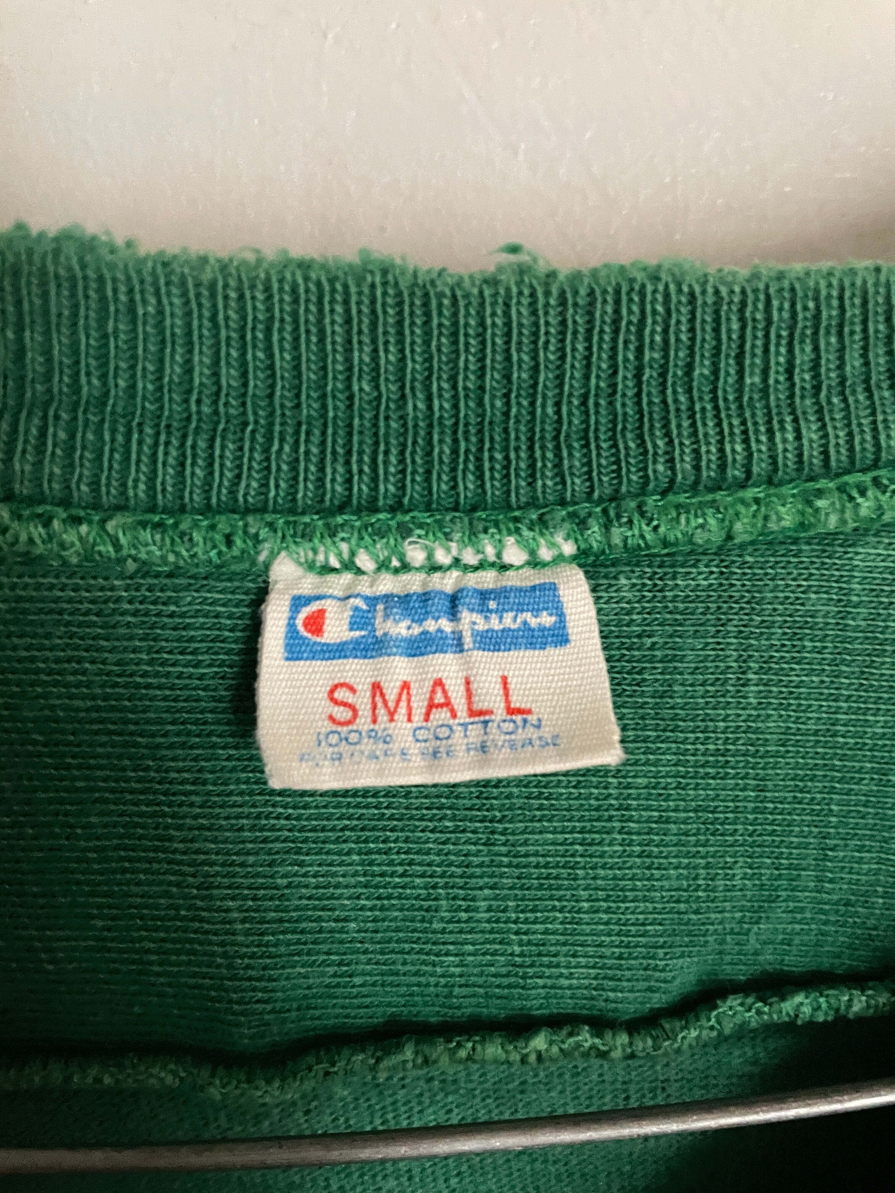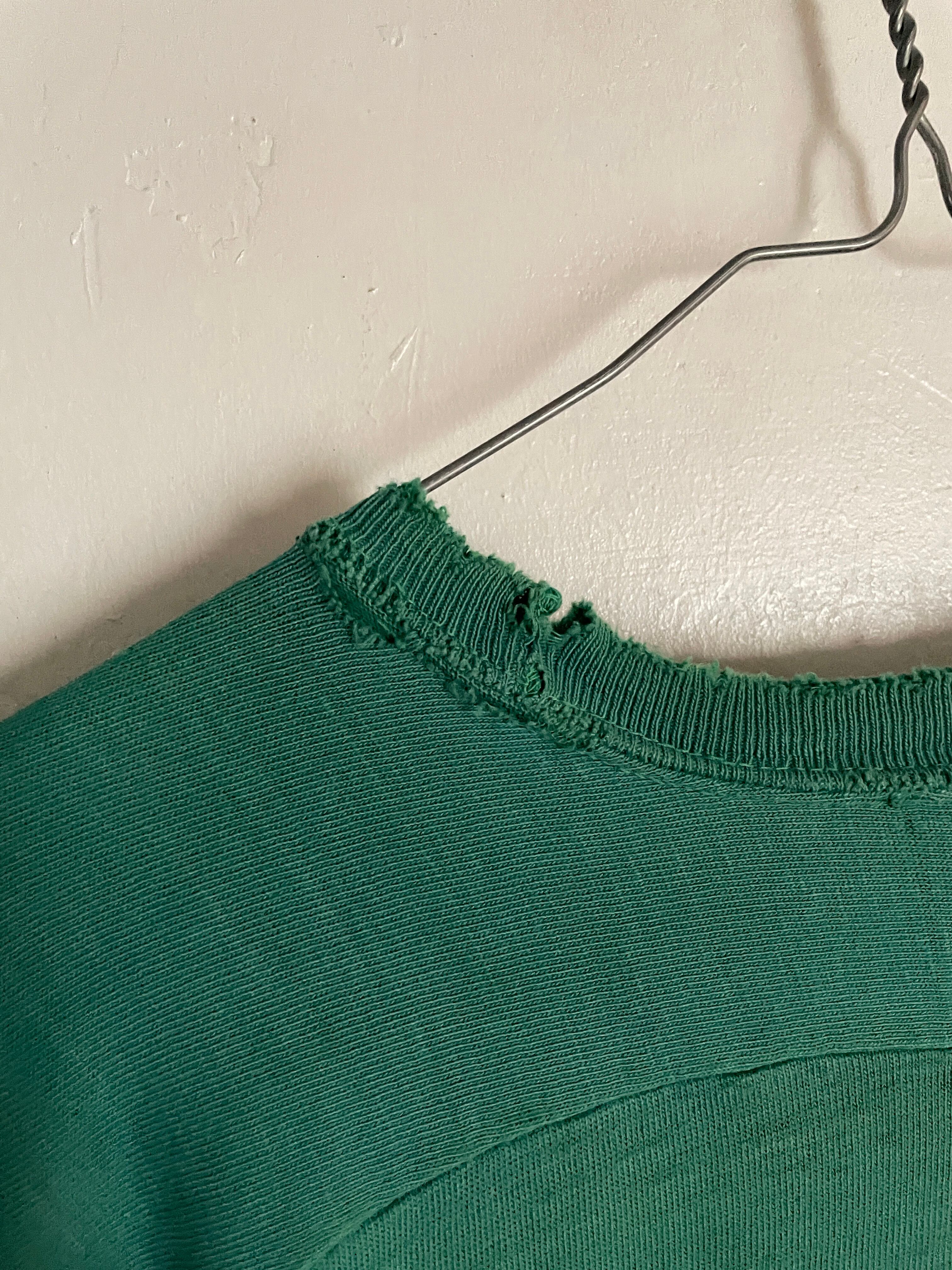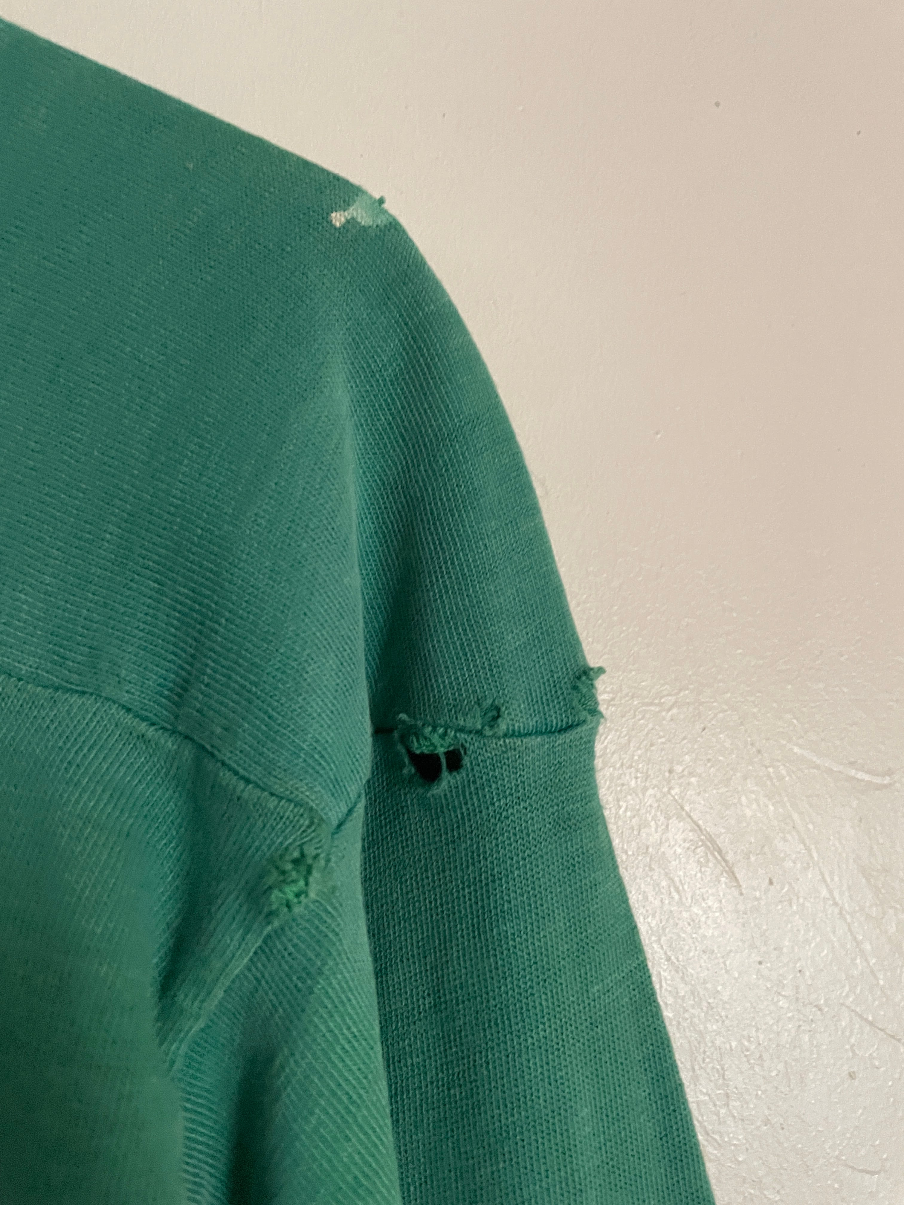 フェードした鮮やかなグリーンボディで、胸元に”POPE VALLEY CALIFORNIA"のワンポイントプリントが施された、チャンピオンのフットボールTシャツ。通称バータグの70年代頃のアイテムです。7部袖のフットボールT特有の切り替えデザインに、全体的なフェード感がヴィンテージらしい表情を演出。グリーンボディの色褪せやボロ感が相まって、当時ならではの味わいが感じられます。ピタッとしたタイトめなシルエットですが、伸縮性の良いコットン素材なので、男女問わずおすすめできるアイテムです。