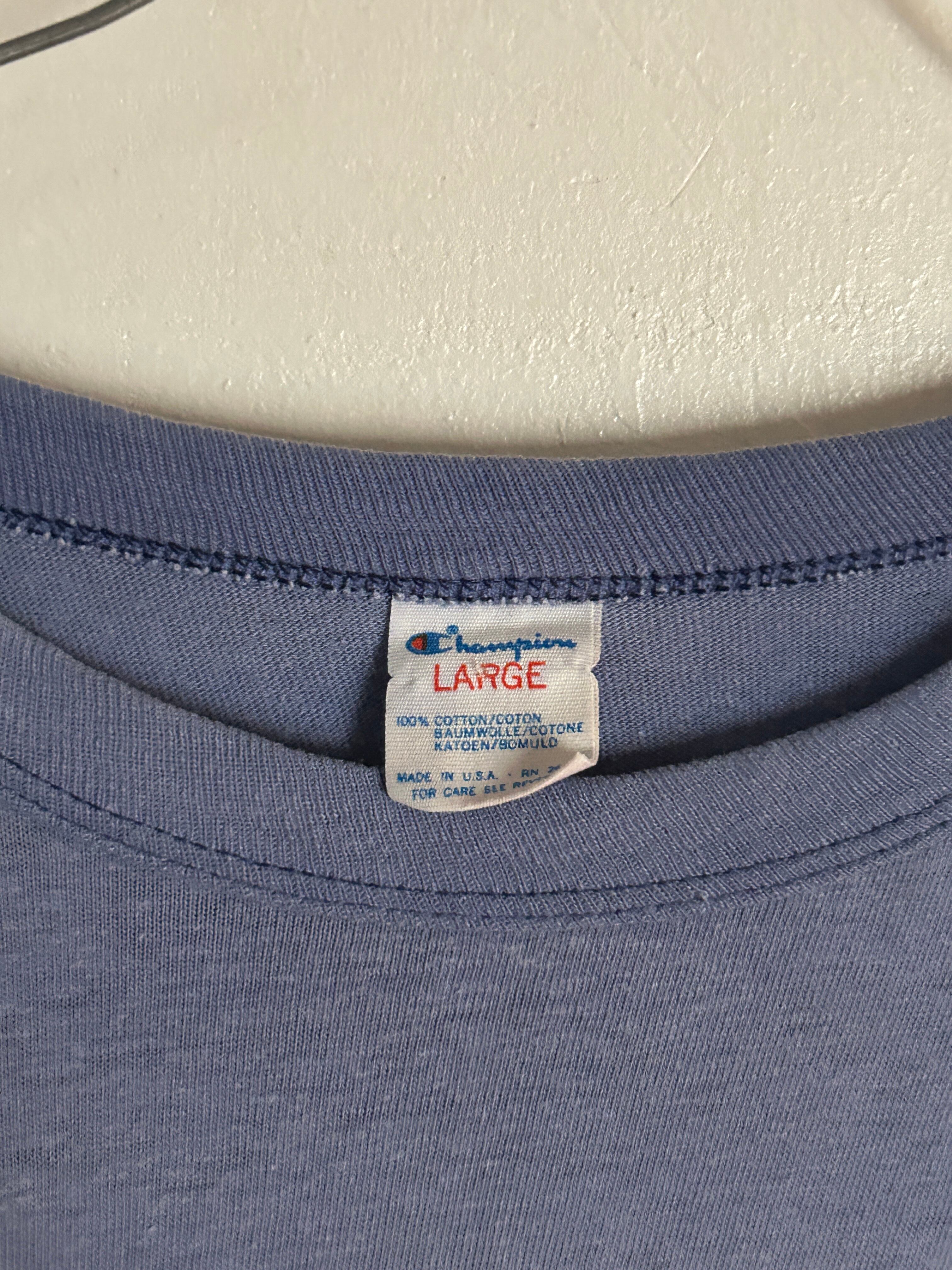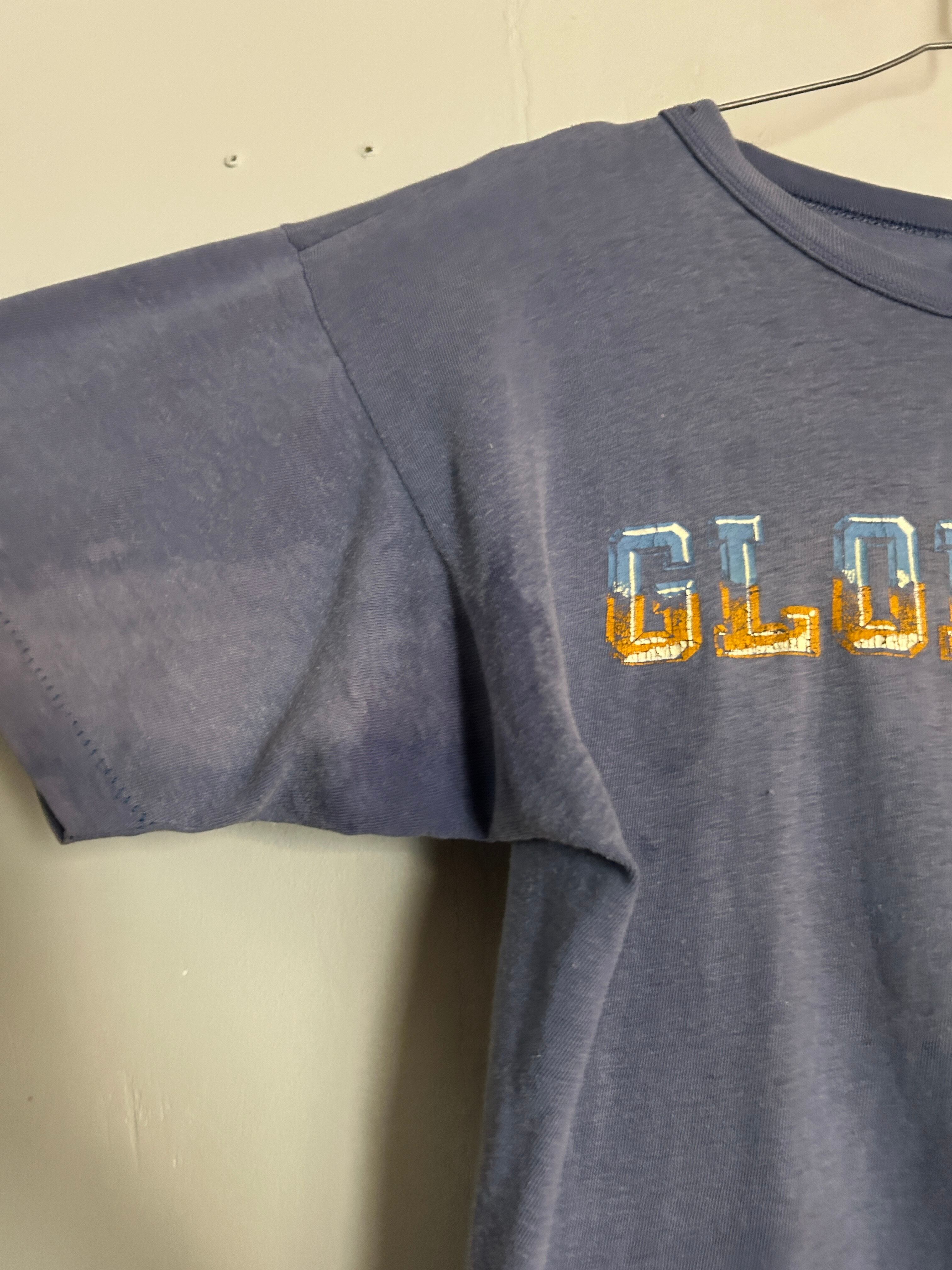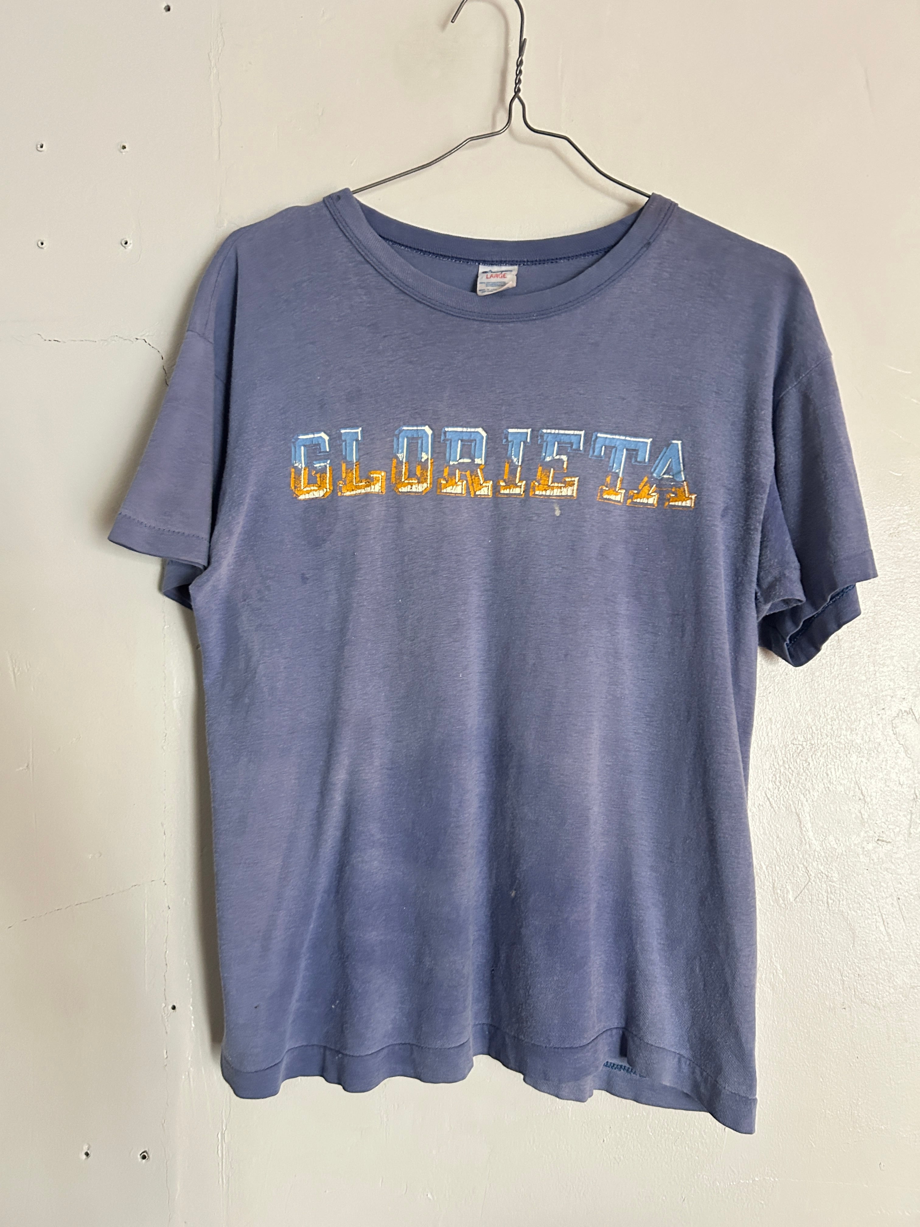 程よくフェードしたブルーボディに「GLORIETA」のロゴが映える80年代のChampionのTシャツ。かすれたプリントや色落ち感が雰囲気抜群の一着。