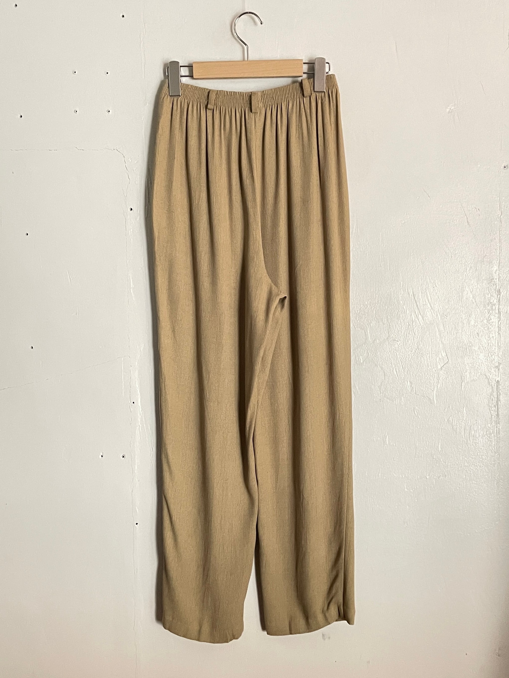 ナチュラルなベージュカラーで、テロッとした軽い質感が特徴的な、イージーパンツ。リラックス感のある股上深めのワイドシルエット。ウエストにはゴム入りで、楽に履けるのも魅力の一つです。ベルトループ付きなのもなかなか珍しいかと思います。春夏には涼しげに履けて、ファッションに良い抜け感を与えてくれる一本。USA製なのもポイントが高いです。
