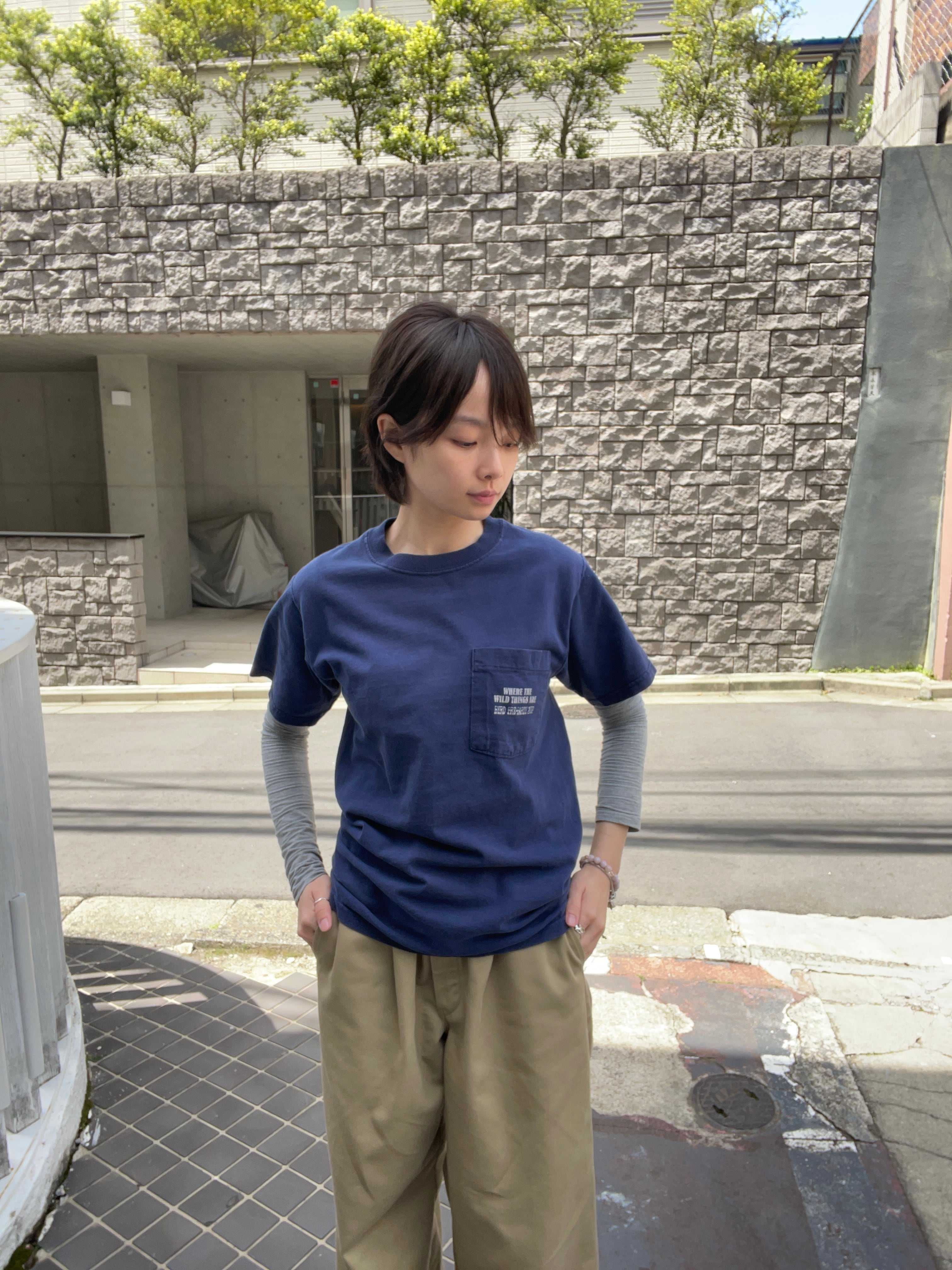 フロントはシンプルなポケットTシャツ仕様で、胸元には「WHERE THE WILD THINGS ARE」のさりげないロゴプリント。ミニマルで日常使いしやすいデザインです。バックには繊細な線画グラフィックが大胆にプリントされており、一枚でしっかり主役になる存在感。前後のギャップがコーデに遊び心をプラスしてくれます。