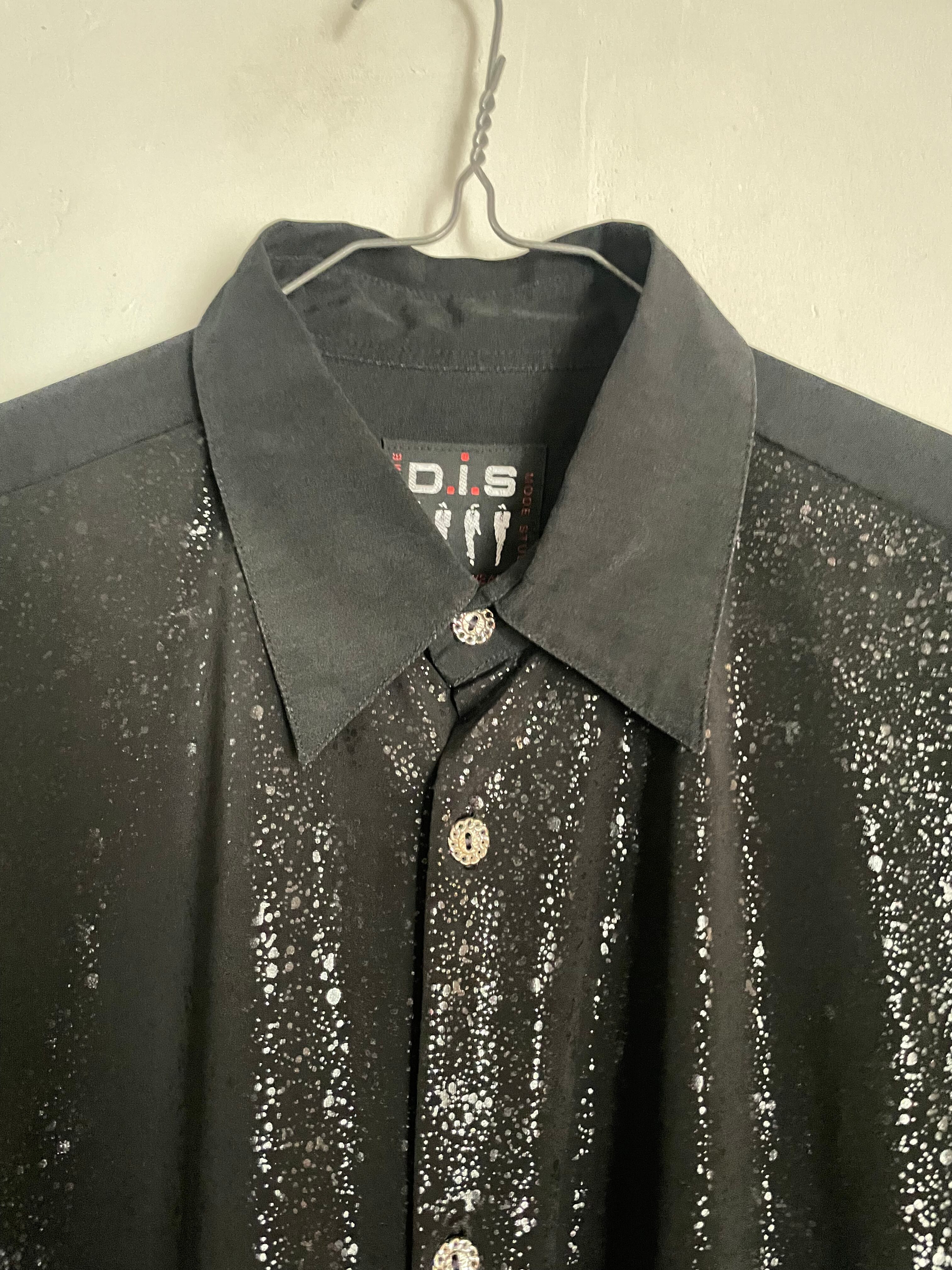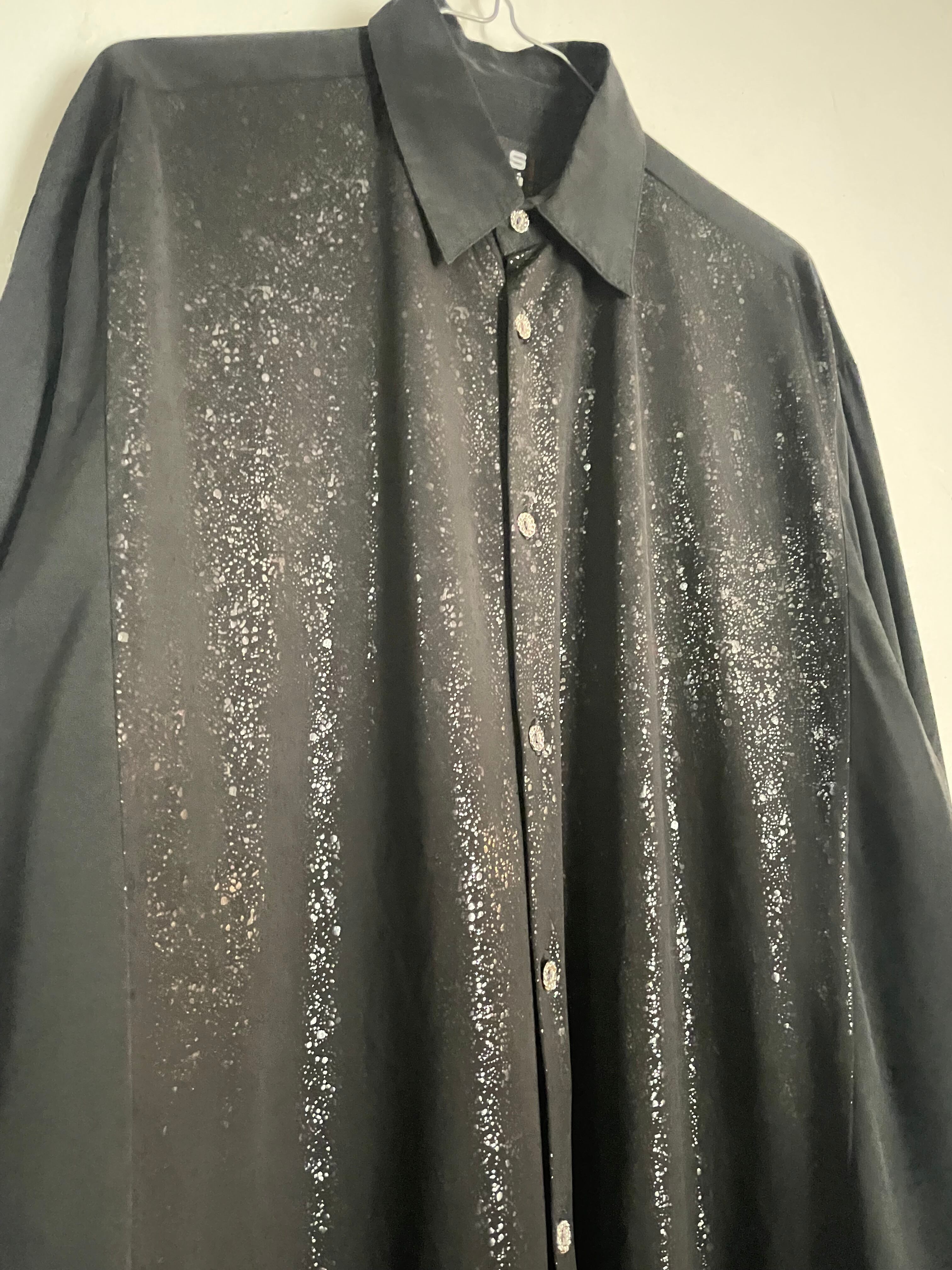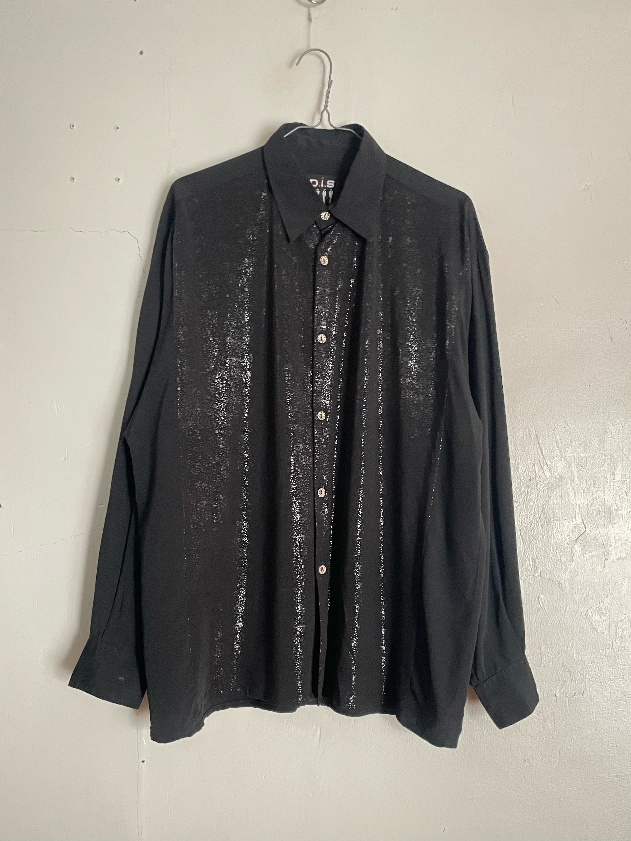 フロントに施された細かなラメのようなストライプが光の角度で控えめにきらめき、シンプルながらも印象的なデザインに仕上がっています。ゆったりとしたシルエットと伸縮性のある素材感で、リラックスした着心地も魅力的です。ドレープ感のある落ち方が大人っぽく、一枚で雰囲気の出るシャツです。バックのデザインとポリエステル素材がまた違った感じでお洒落です。