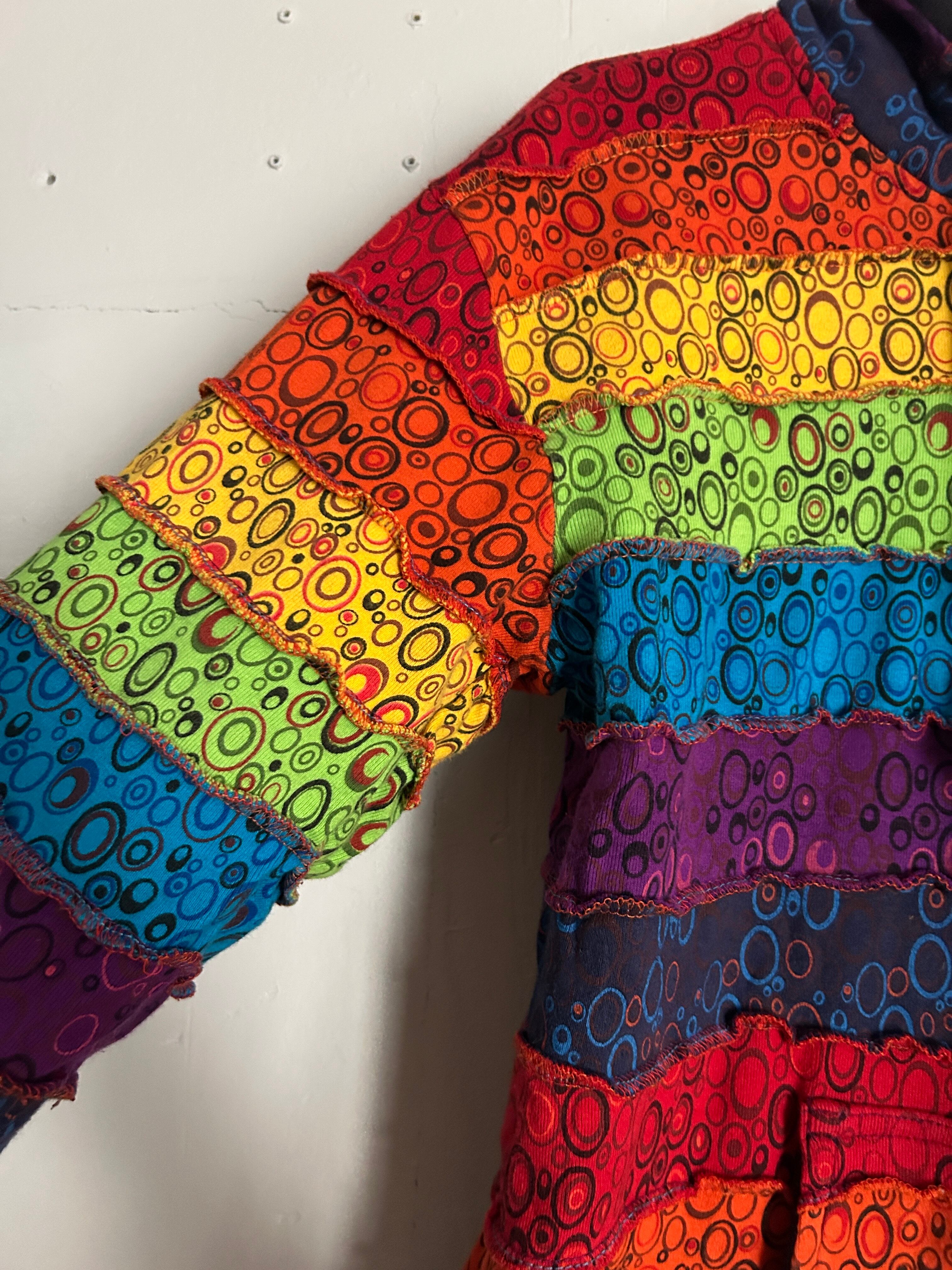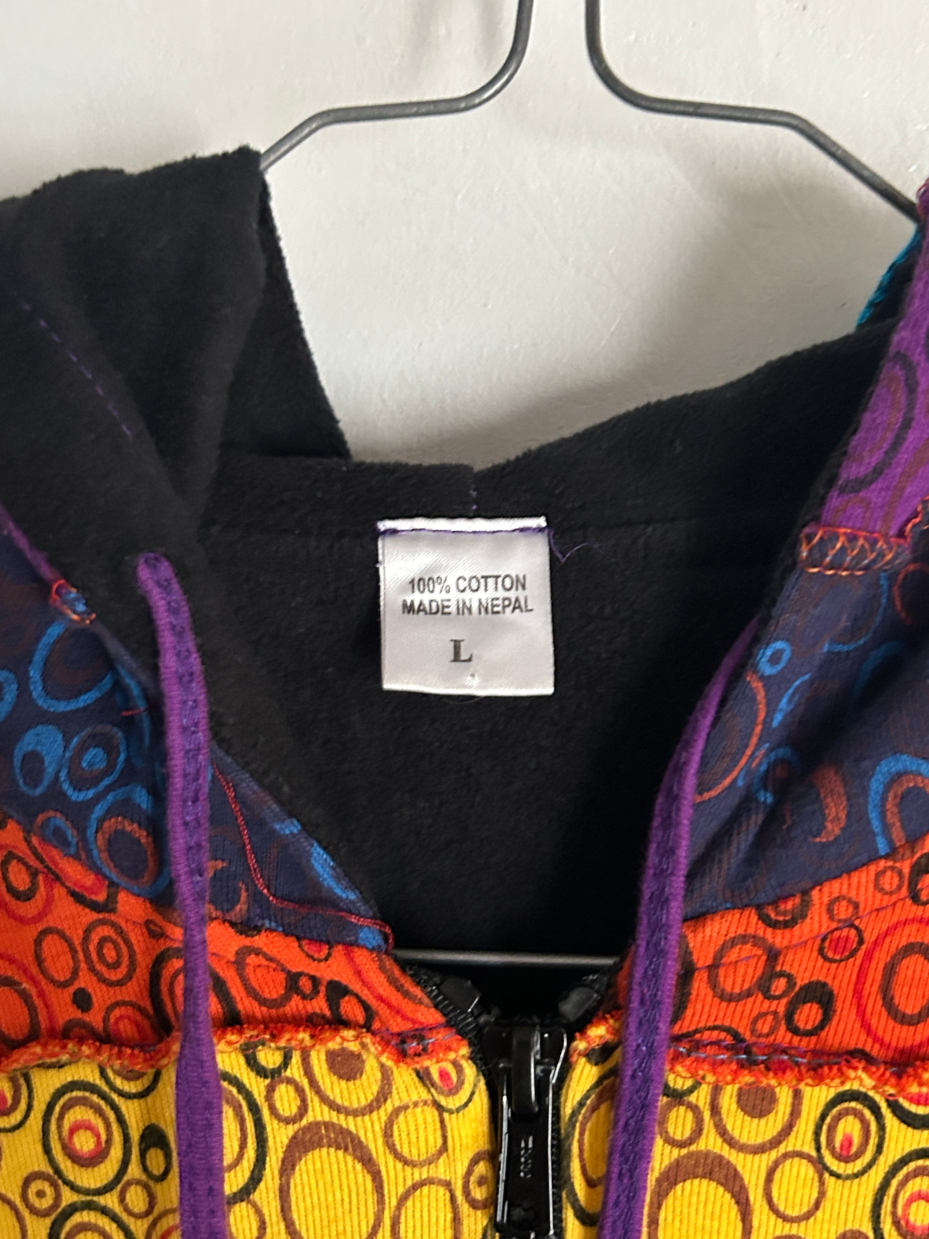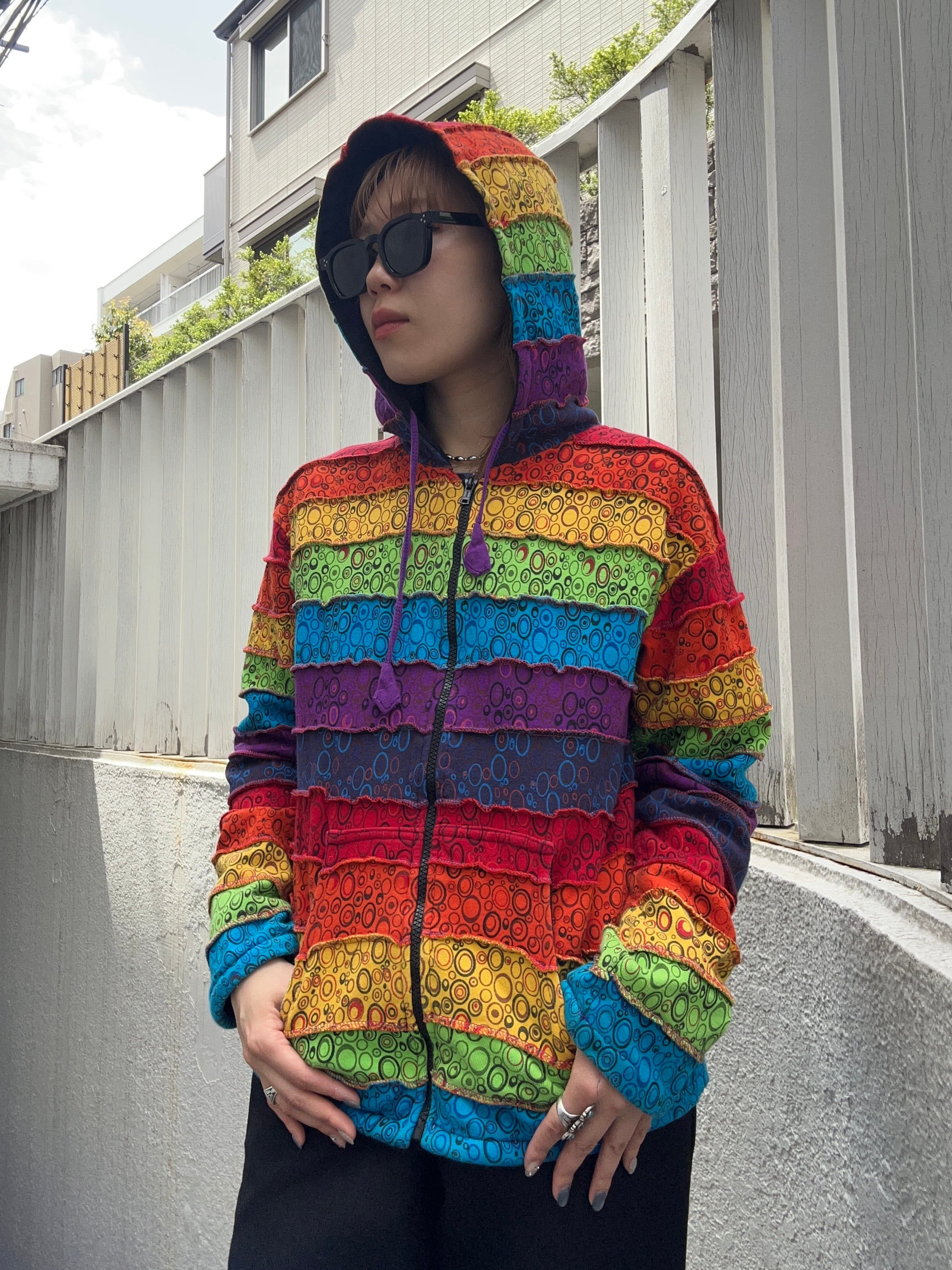 カラフルなレインボーボーダーが目を引くジップフーディーです。細かなサークルパターンとメローロック仕様の縫い目とパッチワークデザインという非常に凝ったデザインです。サイケな雰囲気がイケてます。裏地は軽いフリース素材になっていてしっかりした作りです。なかなか見つからない良い感じにテンションの高い一枚です。