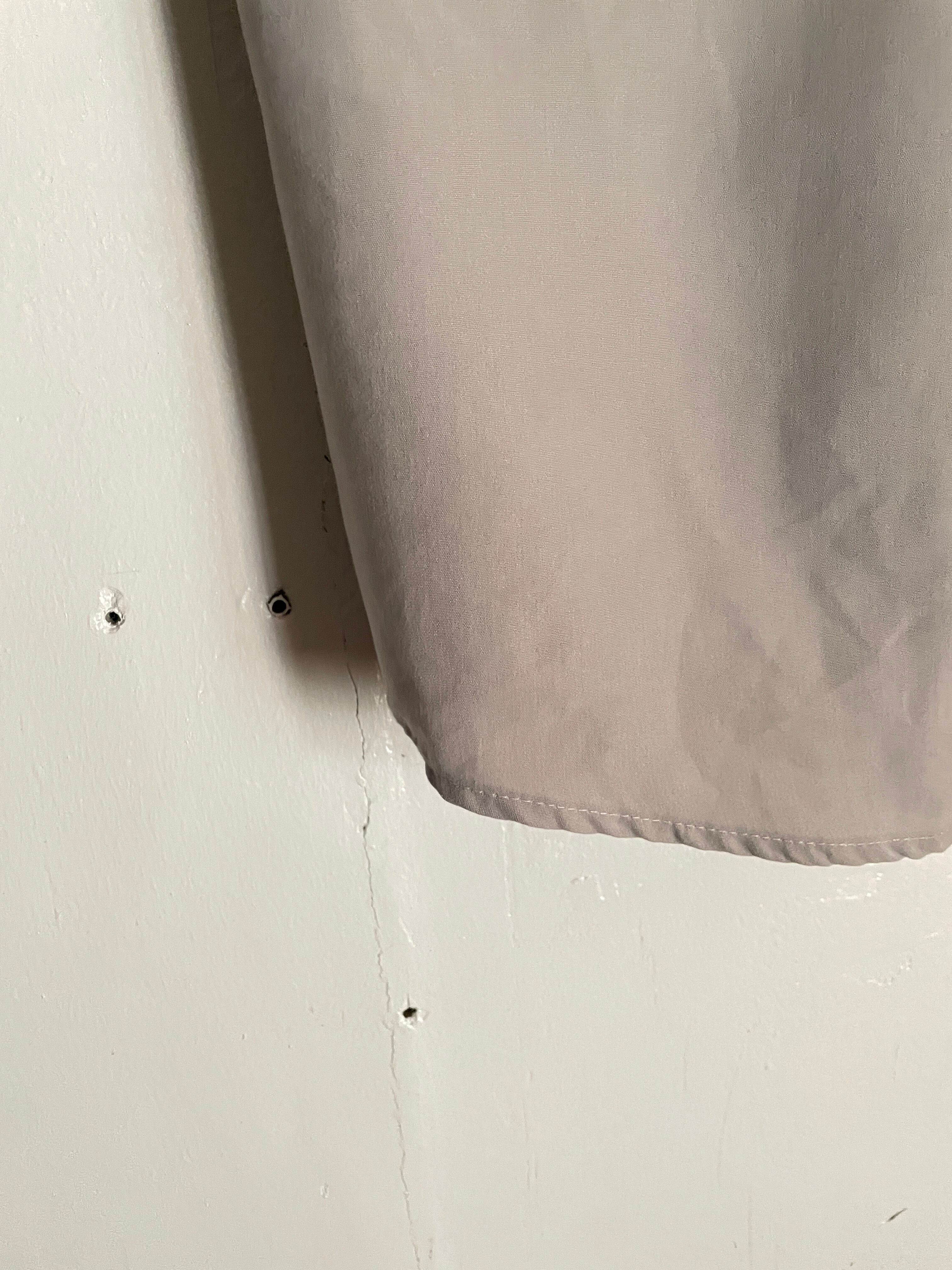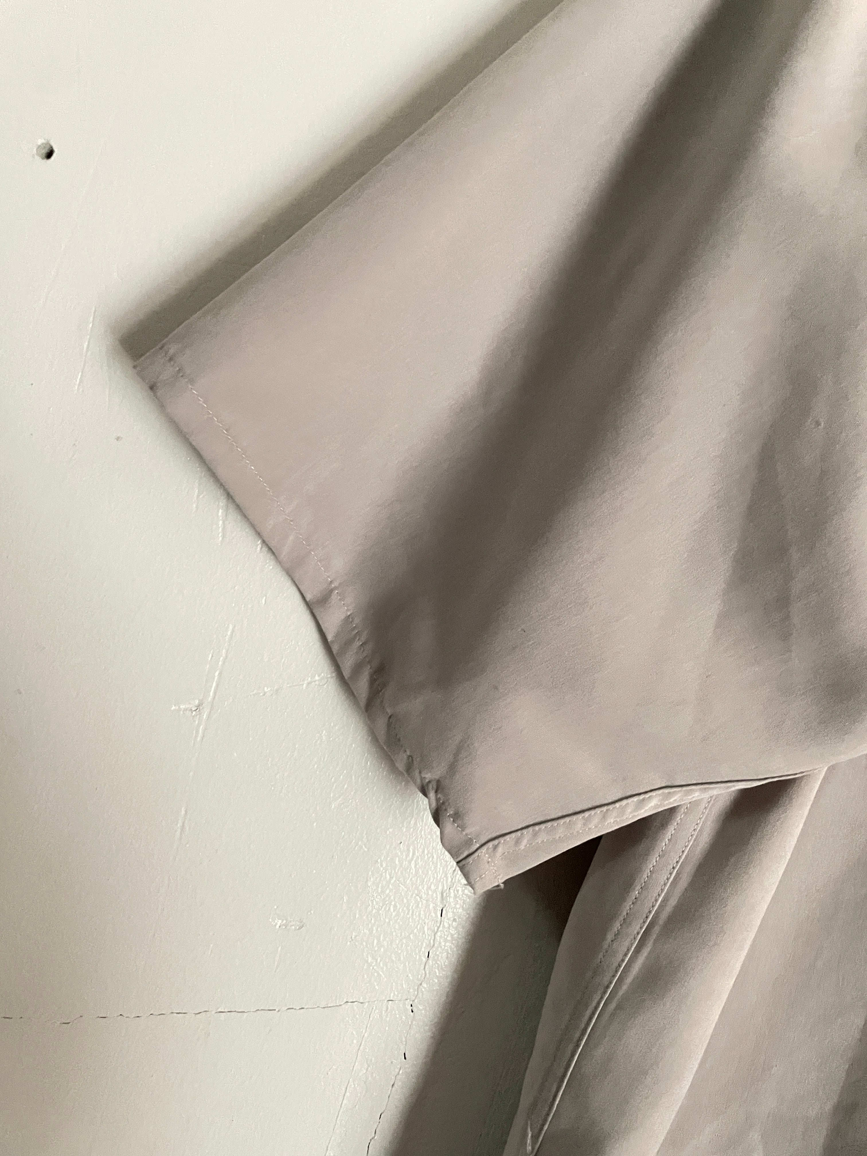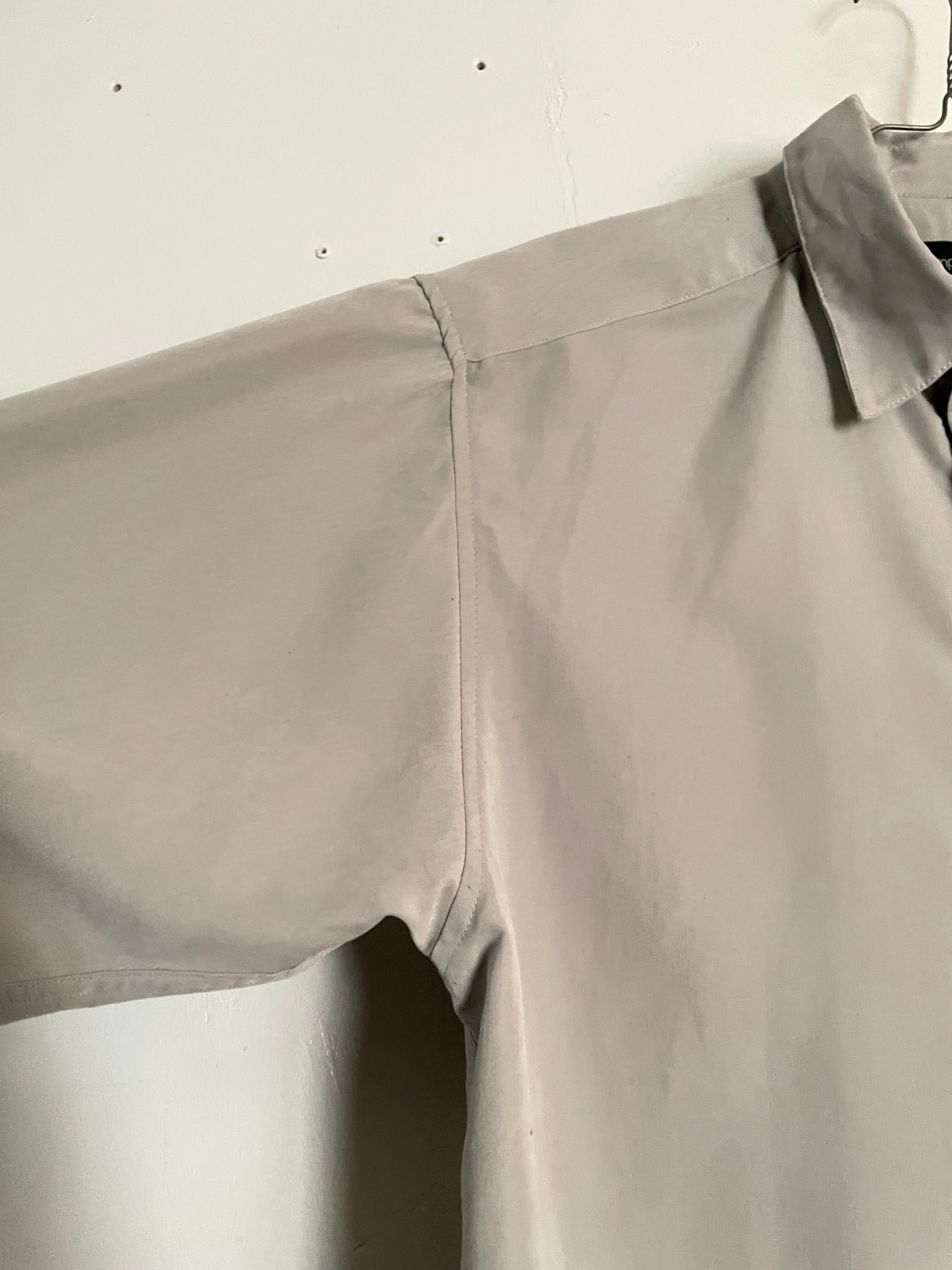 やや光沢のあるライトグレーボディの、シャツ。フォーマルでシンプルな無地。滑らかなポリエステル素材で、通気性も良く、涼しげに着られそうです。ファッションを選ばず、どんなスタイリングにも取り入れやすシャツかと思います。ゆったりとしたサイズ感なので、ラフに着られるのも魅力的です。