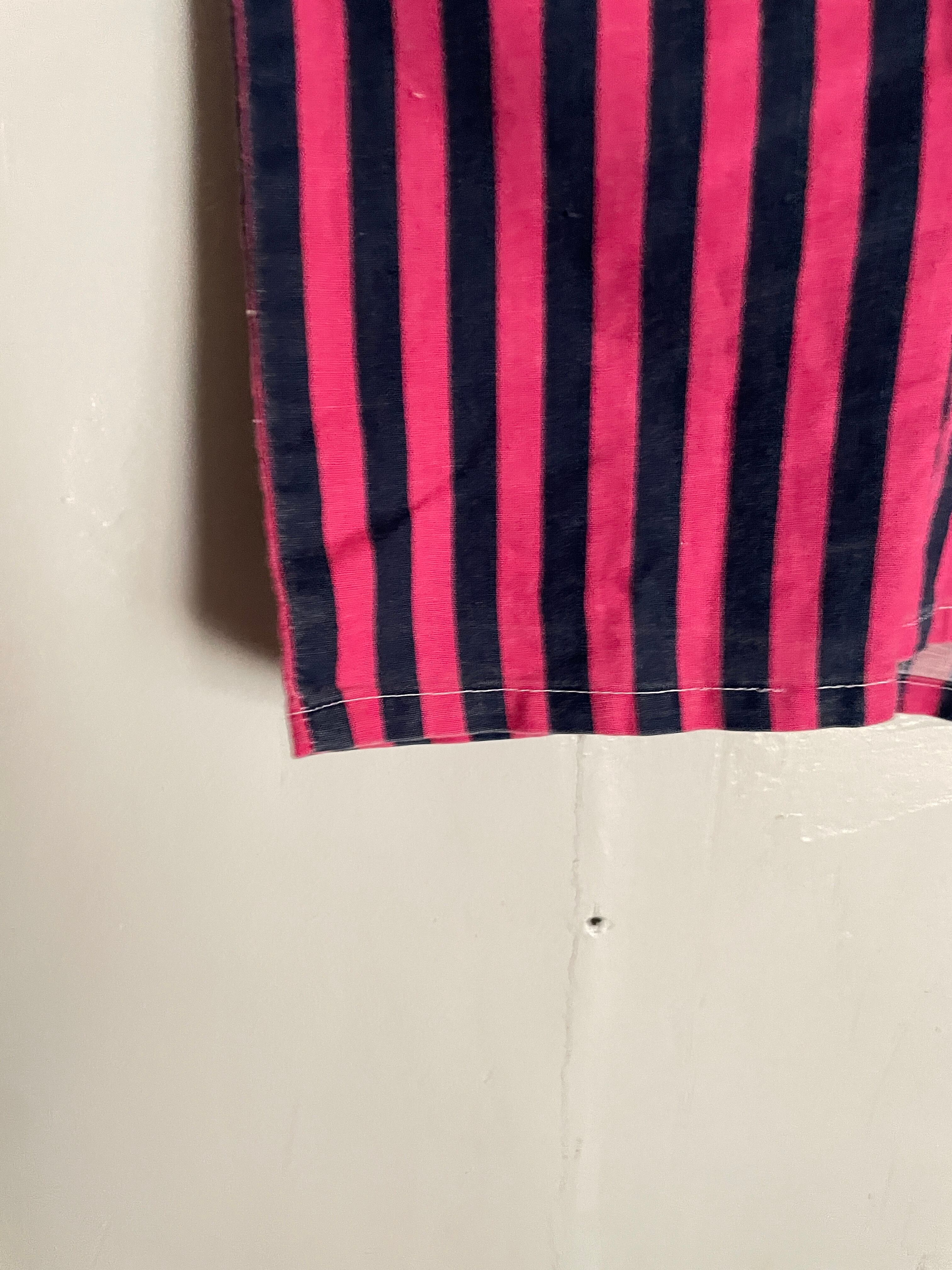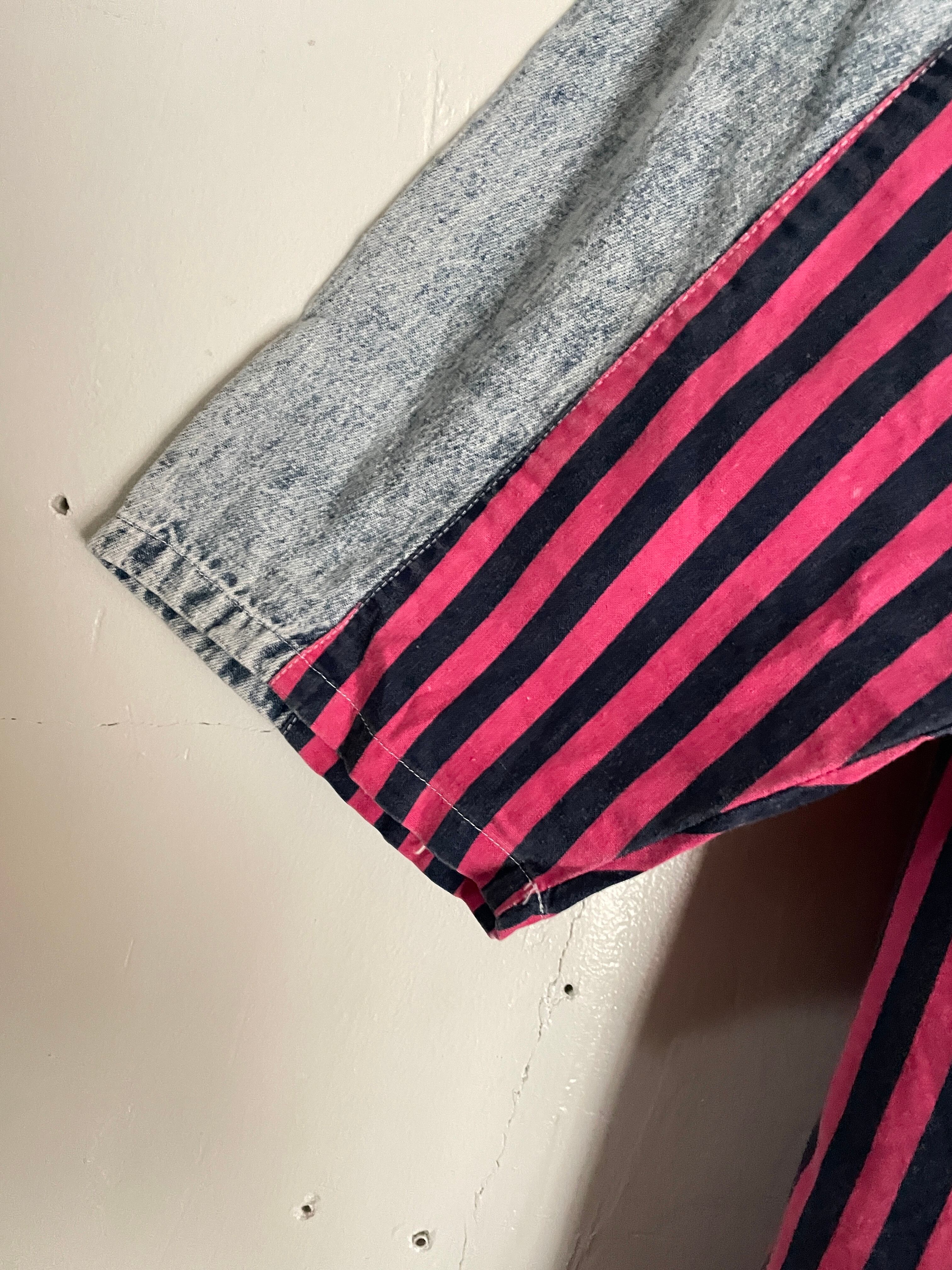 鮮やかなレッドとネイビーのストライプに、デニムスリーブを組み合わせたクレイジーパターンのプルオーバーシャツ。ネックはヘンリーネック仕様。程良く抜け感のあるデザイン。ボディはお洒落なストライプで、ど真ん中にはパッチデザイン。袖にはフェード感のあるデニム素材を使用した切り替えデザインが特徴的で、スタイリングの主役になってくれる一着です。ゆったりとした身幅広めのシルエットで、デニムやスラックスとの相性も良さそうです。個性的ながらも着回しやすく、古着ならではの一点物感を楽しめる一着です。