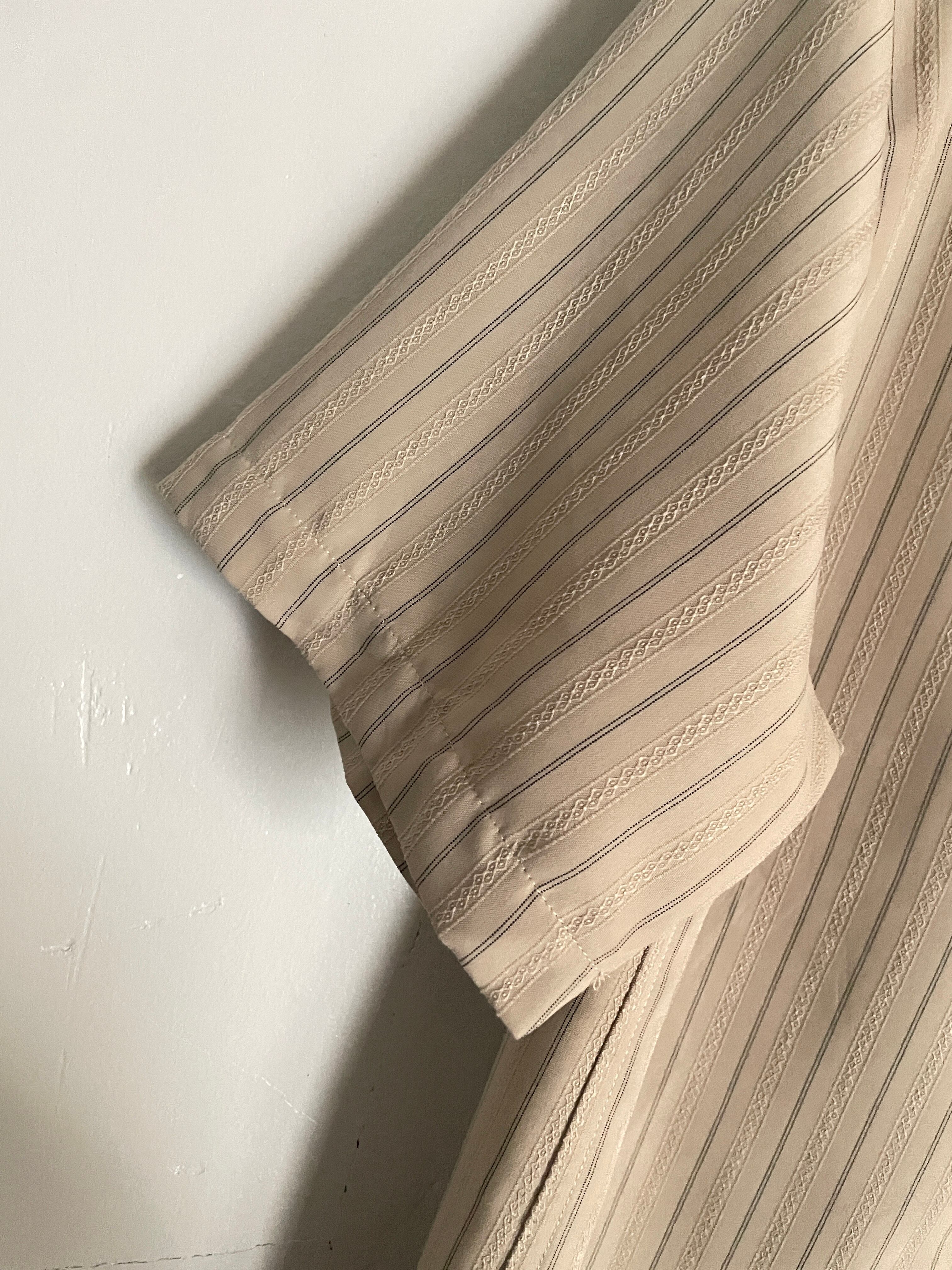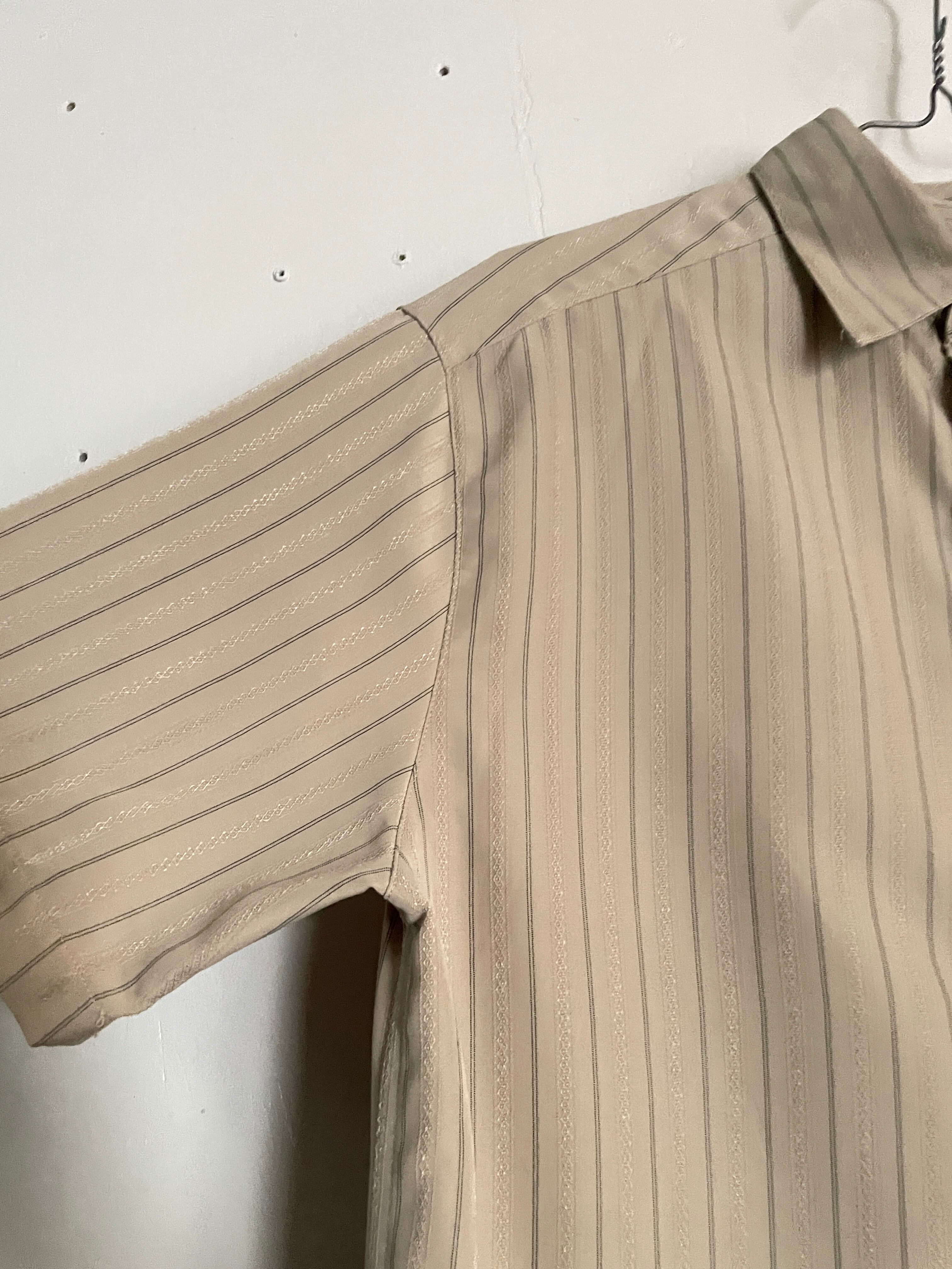 落ち着いたベージュボディに、細めのストライプと模様が施された、シャツ。責め過ぎていないデザインなので、使い勝手の良いシャツかと思います。滑らかな肌触りのポリエステル素材。軽くて着心地抜群です。一枚でサラッと着るのにはもちろん、インナーとしても活躍してくれるアイテムです。サイズ表記はSですが、かなりゆったりとしたサイズ感になっています。