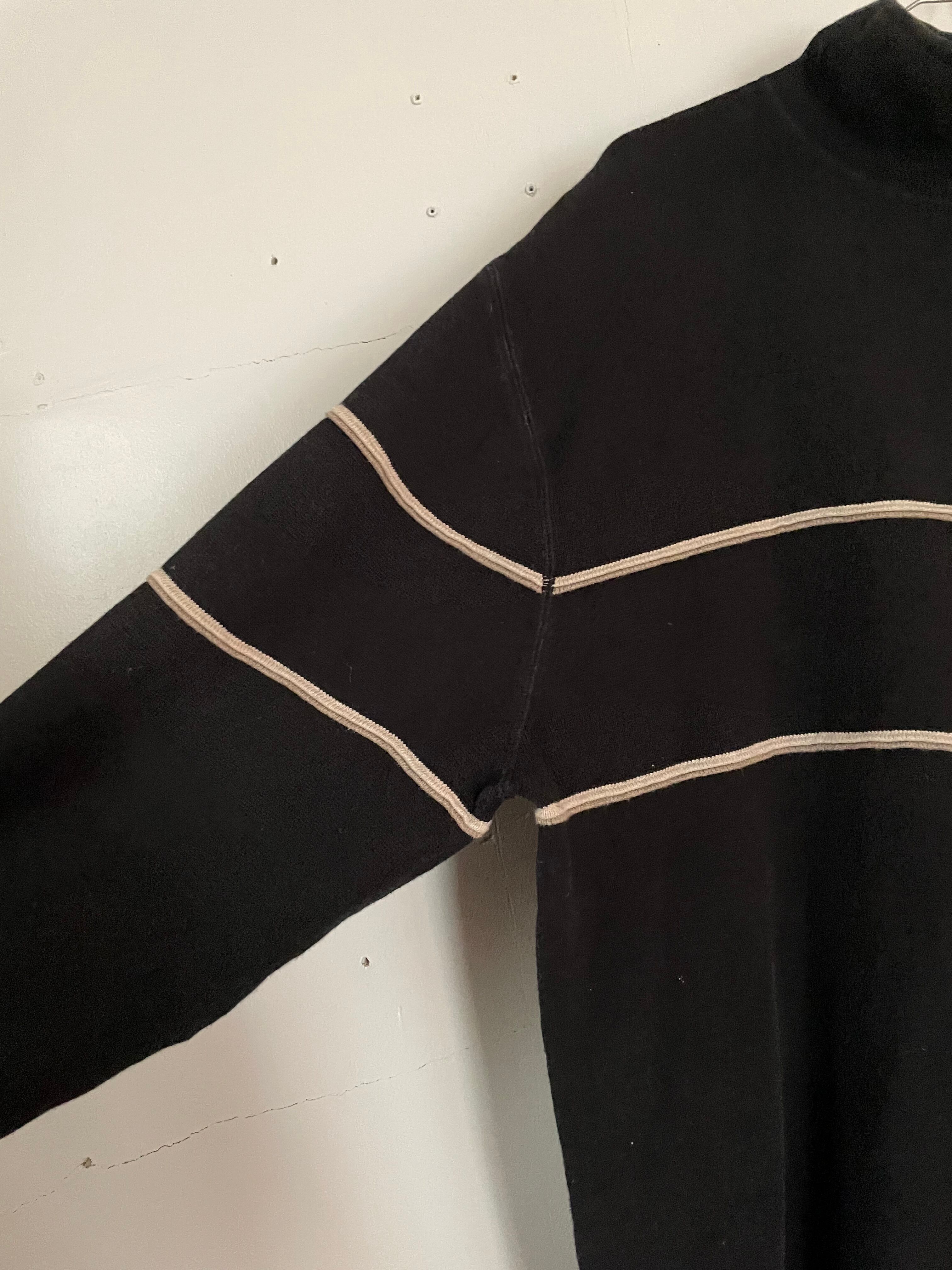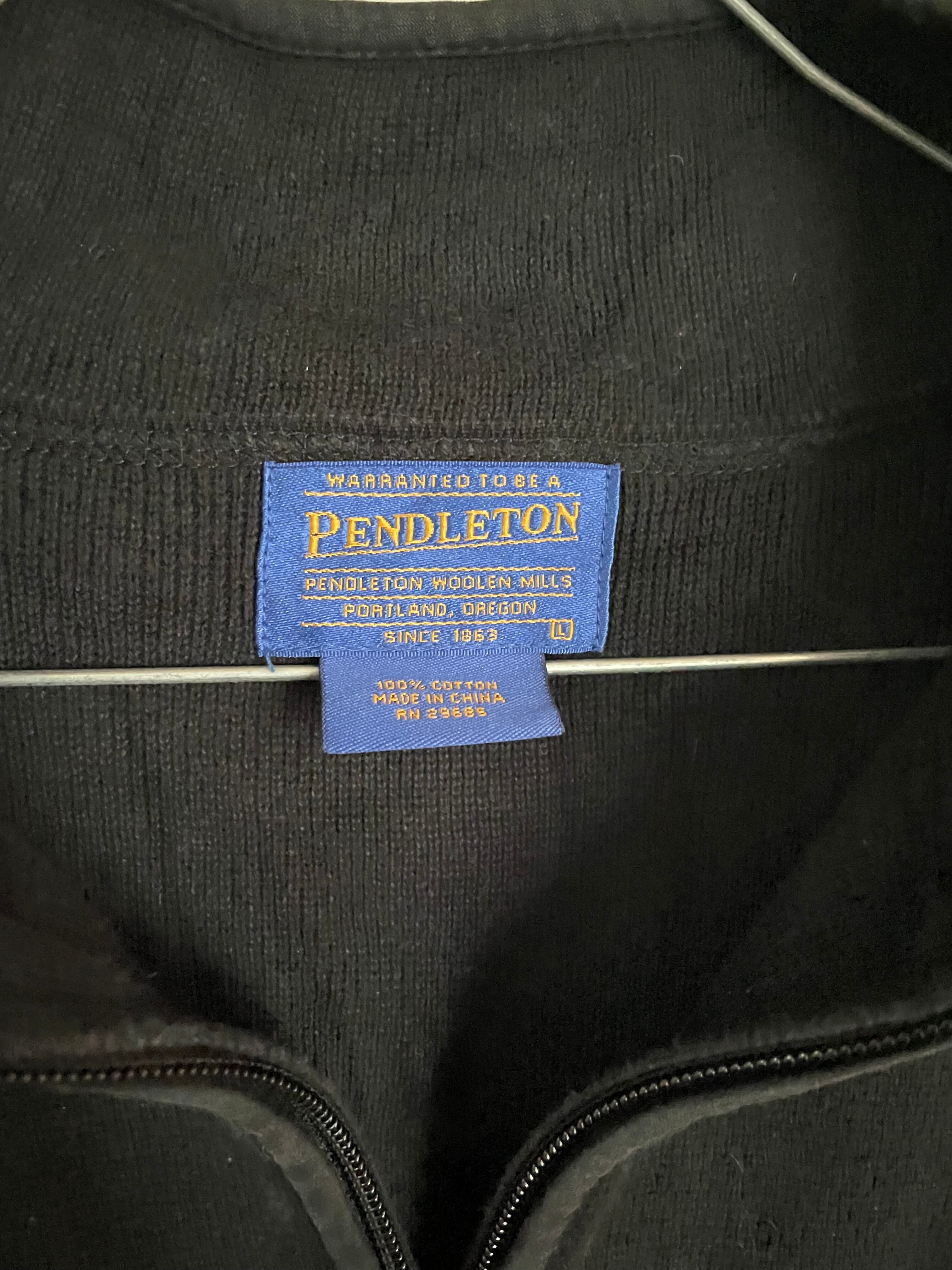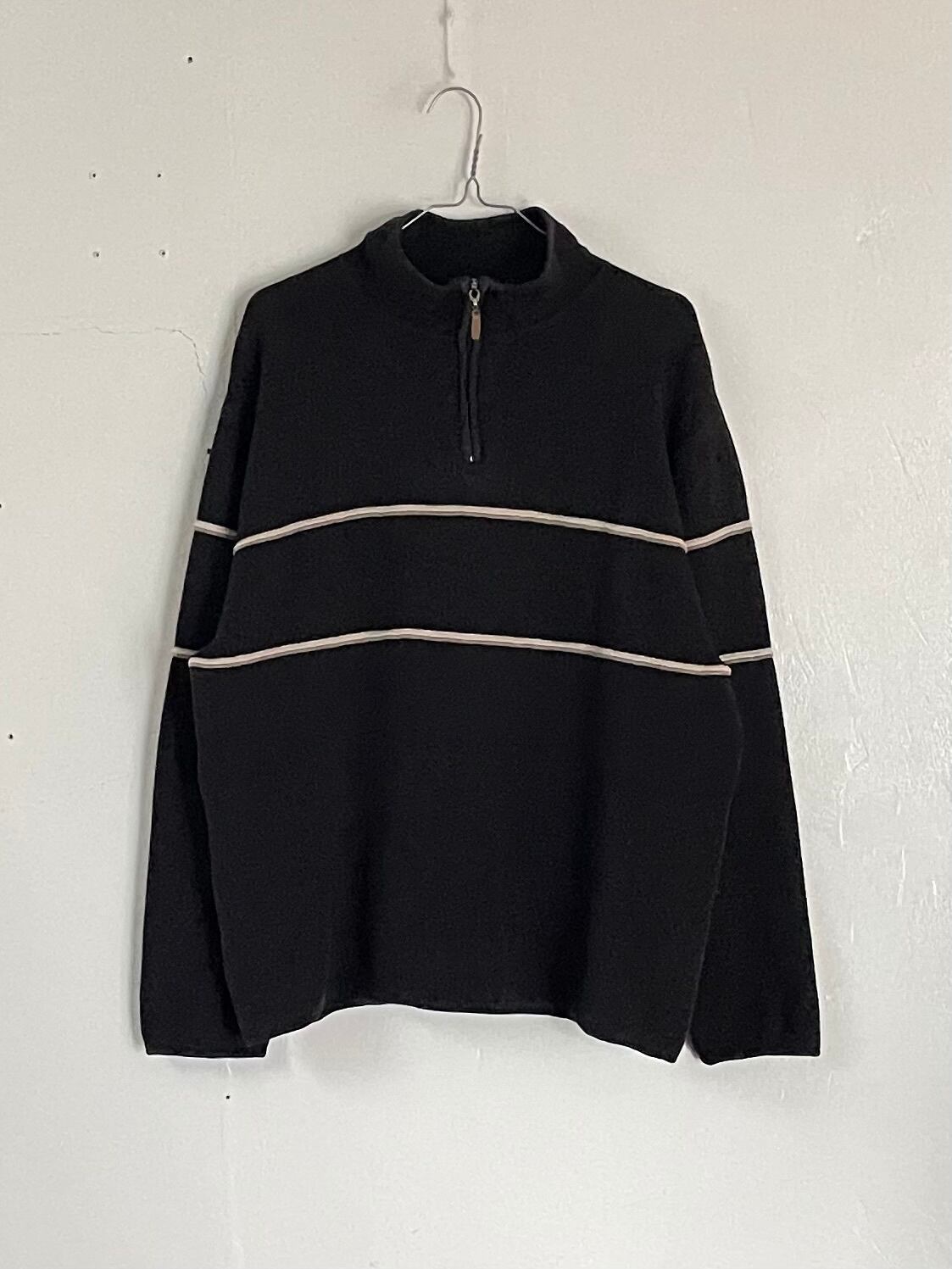 ブラックボディーに渋めなラインが刺繍された、ペンドルトンハーフジップニット。程よい柔らかさの生地感で羽織りやすいです。ホワイトとベージュのラインの配色が大人っぽい雰囲気です。シンプルだからこそ、色々な場面で活躍するかと思います。これからの季節にぴったりなアイテムです。