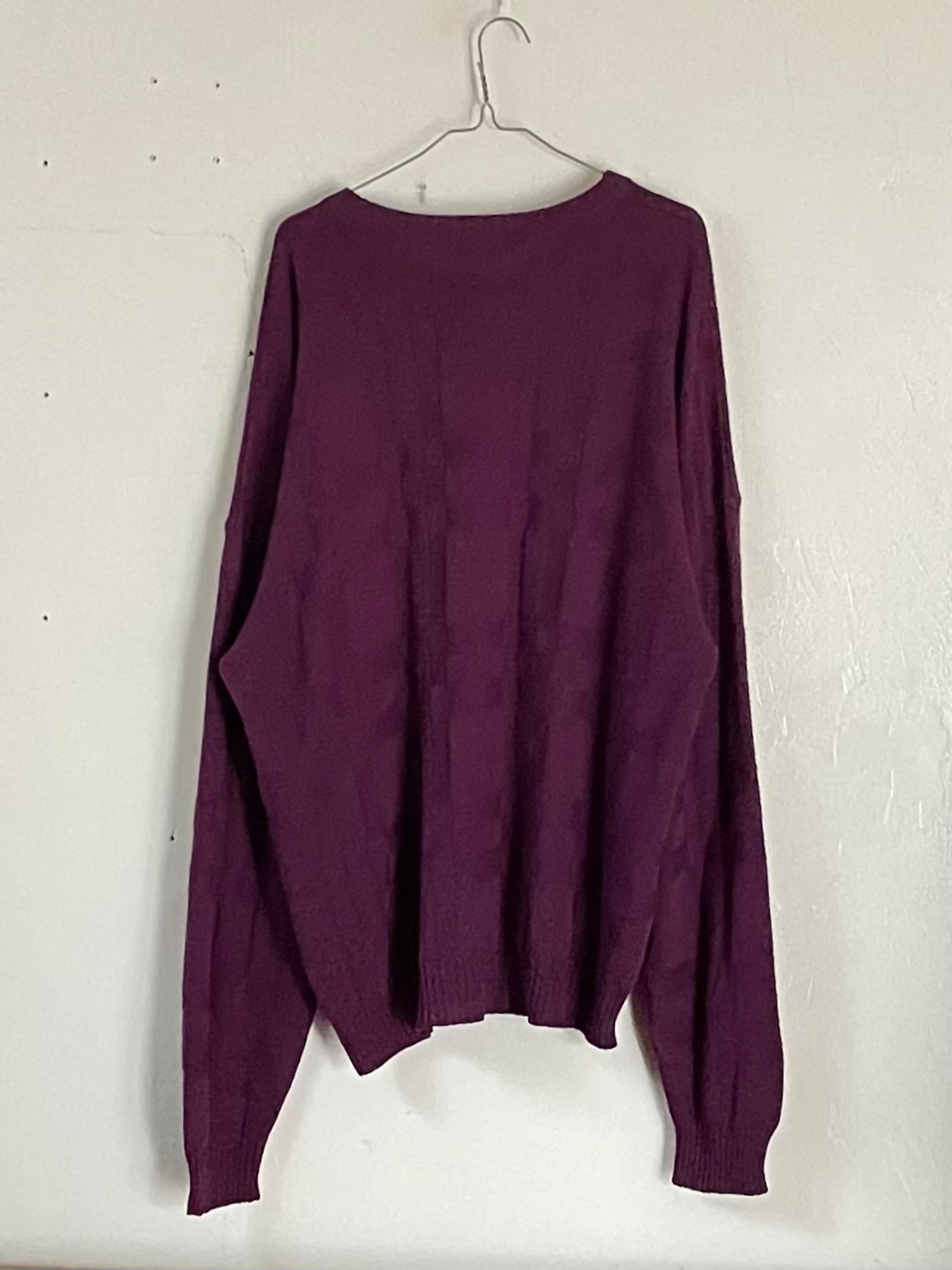 セクシーで色気のある、パープルカラーのラコステのニット。薄手な素材感で男女共に緩く着られます。袖が長めです。よく見ると同じ色でチャックっぽい柄が入っていてこだわりも感じられます。色味もシルエットも大人の色気があるアイテムです。ワンポイントのラコステロゴが可愛らしいです。スラックスなんかに合わせたら渋くてかっこいいかと思います。