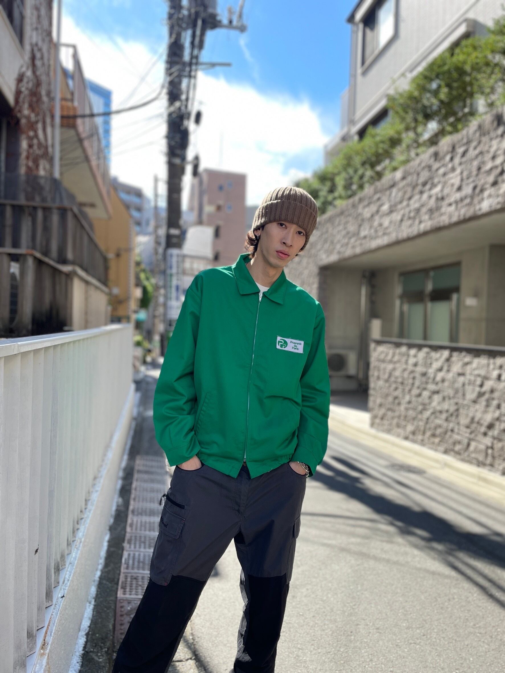 綺麗なグリーンボディーに企業ワッペンが入った、ワークジャケット。スウィングトップのような着やすいデザインです。インナー見せて着たりしてもかっこいいかと思います。リブの締まりも良く、シルエットも良いアイテムです。厚手すぎない素材感なのでラフに羽織れます。